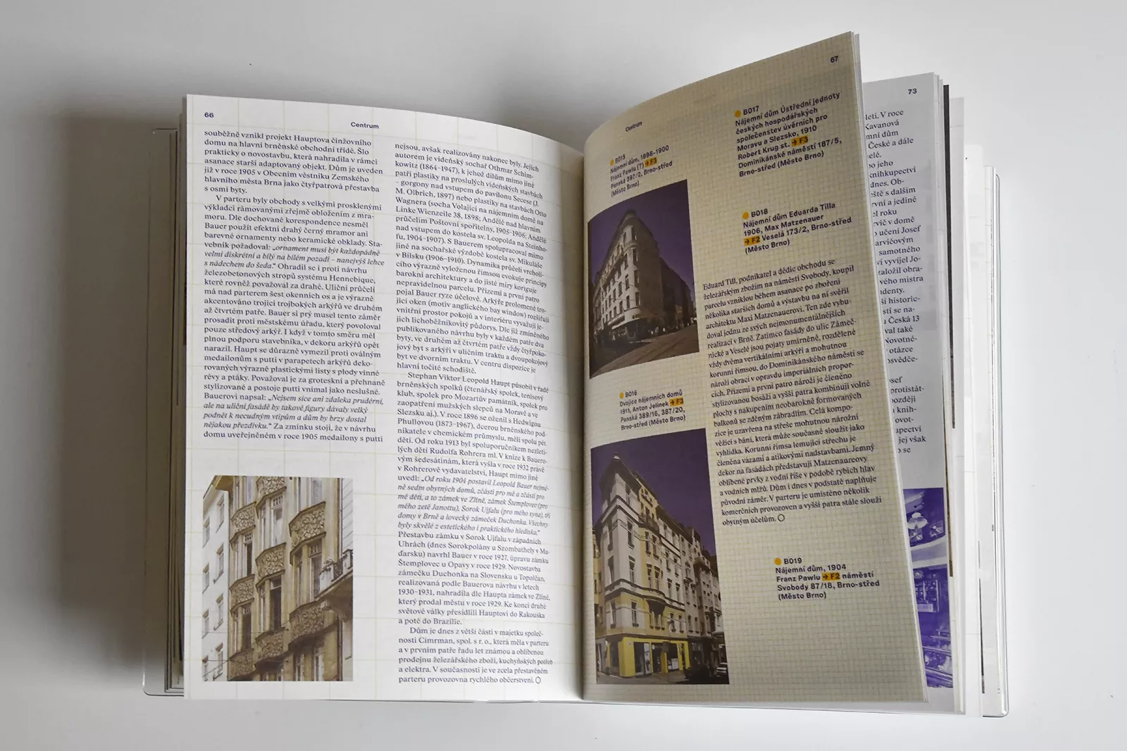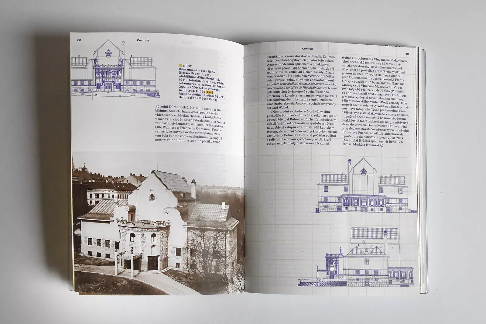 Publikace Brněnský architektonický manuál. Průvodce architekturou 1900–1918 je koncipovaná jako topografický průvodce městem, do něhož bylo vybráno 184 typologicky různých objektů – důležité veřejné stavby, včetně sakrálních, obchodní a privátní nájemní domy i vily i první příklady družstevní či spolkové výstavby. Objekty (doplněné o dobové i současné fotografie) jsou uspořádány do deseti stezek a sedmi menších výletů ke vzdálenějším stavbám. Každá stezka má vlastní současnou a historickou mapu, na nichž je dobře patrný urbanistický vývoj dané lokality, informace o její dostupnosti pomocí MHD v prvním bodě stezky, a krátký́ úvod. Řazení stezek a výletů zohledňuje vzájemnou návaznost staveb a dostupnost městskou hromadnou dopravou.