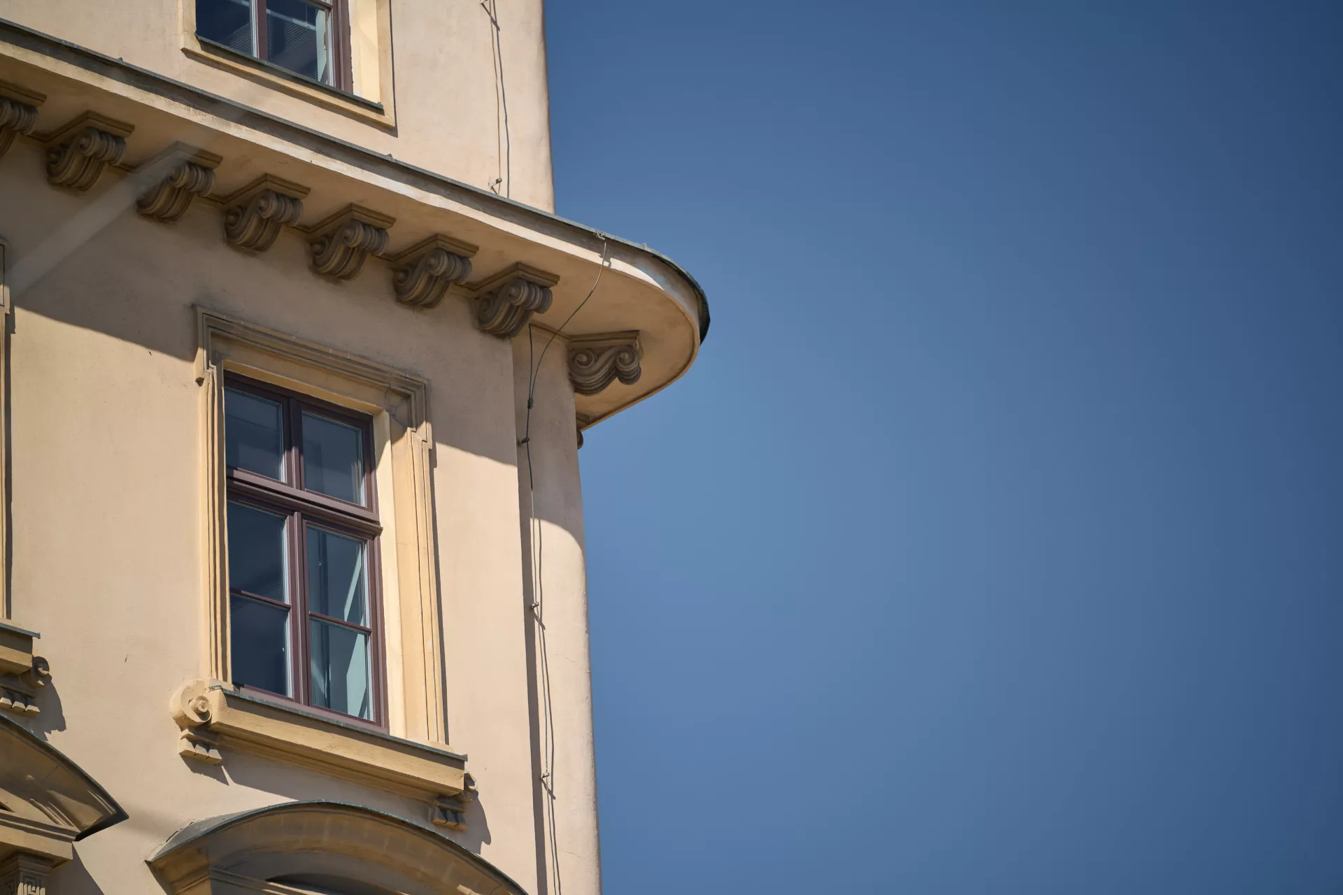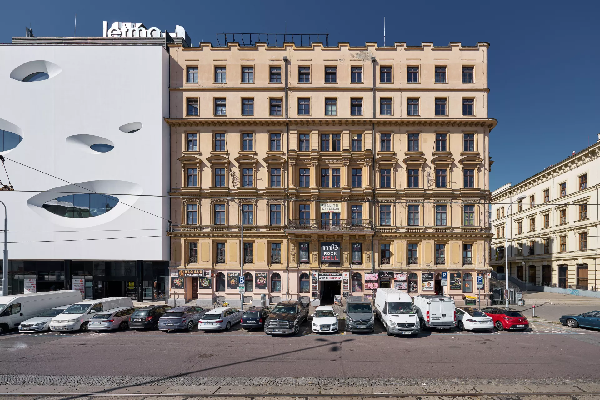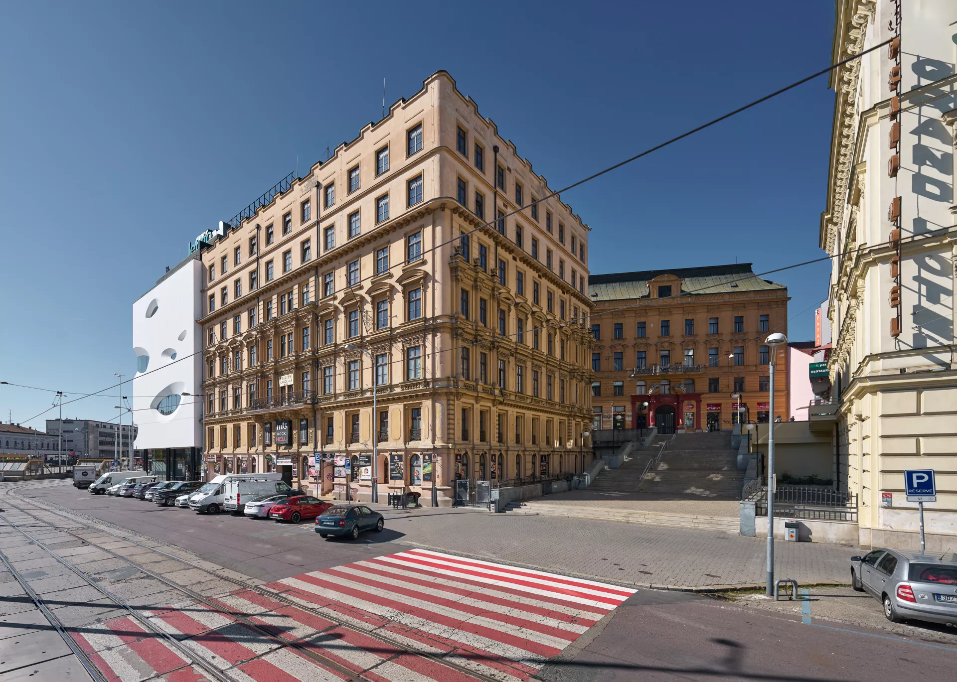 Das abfallende rechteckige Grundstück umfasste den Block eines vierflügeligen Hauses mit drei unterschiedlich hohen Fassaden – dreistöckig mit Hochparterre zur Straße Benešova, zweistöckig zur höher gelegenen Straße Josefská und eine Seitenfassade entlang einer breiten Treppe, welche den höher gelegenen Stadtkern mit der Ringstraße verband und gleichzeitig den erhabenen Beginn oder das Ende der Achse darstellt, die durch das stilisierte Tor der Eisenbahnunterführung zum industriellen Brünn hinter dem Bahnhofsgelände führte.