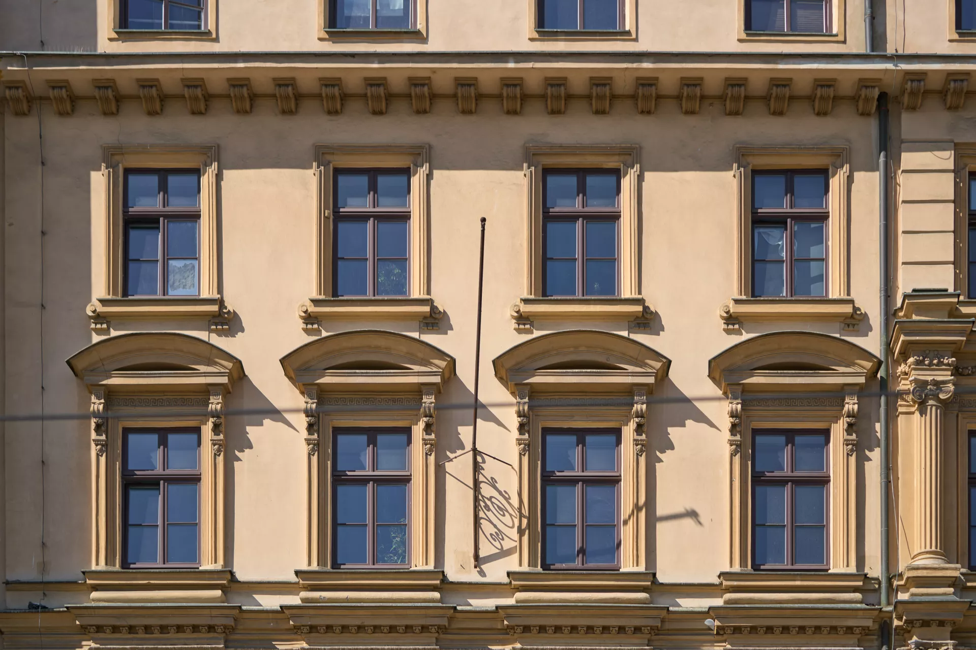 An der südöstlichen Front der neu abgesteckten Ringstraße entstand ganz am Anfang der siebziger Jahre des 19. Jahrhunderts an der Grenze des historischen Brünner Stadtkerns auf einem exponierten Grundstück ein monumentales Stadthaus, dessen gegliederte Fassaden seitdem das südöstliche Gesamtpanorama der Stadt mitprägen. Der in Bahnhofsnähe gelegene Bauplatz wurde in den Brünner Bauregulierungsplänen nach Beseitigung der Stadtbefestigungen für den Bau eines Hotels ausgewählt, und auch der Besitzer des Grundstücks Albert Holitzky hatte zunächst beabsichtigt, dort einen Hotelgasthof mit dem Namen Zum weißen Roß zu errichten. Seine Absicht hat er allerdings noch im Laufe des Jahres 1870 zugunsten eines großen Mietshauses mit geräumiger Bierschenke im Untergeschoss geändert. Auch hinsichtlich der komplizierten Geländekonfiguration des unebenen Baugrundstücks wurde der anspruchsvolle Bau mit 55 Wohnungen im Laufe des Jahres 1871 fertiggestellt. Die zeitgenössische Presse war vor allem von der großartigen, über die gesamte Gassenfront sich erstreckenden Bierhalle und der in der zweckmäßigsten Weise und aus vorzüglichstem Materiale von dem Tischlermeister J. Schandl ausgeführten inneren Ausstattung sowie von der doppelten Wasserleitung begeistert.