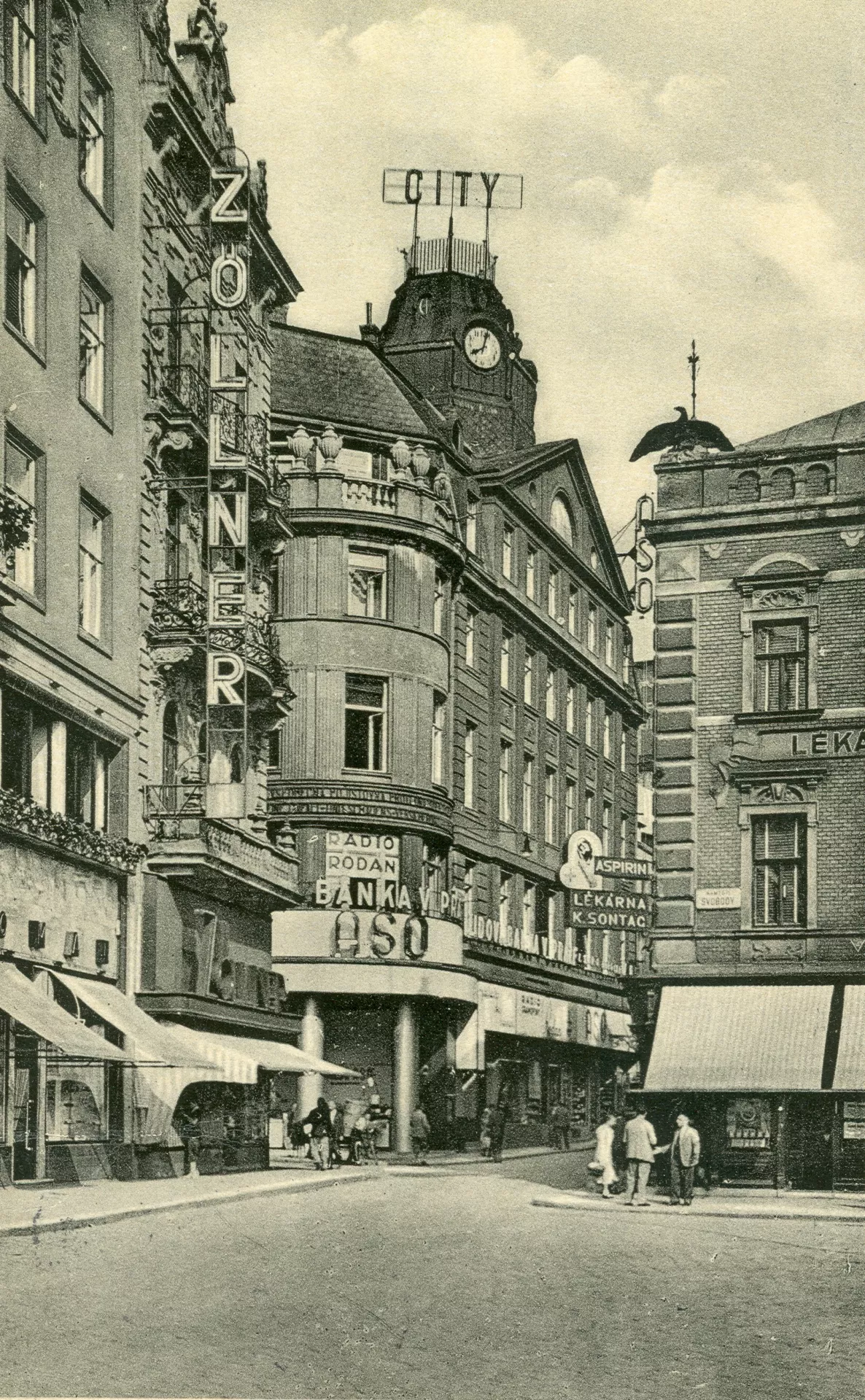 Das Amts- und Wohngebäude der Ersten allgemeinen Unfall-Versicherungsgesellschaft wurde 1916 auf einem ausgedehnten Eckgrundstück zwischen den Straßen Česká und Veselá errichtet, das im Zuge der Brünner Assanierung freigeworden war. Im Archiv der Stadt Brünn werden die komplett erhaltenen Originalpläne aufbewahrt, die dem Stadtrat am 1. Juli 1915 zur Genehmigung vorgelegt wurden und von dem Wiener Architekten Franz von Krauß, dem Autor einer Reihe bedeutender Bauten in Österreich, Böhmen und Mähren signiert wurden. Franz von Krauß legte zwei Varianten Fassadenentwürfe vor, von denen man den Entwurf mit zwei Rundecken und einem mächtigen, der Straße Česká zugewandtem Dreiecksgiebel ausgewählt hat. Bestandteil des Originalentwurfs war auch ein anspruchsvoller, in die Dachmitte des Gebäudes gesetzter Uhrturm mit Aussichtsgalerie, der heute nicht mehr existiert, jedoch auf historischen Fotografien zu sehen ist. Die elegante Form des Gebäudes ging von der Tradition des Wiener neobarocken Stils aus, der durch vereinfachte Formen und Integration von geometrischen Elementen der Wiener Moderne zeitgemäß aktualisiert wurde. Der Charakter der Fassade des dreiflügeligen fünfstöckigen Eckgebäudes wird durch zwei konvexe Rundecken definiert, die von Balkonterrassen abgeschlossen werden, deren Balustraden mit mächtigen dekorativen Vasen bestückt sind. Die horizontale Fassadengliederung besteht aus einer Geschäftsparterrezone (Souterrain, Erdgeschoss und Zwischengeschoss), die auch Büroräume enthält, und aus einer die zweite, dritte und die Mansardenetage einnehmenden Wohnzone. Das Souterrain des Baus wurde entsprechend den nachträglich erstellten Änderungsplänen des Brünner Architekten František Antonín Čermák vom 25. Mai 1916 umgestaltet. Čermák entwarf auch die Pläne für die Innenraumgestaltung der im Souterrain des Gebäudes Ende 1918 eröffneten City-Bar. Die große Bar mit Tanzparkett, auf dem in den Abendstunden Tanzvorführungen und ein Kabarettprogramm veranstaltet wurden, gehörte Jan Nekvapil, der später unter anderem auch das berühmte funktionalistische Caféhaus Savoy leitete. Der englische Name hat die Kunden offenbar verwirrt, sodass in der Presse erklärt wurde: Der Inhaber der Bar setzt uns darüber in Kenntnis, dass das Etablissement tschechisch ist und sein wird, dass es mit dem Plakat nur andeutet, dass die Bar als Einrichtung des englischen öffentlichen Lebens auf englische Weise und im englischen Geiste geführt wird (Tageszeitung Lidové noviny 21. 12. 1918). Anfang des 20. Jahrhunderts kam die amerikanische Bartradition nach Europa, und diese neuen Lokale waren ein Manifest der modernen kosmopolitischen Großstädte. Bedeutendes Vorbild dafür wurde die von Adolf Loos entworfene American Bar in Wien. František Antonín Čermák entwarf zu dieser Zeit mehrere ähnliche moderne Lokale in Brünn (Old American Bar an der Ecke der Straße Radnická und des Krautmarkts 1912‒1913) und in Ostrava. In der City-Bar wurden die Kabarettvorstellungen von einer Gruppe junger begabter Studenten veranstaltet, die hauptsächlich in Prag wirkten und unter dem Namen die Rote Sieben bekannt waren. Zu den berühmten Mitwirkenden der Roten Sieben zählten beispielsweise Jaroslav Hašek, Eduard Bass, die Allan Sisters, Bohuslav Martinů, Vlasta Burian oder Karel Hašler. Das Kabarett steigerte abends bereits die Besucherzahl des Lokals, nicht erst in den späten Abendstunden, in denen der Barbetrieb florierte. Jan Nekvapil verpflichtete sich deshalb, sich am Betreiben des Kabaretts zu beteiligen und ließ noch eine kleine Bühne bauen und Künstlergarderoben einrichten. Der Export des Prager Humors nach Brünn ist der zeitgenössischen Presse nach nicht gerade glatt über die Bühne gegangen: „In Brünn, wo das nach einem Jahrzehnt lang gewaltsam unterdrückte tschechische Leben erst ordentlich zu erblühen beginnt, traf die Rote Sieben auf keine leichten Verhältnisse. Vor allem woher soll man im tschechischen Brünn für ein solches Etablissement genügend Publikum hernehmen? Soll es aus der Masse der arbeitenden Bevölkerung kommen, oder von den kriegsmüden Beamten oder den wenigen Schnellreichen? Der Brünner Durchschnittstscheche lebt, wenn er dazu genügend Mittel hat, am liebsten auf großem Fuß und bequem, ihm entspricht eine solche Art der Unterhaltung am besten, bei der er nicht denken muss: Weinschenke, Caféhaus, Kino, Varieté. Kabarett aber, das vom Publikum eigentlich mitgestaltet werden soll? [...] wie falsch sittsam ist unser Publikum, wie grausam ernst gebärden sich die Herren während des Damenaufzugs bei irgendeinem zügellosen Chanson von Frl. Golwellová oder Filaunová. Und zuguterletzt, wie ist unser Publikum doch österreichisch! Wer es selbst nicht probiert hat, kann sich die verblüffte und erschrockene Stimmung nicht vorstellen, die Drémans hervorragende Karikatur des vorletzten Habsburgers hervorruft. Unser Publikum muss erst lernen, das Kabarett zu verstehen, aber auch die Rote Sieben muss dazulernen. Wenn ihre Mission erfolgreich sein soll, kann man es bei uns nicht nur bei einer Expositur des Prager Etablissements belassen. Es reicht einfach nicht, einen Prager Witz auf uns zu übertragen, der in fremder Umgebung doch keine Wirkung zeigen kann“ (Tageszeitung Lidové noviny 19. 3. 1919) . Obwohl die Rote Sieben bemüht war, Eingriffe im Programm der örtlichen Umgebung anzupassen, hat sie das Bemühen, das Brünner Publikum zu verstehen, nach zwei Saisons aufgegeben und ihr weiteres künstlerischen Bestreben ausschließlich auf Prag konzentriert. Kurz nach Erföffnung der City-Bar wurde am 14. 8. 1919 auch das Kino Republika in Betrieb genommen, mit dem Zuschauerraum im Erdgeschoss, zwei Logen und einer Galerie, dessen Innenräume wiederum nach einem Entwurf von F. A. Čermák gestaltet wurden. 1929 wurde das Interieur leicht abgeändert, und das Kino blieb bis Mai 1935 in Betrieb. Damals erhielt die Firma Ander 