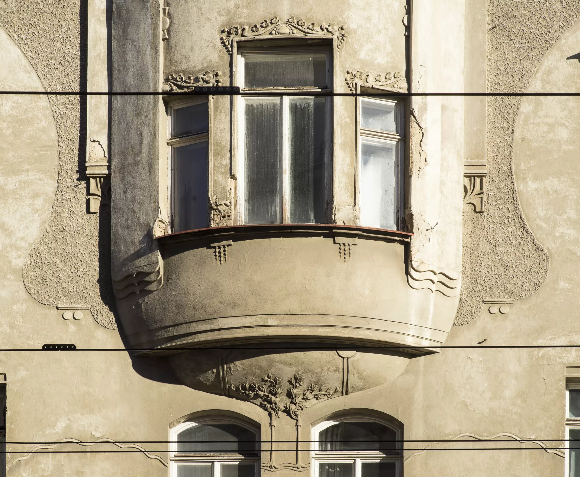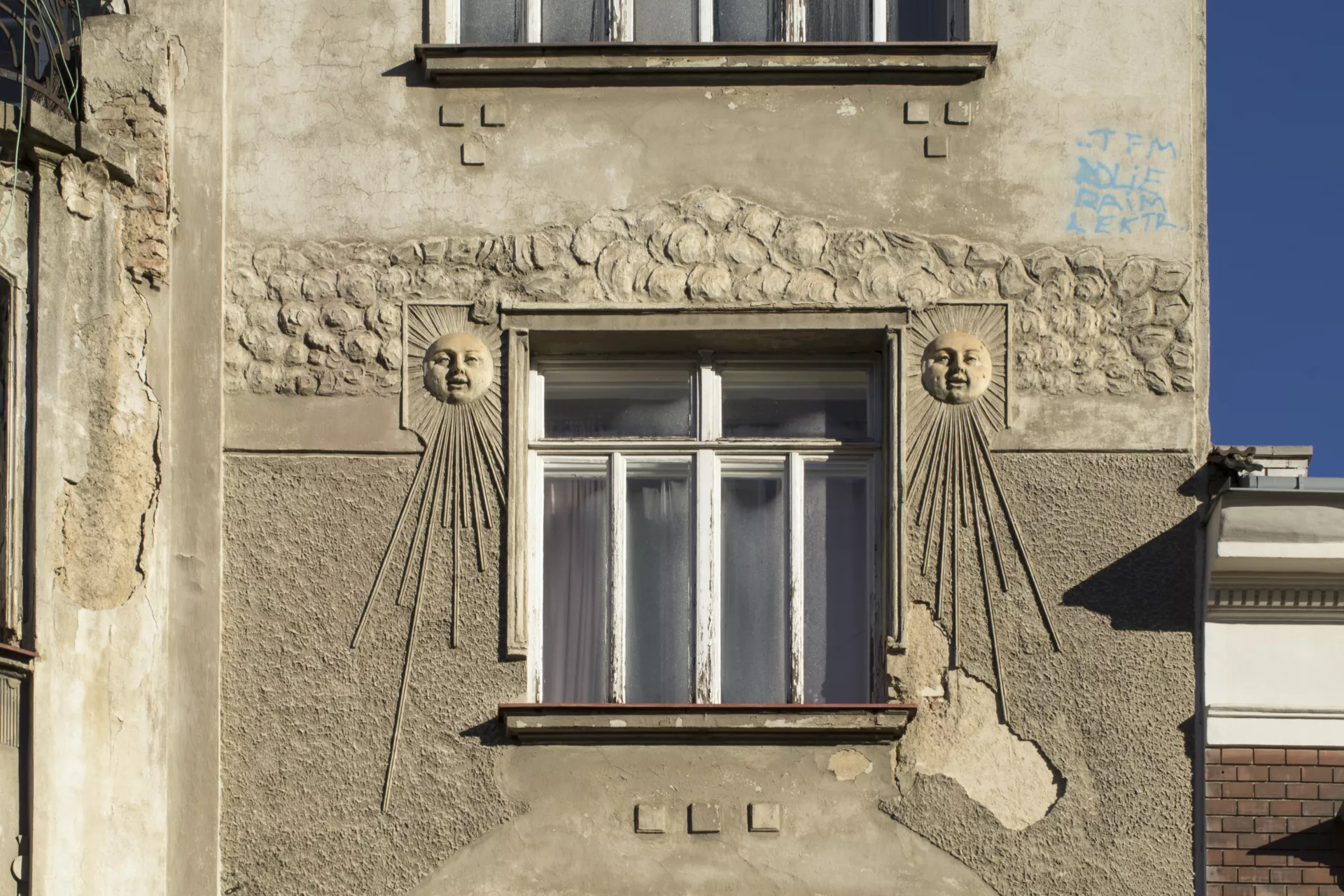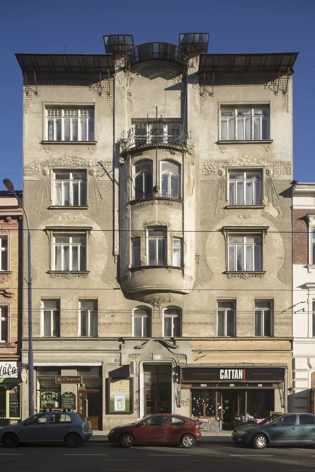 In der Nähe der Mündung der lebhaften Straße Veveří in den Zierotinplatz (Žerotínovo náměstí) entstand 1905 eines der markantesten Objekte des Brünner Jugendstils. Bauherr des Hauses war der Baumeister Theodor Veselý. Bislang ist jedoch unklar, wer diesen bemerkenswerten Bau entworfen hat, der sowohl hinsichtlich seiner Höhe als auch visuell deutlich über die zwei direkten Nachbarhäuser herausragt. Als am der Errichtung des Baus beteiligter taucht in der Literatur der Name des Baumeisters Karel Kletzel auf, bei dem es sich um einen Sohn des Tischlermeisters und Großhändlers Thedor Kletzel handelte. Karel Kletzl wurde allerdings erst 1893 geboren, und auch sein älterer Bruder Jan Vladimír Kletzl (1885) war zur Bauzeit des Hauses erst zwölf Jahre alt, weswegen diese Hypothese nur schwer annehmbar ist. In der Straße Veveří entstand 1905 de facto ein Doppelhaus. Die langgestreckte rechteckige Parzelle wurde fast ganz von zwei dem Grundentwurf nach spiegelverkehrt komponierten, vierstöckigen Häusern mit mächtigen Hofflügeln genutzt, die durch einen Vebindungsgang miteinander verbunden sind. Das zur Straße gewandte Objekt wurde mit einer sehr originellen dekorativen Fassade versehen. Die symmetrisch entworfene Front wurde in zwei Zonen unterteilt: in ein horizontal komponiertes Parterre, das von einem breiten Band der doppelten Linie eines Kordon- und Fenstergesims des ersten Wohnstockerks abgeschlossen wird, und in eine vertikal ausgerichtete, tektonisch im Grunde genommen flache Fassadenfläche in den Obergeschossen. Die Vertikalität wird noch durch das einzige markante plastische Element in Form eines leicht segmentartig gewellten Erkers gesteigert, der das zweite und dritte Stockwerk miteinander verbindet. Der von einer Balkonterrasse gekrönte Erker wird von zwei Lisenen umschlossen, deren Höhe an den Seiten einen Segmentgiebel rahmen. Das standardmäßige Dachgesims wurde dabei durch die Eisenkonstruktion eines von Konsolen gestützten Glasvordachs ersetzt. An der Straßenfassade ist die künstlerische Behandlung der flachen Partien bemerkenswert. Die Fassade wird durch die organisch konvex-konkaven Formen der in grobkörnigem und glattem Putz ausgeführten Jugendstilornamentik gegliedert, die durch ganz konkrete Bilder ergänzt werden – oben werden reliefierte Wolkenhaufen von den Strahlen plastisch anthropomorhisierter Sonnen durchbohrt, darunter durchziehen stilisierte wellenförmige Wolkenbögen ferner Horizonte die Fassade, währed die Fensteröffnungen von einem Reliefdekor in Form von Ranken und Schlingpflanzen begleitet werden. Das zentrale, zurückgesetzte Portal von rechteckiger abgerundeter Form ist von einer konvex-konkav geformten Aussparung umgeben und wird oben von einem weligen Gesimsabschnitt gerahmt. In der Aussparung wird der Eingang von einer reliefierten Landschaftsszenerie mit zwei weitausladenden und sonnenbestrahlten Baumkronen gesäumt. Der den Erker abschließende Terrassenbalkon wurde hingegen mit einem dekorativen Schmiedegeländer mit dem Motiv stilisierter Pflanzenranken versehen. Das reiche Gestaltungsprogramm der Fassade wurde noch durch zahlreiche vegetabile und abstrakte Ornamente zu einer außerordenltich vielfältigen und dynamisch wirkenden Gesamtform ergänzt. Im Interieur des Hauses ist dann eine Reihe von Originalelementen erhalten geblieben: dekorative Geländer, profilierte Holzlaibungen der Türen, Leuchter oder Glasfüllungen u.a. Das Mietshaus blieb bis 1917 im Besitz der Familie Veselý als es von der Witwe Ludmila Veselá an Karel und Karola Dým verkauft wurde. Das Haus stellt eine individuelle Variation für die lockeren Formen des westeuropäischen Jugendstils dar. Mit seiner sehr außergewöhnlichen, durch die Glasvordächer entlasteten Fassade hebt es sich von der Straßenfront ab und ist eines der originellsten Gebäude der Straße Veveří, das eine gebührende Pflege verdienen würde. Aleš Homola