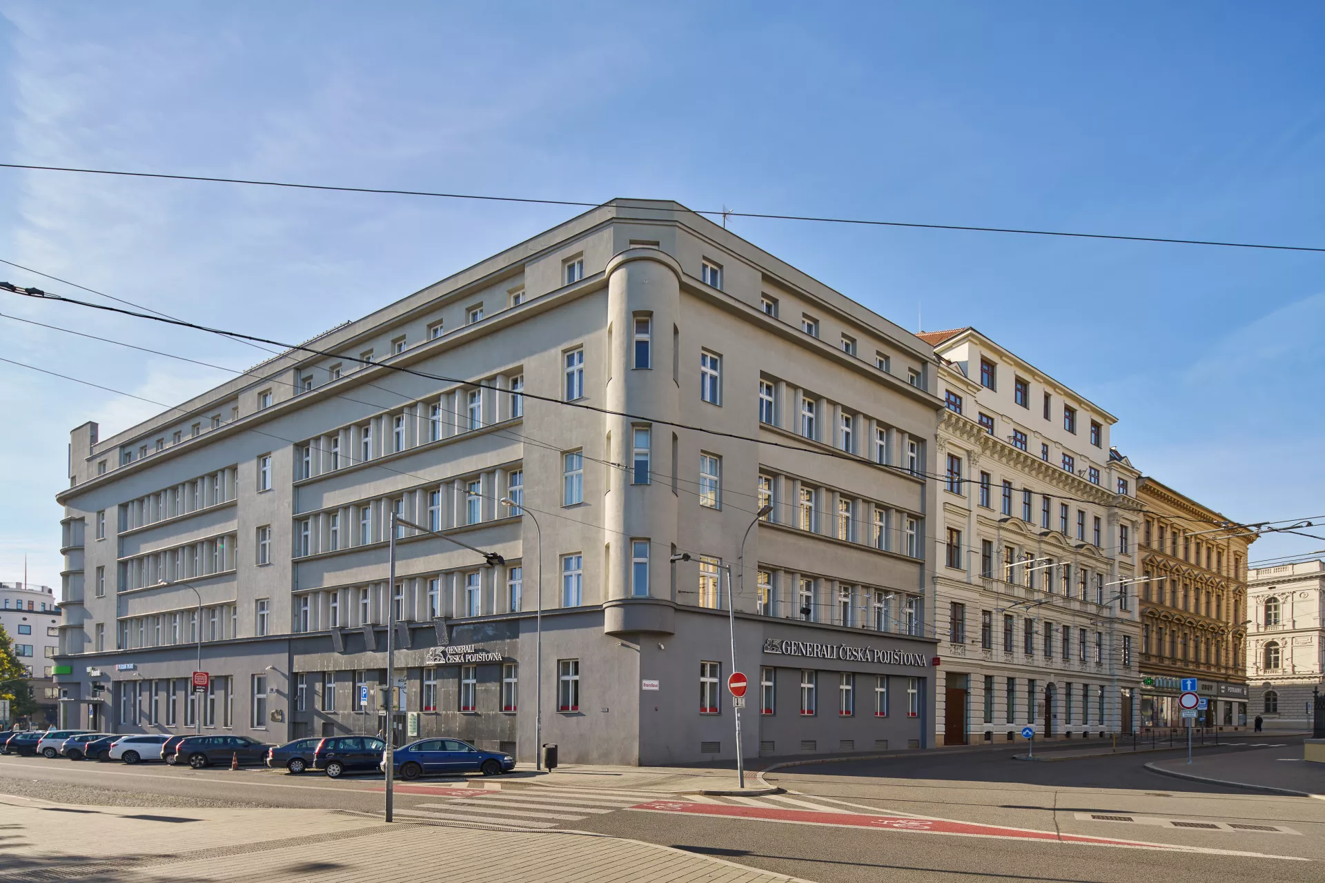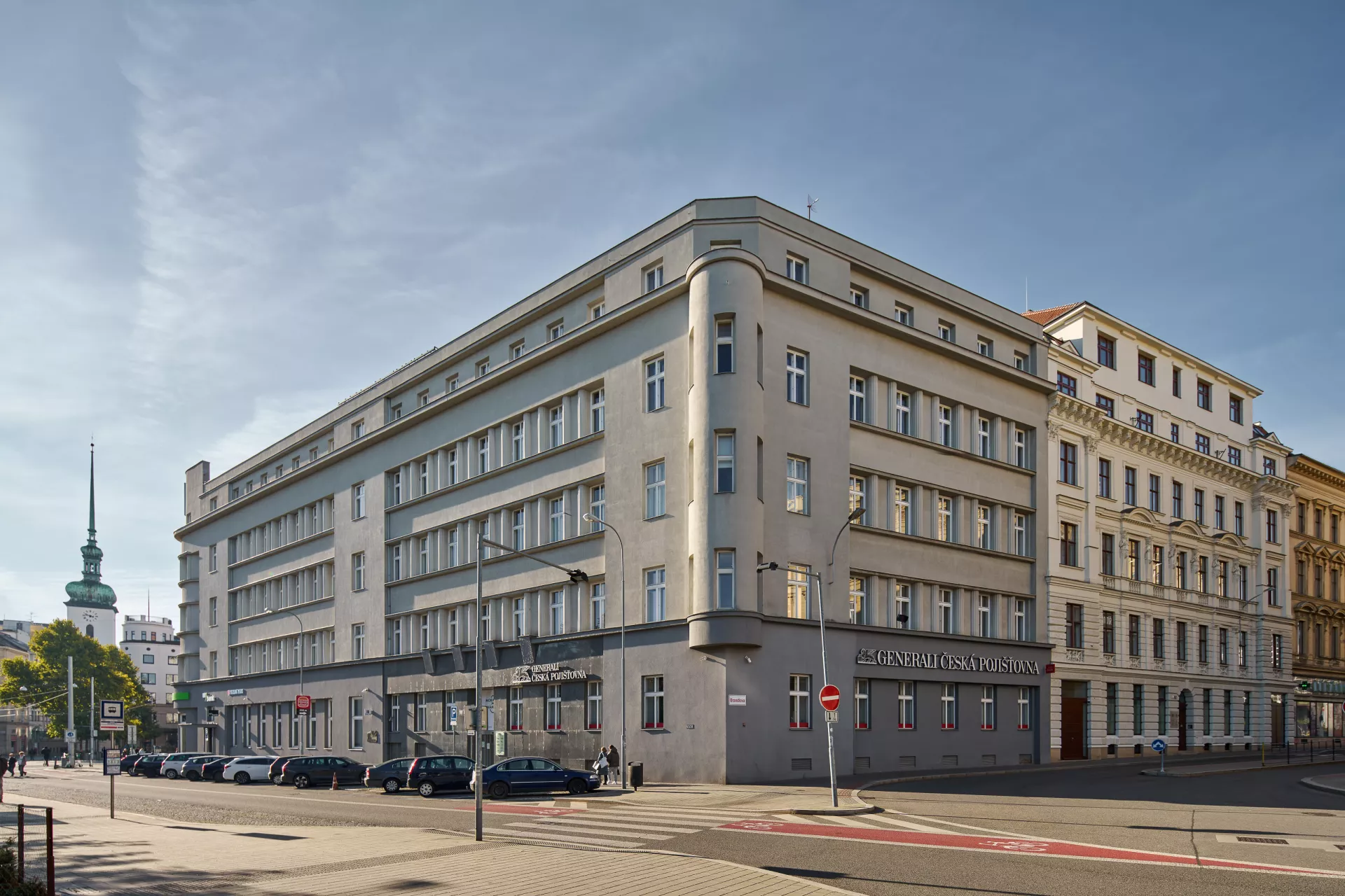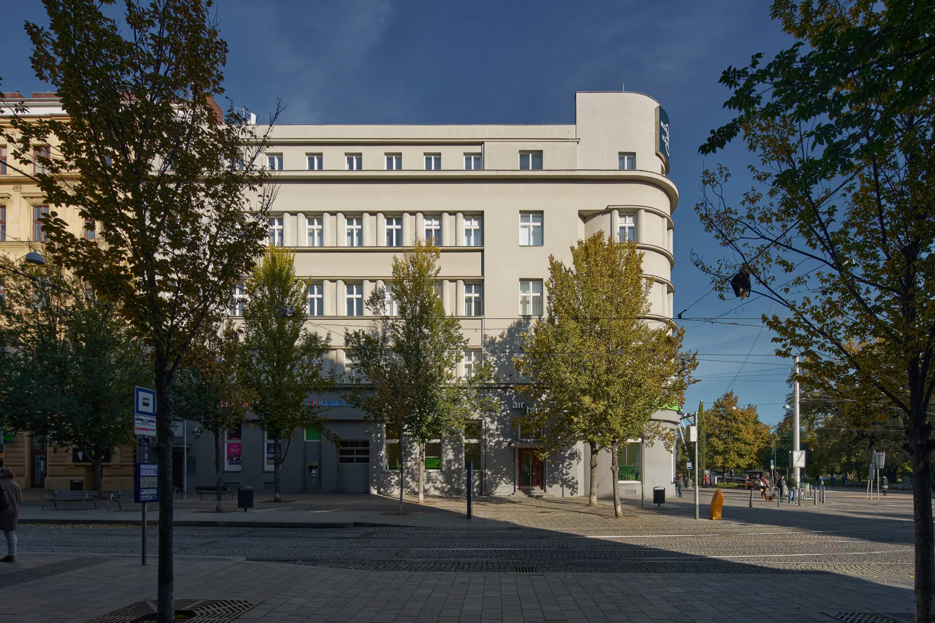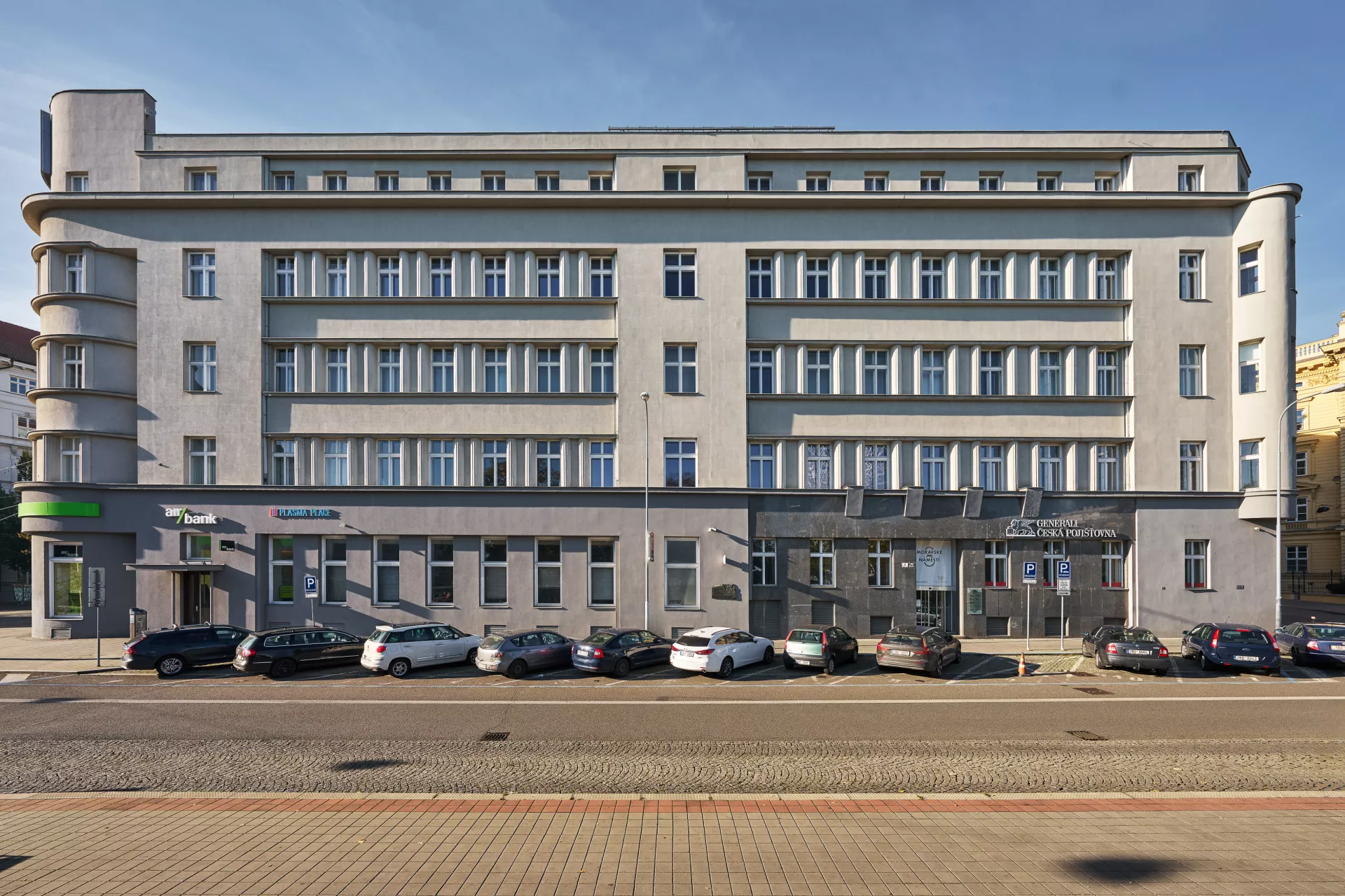 Die Adaptierung des historisierenden Hauses des Architekten F. A. Dvořák aus dem Jahre 1890 für die Bedürfnisse der Versicherung Slavie erfolgte Anfang der dreißiger Jahre. Sie betraf hauptsächlich die Modernisierung und Vereinheitlichung der historisierenden Fassaden zweier benachbarter Gebäude, bei denen die Schmuckelemente durch eine einfache architektonische Formlehre ersetzt wurden. Im Erdgeschoss des Hauses in der Straße Joštova aus dem Jahre 1913 befand sich das Café Bellevue.