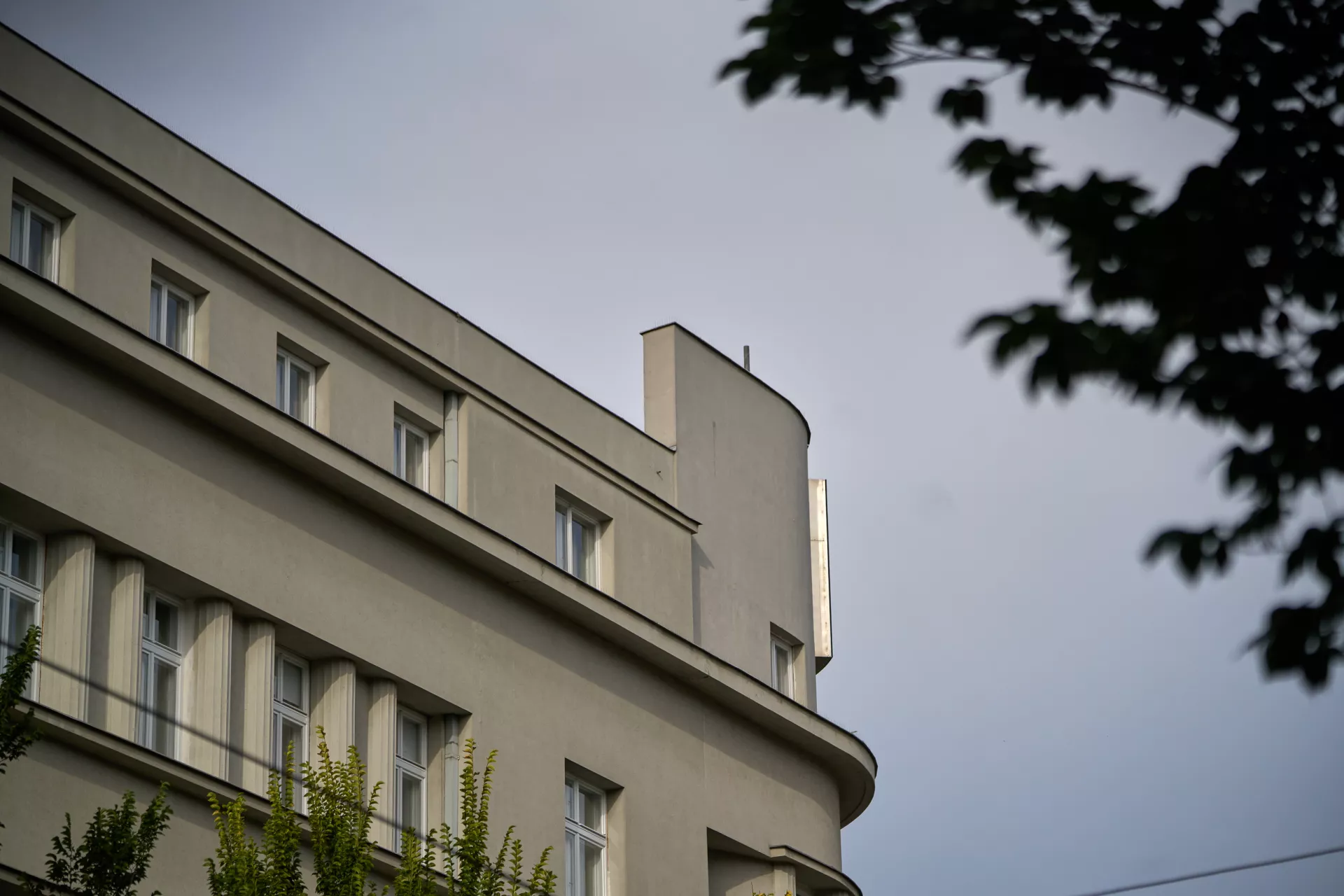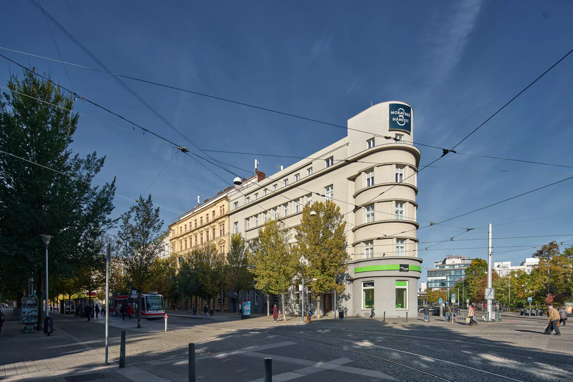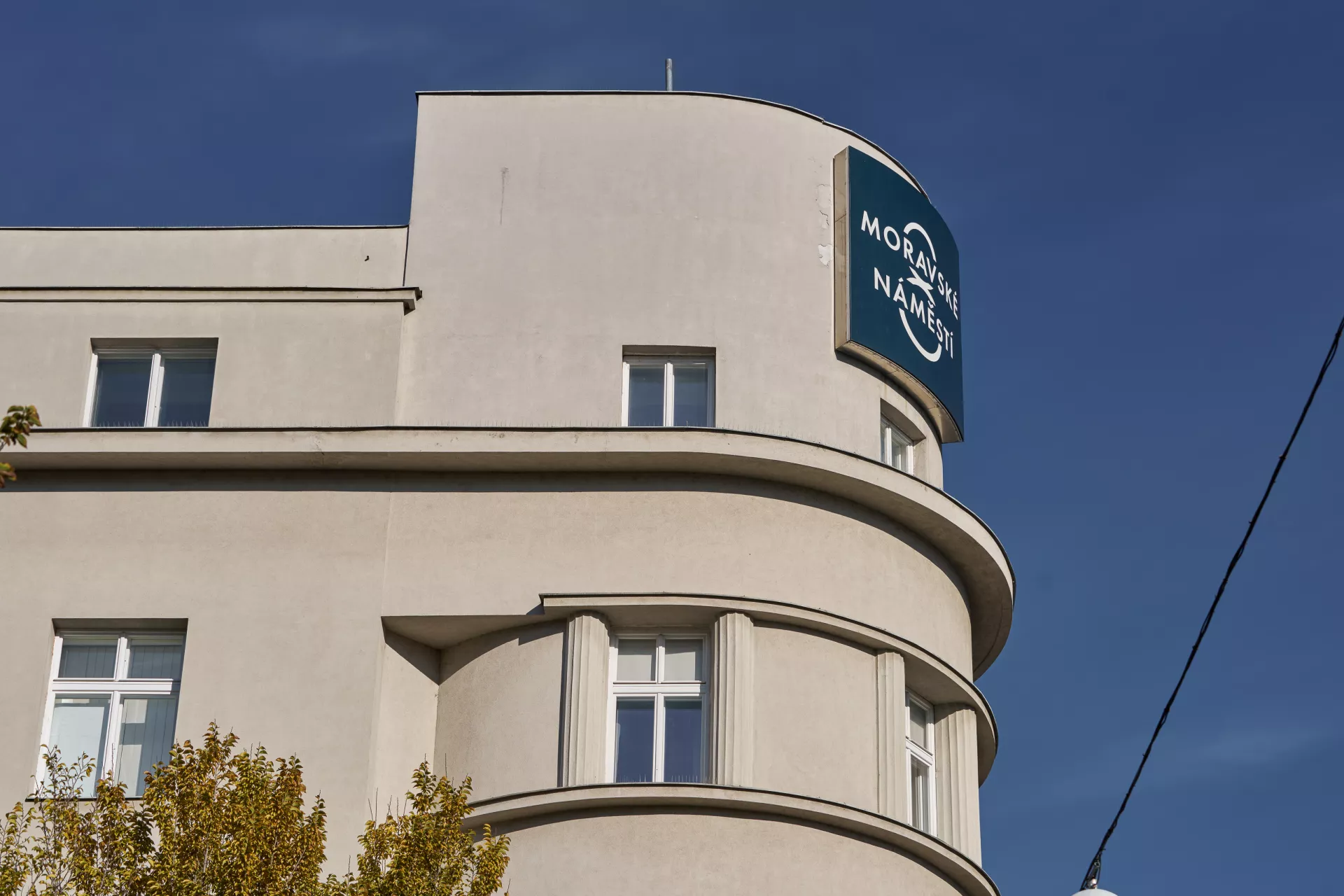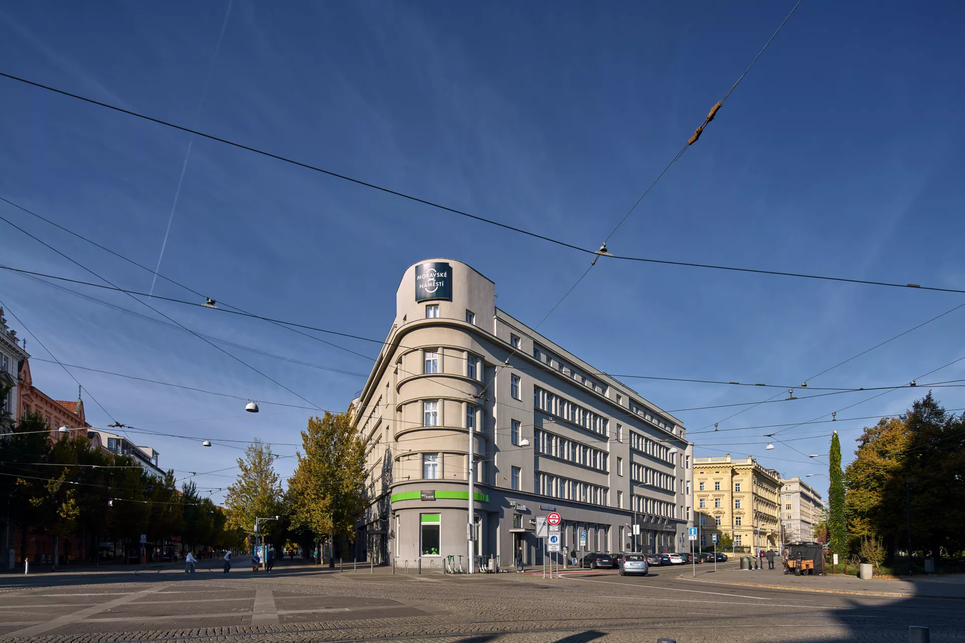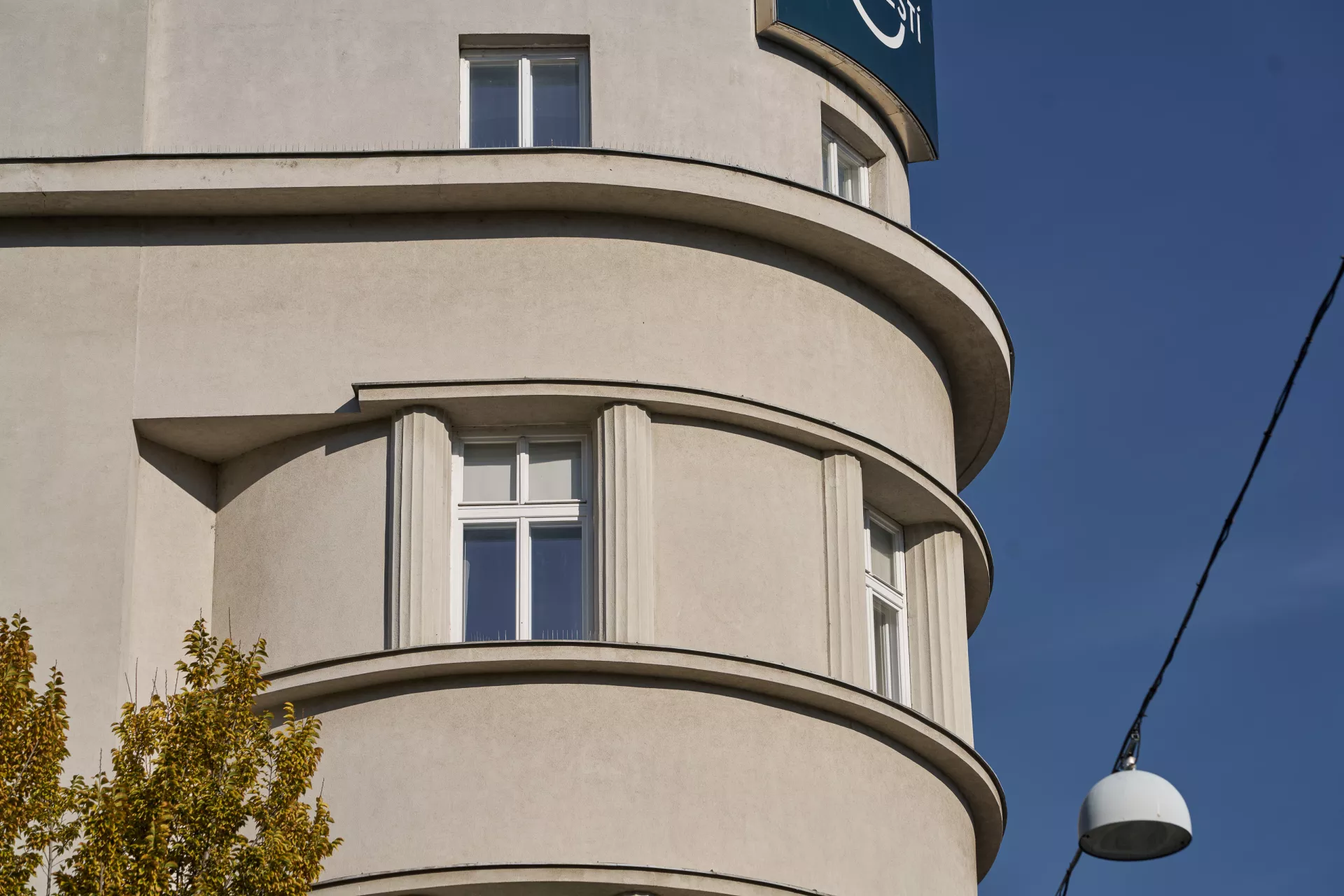 Die Adaptierung des historisierenden Hauses des Architekten F. A. Dvořák aus dem Jahre 1890 für die Bedürfnisse der Versicherung Slavie erfolgte Anfang der dreißiger Jahre. Sie betraf hauptsächlich die Modernisierung und Vereinheitlichung der historisierenden Fassaden zweier benachbarter Gebäude, bei denen die Schmuckelemente durch eine einfache architektonische Formlehre ersetzt wurden. Im Erdgeschoss des Hauses in der Straße Joštova aus dem Jahre 1913 befand sich das Café Bellevue.