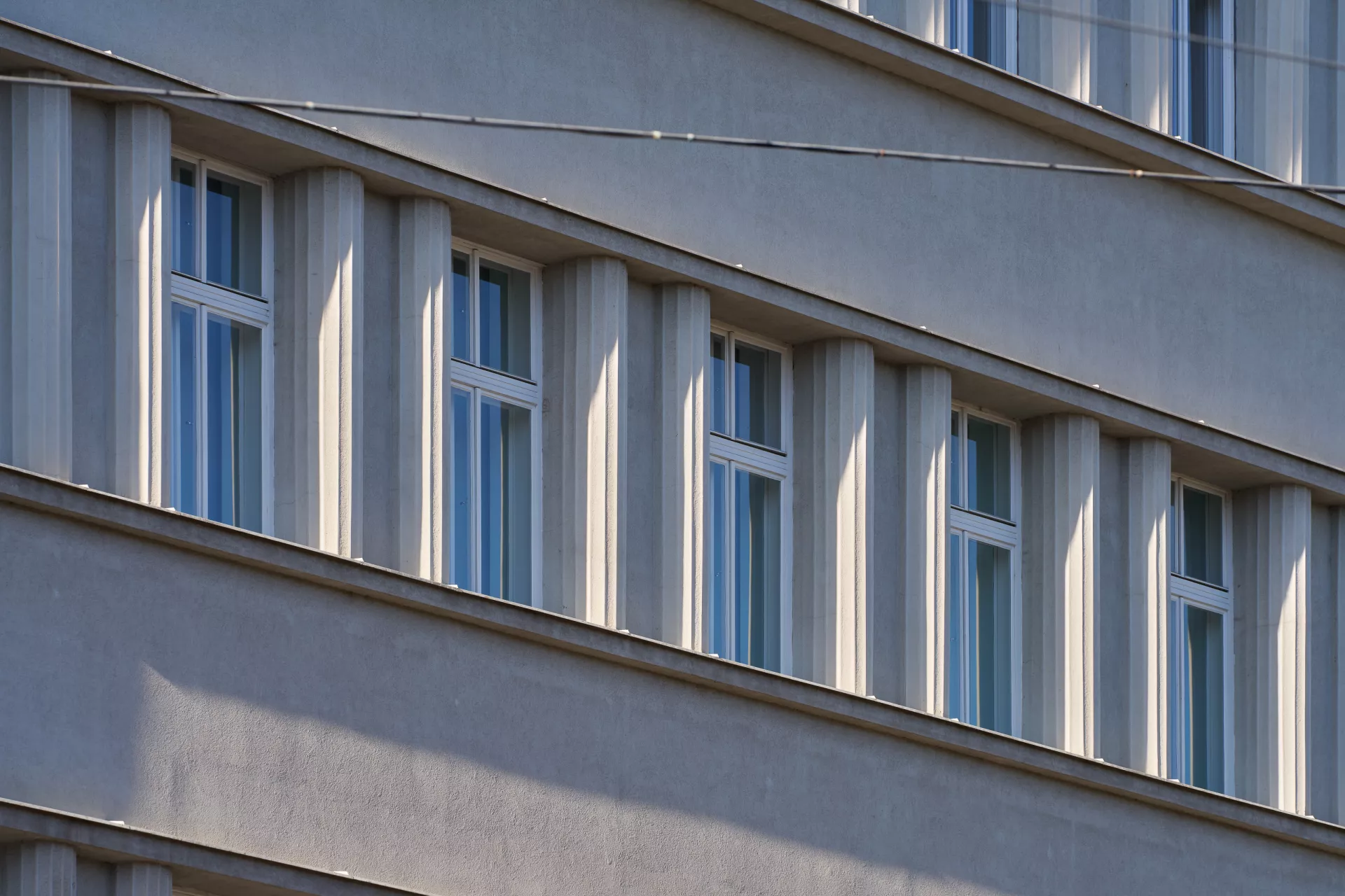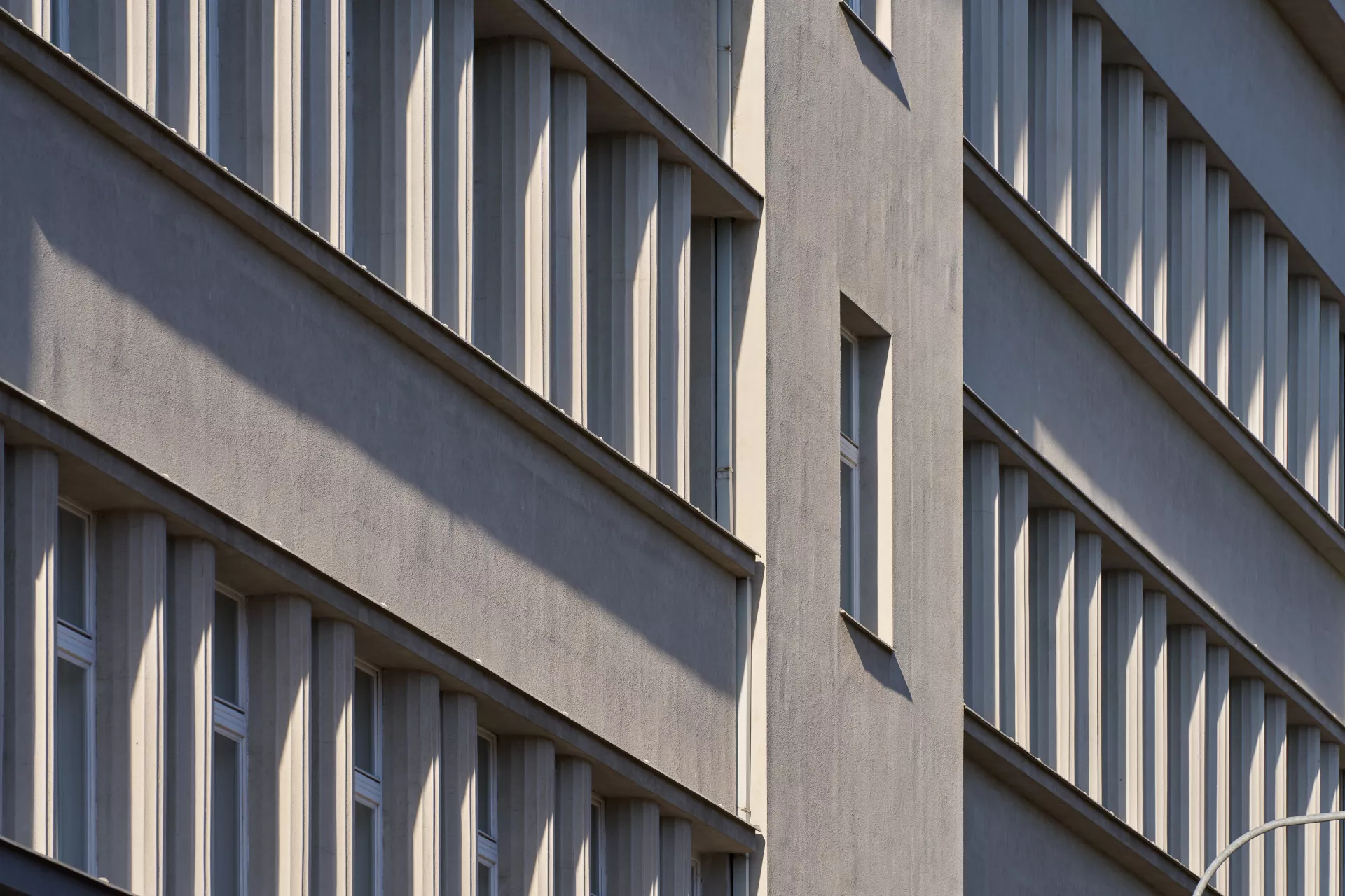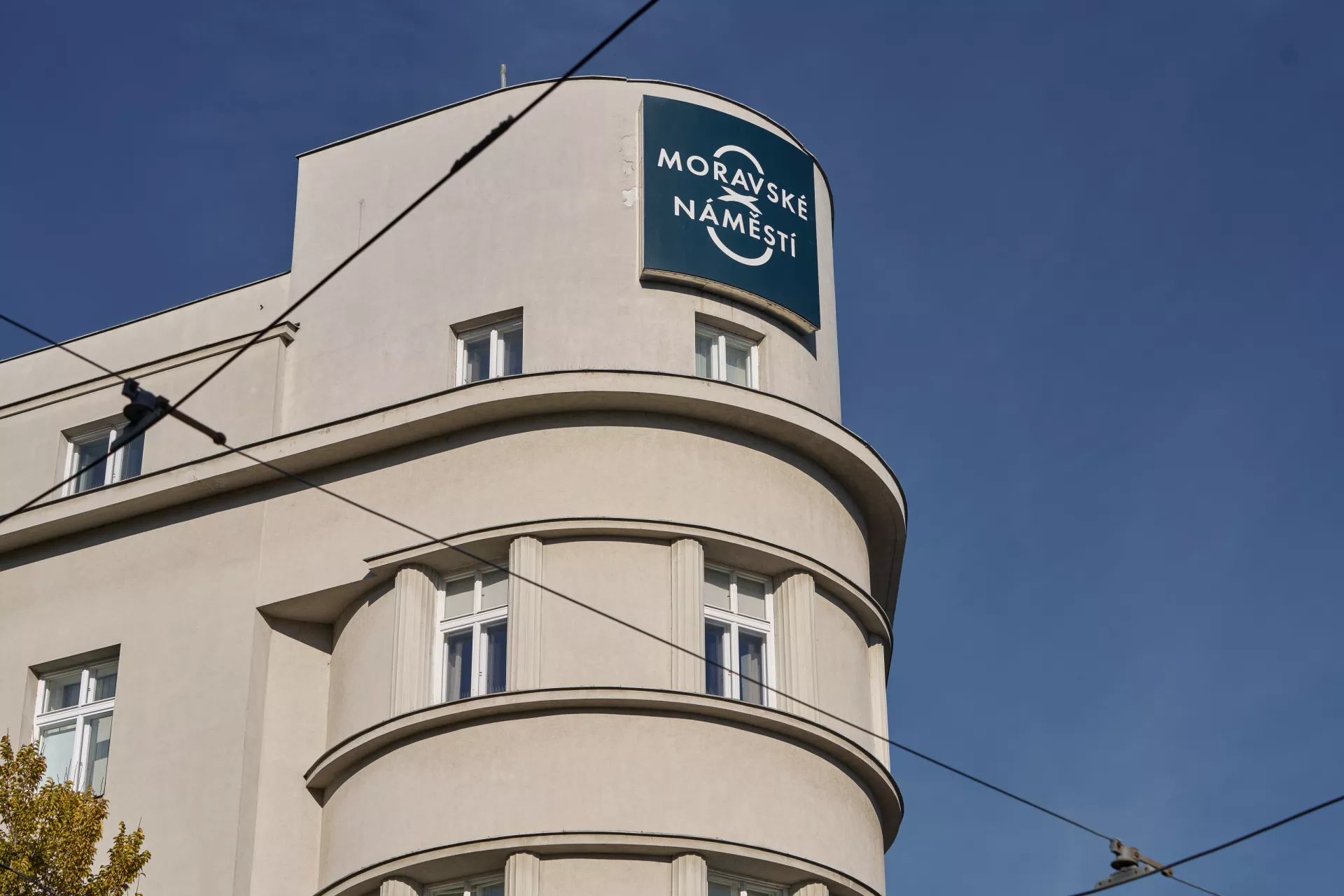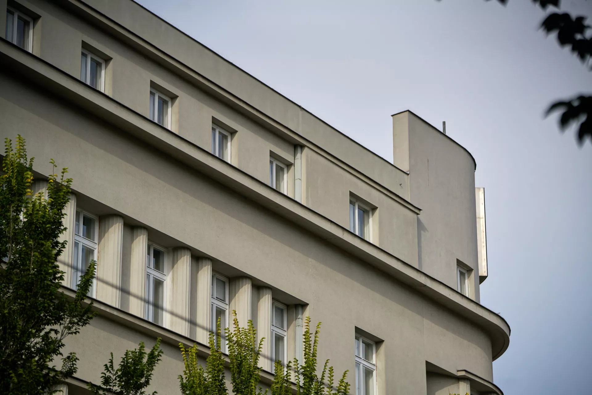 Die Adaptierung des historisierenden Hauses des Architekten F. A. Dvořák aus dem Jahre 1890 für die Bedürfnisse der Versicherung Slavie erfolgte Anfang der dreißiger Jahre. Sie betraf hauptsächlich die Modernisierung und Vereinheitlichung der historisierenden Fassaden zweier benachbarter Gebäude, bei denen die Schmuckelemente durch eine einfache architektonische Formlehre ersetzt wurden. Im Erdgeschoss des Hauses in der Straße Joštova aus dem Jahre 1913 befand sich das Café Bellevue.