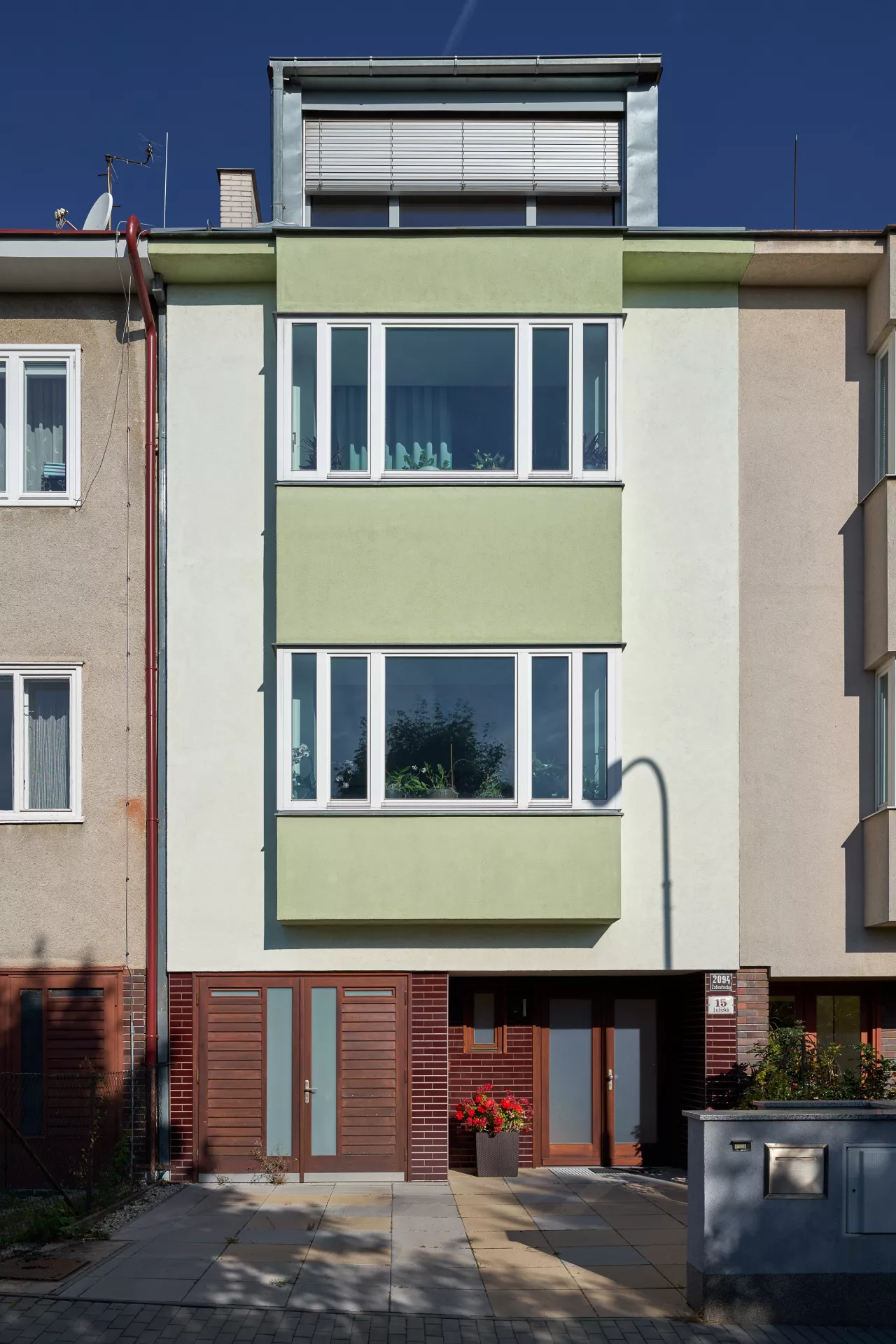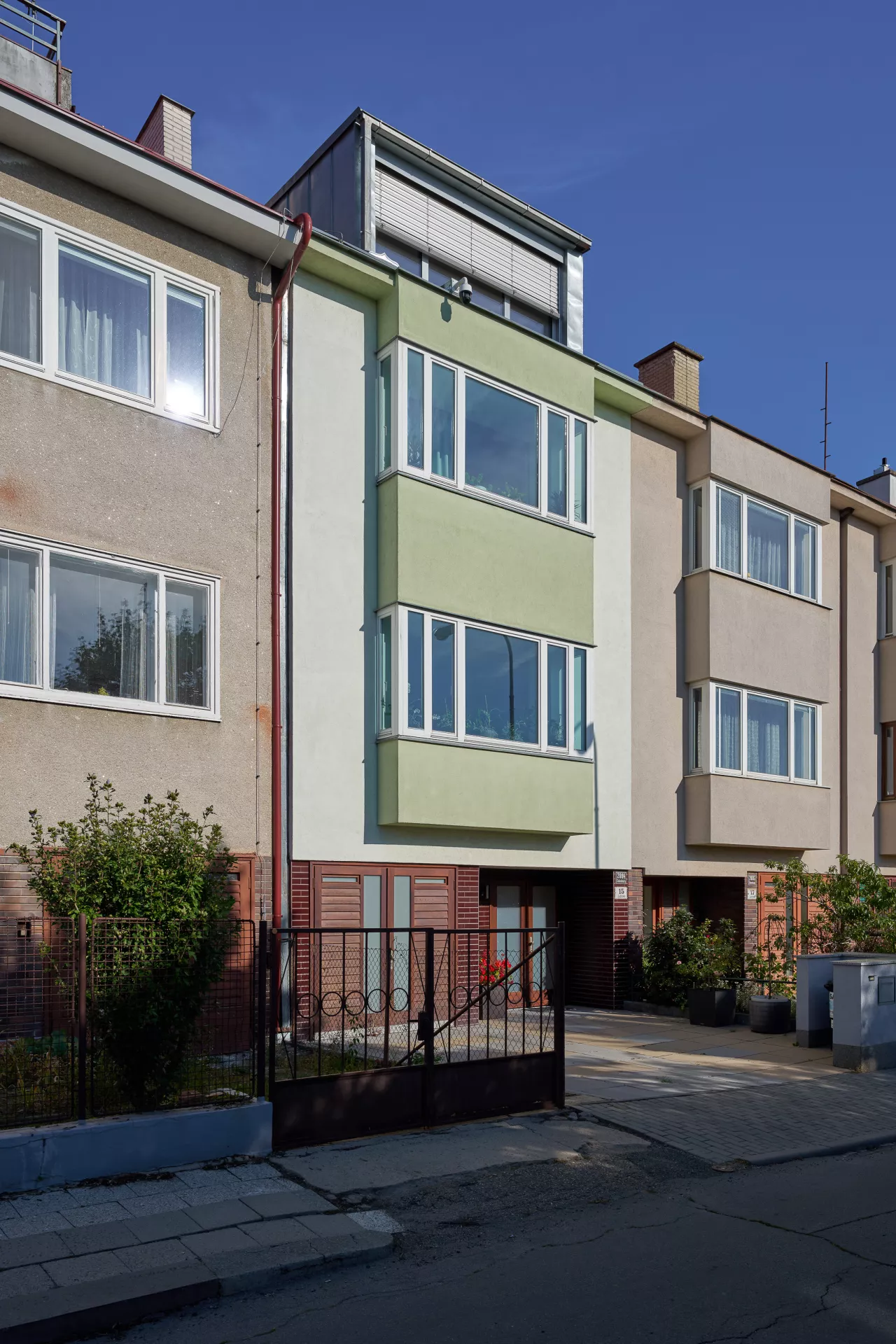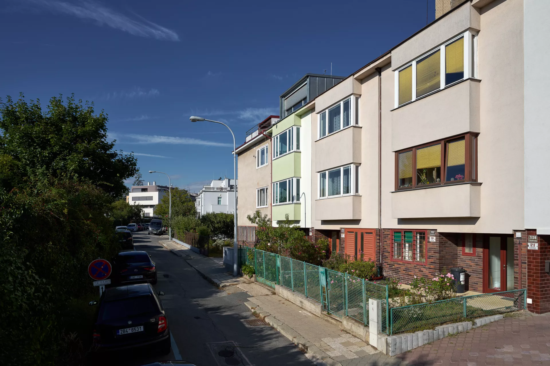 Davon, welche Breitenwirkung die Ausstellungen experimentellen Wohnraums auf die Gestalt künftiger architektonischer Produktion hatte, zeugt ihre Akzeptanz durch einheimische Bauunternehmer. Die Baufirma von Václav Dvořák und den Brüdern Kuba entwickelte Ende der 20er Jahre das Konzept des „vertikalen Wohnraums“ indem sie die Innovation der Reihenhäuser für Familien übernahmen, mit denen wir schon in Zusammenhang mit den Gebäuden der Kolonie „Neues Haus“ zu tun hatten. Diese Typenbauten ermöglichten beträchtliche finanzielle Einsparungen und stellten gleichzeitig modernen Wohnraum mit einer Vielzahl räumlicher, funktionaler und ästhetischer Qualitäten dar. Die Häuser wurden ohne Keller gebaut, da dies erhöhte Preise zur Folge gehabt hätte; die Haustechnik sowie Nebenräume wie Garage, Heizraum, Waschküche oder das Zimmer für die Hausangestellte lagen im Erdgeschoss. Im ersten Stock befanden sich die Küche (die ausschließlich der Essenszubereitung diente), die Halle mit einer Treppe und das Wohnzimmer (als Raum zur Entspannung); der zweite Stock war für die Schlafzimmer (ein jeweils eigenes für Eltern und Kinder) sowie Bad und Toilette (die hier bereits eine Selbstverständlichkeit waren) bestimmt. Im Dachgeschoss konnte noch eine Kammer oder ein Gästezimmer untergebracht sein, das auf eine Dachterrasse führte. Ein Reihenhauskomplex bestand aus drei Häusern mit jeweils länglichem Grundriss, schmaler Stirnseite und entsprechender Form der Parzelle, was Einsparungen beim Kauf des Grundstückes sowie geringe Ausgaben bei der Instandhaltung von Fassade und Gehsteig zur Folge hatte. Die Anordnung der Gebäude in einer Reihe verringerte zudem die Kosten beim Bau der Außenwände und der Grundmauern und verbesserte zugleich die Wärmedämmung der benachbarten Häuser. Die Reihenhäuser von Václav Dvořák und den Brüdern Kuba sind in vielen Stadtteilen zu finden. Ihre Fassaden zeichnen sich durch minimale Ästhetik, die Benutzung einer Opaxit- oder Fliesenverkleidung, verglaste Erker und Balkone sowie die charakteristischen Kranzgesimse mit Kassetten .