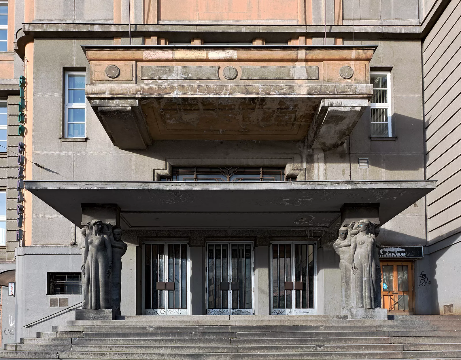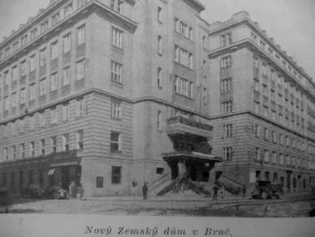 Im Jahre 1923 entschied sich der Landesausschuss einen Wettbewerb zur baulichen Erweiterung des II. Landhauses des Architekten Ferdinand Hrach aus dem Jahre 1917 auszuschreiben. Die Gründe hierfür waren die Lage der bisherigen Amtsräume, die unter einem Dach vereint sein sollten, an verschiedenen Orten, die allgemeine Wohnungsnot sowie die hohe Arbeitslosigkeit unter den Bauarbeitern. Die Wettbewerbsbedingungen legten eine Respektierung des benachbarten historistischen Gebäudes und seine bauliche Erweiterung anstelle der älteren unangemessenen Bebauung der Ecke an der Kounicova-Straße und dem Žerotínovo Náměstí (Žerotín-Platz) fest. Wohnräume sollten zwei Drittel der Bodenflächen einnehmen, wie es das Gesetz über Bautätigkeiten im Falle des Erhalts einer staatlichen Förderung vorsah. Weiters waren im Gebäude ein Café, ein Restaurant, Geschäfte sowie eine große Schalterhalle mit weiteren Räumen der Mährischen Hypothekenbank geplant. Die Jury des Wettbewerbs verlieh letztendlich niemandem den ersten Preis, den zweiten Platz belegte das Projekt „Jednota“ („Einheit“) von Miloslav Kopřiva, den dritten Platz Bohuslav Fuchs mit dem Entwurf „III. Landhaus“. Der Landesausschuss hatte jedoch gegen Kopřivas Entwurf eine Reihe von Einwänden bezüglich des Betriebs des Gebäudes, entschied sich deshalb, das Urteil der Expertenkommission nicht zu respektieren, und beauftragte den obersten Baumeister František Utíkal, die bauliche Erweiterung zu planen. Dieser Schritt löste empörten Widerstand sowohl in der Öffentlichkeit, als auch bei Fachleuten aus, die sich radikal den historistischen Tendenzen von Utíkals Entwurf widersetzten. Kritisiert wurden nicht nur die veraltete Formensprache, sondern auch die seltsamen Praktiken bei der Ausschreibung architektonischer Wettbewerbe. Unter dem Druck der öffentlichen Meinung entschied sich das Bauamt, wenigstens die Gestaltung der Fassade dem Architekten Karel Náhůnek zu überlassen, der bei seinem Entwurf teilweise von der ursprünglichen Konzeption Kopřivas ausging. Der Haupteingang des Gebäudes befindet sich in der zurückversetzten Fassade an der Ecke, die den administrativen an das ältere Gebäude Hrachs anschließenden Flügel mit dem Wohntrakt verbindet. In diesem in der Kounicova-Straße liegenden Teil wurde aufgrund der unpassenden ursprünglichen Höhe der Decken (4 m) ein sechster Stock ergänzt. Die Fassaden reagieren sensibel auf den historistischen Dekor des alten Gebäudes, der in die geometrischen Formen des Art Deco übertragen wurde, was sich vor allem an der Fassade in der Ecke zeigt, die von einem erhöhten Risalit gebildet wird. Über dem Haupteingang befindet sich ein Vordach, das von Skulpturen menschlicher Figuren von Václav Mach gestützt wird; darüber befinden sich ein Balkon und die vertikale Linie der Treppenhausfenster mit geknickten Mauerblenden. Der Innenraum des Eingangsbereiches war mit schwarzer, grauer und grüner Marmorverkleidung geschmückt. Der Neubau wurde schließlich hauptsächlich von der Universitätsbibliothek genutzt. Im erhöhten Erdgeschoss wurde nach Náhůneks Entwurf ein großes französchisches Café für 568 Personen eingerichtet, im Souterrain ein Marmorsaal mit hoher Kapazität und ein Kino. PH