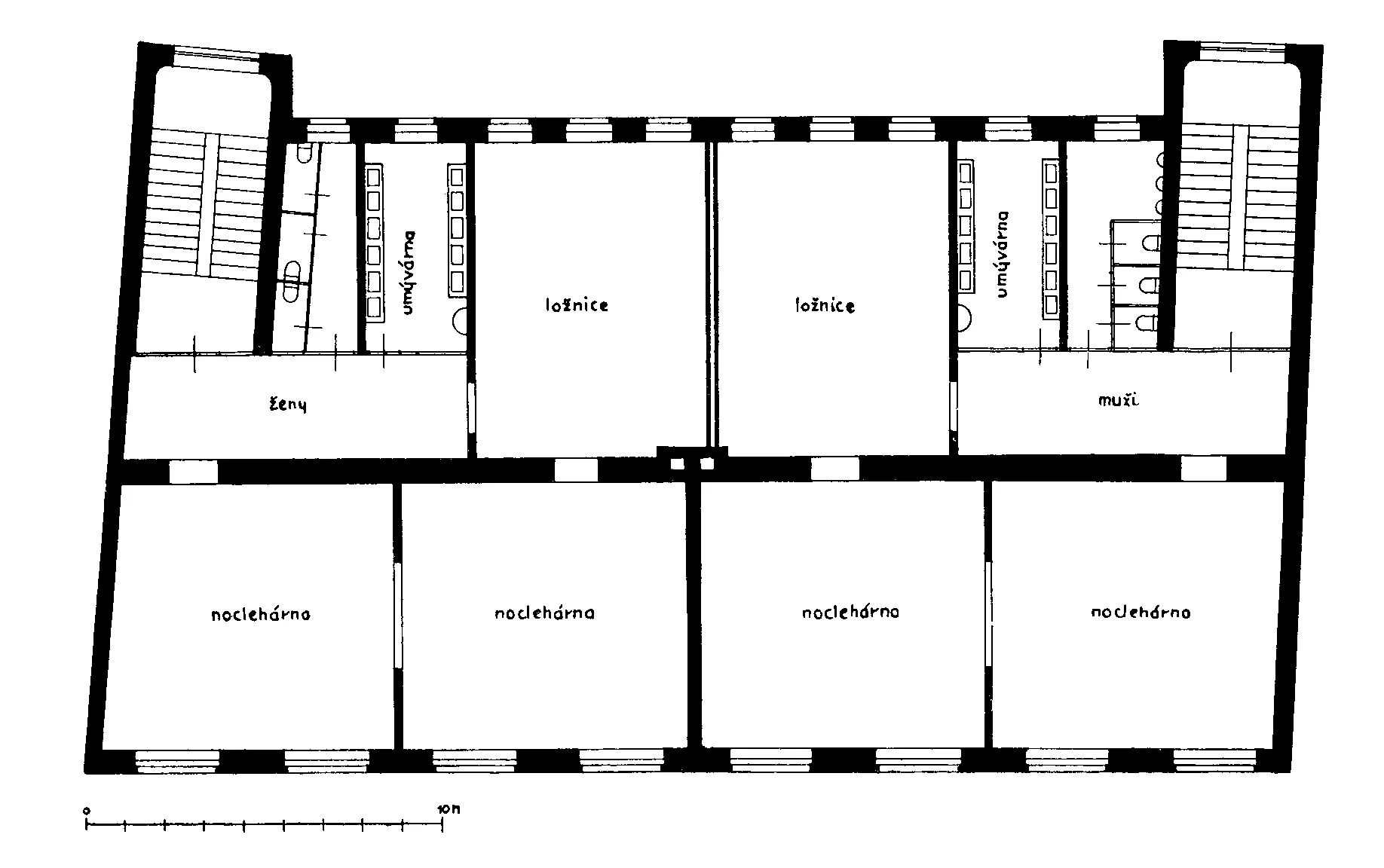 Die Notschlafstelle, die im Jahre 1924 vom Brünner Bauamt in der Bratislavská-Straße nach einem Entwurf von Jindřich Kumpošt erbaut wurde, stellte eine Notlösung für Obdachlose bzw. Menschen in kritischen finanziellen Situationen dar. Im Kontext der Problematik minimalen Wohnraums, mit der sich in der Zeit der Wohnungskrise eine Reihe von Architekten beschäftigte, handelte es sich hierbei um einen Extremfall, der Menschen in Not wenigstens grundlegende sanitäre Anlagen und ein Bett zur Übernachtung als Übergangslösung zur Verfügung stellen sollte. Das einfache Gebäude mit einer Fassade aus rohem Mauerwerk war in einen Männer- und einen Frauentrakt geteilt, in die von der Straße zwei getrennte Eingänge führten. In vier Geschossen waren pro Trakt jeweils drei geräumige Schlafsäle, ein großer Waschraum und Toiletten untergebracht. Im Gebäude hat heute das Amt des Stadtteils Brünn-Nord seinen Sitz, für dessen Bedürfnisse eine unsensible Adaption des Innenraums erfolgte, eine Aufstockung um zwei Geschosse, sowie ein Umbau des Parterres, das jetzt über einen zentralen Haupteingang verfügt. PH