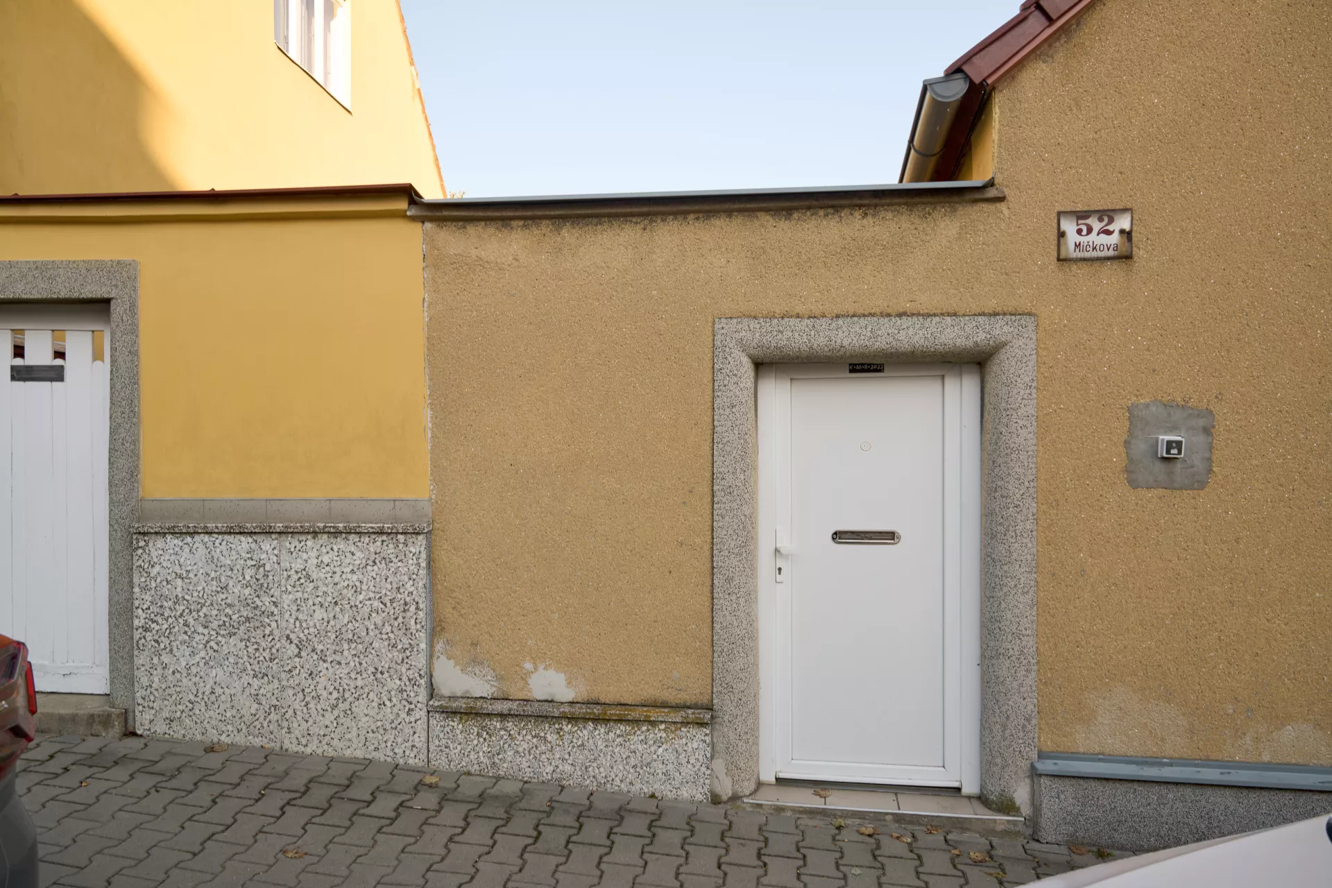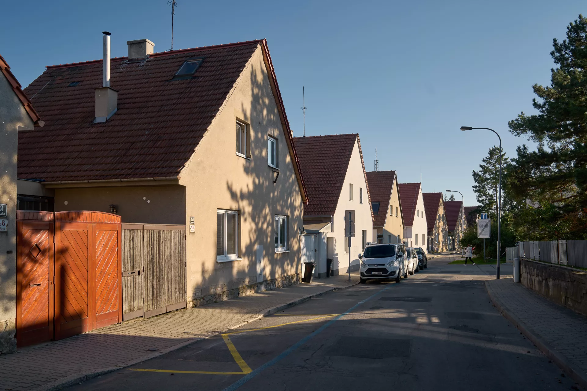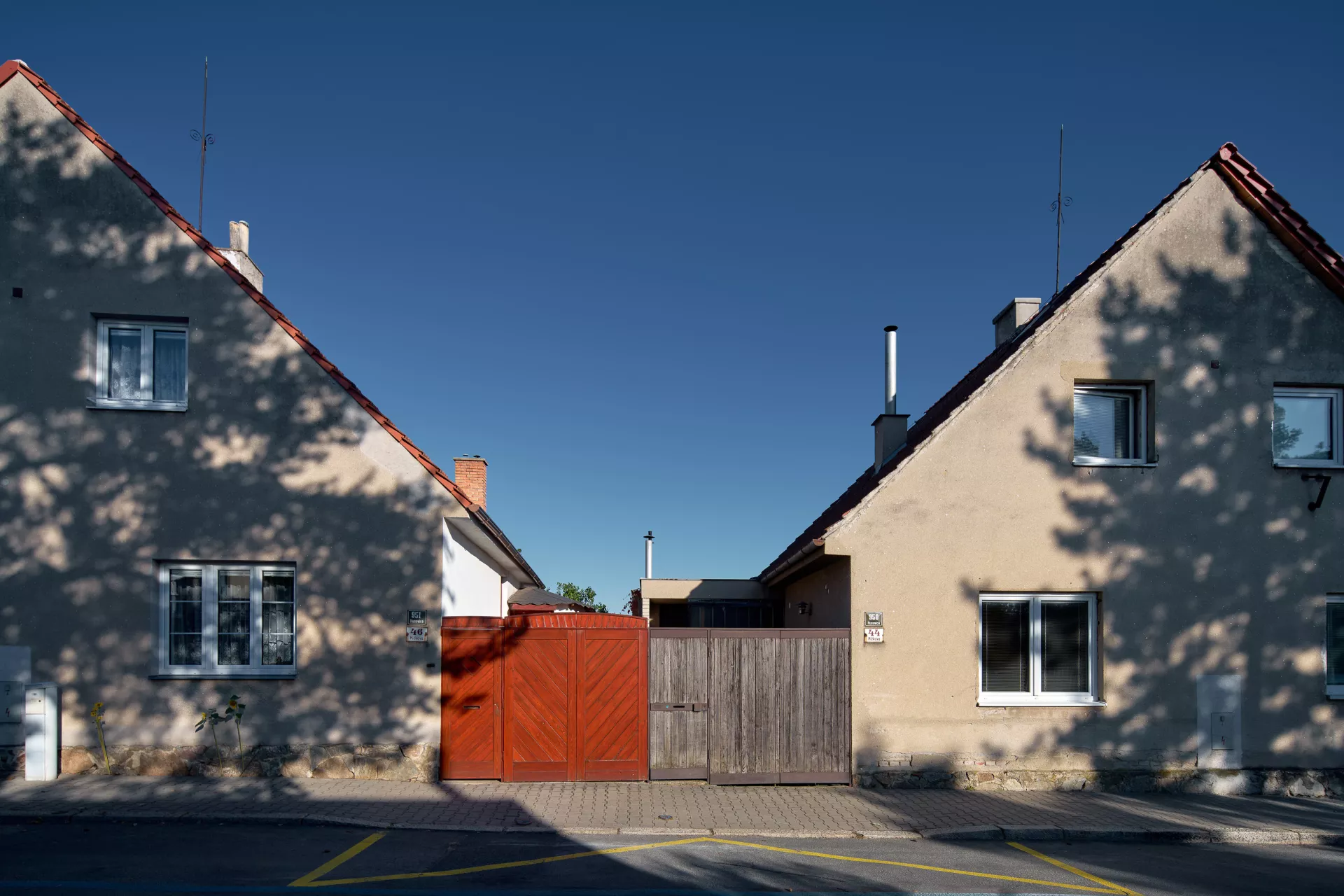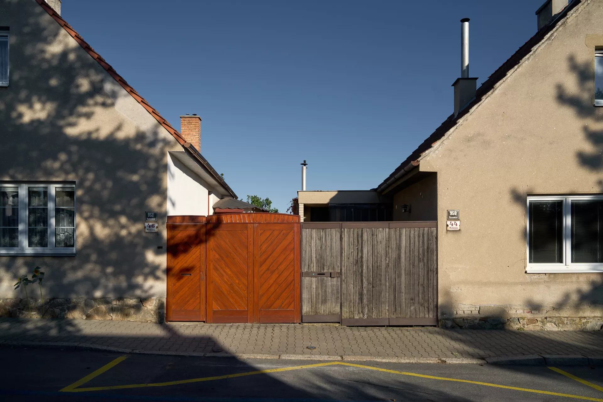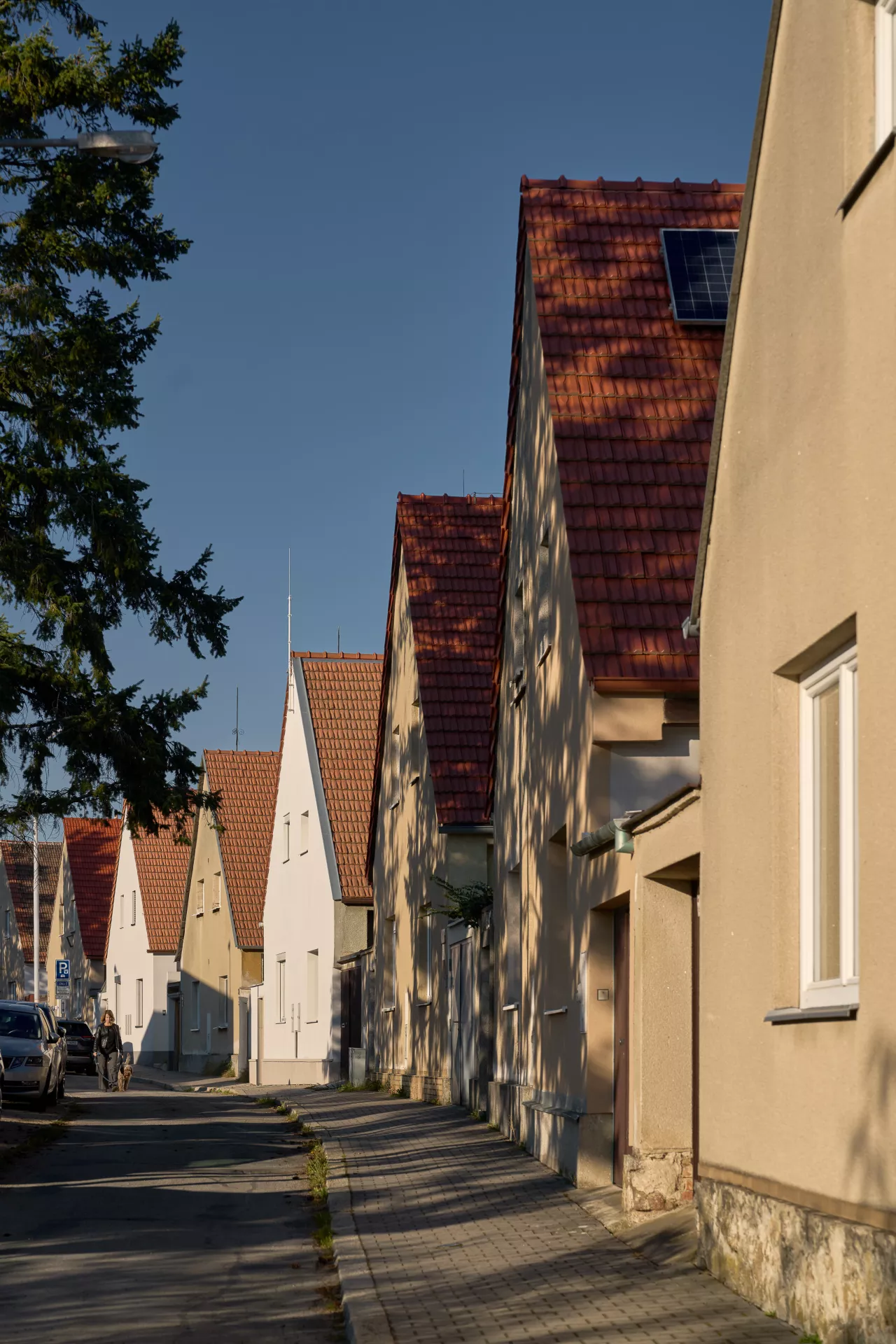Im Jahre 1923 entwarf Bohuslav Fuchs für die Baugenossenschaft „Rodina“ („Familie“) eine Reihe von elf Doppelhäusern in der Míčkova-Straße. Die Häuser sind Bestandteil einer Arbeiterkolonie, die auf dem Gipfel eines bewaldeten Hügels am Rand des Villengebietes des Stadtteils Štefánikova čtvrť (Štefánik-Viertel) entstand. Die Doppelhäuser erinnern mit ihrer Form an typische mährische Häuser auf dem Land, ihr Grundriss ist jedoch bereits den Bedürfnissen von Stadtbewohnern angepasst. Die Gebäude sind in zwei identische spiegelverkehrte Wohneinheiten aufgeteilt. Hinter dem Eingangs-Windfang mit anliegender Toilette befanden sich im Erdgeschoss eine Küche (die auch als Badezimmer benutzt wurde) und ein großes Wohnzimmer. Vom Eingangsbereich führte eine Treppe in das bewohnbare Dachgeschoss, wo zwei Schlafzimmer mit Abstellräumen lagen. Durch die Unterbringung zweier Wohneinheiten unter einem gemeinsamen Dach gelang es Bohuslav Fuchs sowohl die Bau- als auch die Betriebskosten zu senken. Angesichts der wachsenden Anforderungen an einen Wohnraum wurden die zwei Wohneinheiten in späteren Jahren miteinander verbunden, im Äußeren blieb jedoch der ursprüngliche Charakter der Häuser erhalten. LV