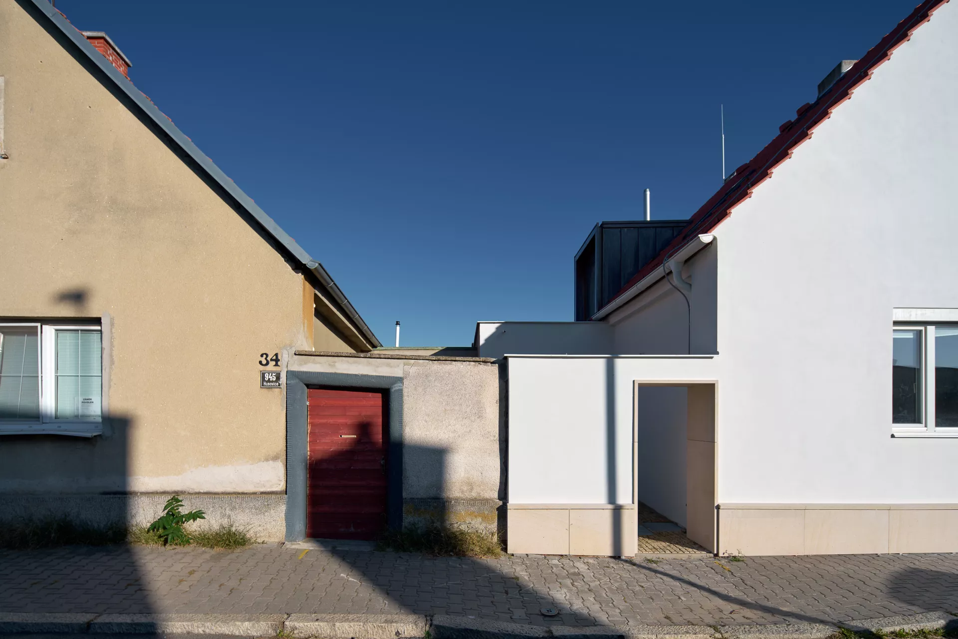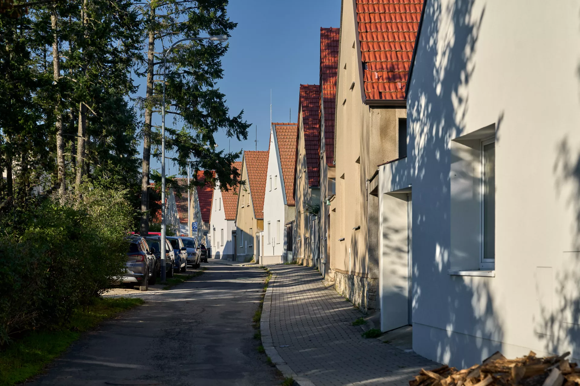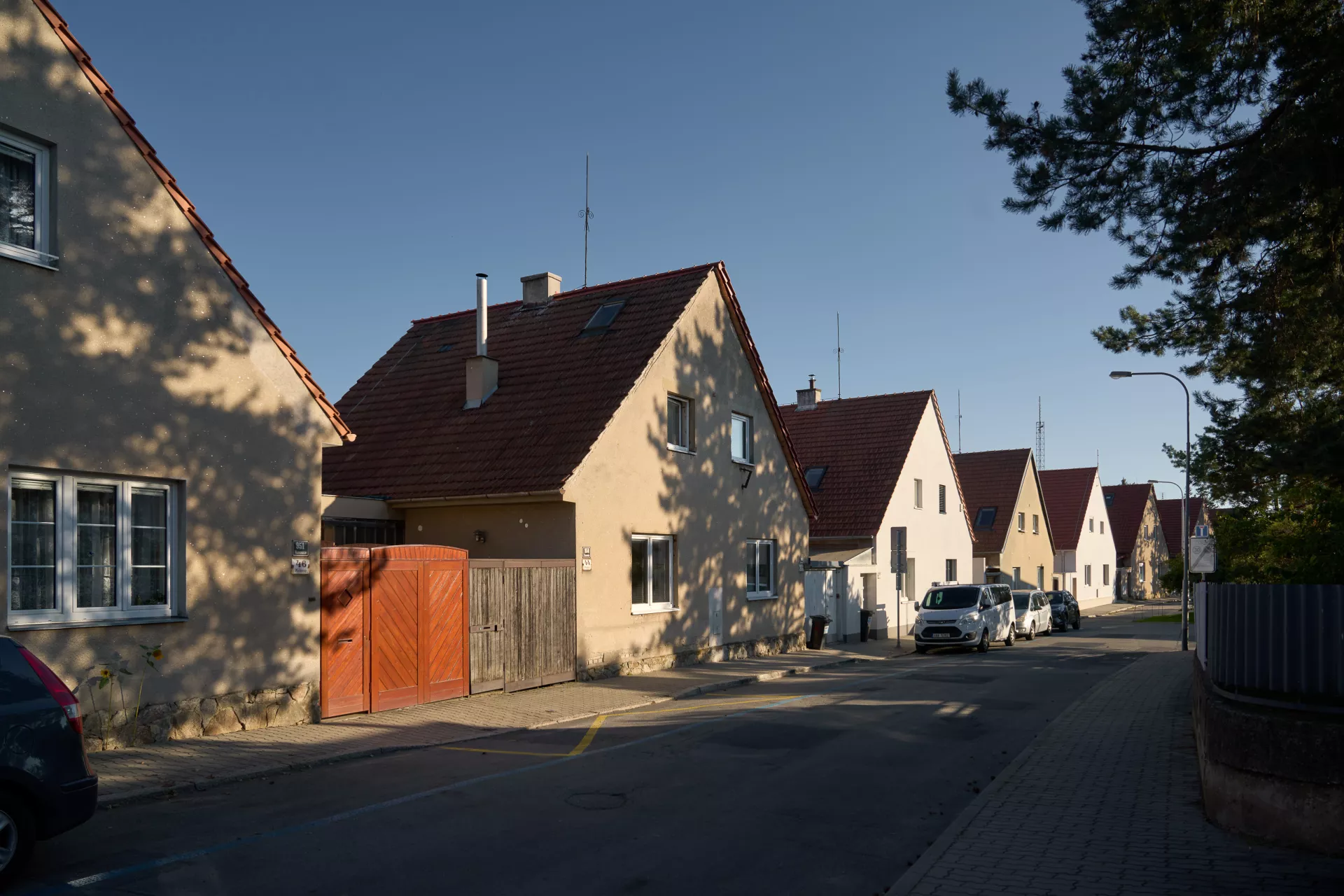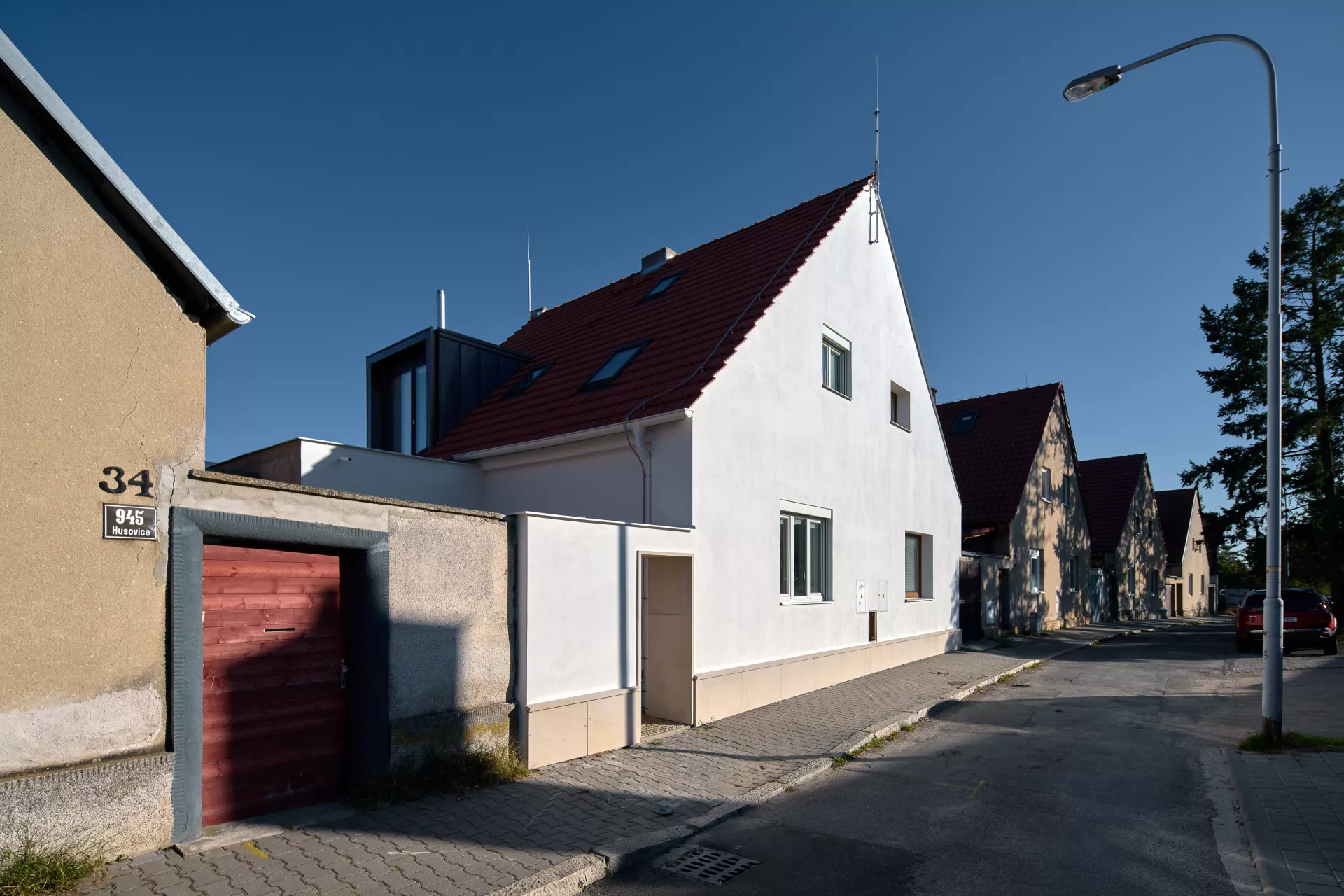 Im Jahre 1923 entwarf Bohuslav Fuchs für die Baugenossenschaft „Rodina“ („Familie“) eine Reihe von elf Doppelhäusern in der Míčkova-Straße. Die Häuser sind Bestandteil einer Arbeiterkolonie, die auf dem Gipfel eines bewaldeten Hügels am Rand des Villengebietes des Stadtteils Štefánikova čtvrť (Štefánik-Viertel) entstand. Die Doppelhäuser erinnern mit ihrer Form an typische mährische Häuser auf dem Land, ihr Grundriss ist jedoch bereits den Bedürfnissen von Stadtbewohnern angepasst. Die Gebäude sind in zwei identische spiegelverkehrte Wohneinheiten aufgeteilt. Hinter dem Eingangs-Windfang mit anliegender Toilette befanden sich im Erdgeschoss eine Küche (die auch als Badezimmer benutzt wurde) und ein großes Wohnzimmer. Vom Eingangsbereich führte eine Treppe in das bewohnbare Dachgeschoss, wo zwei Schlafzimmer mit Abstellräumen lagen. Durch die Unterbringung zweier Wohneinheiten unter einem gemeinsamen Dach gelang es Bohuslav Fuchs sowohl die Bau- als auch die Betriebskosten zu senken. Angesichts der wachsenden Anforderungen an einen Wohnraum wurden die zwei Wohneinheiten in späteren Jahren miteinander verbunden, im Äußeren blieb jedoch der ursprüngliche Charakter der Häuser erhalten. LV