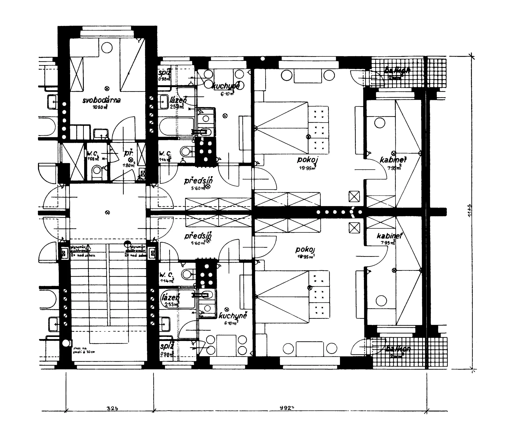 Der Bau der Häuser für Arme in der Náplavka-Straße war ebenso wie ähnliche Projekte dieser Zeit auf Brünner Gebiet durch ein Gesetz über Bautätigkeiten aus dem Jahre 1936 motiviert. Dieses ermöglichte den Städten, eine staatliche Förderung für die Errichtung von Mietshäusern für sozial Schwache zu erhalten. Die Häuser wurden nach einem Entwurf von Josef Polášek erbaut, der zur gleichen Zeit den Anbau der Mädchenschule auf der benachbarten Parzelle in der Křídlovická-Straße realisierte. Die Stirnseite des Gebäudes ist rhythmisch durch die vertikalen Glasbänder der Treppenhausfenster und durch Loggien gegliedert; an der rückseitigen Fassade befinden sich zusätzlich Risalite, die die Räume von Garçonnieren erkennbar machen. Die innere Gliederung des Hauses entspricht der bereits bewährten Konzeption von Gebäuden für Arme mit vier Kleinwohnungen und einer Einzimmerwohnung in jedem Stock der einzelnen Hauseinheiten. Wie es bei Polášeks Sozialbauten üblich ist, ist hier der Großteil der Wohnungen auf etwas unvorteilhafte Weise mit allen Räumen einer Himmelsrichtung zugewandt. Die Wohneinheiten sind jedoch bereits geräumiger und bestehen aus einem Vorzimmer, einer eigenen Küche, zwei Zimmern und einem Badezimmer mit Wanne und Toilette. Im Zuge einer vor kurzem vorgenommenen Renovierung erhielt das Haus neue Plastikfenster, die Fassaden eine neue Wärmedämmung und eine Farbe, die einzelne architektonische Elemente etwas anders akzentuiert, als es ursprünglich vorgesehen war. Die konstruktivistische Ästhetik der feinen Fensterrahmen und der einheitlich hellen Fassade wurde hier durch Holzimitationen und mehrere orange Farbtöne des Verputzes ersetzt. LV