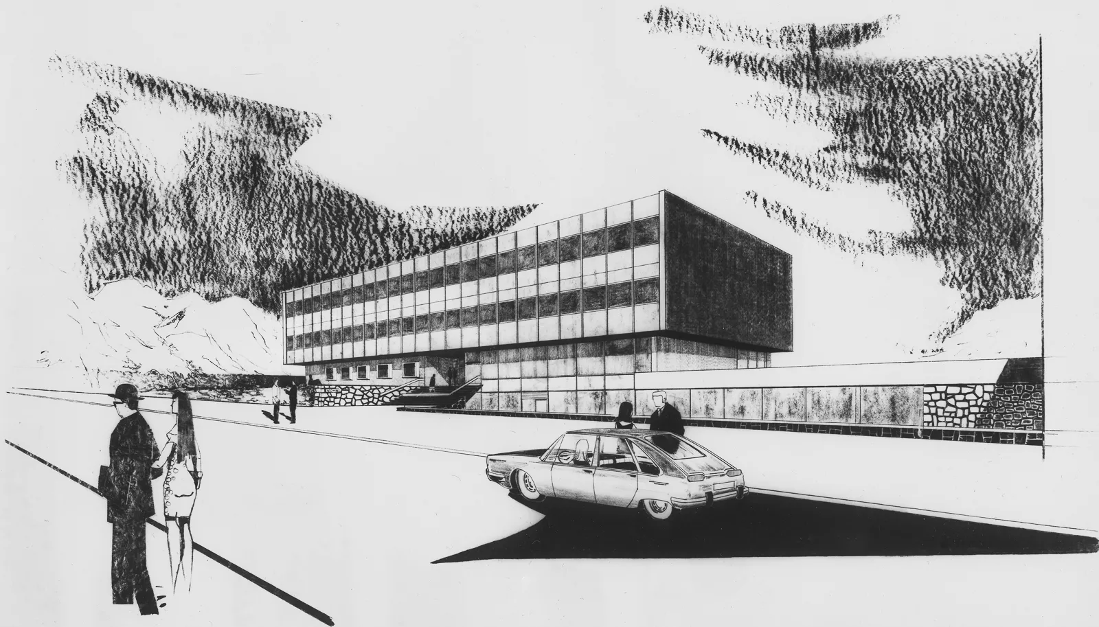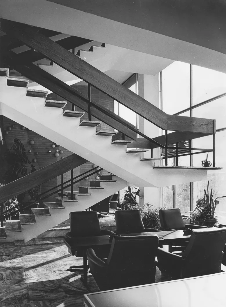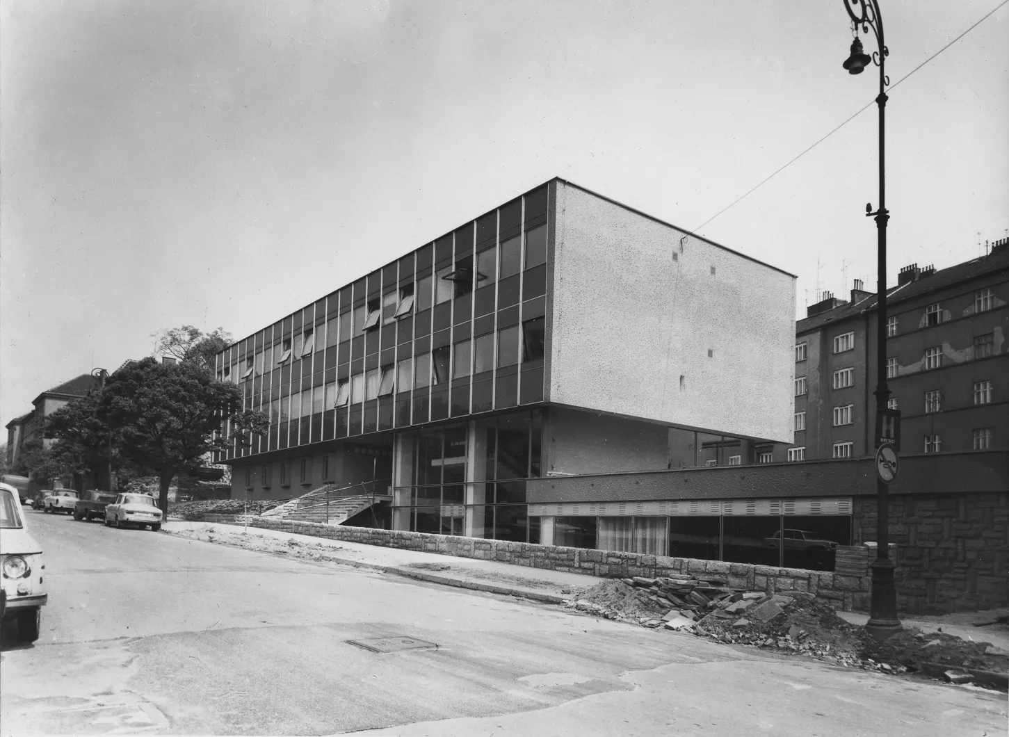 Das Gebäude des Forschungsinstituts für mathematische Rechenmaschinen, entworfen vom Architekten Zdeněk Řihák im Atelier 01 des Staatlichen Handelsprojektinstituts Brünn, ist zwischen der Černopolní und Durďák-Straße situiert. Das niedrige dreigeschossige Bürohaus knüpft mit seinem Volumen an die umgebende Bebauung an und durch seine Konzeptionsanordnung kopiert es anscheinend den horizontalen Block der Eingangspartie des Kinderkrankenhauses von Bedřich Rozehnal, erbaut 1948-1954. Das erhöhte Erdgeschoß und das offene Souterrain des Instituts werden von einer geräumigen Eingangshalle mit einer durchglasten Wand zur Straße hin und einem zwischen zwei Tragepfeiler gesetztem Treppenhaus gebildet. Im Inneren dominiert eine plastisch geformte Betonwand, die von der Künstlerin Eva Kmentová, Mitglied der Gruppe Trasse, stammt. Monumentaler strukturierter Beton der Wand trägt in seinen Vertikalen weiße und goldene Kugeln, die mit ihrem zufälligen Rhythmus die Rechentechnik der Zeit symbolisieren sollen. Der Treppenraum knüpft auf zwei weitere geschlossene Bürogeschosse an, die ursprünglich an der Fassade von dem Eingangsteil mit atypischen Vorhangpaneelen mit durchlaufenden Fenstern und vertikalen Aluminiumbändern getrennt waren. Für ihre Zeit progressive Gebäudekonzeption hatte zur Aufgabe einen luftdurchströmten Eindruck des offenen Erdgeschosses mit eingehängtem Treppenhaus zu vermitteln, das Treppenhaus steigt gleichsam über das Wasserreservoir des Souterrains durch die durchglaste Wand nach draußen in den Vorgarten empor. Der farbige Kesselraum des Instituts, die der Architekt dem Betrachter beim Durchgang des Interieurs enthüllte, kontrastierte noch mehr in seinem rohen Zustand mit den edlen Metallmaterialien, mit glattpoliertem Beton und Glas. Mit dieser Konzeption knüpfte Řihák wohl an Vorbilder aus der Zeit zwischen den beiden Weltkriegen, bereicherte sie jedoch um moderne architektonische Elemente, wie es die erste Nutzung der Technologie der gehobenen Decke bei diesem Bau beweist. Nach 1989 diente ein Teil des Erdgeschosses als Verkaufsstelle für Heizkörper. Das Gebäude wurde nach 2000 umfangreich renoviert, dabei wurden von der Fassade die Vorhangpaneele entfernt und die Fenster und Türen ausgetauscht. Die ursprüngliche Konzeption der architektonischen Lösung verschwand unter dem Auftrag von braunen Blocks des neuen Putzes, es verschwanden auch die offenen technischen Einrichtungen. Wie ein Wunder bewahrte das Interieur zum großen Teil seine Authentizität, nicht nur in Gestalt des skulpturalen Werkes, des dominanten räumlichen Treppenhauses, sowie des draußen befindlichen Wasserreservoirs, aber auch in der neuen Nutzung des Eingangsbereiches als Café. Der Betreiber richtete das Café geschmackvoll im Retro-Stil ein, so dass der Besucher die Gelegenheit beim Kaffeetrinken hat, einige erhaltene Teile der Inneneinrichtung und die Kunst von Eva Kmentová zu bewundern.