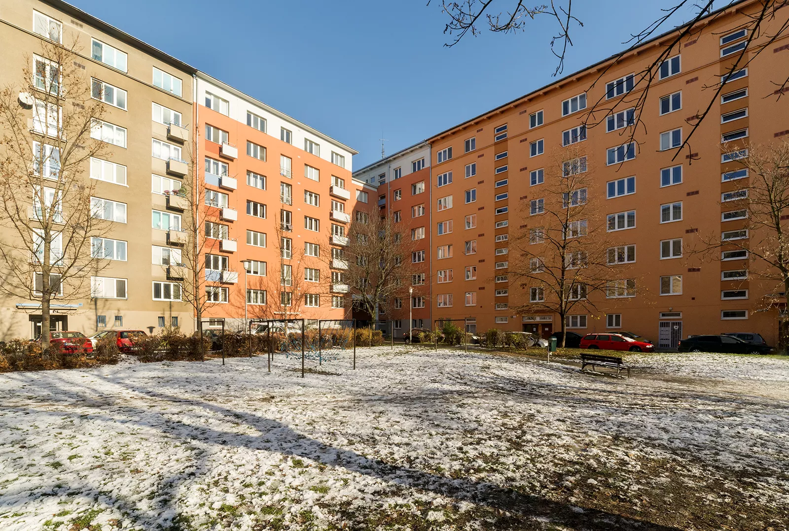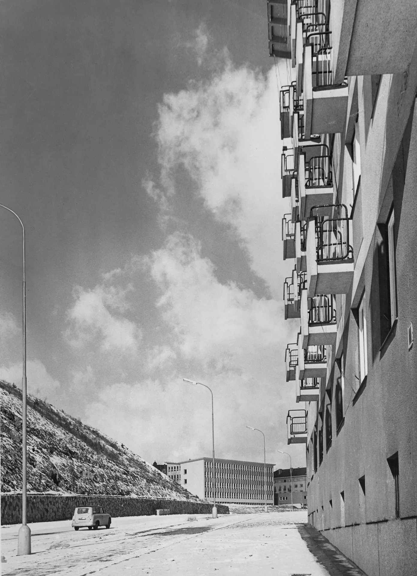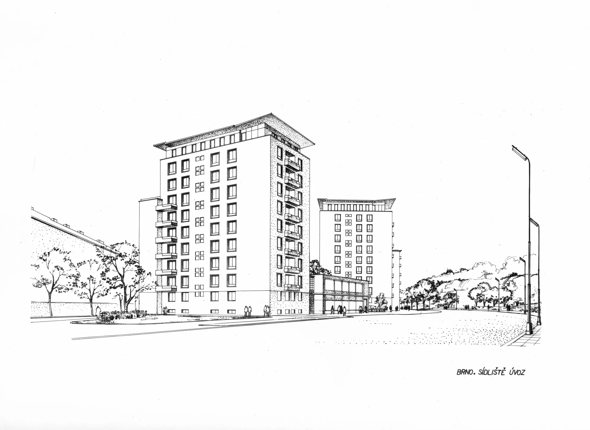 Die Siedlung Úvoz, erbaut zwischen 1958-1962, besteht aus vier städtischen Blocks mit Wohnhäusern TO3B und T15 entlang der Straßen Úvoz und Grohova/Groh-Straße. Die Wohnbebauung ist mit kommunaler und sozialer Infrastruktur wie Kindergarten, Grundschule, Geschäfte und Dienstleistungen ausgestattet. Laut Projekt sollte die Siedlung Úvoz auch innerhalb des “Blocks B“ zwischen Úvoz, Groh-, Čápek- und Jan-Uher-Straße eingeschossige Garagen an der Nordseite der Siedlung beinhalten. Die Bautätigkeit begann de facto in der ersten Hälfte des Jahres 1958 mit dem Durchbruch des gewachsenen Felsens am Fuß von Kuhberg/Kraví Hora und der Verlängerung der Straße Úvoz in Richtung Konečný –Platz. Mit dem Durchbruch von Úvoz rechnete man schon lange und in der Konzeption des Bebauungsplans der Stadt Brünn bezog es auch das Kollektiv unter der Führung von František Kočí ein. Der Bebauungsplan, der auch unter anderem die Dislozierung der neu geplanten Siedlungen regelte, entstand 1956-1957 im Bezirksprojektinstitut/Krajský projektový ústav in Brünn und wird mit der neuen Entwicklung von Brünn als Messestadt zu Ende der fünfziger Jahre des 20. Jahrhunderts in Verbindung gebracht. Das sog. Einleitungsprojekt der Siedlung wurde von den Architekten Arnošt Krejza und Vítězslav Unzeitig ausgearbeitet. Laut erhaltener Korrespondenz kann man jedoch annehmen, dass an dem Entwurf auch Vilém Kuba beteiligt war, der noch in der Jahresmitte 1958 im Rahmen der verlängerten Kündigungsfrist an der „bürgerlichen Infrastruktur der Siedlung Úvoz“ gearbeitet hatte, bevor er auf Grund der klassen-politischen Überprüfungen und der negativen Kaderbeurteilung aus dem Stavoprojek [staatliche Organisation, die alle Projektanten vereinte, Anm. d. Ü.] definitiv entlassen wurde. Noch 1958 wurde das Projekt nochmals von Miloslav Kramoliš mit Co-Autoren Miroslav Brabec und Zdena Kopecká überarbeitet. Kramoliš sollte sich um eine „freie Lösung mit Hochhäusern, die dem Endglied der Bebauung in der Nachbarschaft des Parkgrüns am Kuhberg/Kraví hora entsprochen hätte“ bemühen. Von dieser Konzeption wurden jedoch nur zwei Probe-Hochhäuser im oberen Teil der geplanten Bebauung zwischen den Straßen Údolní und Čápkova realisiert. Der Grund für die umfangreiche Nicht-Realisierung der aufgelockerten freien Hochhausbebauung ist wohl in der Bemühung um eine maximale Zahl der Wohnungen und gleichzeitig in der unvollkommenen Bautechnologie zu suchen, die sich erst in der Entwicklungsphase befand. Beim Bauen kamen sog Ziegelquader, also präfabrizierte Blocks zur Anwendung, die man vorher mauerte und an der Baustelle mittels Krane aufsetzte. Es handelte sich um eine frühe Bemühungen der Massenpräfabrikation, die zu einer Bedingung des staatlich gelenkten industriellen Bauwesens wurde. Die Ziegeltechnologie wurde in den sechziger Jahren durch den Beton ersetzt. Das Gebäude der Grundschule wurde zwischen 1961-1962 nach dem Entwurf von Jaroslav Ledvina von 1960 errichtet, ihre Disposition ist eine Parallele zu der Grundschule am Bakala-Quai/Bakalovo nábřeží, die vom selben Architekten stammt. Der Reliefschmuck der Fassade „Der Hahn“ von 1962, ist zurzeit durch die Wärmdämmung nach der Renovierung des Gebäudes 2014 zugedeckt, stammt von Milan Zezula und Miloš Slezák. Der Gesamteindruck der Siedlung oszilliert zwischen dem sozialistischem Realismus der ersten Hälfte der fünfziger Jahre und dem beginnenden Brüsseler Stil, der durch die Teilnahme der Tschechoslowakei auf der Weltausstellung EXPO 1958 definiert ist. Während die Wohnhäuser im „Block D“ am Fuße des Kuhberges/Kraví hora ergänzt durch dir Bronzegruppe „ Die Spartakiade“ von Konrád Babraj von 1962 immer noch den Geist des sozialistischen Realismus in sich tragen, melden die zehnstöckigen Hochhäuser und die siebengeschossigen Wohnhäuser der „Blocks B und C“ auf der Ostseite der Straße Úvoz mit ihren Flachdächern und dem vorgezogenem Dach die Rückkehr zur Brünner modernen Architektur. JK