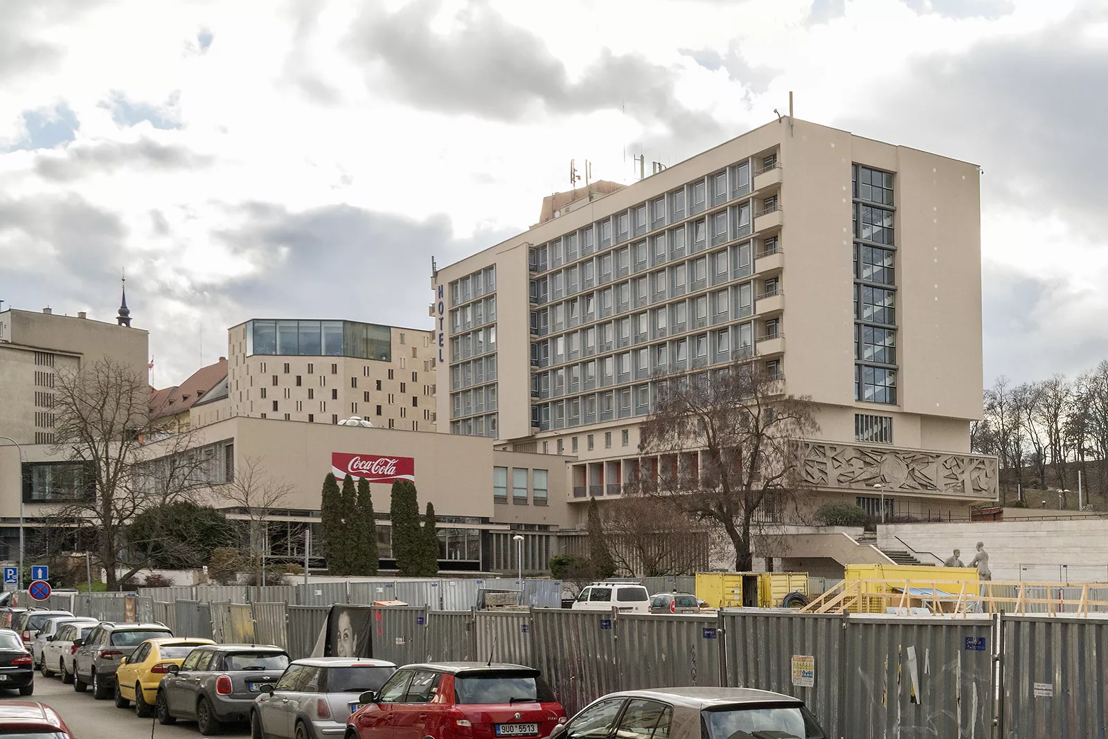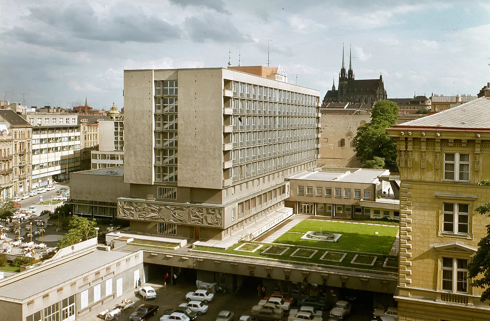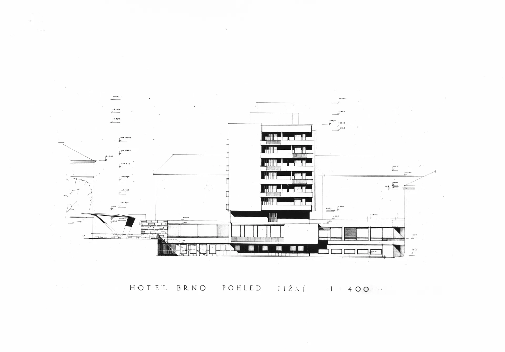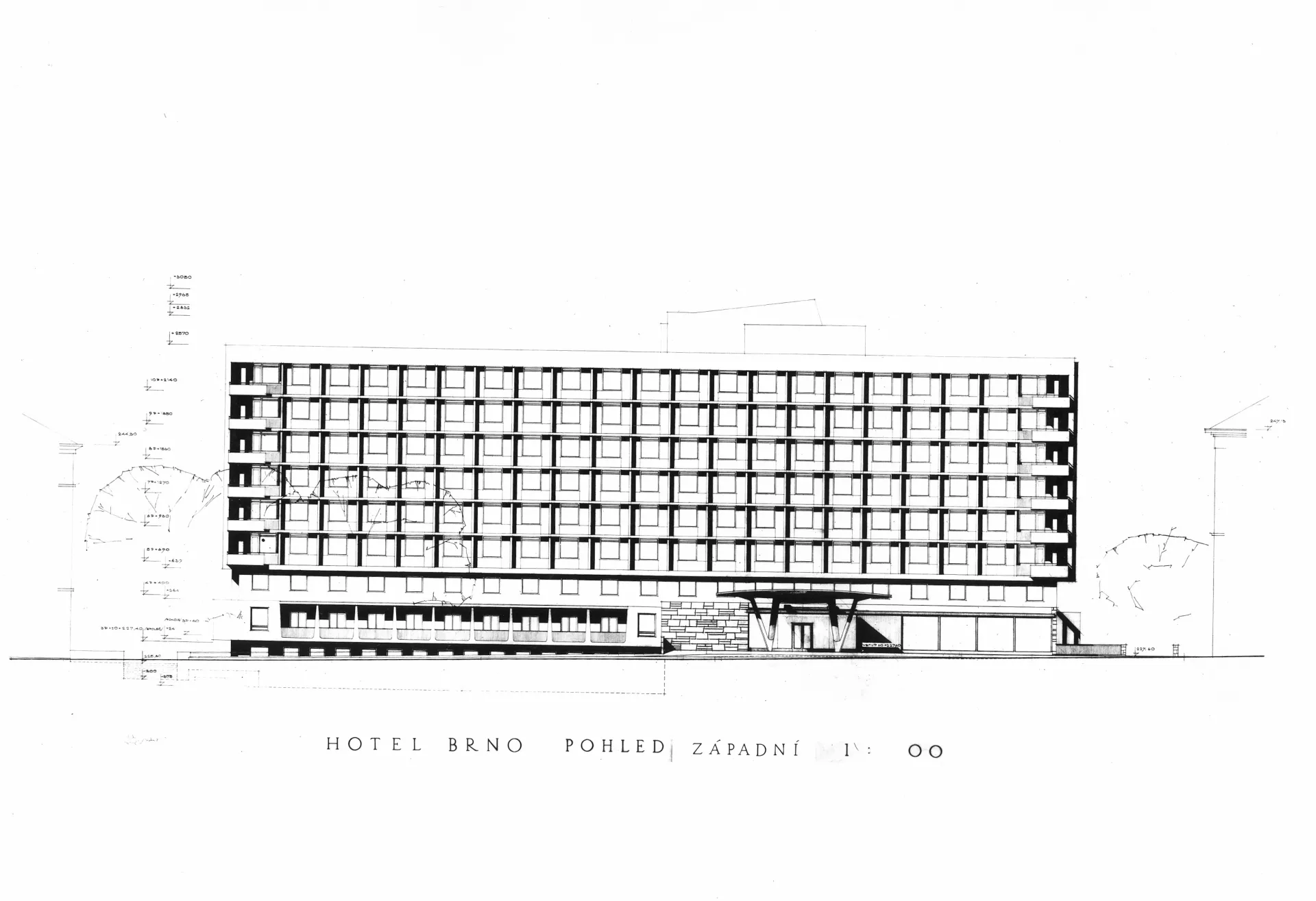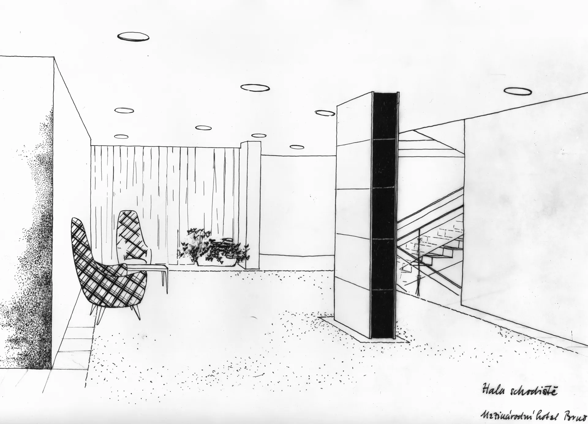Im Zusammenhang mit dem Aufschwung, den das Brünner Messeleben im internationalen Umfang erlebte, entstand in Brünn das bereits erwähnte Problem fehlender Kapazitäten für die Unterbringung von Besuchern, dessen Lösung Ende der fünfziger Jahre nicht mehr aufgeschoben werden konnte. Die erste und zugleich auch ausdrucksvollste Tat in dieser Hinsicht war die Realisierung des Hotels International im Jahr 1962, das sich durch ähnliche Ausdrucksmittel wie das Verwaltungsgebäude des Brünner Messegeländes auszeichnete. Der Bau wurde an einer exponierten Stelle an der Grenze des historischen Stadtkerns errichtet. Sein Konzept basierte auf der Absicht, eine neue Dominante zu schaffen, die jedoch gleichzeitig mit der gewachsenen Bebauung in der Nachbarschaft korrespondierte. Für den Bau des neuen Hotels wählte man eine annähernd zwei Hektar große Parzelle zwischen den Straßen Husova und Veselá, die von zwei Seiten her durch bedeutende Neorenaissancedenkmäler umgrenzt wird – dem Palais Pražák und dem Kunstgewerbemuseum. Ursprünglich befanden sich am betreffenden Standort das Objekt einer Kaserne und Stadtmauern, die in der zweiten Hälfte des neunzehnten Jahrhunderts entfernt wurden. Nach der vernichtenden Bombardierung von 1944 entstand die größte Baulücke des Krieges, an deren Stelle anschließend eine Vergrößerung des Neuen Rathauses oder ggf. ein neues Gebäude der städtischen Selbstverwaltung geplant war. Das Objekt des Hotels nimmt einen ausgedehnten Raum im Stadtzentrum ein: außer den Hotelzimmern umfasst es noch mehrere Restaurants und Bars, einen Außenparkplatz und ein unterirdisches Parkhaus, Erholungsterrassen, ein System von Außentreppen, das die Straßen Husova und Veselá sowie einen kleinen Park miteinander verbinden. Der ursprüngliche Entwurf von Arnošt Krejza und Miloslav Kramoliš enthielt auch das nicht realisierte Gebäude eines internationalen Studenteninternats in dem Bereich, der sich unterhalb des Palais Pražák vor dem hinteren Trakt des Hotels Slavia erstreckte, das mit dem Hotel International durch einen die Straße Skrytá überbrückenden Steg verbunden werden sollte. Die attraktive Lage des großzügig dimensionierten Hotelobjektes unterhalb des Spielbergs und in dichter Anbindung an das Stadtzentrum rief Fragen hervor, die den Bezug zur benachbarten historischen Bebauung betrafen: um den ursprünglichen Dominanten beider Neorenaissancepalais Raum zu lassen, wurde die horizontal konzipierte Hauptbaumasse des Hotels vom Gelände abgesetzt, wodurch eine als Parkplatz dienende Freifläche entstand. Der elfstöckige Teil des Hauptgebäudes wurde auf eine massive Stahlbetonplatte gegründet, über der ein Skelett aus demselben Material aufgerichtet wurde. Der Haupteingang von der Husova-Straße aus wird akzentuiert durch eine markante Markise, die auf zu jener Zeit beliebten V-förmigen Pfeilern ruht. Sie überdacht den deutlich vorgezogenen Hoteleingang und mündet im dritten Geschoss, in dem sich die Empfangshalle, eine Bar, ein Gesellschaftssaal, Salons und einige VIP-Zimmer einschließlich eines Regierungsappartements befindet, die von außen als Loggienband mit sich verjüngenden Pfeilern erkennbar sind. Nicht nur dieses organisch geformte Element, sondern auch die Behandlung der Fassaden wurden von der zeitgenössischen Kritik (im Unterschied zur heutigen Beurteilung) jedoch mit einem gewissen Unbehagen reflektiert, wie der Text in der Zeitschrift Architektura ČSSR (Die Architektur der Tschechoslowakei) belegt: „Beim Anblick der Fassade kann man das Gefühl nicht loswerden, als sei sie Ergebnis einer Arbeit von mehreren Architekten gewesen, nicht im Sinne einer Kollektivarbeit mit geschlossener Meinung, sondern als ob einige Abschnitte eigenständig mit individueller Meinung bearbeitet worden wären, die dann zu einem Ganzen gruppiert wurden. [...] Das Loggienband mit überflüssigen Reminiszenzen an den Präsidentenpalast in Brasilien ist bestimmt anders geartet als das Fassadenraster, das wiederum anderer Herkunft ist als seine benachbarten verputzten Balkonbänder oder die Südfassade mit dem ornamental-dekorativen Wechsel zwischen Geländern und Stützpfeilern. All diese Tatsachen nehmen dem Gebäude die Monumentalität und vor allem die Reinheit des architektonischen Ausdrucks. Dazu verhilft auch die große Anzahl und Kombination der verwendeten Materialien.“ Im Fassadenraster kommt die innere Anordnungen der Zellen mit den in den sieben oberirdischen Etagen untergebrachten Gästezimmern durch. Die einzelnen, durch das Netz vertikaler und horizontaler Linien der Konstruktion mit Stahlfensterrahmen und Aluminiumleisten der Fensterverglasung definierten Fassadenfelder sind mit Platten aus gefärbtem Glas und einem Aluminiumskelett gefüllt und erwecken dadurch den Eindruck, dass die Wände nur aus leichten Glasplatten bestünden. Hinter ihnen verbirgt sich jedoch noch ein Mauerwerk aus Formsteinen. Die Empfangshalle ist durch einen Gang und eine Treppe in die unteren Stockwerke mit dem zweiten, der Straße Veselá zugewandten Eingang des Objektes verbunden, an dessen Seiten eine Nachtbar und ein Restaurant mit Sommerterrasse untergebracht sind, deren Ausmaße – ebenso wie die Gesellschaftsräume über ihnen – aus der Hauptbaumasse des Gebäudes ausscheren und einen selbständigen flacheren Flügel bilden. In den unteren Etagen befinden sich die Betriebsräume, auf dem Niveau der Straßen Skrytá und Besední dann die Einfahrt für Lieferanten und zur Tiefgarage. Parallel zum Bau des Hotels wurden auch die von bedeutenden Künstlern geschaffenen Kunstwerke realisiert, die anhand eines im Jahr 1960 ausgeschriebenen Wettbewerbs ausgewählt wurden. Viele von ihnen, wie beispielsweise Stanislav Libenský, Jaroslava Brychtová oder Miloslav Klinger, waren direkt an den Vorbereitungen zur Weltausstellung EXPO 58beteiligt. Die künstlerische Gestaltung der Innenräume betraf insbesondere die Schmückung und Ausstattung der Gese