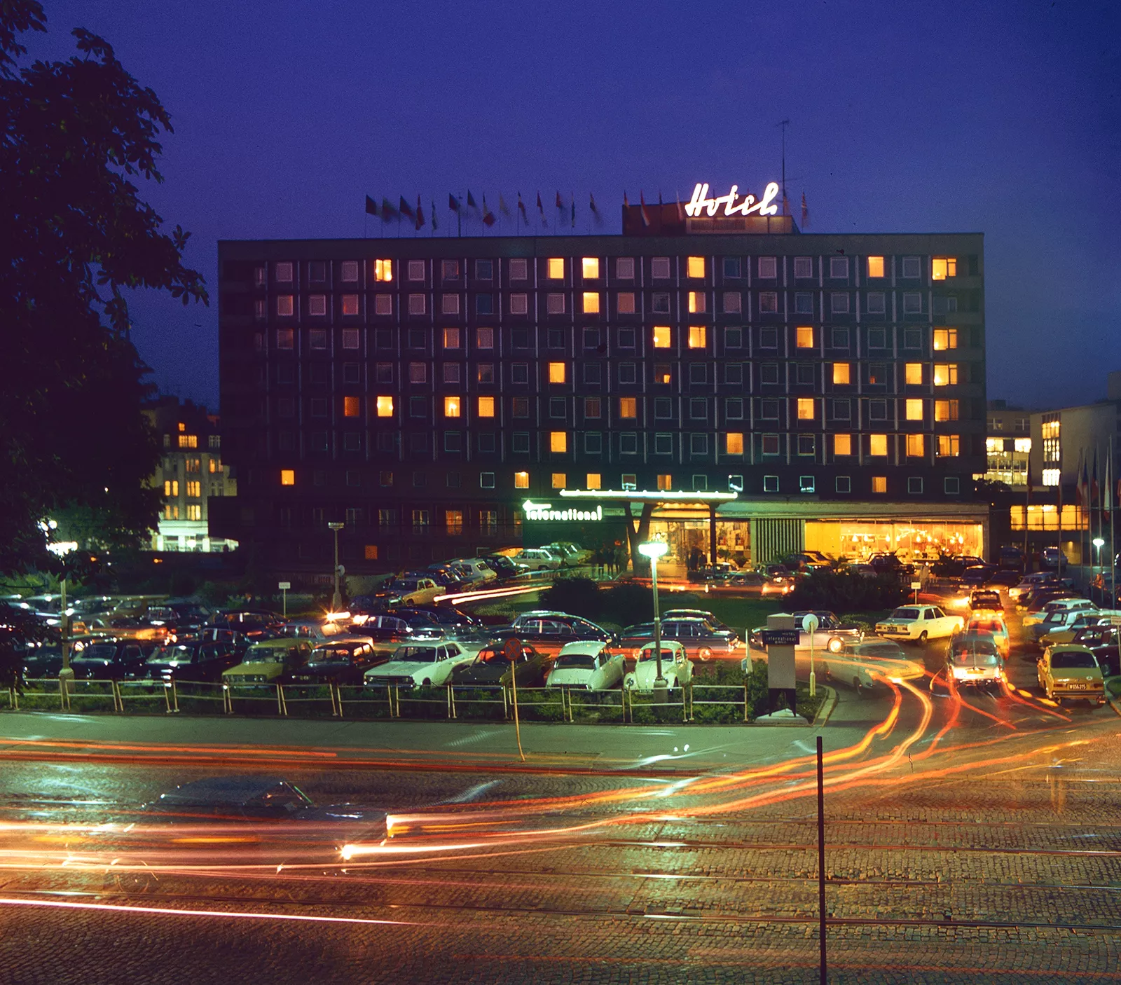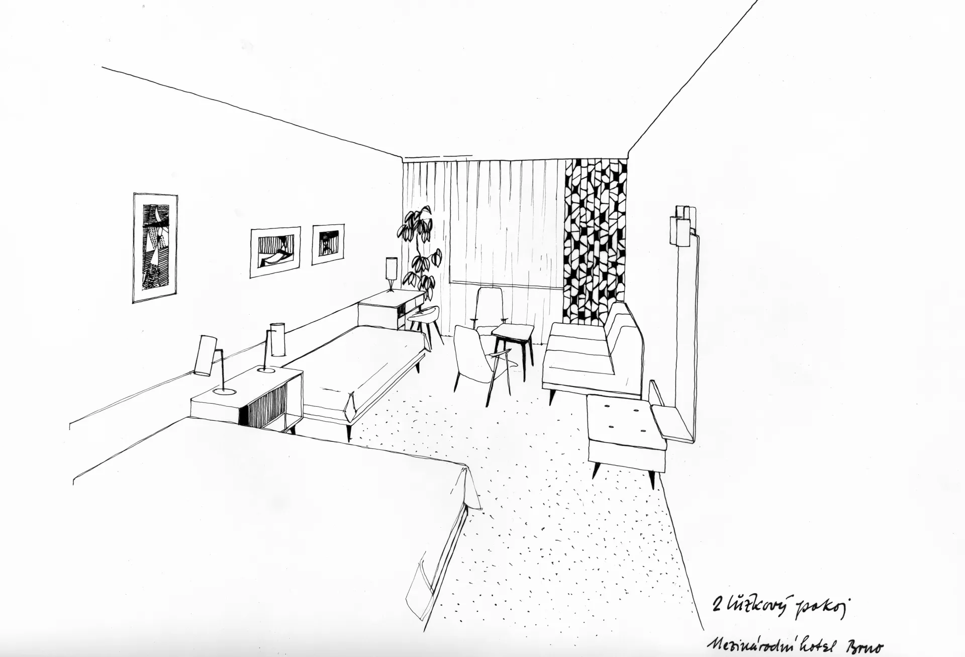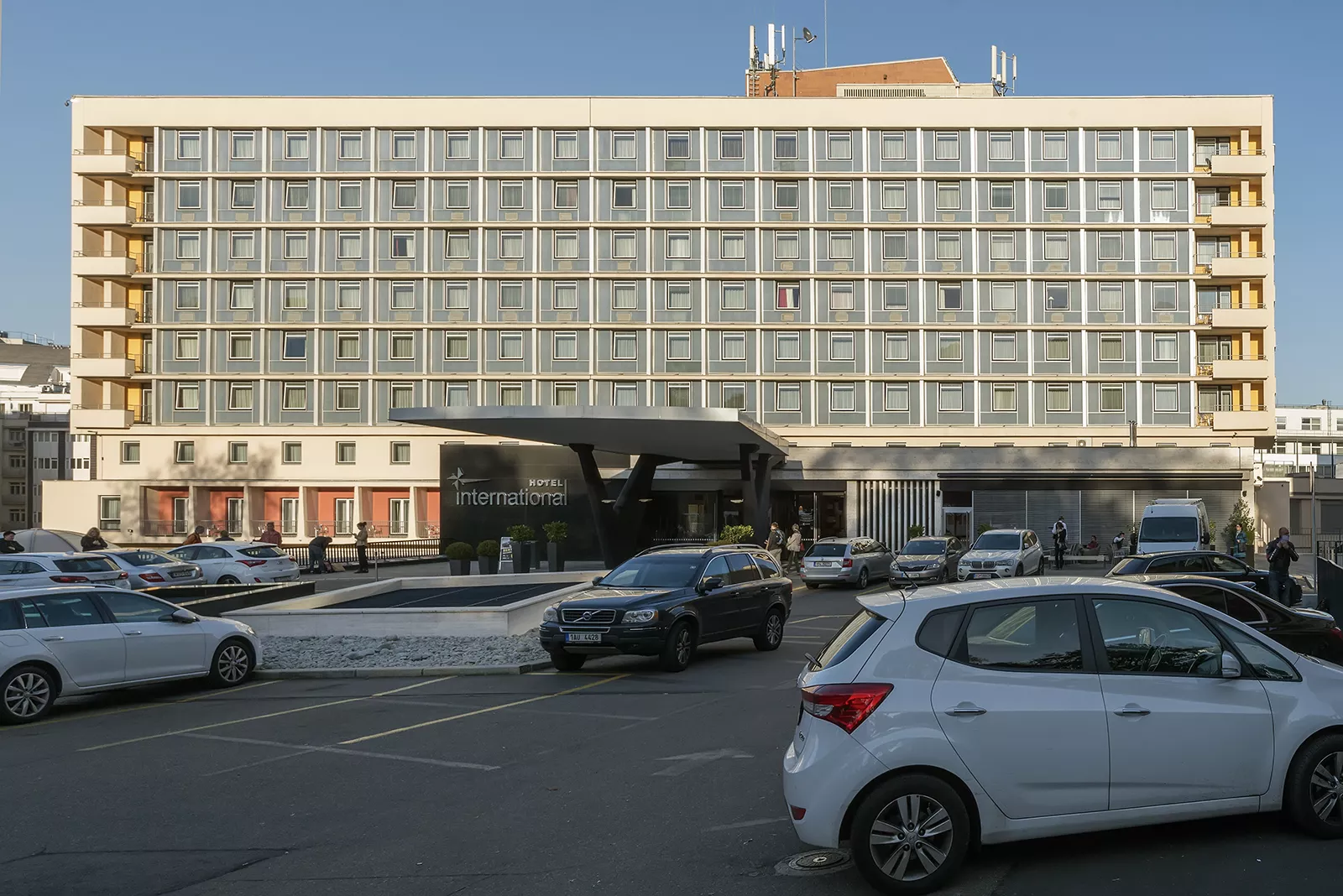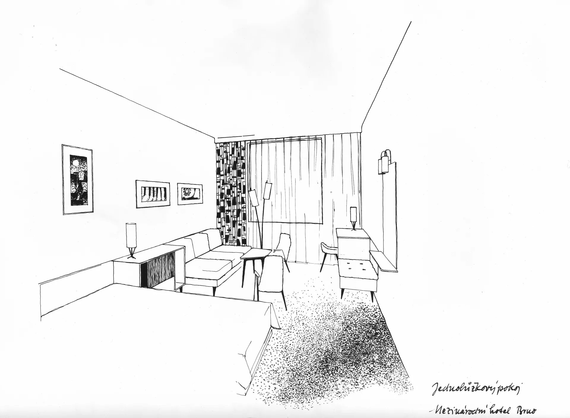 Im Zusammenhang mit dem Aufschwung, den das Brünner Messeleben im internationalen Umfang erlebte, entstand in Brünn das bereits erwähnte Problem fehlender Kapazitäten für die Unterbringung von Besuchern, dessen Lösung Ende der fünfziger Jahre nicht mehr aufgeschoben werden konnte. Die erste und zugleich auch ausdrucksvollste Tat in dieser Hinsicht war die Realisierung des Hotels International im Jahr 1962, das sich durch ähnliche Ausdrucksmittel wie das Verwaltungsgebäude des Brünner Messegeländes auszeichnete. Der Bau wurde an einer exponierten Stelle an der Grenze des historischen Stadtkerns errichtet. Sein Konzept basierte auf der Absicht, eine neue Dominante zu schaffen, die jedoch gleichzeitig mit der gewachsenen Bebauung in der Nachbarschaft korrespondierte. Für den Bau des neuen Hotels wählte man eine annähernd zwei Hektar große Parzelle zwischen den Straßen Husova und Veselá, die von zwei Seiten her durch bedeutende Neorenaissancedenkmäler umgrenzt wird – dem Palais Pražák und dem Kunstgewerbemuseum. Ursprünglich befanden sich am betreffenden Standort das Objekt einer Kaserne und Stadtmauern, die in der zweiten Hälfte des neunzehnten Jahrhunderts entfernt wurden. Nach der vernichtenden Bombardierung von 1944 entstand die größte Baulücke des Krieges, an deren Stelle anschließend eine Vergrößerung des Neuen Rathauses oder ggf. ein neues Gebäude der städtischen Selbstverwaltung geplant war. Das Objekt des Hotels nimmt einen ausgedehnten Raum im Stadtzentrum ein: außer den Hotelzimmern umfasst es noch mehrere Restaurants und Bars, einen Außenparkplatz und ein unterirdisches Parkhaus, Erholungsterrassen, ein System von Außentreppen, das die Straßen Husova und Veselá sowie einen kleinen Park miteinander verbinden. Der ursprüngliche Entwurf von Arnošt Krejza und Miloslav Kramoliš enthielt auch das nicht realisierte Gebäude eines internationalen Studenteninternats in dem Bereich, der sich unterhalb des Palais Pražák vor dem hinteren Trakt des Hotels Slavia erstreckte, das mit dem Hotel International durch einen die Straße Skrytá überbrückenden Steg verbunden werden sollte. Die attraktive Lage des großzügig dimensionierten Hotelobjektes unterhalb des Spielbergs und in dichter Anbindung an das Stadtzentrum rief Fragen hervor, die den Bezug zur benachbarten historischen Bebauung betrafen: um den ursprünglichen Dominanten beider Neorenaissancepalais Raum zu lassen, wurde die horizontal konzipierte Hauptbaumasse des Hotels vom Gelände abgesetzt, wodurch eine als Parkplatz dienende Freifläche entstand. Der elfstöckige Teil des Hauptgebäudes wurde auf eine massive Stahlbetonplatte gegründet, über der ein Skelett aus demselben Material aufgerichtet wurde. Der Haupteingang von der Husova-Straße aus wird akzentuiert durch eine markante Markise, die auf zu jener Zeit beliebten V-förmigen Pfeilern ruht. Sie überdacht den deutlich vorgezogenen Hoteleingang und mündet im dritten Geschoss, in dem sich die Empfangshalle, eine Bar, ein Gesellschaftssaal, Salons und einige VIP-Zimmer einschließlich eines Regierungsappartements befindet, die von außen als Loggienband mit sich verjüngenden Pfeilern erkennbar sind. Nicht nur dieses organisch geformte Element, sondern auch die Behandlung der Fassaden wurden von der zeitgenössischen Kritik (im Unterschied zur heutigen Beurteilung) jedoch mit einem gewissen Unbehagen reflektiert, wie der Text in der Zeitschrift Architektura ČSSR (Die Architektur der Tschechoslowakei) belegt: „Beim Anblick der Fassade kann man das Gefühl nicht loswerden, als sei sie Ergebnis einer Arbeit von mehreren Architekten gewesen, nicht im Sinne einer Kollektivarbeit mit geschlossener Meinung, sondern als ob einige Abschnitte eigenständig mit individueller Meinung bearbeitet worden wären, die dann zu einem Ganzen gruppiert wurden. [...] Das Loggienband mit überflüssigen Reminiszenzen an den Präsidentenpalast in Brasilien ist bestimmt anders geartet als das Fassadenraster, das wiederum anderer Herkunft ist als seine benachbarten verputzten Balkonbänder oder die Südfassade mit dem ornamental-dekorativen Wechsel zwischen Geländern und Stützpfeilern. All diese Tatsachen nehmen dem Gebäude die Monumentalität und vor allem die Reinheit des architektonischen Ausdrucks. Dazu verhilft auch die große Anzahl und Kombination der verwendeten Materialien.“ Im Fassadenraster kommt die innere Anordnungen der Zellen mit den in den sieben oberirdischen Etagen untergebrachten Gästezimmern durch. Die einzelnen, durch das Netz vertikaler und horizontaler Linien der Konstruktion mit Stahlfensterrahmen und Aluminiumleisten der Fensterverglasung definierten Fassadenfelder sind mit Platten aus gefärbtem Glas und einem Aluminiumskelett gefüllt und erwecken dadurch den Eindruck, dass die Wände nur aus leichten Glasplatten bestünden. Hinter ihnen verbirgt sich jedoch noch ein Mauerwerk aus Formsteinen. Die Empfangshalle ist durch einen Gang und eine Treppe in die unteren Stockwerke mit dem zweiten, der Straße Veselá zugewandten Eingang des Objektes verbunden, an dessen Seiten eine Nachtbar und ein Restaurant mit Sommerterrasse untergebracht sind, deren Ausmaße – ebenso wie die Gesellschaftsräume über ihnen – aus der Hauptbaumasse des Gebäudes ausscheren und einen selbständigen flacheren Flügel bilden. In den unteren Etagen befinden sich die Betriebsräume, auf dem Niveau der Straßen Skrytá und Besední dann die Einfahrt für Lieferanten und zur Tiefgarage. Parallel zum Bau des Hotels wurden auch die von bedeutenden Künstlern geschaffenen Kunstwerke realisiert, die anhand eines im Jahr 1960 ausgeschriebenen Wettbewerbs ausgewählt wurden. Viele von ihnen, wie beispielsweise Stanislav Libenský, Jaroslava Brychtová oder Miloslav Klinger, waren direkt an den Vorbereitungen zur Weltausstellung EXPO 58beteiligt. Die künstlerische Gestaltung der Innenräume betraf insbesondere die Schmückung und Ausstattung der Gese