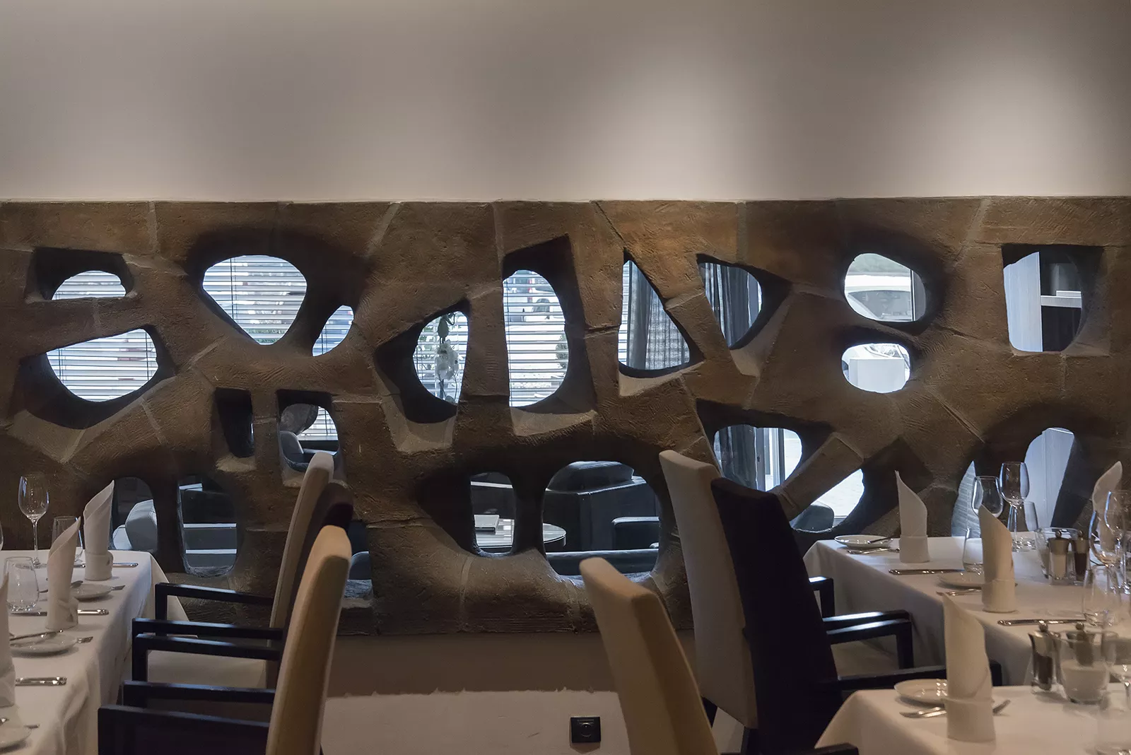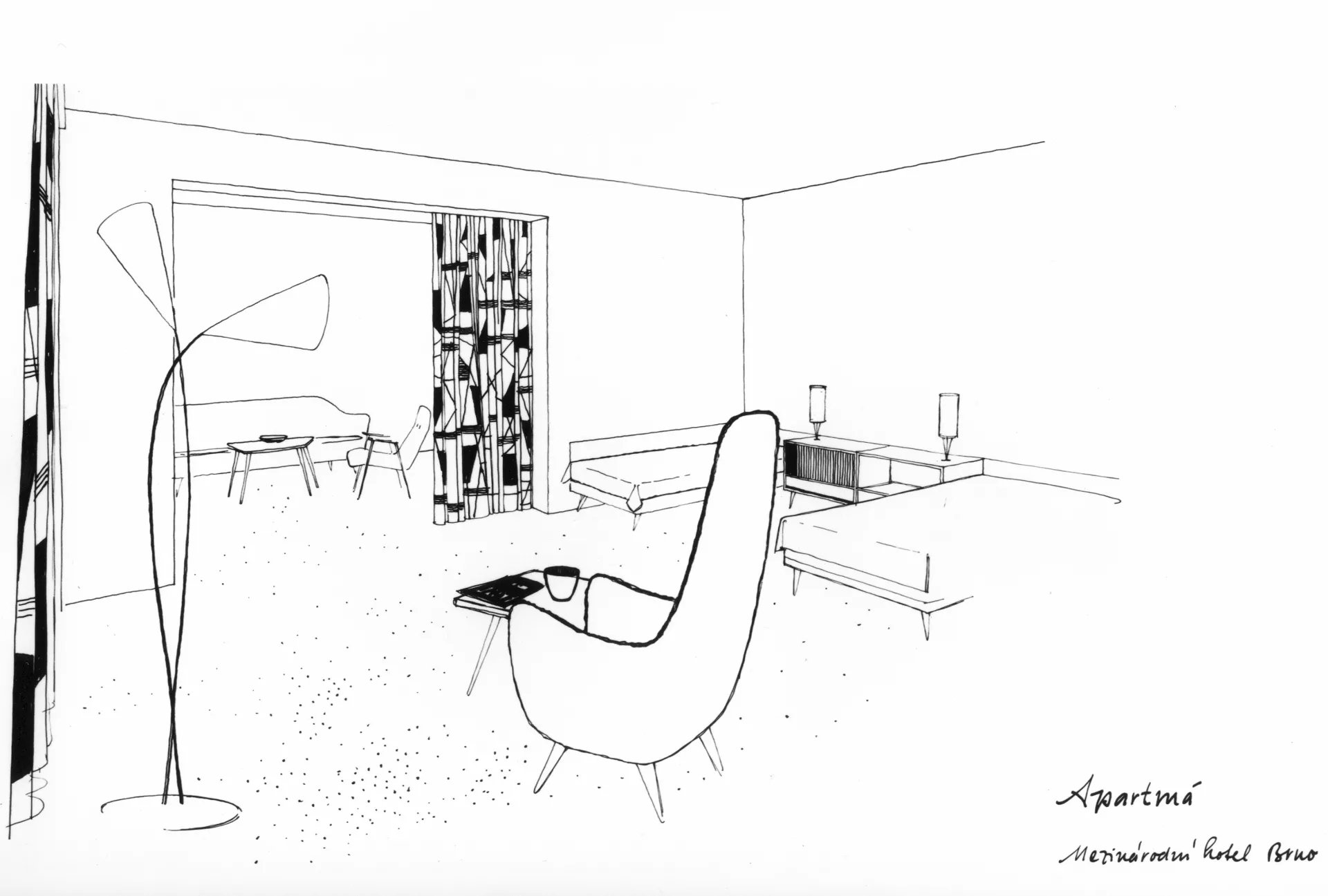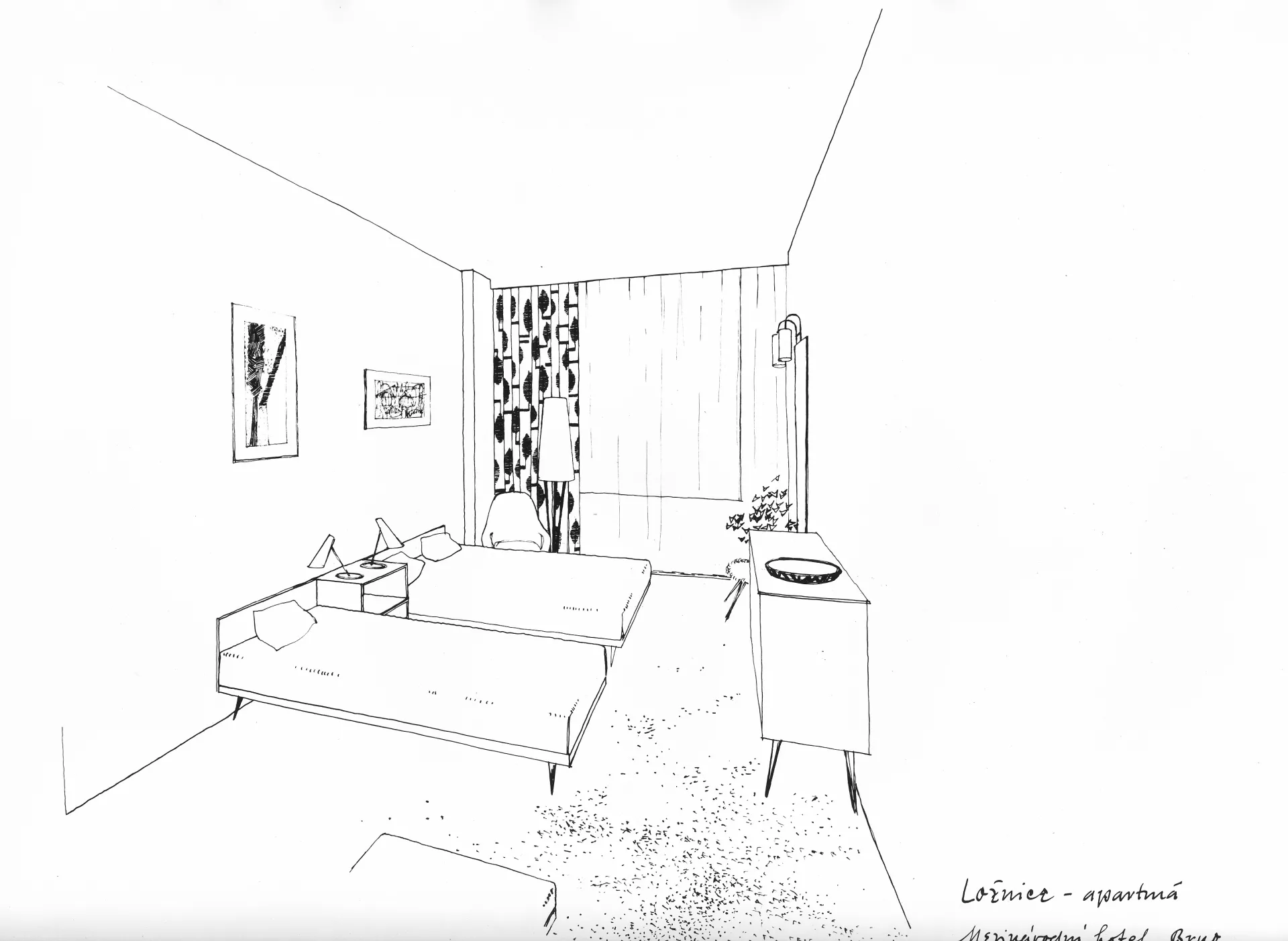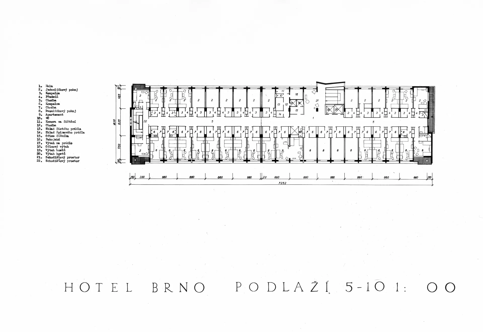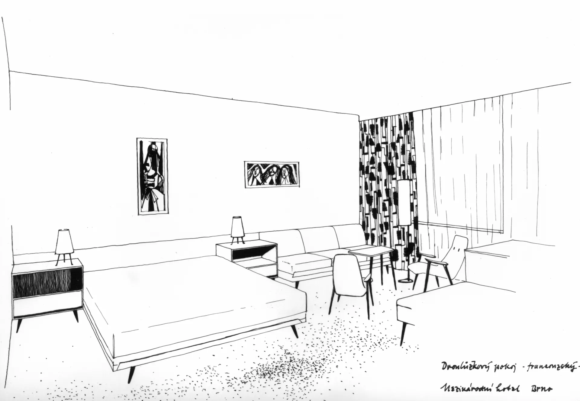 Im Zusammenhang mit dem Aufschwung, den das Brünner Messeleben im internationalen Umfang erlebte, entstand in Brünn das bereits erwähnte Problem fehlender Kapazitäten für die Unterbringung von Besuchern, dessen Lösung Ende der fünfziger Jahre nicht mehr aufgeschoben werden konnte. Die erste und zugleich auch ausdrucksvollste Tat in dieser Hinsicht war die Realisierung des Hotels International im Jahr 1962, das sich durch ähnliche Ausdrucksmittel wie das Verwaltungsgebäude des Brünner Messegeländes auszeichnete. Der Bau wurde an einer exponierten Stelle an der Grenze des historischen Stadtkerns errichtet. Sein Konzept basierte auf der Absicht, eine neue Dominante zu schaffen, die jedoch gleichzeitig mit der gewachsenen Bebauung in der Nachbarschaft korrespondierte. Für den Bau des neuen Hotels wählte man eine annähernd zwei Hektar große Parzelle zwischen den Straßen Husova und Veselá, die von zwei Seiten her durch bedeutende Neorenaissancedenkmäler umgrenzt wird – dem Palais Pražák und dem Kunstgewerbemuseum. Ursprünglich befanden sich am betreffenden Standort das Objekt einer Kaserne und Stadtmauern, die in der zweiten Hälfte des neunzehnten Jahrhunderts entfernt wurden. Nach der vernichtenden Bombardierung von 1944 entstand die größte Baulücke des Krieges, an deren Stelle anschließend eine Vergrößerung des Neuen Rathauses oder ggf. ein neues Gebäude der städtischen Selbstverwaltung geplant war. Das Objekt des Hotels nimmt einen ausgedehnten Raum im Stadtzentrum ein: außer den Hotelzimmern umfasst es noch mehrere Restaurants und Bars, einen Außenparkplatz und ein unterirdisches Parkhaus, Erholungsterrassen, ein System von Außentreppen, das die Straßen Husova und Veselá sowie einen kleinen Park miteinander verbinden. Der ursprüngliche Entwurf von Arnošt Krejza und Miloslav Kramoliš enthielt auch das nicht realisierte Gebäude eines internationalen Studenteninternats in dem Bereich, der sich unterhalb des Palais Pražák vor dem hinteren Trakt des Hotels Slavia erstreckte, das mit dem Hotel International durch einen die Straße Skrytá überbrückenden Steg verbunden werden sollte. Die attraktive Lage des großzügig dimensionierten Hotelobjektes unterhalb des Spielbergs und in dichter Anbindung an das Stadtzentrum rief Fragen hervor, die den Bezug zur benachbarten historischen Bebauung betrafen: um den ursprünglichen Dominanten beider Neorenaissancepalais Raum zu lassen, wurde die horizontal konzipierte Hauptbaumasse des Hotels vom Gelände abgesetzt, wodurch eine als Parkplatz dienende Freifläche entstand. Der elfstöckige Teil des Hauptgebäudes wurde auf eine massive Stahlbetonplatte gegründet, über der ein Skelett aus demselben Material aufgerichtet wurde. Der Haupteingang von der Husova-Straße aus wird akzentuiert durch eine markante Markise, die auf zu jener Zeit beliebten V-förmigen Pfeilern ruht. Sie überdacht den deutlich vorgezogenen Hoteleingang und mündet im dritten Geschoss, in dem sich die Empfangshalle, eine Bar, ein Gesellschaftssaal, Salons und einige VIP-Zimmer einschließlich eines Regierungsappartements befindet, die von außen als Loggienband mit sich verjüngenden Pfeilern erkennbar sind. Nicht nur dieses organisch geformte Element, sondern auch die Behandlung der Fassaden wurden von der zeitgenössischen Kritik (im Unterschied zur heutigen Beurteilung) jedoch mit einem gewissen Unbehagen reflektiert, wie der Text in der Zeitschrift Architektura ČSSR (Die Architektur der Tschechoslowakei) belegt: „Beim Anblick der Fassade kann man das Gefühl nicht loswerden, als sei sie Ergebnis einer Arbeit von mehreren Architekten gewesen, nicht im Sinne einer Kollektivarbeit mit geschlossener Meinung, sondern als ob einige Abschnitte eigenständig mit individueller Meinung bearbeitet worden wären, die dann zu einem Ganzen gruppiert wurden. [...] Das Loggienband mit überflüssigen Reminiszenzen an den Präsidentenpalast in Brasilien ist bestimmt anders geartet als das Fassadenraster, das wiederum anderer Herkunft ist als seine benachbarten verputzten Balkonbänder oder die Südfassade mit dem ornamental-dekorativen Wechsel zwischen Geländern und Stützpfeilern. All diese Tatsachen nehmen dem Gebäude die Monumentalität und vor allem die Reinheit des architektonischen Ausdrucks. Dazu verhilft auch die große Anzahl und Kombination der verwendeten Materialien.“ Im Fassadenraster kommt die innere Anordnungen der Zellen mit den in den sieben oberirdischen Etagen untergebrachten Gästezimmern durch. Die einzelnen, durch das Netz vertikaler und horizontaler Linien der Konstruktion mit Stahlfensterrahmen und Aluminiumleisten der Fensterverglasung definierten Fassadenfelder sind mit Platten aus gefärbtem Glas und einem Aluminiumskelett gefüllt und erwecken dadurch den Eindruck, dass die Wände nur aus leichten Glasplatten bestünden. Hinter ihnen verbirgt sich jedoch noch ein Mauerwerk aus Formsteinen. Die Empfangshalle ist durch einen Gang und eine Treppe in die unteren Stockwerke mit dem zweiten, der Straße Veselá zugewandten Eingang des Objektes verbunden, an dessen Seiten eine Nachtbar und ein Restaurant mit Sommerterrasse untergebracht sind, deren Ausmaße – ebenso wie die Gesellschaftsräume über ihnen – aus der Hauptbaumasse des Gebäudes ausscheren und einen selbständigen flacheren Flügel bilden. In den unteren Etagen befinden sich die Betriebsräume, auf dem Niveau der Straßen Skrytá und Besední dann die Einfahrt für Lieferanten und zur Tiefgarage. Parallel zum Bau des Hotels wurden auch die von bedeutenden Künstlern geschaffenen Kunstwerke realisiert, die anhand eines im Jahr 1960 ausgeschriebenen Wettbewerbs ausgewählt wurden. Viele von ihnen, wie beispielsweise Stanislav Libenský, Jaroslava Brychtová oder Miloslav Klinger, waren direkt an den Vorbereitungen zur Weltausstellung EXPO 58beteiligt. Die künstlerische Gestaltung der Innenräume betraf insbesondere die Schmückung und Ausstattung der Gese