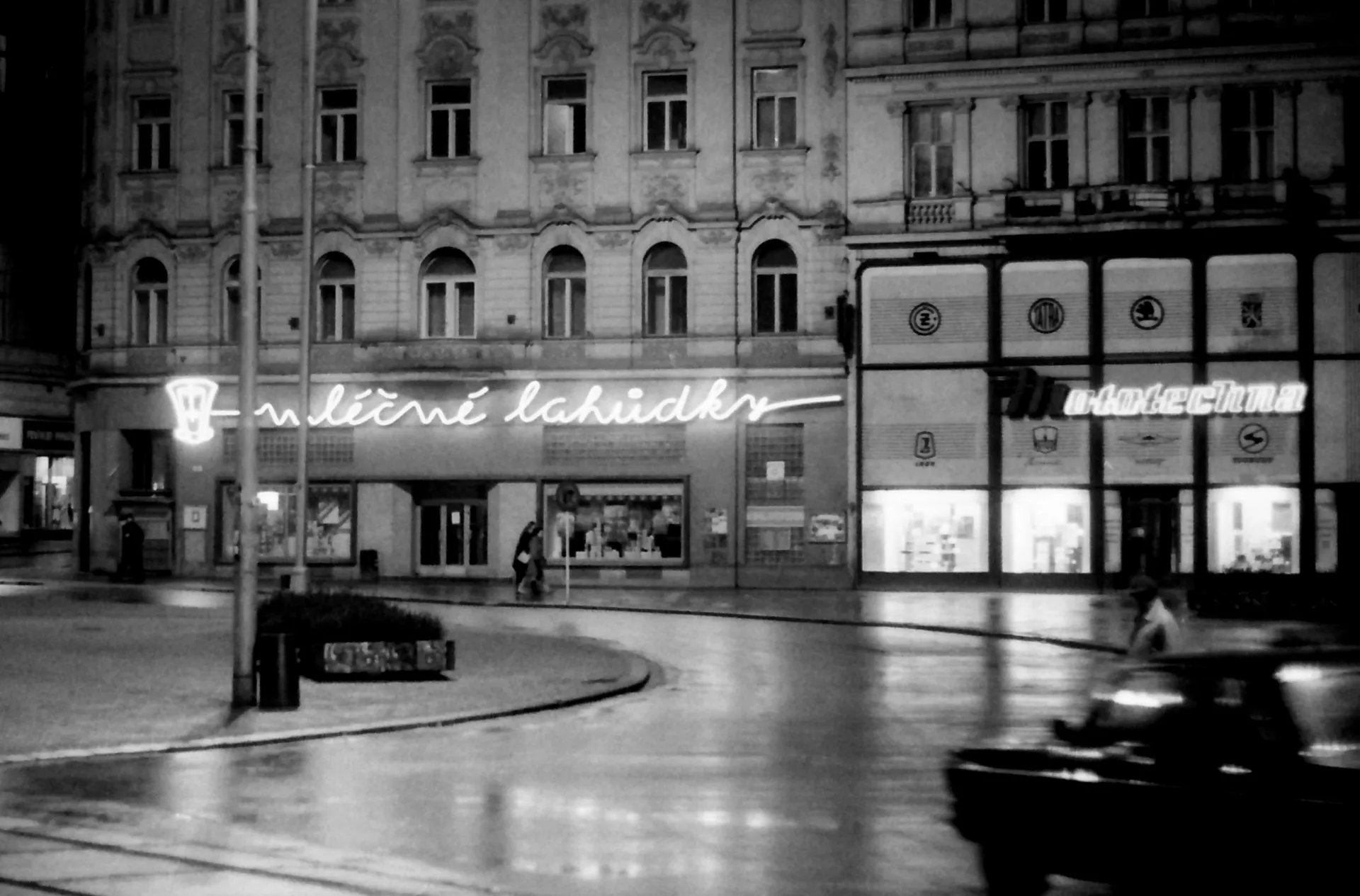 Im Laufe der fünfziger Jahre sind im Brünner Stadtzentrum gleich mehrere Betriebe entstanden, die für die Bevölkerung an strategischen, viel frequentierten Stellen Raum für Imbisslokale boten. Direkt am Platz der Freiheit wurde bereits 1950 in den Räumlichkeiten des an der Ecke der Straße Zámečnicka liegenden Barockpalais eine Verkaufsstelle für Delikatessen aus Molkereiprodukten eröffnet, deren architektonischer Entwurf von Jiří Velek ein Jahr zuvor ausgearbeitet wurde. In den Jahren 1958–1959 kamen dann in der Nähe des Bahnhofs (Zdeněk Řihák und Jaroslav Brychta) und in der Straße Česká (Jaroslav Brychta) noch weitere Milchbars hinzu. Architekt Velek, Autor des Gebäudes Keramoprojekt aus dem Jahr 1962, platzierte die neue Milchbar in das Geschäftsparterre eines vierstöckigen Objektes. Der Haupteingang wurde zwischen zwei großzügige Auslagen gesetzt, die den Innenräumen des Buffets einen luftigen und lichterfüllten Charakter verliehen. Über den Schaufenstern sind ergänzend dazu noch zwei Glasbausteinflächen und ein charakteristischer, vom Brüsseler Stil beeinflusster Neonschriftzug zu sehen, der über die gesamte Länge der zum Marktplatz gewandten Fassade geht. Die künstlerische Verzierung der Milchbar aus den Jahren 1953–1955 stammt von dem Brünner Maler Bohumír Matal, einem Mitglied der Gruppe 42, der sich in den Nachkriegsjahren lange mit Malereien, Sgraffiti und Keramik für Architektur beschäftigte. Für die Milchbar machte er thematisch von einem realsitisch ausgeführten Motiv einer Kuhherde in Form einer großformatigen Wandmalerei Gebrauch, ähnlich wie für den Innenraum der nahegelegenen Bar Tempo, wo er wieder in Anknüpfung an Jiří Veleks Entwurf eine Malerei mit dem Motiv einer Pferdegruppe wählte (1950). Weder von den ursprünglichen Innenräumen, noch vom Exterieur der Milchbar oder von ihrer Malereiverzierung ist heute etwas erhalten geblieben, da der Betrieb kurz nach der Wende geschlossen und nach Renovierung durch die erste McDonalds-Filiale Brünns ersetzt.wurde. KE