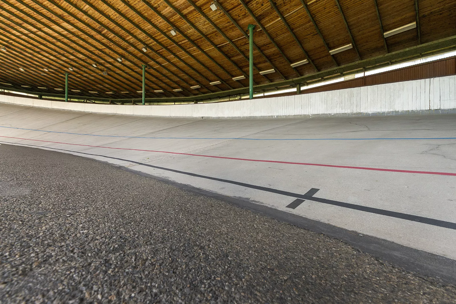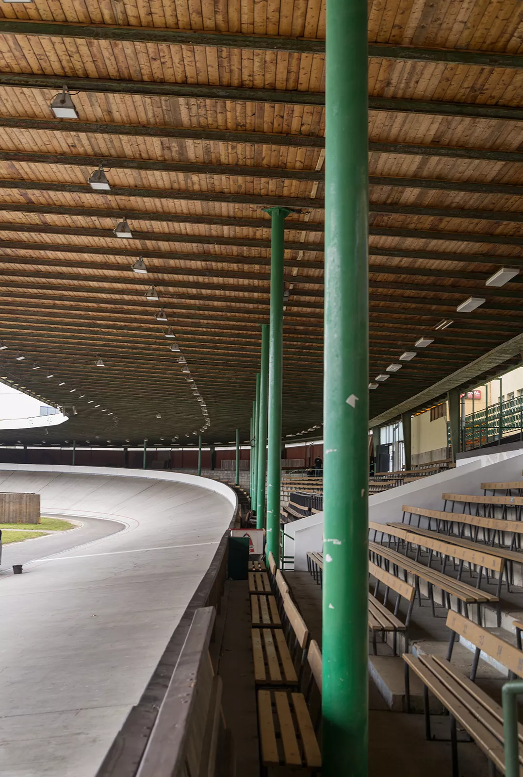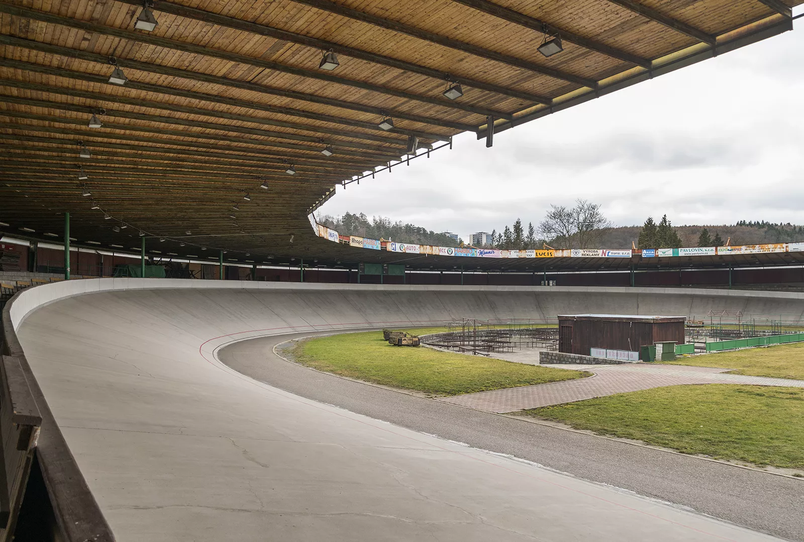 Die Geschichte des Brünner Velodroms reicht in das Jahr 1889 zurück, als auf seiner heutigen Stelle eine erdene Radrennbahn errichtet wurde, in der Volksmund als „Baurák“ nach seinem Gründer, Besitzer den anliegenden Grundstücke Viktor Bauer bezeichnet. In den 1930er Jahren lagen dem Velodrom mit dem Sportplatz schon mehrere Bauten an einschließlich des Musikpavillons. Da sich an der Ostseite Schrebergärten ausdehnten, war der Eingang damals an der Nordwestseite situiert und die Startstelle befand sich im Westteil der Bahn. Während des Zweiten Weltkriegs wurde die Radrennbahn den tschechischen Radsportlern durch Deutsche beschlagnahmt und nach dem Krieg bis zum Sokol-Turnfest im Jahre 1948 durch die Sokol-Organisation III benutzt. Die ersten nachkriegszeitlichen Herrichtungen begannen also erst im Jahre 1951, als unter der Teilnahme von Freiwilligen eine vom Ingenieur Chlubna entworfene Asphaltbahn von 6 m Breite erbaut wurde. Diese Bahn, die sich wegen ihrer angerauten Oberfläche als langsam und gefährlich erwies, war mit einer Barriere, dem Lokalrundfunk, Garderoben mit Sanitäranlagen, einer stufenförmigen Zuschauertribüne und Beleuchtung auf hohen Eisenpfosten versehen. Damals wurde das Areal des Velodroms in Richtung Osten, in den Raum der ehemaligen Schrebergärten erweitert. Im Jahre 1957 wurde eine neue glatte, 7 m breite Betonbahn mit Steinfundament erbaut, wodurch auch die Kurvenzahl erhöht wurde. In jener Zeit begann der neu entstandene Sportverein Favorit das Velodrom zu verwalten, welchem die hohen Besucherzahlen in folgenden Jahren große Erträge brachten. Es wurde also der Aufbau einer überdachten Radrennbahn erwogen, die die Weltmeisterschaft im Jahre 1969 empfangen könnte. In der Zeitspanne 1967-1969 machte das Velodrom einen gründlichen, in zwei Etappen durchgeführten Umbau durch, dessen Projekt von der Brünner Baufirma Stavoprojekt erarbeitet wurde. In der ersten Etappe entstand das Hauptgebäude mit Büros, einer Gaststätte und Gesellschaftsräumen, es wurden auch die älteren Garderoben und Sanitäranlagen erweitert. Im Westteil des Areals wurde ein Wirtschaftsgebäude mit Büros, Werkstätten, Boxen für Motorleitfahrzeuge und Turnhalle mit Diensträumen erbaut. Nach dem Projekt von Ingenieur Karel Cibula und Jaroslav Chlubna wurde die Radrennbahn neu hergerichtet – auf 8 m verbreitet und 400 m verkürzt. Die Bahn mit der Neigung von 34° wurde an der Innenseite mit einer 3 m breiten Sicherheitszone aus Asphalt versehen und unter ihrem Niveau wurde eine Unterführung und Zufahrt von der Westseite errichtet. Während der zweiten Etappe erhielt das Velodrom die Bedachung und neue Beleuchtung, es wurden Kabinen für Rundfunk- und Fernsehstäbe errichtet und das ganze Sportareal bekam eine neue Abzäunung. Damals wurde südlich des Velodroms ein Radfahrerdorf mit Rezeption, Gesellschafts- und Lagerräumen, Minigolf und Sauna erbaut, das gegenwärtig der Öffentlichkeit Unterkunft bietet. Hinter dem Entwurf des heutigen Erscheinungsbilds des Velodroms mit notwendigen Serviceräumen und Bedachung steht Architekt Mojmír Korvas. Mit der Konstruktions- und statischen Lösung des dachtragenden Stahlskeletts befassten sich Professor Ferdinand Lederer, Leiter des Lehrstuhls für Stahlkonstruktionen an der Brünner Technischen Hochschule VUT, und Ingenieur Jiří Lefner, Mitarbeiter des Konstruktionsateliers für Brückenbau in der Königsfelder Maschinenbaufabrik. Dieses Atelier stellte einzelne Teile der Stahlkonstruktion her, die schrittweise nach Velodrom gebracht und von den Mitarbeitern der Firma Chemont Brno in einer Rekordzeit unter der Leitung von Josef Ulč d. Ä. zusammenmontiert wurden. Über der Radrennbahn und den Tribünen entstand ein flaches Dach, das leicht zur Außenseite neigt. Die wechselhafte Höhe der Böschung der Tribüne beeinflusst die Höhe einzelner Säulen, die symmetrisch an ihrem Außen- und Innenrand situiert sind. Diese Stiele, die die Dachbinder tragen, sind in Stützmauern und Eisenbetonfundamenten der Tribüne verankert. Der äußere Säulenkranz bildet u. a. das Skelett der Umfassungsmauern des Velodroms aus Wellblech. Die den Pappenbelag auf Holzschalung tragenden Binder überragen die Tribüne und bedachen auch die Radrennbahn. Kurz nach Beendigung der Bedachung erschienen Fehler im Dachbelag und in die Tribüne regnete es durch. Diese Mängel wurden in den 70er Jahren beseitigt, der Dachbelag und die Schalung wurden repariert. Die ursprüngliche Stahlkonstruktion des Dachs ist bis heute erhalten, die sichtbare Beschädigung durch Oberflächenkorrosion gefährdet ihre Lebensdauer nicht. Die Farbigkeit der Oberflächen einzelner Bauelemente ist nicht ursprünglich, es wurden weiße, graue, braune, orangefarbene und gelbe Abschattierungen verwendet. Die spätere Beleuchtung der Radrennbahn mit Reflektoren, die direkt auf Dachträgern aufgehängt sind, beeinträchtigt den Bau visuell nicht, längliche Leuchtkörper über den Tribünen sind ursprünglich. Auf der Eisenbetontribüne ist nur ein Teil der Sitze erhalten, die nach Korvas´ Entwurf hergestellt wurden. Interessant ist der zeitgenössische ornamentale Beschlag auf dem Tor der Haupt- und Nebeneinfahrt, der auch in der Trennwand zur Geltung kommt, die die Tribüne von dem Eingang in die Gaststätte trennt. Die Letztgenannte funktioniert heute als Musikklub „Favál“, was die Slangbezeichnung des Velodroms war. Für das Brünner Velodrom, die älteste existierende Radrennbahn in Europa, wird gegenwärtig ein Abrissbescheid vorbereitet. Seine Betonbahn und Bedachung entsprechen nicht mehr den Standards des Spitzenleistungs-Radsports. Im Brünner Stadtteil Komárov wird daher der Bau eines neuen vollbedachten Velodroms geplant, dessen Bahn eine hölzerne Oberfläche und die heute übliche Standardlänge von 250 m haben wird. ŠB