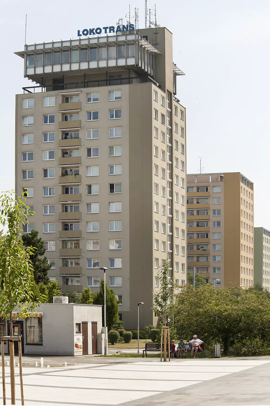 Kohoutovice, die historische, einst selbständige Gemeinde am waldbedeckten Brünner Stadtrand, hat im Laufe der sechziger bis achtziger Jahre einen rasanten Wandel durchgemacht, als sich der Stadtteil auf Grundlage des urbanistischen Plans des Brünner Architekten František Kočí im Umkreis der Hauptverkehrsstraße Libušina třída bedeutend ausbreitete. Die dortige Siedlung, die Wohnkapazitäten für über zehntausend Einwohner bot, wurde nach und nach zu mehreren aneinander anknüpfenden Bezirken mit unterschiedlichen Wohnobjekttypen geformt, die überwiegend im Plattenbausystem T06B errichtet wurden (neunstöckige Plattenbauten, Punkthäuser mit 4–13 Etagen). Organisch darin eingebettet waren auch soziale Infrastrukturzentren mit Geschäfts- und Kulturbauten bzw. schulischen Einrichtungen oder Kunstwerken mit überwiegend musikalischen Motiven (Sylva Lacinová, Miloš Axman). Zu den ausdrucksvollsten Ergänzungen dieser Siedlungsinfrastruktur gehörte der Bau eines Gastronomiebetriebs auf einem der fünf um die Straße Voříškova konzentrierten Hochhäuser. Das auf das Dach eines dreizehnstöckigen Punkthauses in der Siedlung Kohoutovice gesetzte Restaurant Grandprix repräsentiert eine sehr spezielle Lösungsmöglichkeit für die soziale Infrastruktur der neu errichteten Wohnkomplexe. Der bis heute aktive Architekt Jaroslav Černý, von dem die Entwürfe eines großen Teils der Wohnhäuser in der Siedlung ausgearbeitet wurden, hat hier in Form eines zweistöckigen Restaurants mit Stahlkonstruktion und freitragenden verglasten Fassaden eine bedeutende Sichtdominante des gesamten umliegenden Raumes geschaffen. Der repräsentative gastronomische Betrieb mit einer Kapazität für 120 Personen sollte nicht nur für die Besucher der nahegelegenen Rennstrecke Grand Prix ČSSR, sondern gleichzeitig vor allem auch für die Bewohner der Siedlung Kohoutovice als exklusives Aussichtscafé dienen. Der im Erdgeschoss durch eine vorgesetzte Treppe mit mächtiger hervortretender Stahlmarkise akzentuierte Zugang zum Café wurde unabhängig vom üblichen Betrieb des Hauses platziert. Durch die Verglasung von Aufzug und Schacht im Dachteil wurde die Vertikalität des Objektes insgesamt hervorgehoben. Das Café Grand Prix wurde in die Zwischenetage mit Eingangshalle, sanitären Einrichtungen, Büroräumen und Garderobe gesetzt, was gleichzeitig den Restaurantbetrieb vom Wohnteil des Hauses isolierte. Die Innenräume des Cafés wurden logisch um den verglasten Außenmantel angeordnet und mit Sitzgelegenheiten von in zwei Reihen gruppierten Thonet-Halbsesseln und Typentischen mit Gusseisenunterbau ausgestattet. Das Café wurde von der im Mittelteil des Restaurants befindlichen Barecke aus bedient, von wo aus man auch die Treppe runterging oder den Schnellaufzug benutzen konnte. Die äußere Form des Objektes ist heute immer noch sehr gut erhalten, im Jahr 2018 ist jedoch eine Sanierung des Außenmantels mit zur Zeit noch unklarem Ergebnis geplant. KE
