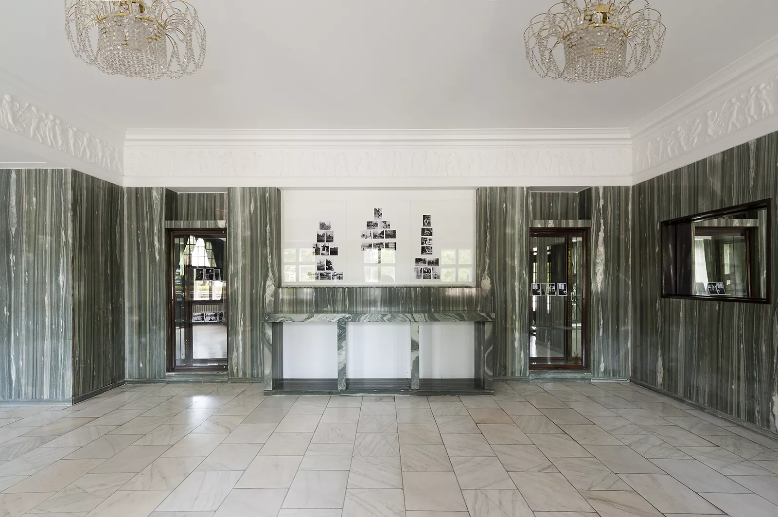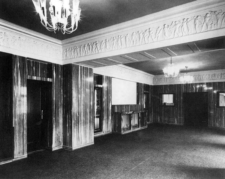 “I myself had only the dining room renovated by architect Loos in Brno, V Hlinkách Street 39/41, namely with marble panelling, recessed paintings and a marble sideboard, but the space in question is not yet finished; the floor is not laid and the furniture is missing, so I can hardly serve you with this building.” Viktor Bauer Jr.’s letter to Anton Schroll from 11 June 1930; Dagmar Černoušková, Zámeček na výstavišti. K úpravám starobrněnského zámečku Viktora Bauera [A Chateau at the Exhibition Centre. On the Remodelling of Viktor Bauer’s Chateau in Old Brno], in: Jindřich Chatrný – Dagmar Černoušková (eds.), Brněnské stopy Adolfa Loose [The Traces of Adolf Loos in Brno], Brno 2010, pp. 67–70, p. cited 69. Besides the lady’s bedroom on the first floor, the marble dining room is the best-preserved room in the Bauer Chateau; it clearly illustrates Adolf Loos’ creative practice, even though it was never completed. Characteristic of the architect is mainly the marble cladding and recessed paintings, antique-looking figural frieze, built-in furniture, the type of lighting used and, in general, an emphasis on symmetry. The most distinctive element of the large hall, divided by a curtain into a lounge with built-in sofas and a dining room, is the cladding of green marble with distinctive white veining, the so-called cipollino. Loos used the same type of stone in the Kraus apartment in Pilsen (1930–1931). The marble cladding ended just below the ceiling along its entire perimeter, with a figural frieze with an antique motif of bacchanalia. The architect had previously used it both in public spaces (Café Capua, Vienna, 1913) and in private residences (Villa Duschnitz, Vienna, 1915–1916) and apartments (Arnold and Julius Bellak’s apartment, Vienna, 1907); i.e. always in rooms related to catering and hospitality. In the overall concept of the hall, there is a striking emphasis on symmetrical composition, both in the case of the arrangement of built-in showcases around the marble sideboard, and the floral still lifes built into the sides of the main entrance. The front of the room was dominated by a large-format oil painting, also embedded in the panelling. It was the Mannerist painting A Feast in the Forest (1608) from the chateau in Kunín that Viktor Bauer Jr. inherited from his parents. Beneath the painting was a long built-in sofa lined with cipollino, a variant of which was also set in a shallow niche under the window leading to the garden. According to surviving photographs from Bauer’s lifetime, the floor of the hall was only temporary and consisted of roughly worked planks. Under the windows in the dining area, however, rectangular flower pots lined with green marble were already installed in the floor. This was repeated in the mezzanine of the staircase hall and along the railing in the corridor on the first floor. Lighting was an important part of Adolf Loos’ interiors. The architect used several types in Bauer’s dining room. Above the painting in the central part, there was a built-in ceiling light made of milk glass and running the entire width of the niche. The space above the two sofas was to be lit by two pull-out lamps. In the part of the room closer to the entrance, two chandeliers in the shape of simple milk glass discs framed with a gold embossed strip were installed on metal chains. The last type of luminaires were three-armed brass electric candlesticks in the shape of swans, twelve of which were mounted directly onto the stone cladding. The same type of wall lamps inspired by the style of Louis XVI can be found in the Pilsen apartment of Doctor Josef Vogel (1908) or in the already mentioned Villa Duschnitz and the apartment of the Bellak brothers in Vienna. In 1930, the owner of the chateau, Viktor Bauer Jr., received a questionnaire from the Viennese publisher Anton Schroll, asking Loos’ clients to provide information for the forthcoming monograph. However, Bauer replied that the marble dining room had not yet been completed, and preferred to refer Schroll to the sugar refinery director Ottokar Skalník, who had documents concerning the Loos villa in Hrušovany. In any case, the origin of the Loos Hall can be reliably dated to 1922 and 1923, as the chateau owner Viktor Bauer Jr. provided photographs of the room in his photo album with the following caption: “Our as yet unfurnished dining room in Old Brno – a work of the architect Loos (1922/1923). February 1934.” At that time, almost half a year had passed since architect Loos’ death. JK