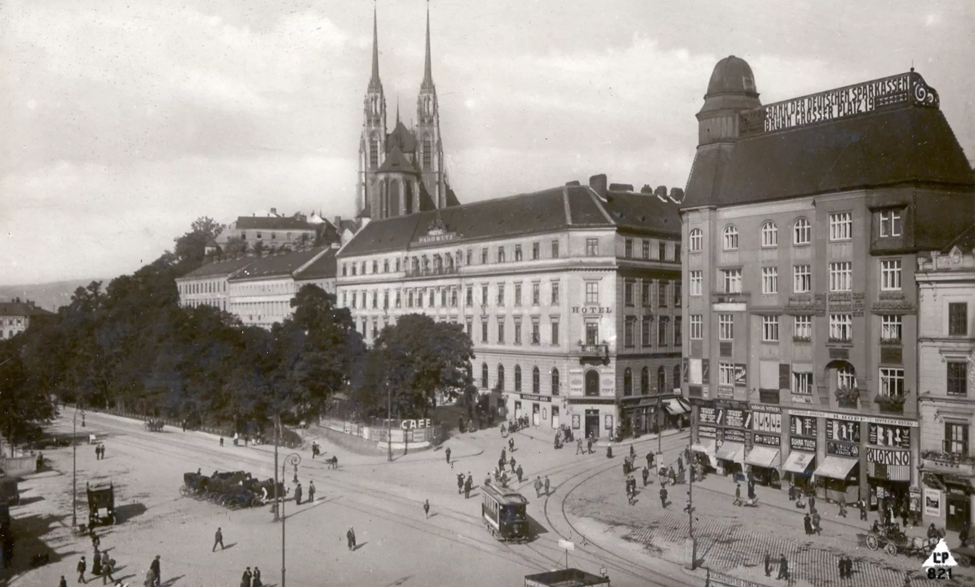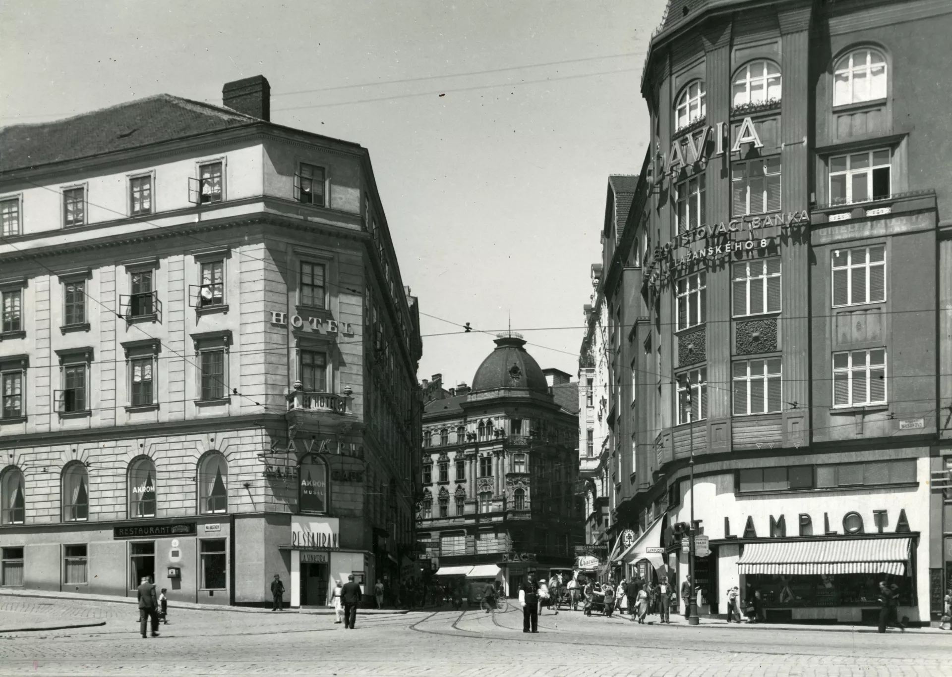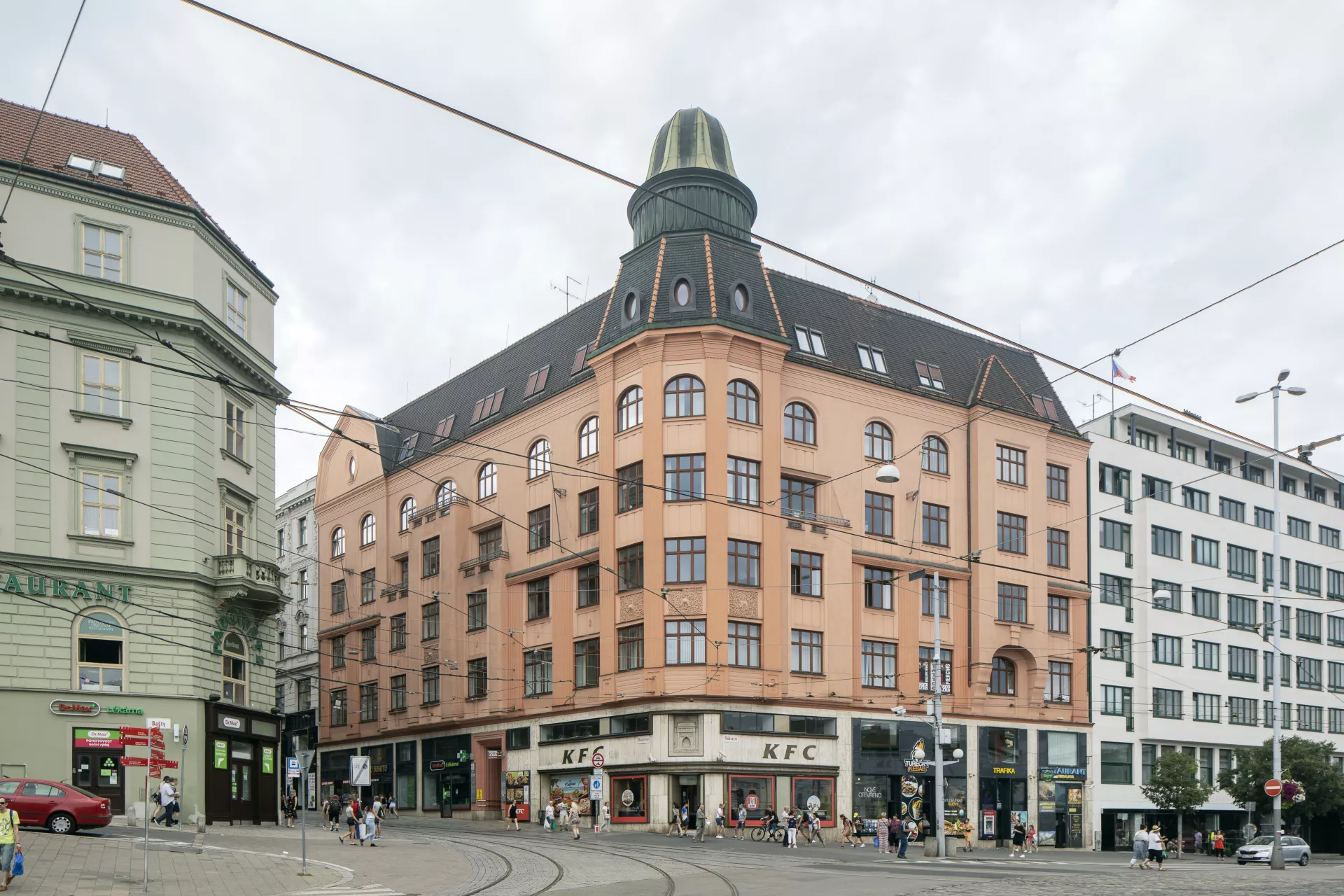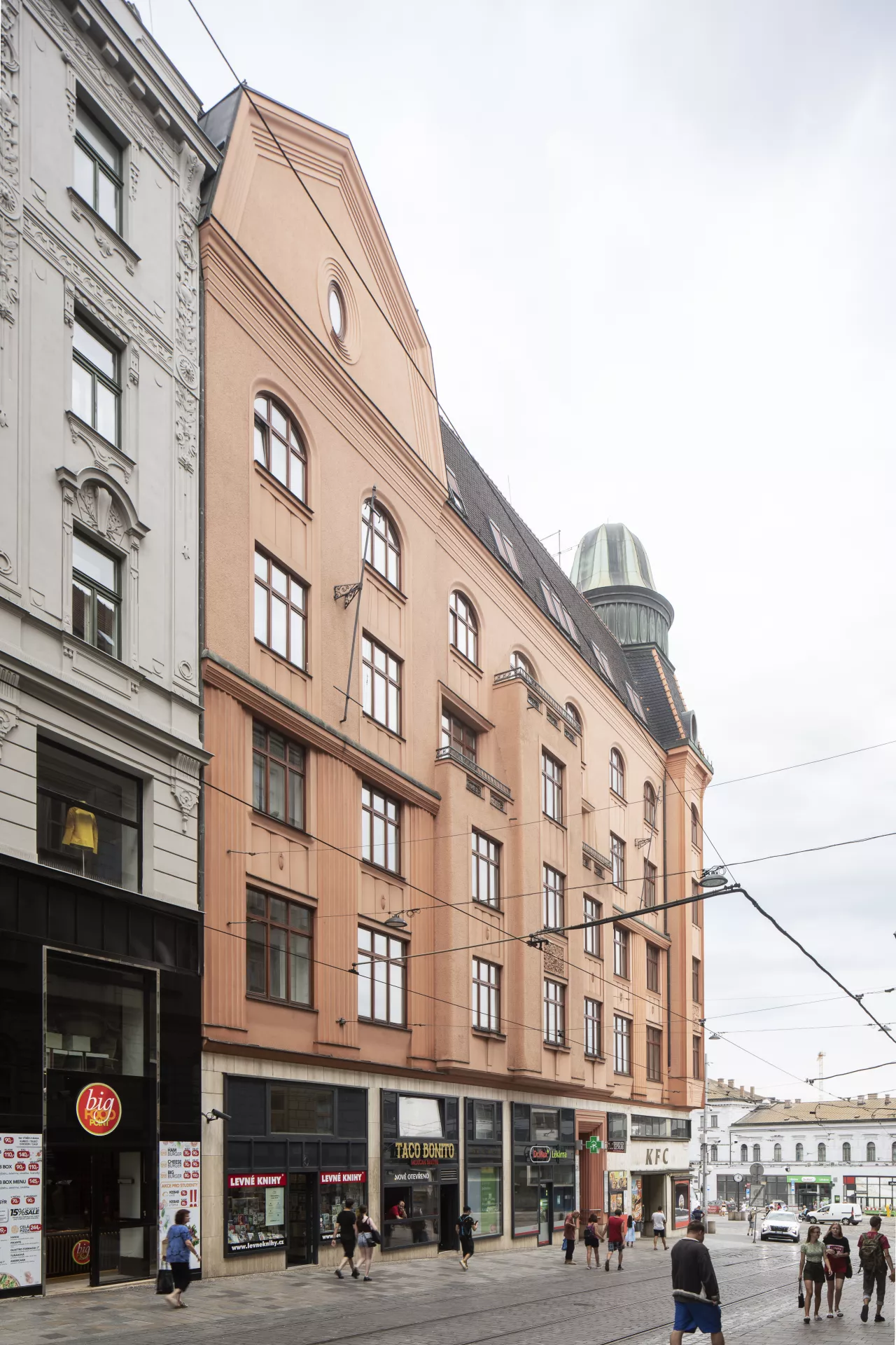 In combination with the Neo-Classical Padowetz Palace across the street, this monumental apartment building situated in a prominent location on the corner of Masarykova and Nádražní Streets forms a kind of propylaeum, a gateway to the historical city centre when coming from the large open area in front of Brno’s main railway station. The two-wing, five-storey building with raised ground floor has two asymmetrically composed facades with long, vertical oriels, fluted pilasters and a gable on the left end of the Masaryk Street elevation. The building’s defining architectural element is a tower-like three-sided corner oriel capped by small turret with a tholobate and helm. On the bevelled corner below oriel is a relief plaque depicting a medieval town gate, with the majuscule inscription ‘Das alte Ferdinandstor’. The building stands near the former site of the medieval Jewish Gate, which, as part of Brno’s sophisticated fortification system, formed the southern entrance to the city. The Jewish Gate’s Late Gothic portal appearance had been designed in the early 16th century by Anton Pilgram, who later served as head of St. Stephen’s Cathedral building workshop in Vienna. After the construction of Brno’s Baroque bastion fortifications, the gate gradually lost in importance. In 1836, it was replaced by the Neo-Classical Ferdinand Gate, which lasted just thirty years before being removed in 1865 as part of the modernization and opening-up of the city centre. (Parts of Pilgram’s portal have been preserved at the Lapidarium of Brno City Museum.) Also demolished at the time was the nearby picturesque cluster of two- and three-storey houses around the cul-de-sac known as Sackgasse. It is here, in 1913–1914, that local builder Adolf Bacher built his new apartment building designed by the Brno architects Robert Farsky and Bohumír František Antonín Čermák. Robert Farsky studied architecture under Otto Wagner at the Vienna Academy of Fine Arts and also worked with Josef Hoffmann at the famous Wiener Werkstätte. He moved to Brno in 1911, where he worked as an independent designer and also taught at the German Higher Technical School of Construction. He was a member of the Mährischer Künstlerbund, a local association of German-Moravian artists. The multi-talented Bohumír Čermák, the future founder of the Brno Artistic Crafts Workshop, also studied in Vienna and worked at Viennese architectural studios. Farsky and Čermák’s building took the form of a tall block accentuated by a polygonal corner topped by a cylindrical turret. Despite the use of basic historicist forms (albeit in a simplified, stylized rendering), the building’s overall character is entirely modern, as it creatively combines the formal vocabulary of geometric Art Nouveau with early modernism in a manner typical of Wagner’s students. For many years, a sign on the roof ridge next to the turret promoted the Brno branch of the Central Bank (Centralbank der deutschen Sparkassen, Brünn, Grosser Platz 19). It was removed in the late 1920s, when the bank was experiencing financial difficulties. From the time of its completion until 1981, the building housed the Apollo Cinema (subsequently named Aktualita, UFA-OP, Ohne Pause, and Čas), which had been founded by Dominik Markus Morgenstern, the operator of the first permanent cinema in the Czech lands. The building’s public areas are decorated primarily with ornamental elements done in the geometric Art Nouveau style, although in 1935 the Witzek bookshop modified the commercial ground-floor premises in the functionalist style according to plans by Zoltán Egri and Jan Haas. These partially preserved modifications are a unique example of the work of these architects and among only a few left in existence. Aleš Homola