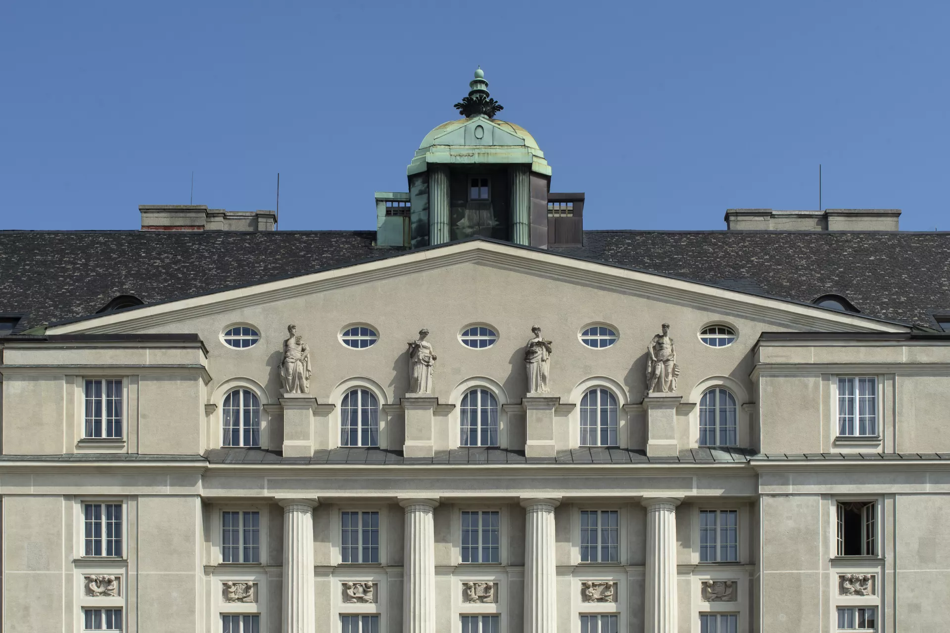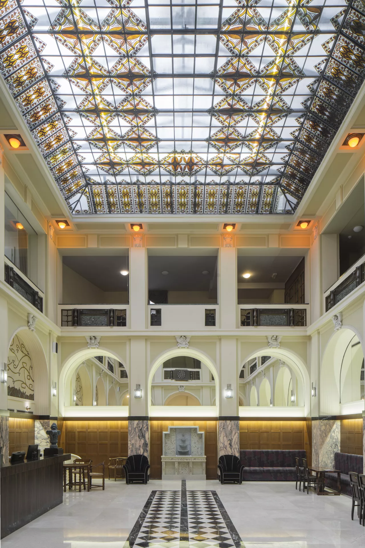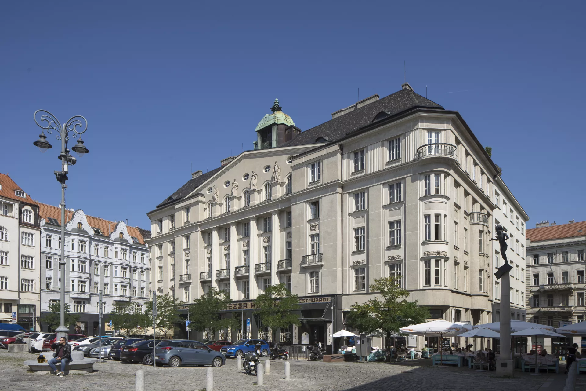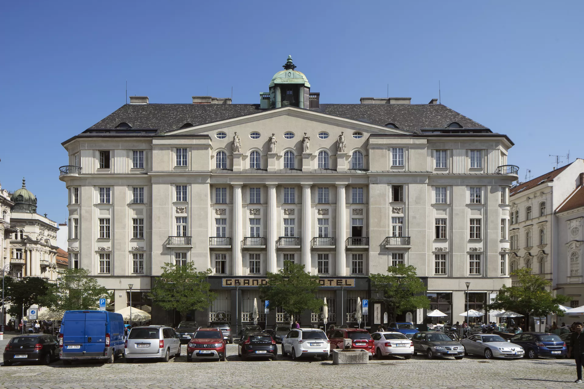 This grand and architecturally valuable building, built in 1913–1915 according to plans by the prominent Czech architect Vladimír Fischer, is an important local example of Czech architecture. Founded in 1882, the Cyril and Methodius Savings Bank was the first significant organization to focus on handling the financial assets of the city’s Czech residents. Previously, capital assets had been largely concentrated in the hands of the German population, which put Czech entrepreneurs and tradespeople at a certain disadvantage. The establishment of this financial institution can thus be seen as a historic step towards the Czech nation’s economic and industrial resurgence. After 1887, the company was headquartered at Zelný trh (Cabbage Market) no. 4. As it acquired more clients and capital, it logically faced greater demands for the construction of a fitting headquarters, and so the company decided in the early 20th century to build a large and prestigious building for itself. In 1913, the task of designing the new building was entrusted to the architect Vladimír Fischer. It was to be situated on the block between Ferdinandova Street (today Masarykova) and Zelný trh, whose lower end is now dominated by the bank building’s grand facade. In June 1914, demolition work began on the buildings that occupied around three quarters of the site. Although the First World War broke out shortly afterwards, the bank’s management decided to continue with construction, which was carried out by the builders Leopold Čupr and Ludvík Němeček. Despite problems resulting from a shortage of labour and building materials, the building was completed in late 1915. In this German-dominated town, its inauguration was an extraordinary event for the city’s patriotic Czechs, and it was held in the spirit of a grand celebration, including an unusual mass during which the building was consecrated. With this building, the bank, which openly embraced its role as a national (Czech) institution, received a headquarters resembling a grand palatial administrative building. Its consistently symmetrical Neo-Classical design perfectly complements the palaces at the upper part of the square. The central part of the main elevation with its rounded corners is a reference to classical triumphal architecture, with a pair of narrow rectangular projections flanking a section of five window bays separated by colossal fluted half-columns. This part of the facade also features classical elements of the piano nobile such as the balconies on the second floor, the massive cornice with four figural sculptures on plinths, and a triangular gable indirectly inspired by the classical tympanum. One expression of a more contemporary fashion is the spire on top of the hipped roof. The four figural sculptures on the tympanum, created in 1913–1915 by the sculptor Václav Hynek Mach, have a classicist appearance that was in keeping with Fischer’s architectural design. The lavish artisanal decoration was produced by the Prostějov-based Vulkania company managed by Emil Králík and B. Částek of Nové Město na Moravě. The wrought-iron elements were supplied by Franta Anýž of Prague. The building’s grand character is further manifested in its interior, which is dominated by a spacious two-storey hall with a glass ceiling. A sculpture group by Otomar Rábl depicts the bank’s patrons Saints Cyril and Methodius and an allegory of the twelve months. After the Second World War and until the late 1960s, the building housed the Brno branch of the State Savings Bank. In 1969–1997 it was used by Masaryk University, which performed various alterations in 1970 and then used it to house the Faculty of Law (until 1990) and the Faculty of Economics and Administration (1991–1997). In 1998, the building was purchased by a private investor, who converted it into a five-star hotel according to plans by the architect Ondřej Kukral (2008–2012). The hotel has 75 rooms and separate commercial premises on the ground floor, which serve as a café and restaurant. The conversion was the subject of considerable controversy, as it was carried out in the face of protests from preservationists. The investor’s plan even envisioned the construction of an underground parking garage designed by Archdesign studio with a capacity of 80 parking spaces for hotel guests. This undertaking, which would have led to the destruction of the market square’s medieval underground areas, was ultimately prevented thanks to fierce opposition from numerous experts and the public. Šárka Bahounková