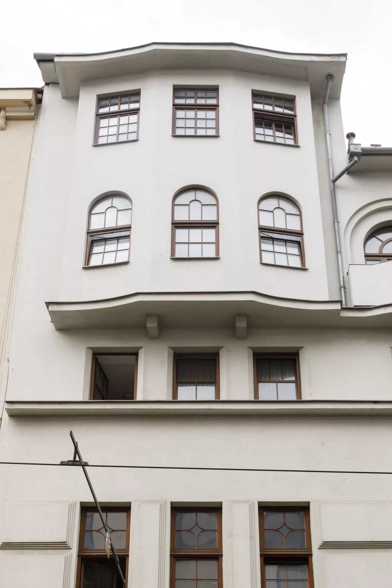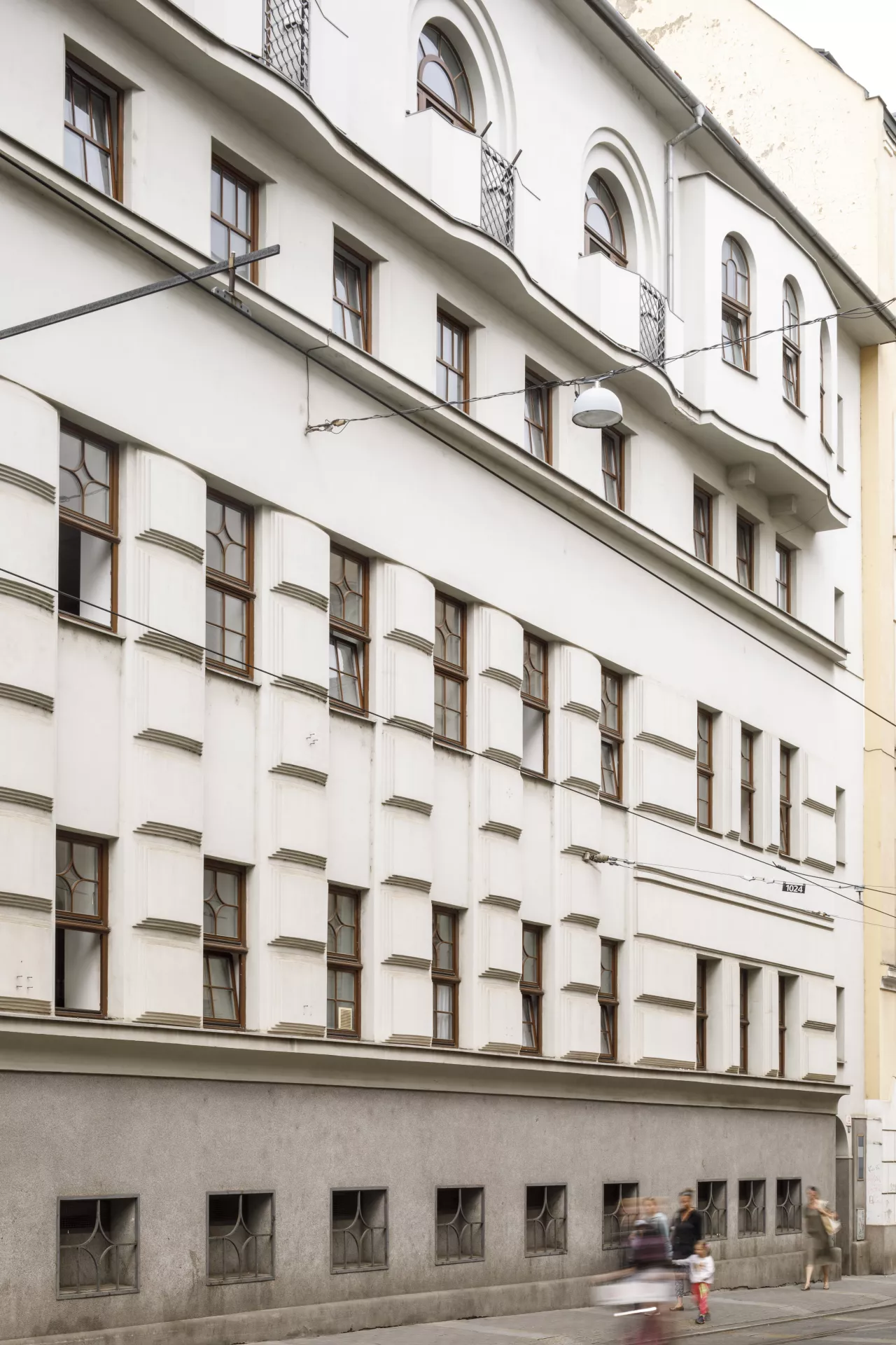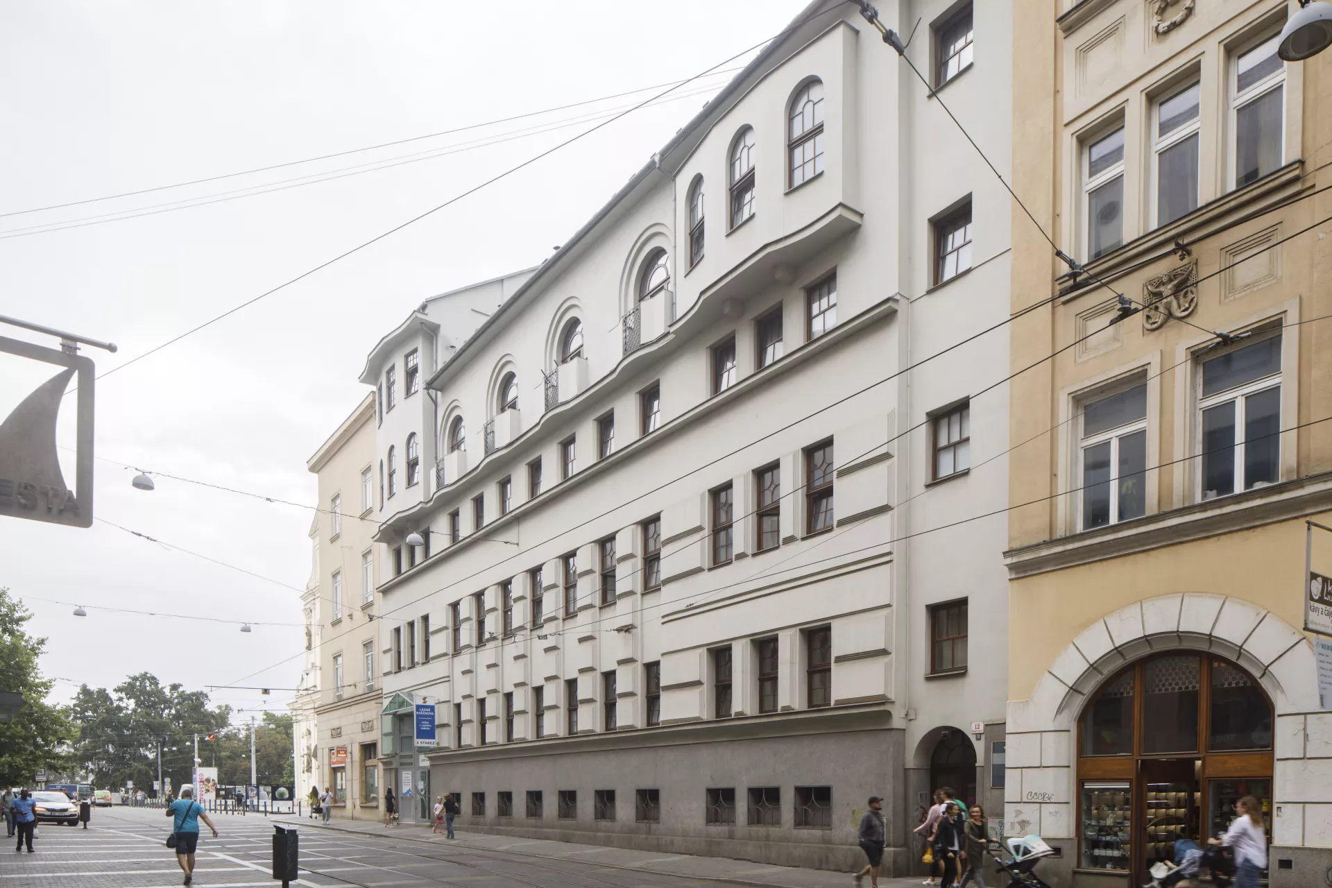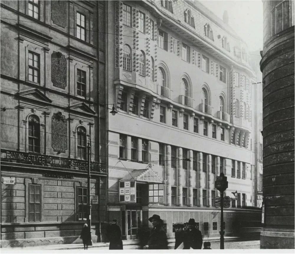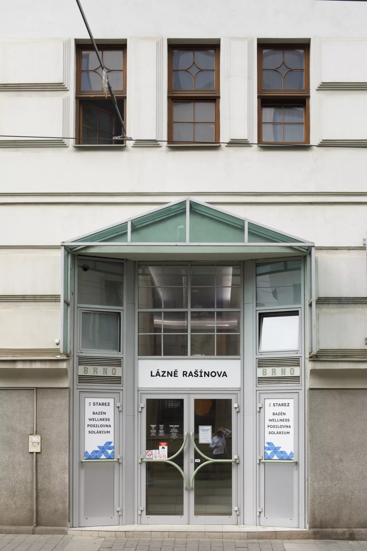 Mindful of its citizens’ hygiene, in the 19th century the rapidly growing industrial city of Brno built a network of public municipal baths to make up for the general lack of bathrooms in the city’s housing. In 1860 the Diana Baths were established in the city centre on land that had previously been the gardens of the Church of St. James. The baths were modernized and enlarged in 1905–1907 according to plans by the architect Hubert Gessner. They were designed primarily for the middle and upper classes and offered steam treatments, showers and baths. Unfortunately, the building was badly damaged by bombing at the end of the Second World War, and only a part of the perimeter walls and fragments of the interior, including the swimming pool, survived. The building’s post-war restoration significantly simplified Gessner’s facade and lowered the building by one storey. The pool was reconstructed, apparently in its original dimensions, as was the gallery surrounding the pool. Some architectural details from the original building were preserved in the interior, such as the geometrically articulated ceilings in the pool area and the main staircase with railings terminating in winding volutes. As part of a heritage restoration project after the year 2000, the original facade was restored according to historical photographs. Hubert Gessner was one of the most prominent Moravian pupils of the Vienna Secession architect Otto Wagner. In the early 20th century, Gessner’s style introduced elements of modern geometric Art Nouveau to Moravia, a style that is also apparent in this spa building. The lower part of the facade stands out for the use of monumental banded rustication, while the protruding upper floor sits atop a sharply curved cordon ledge. The character of the facade was further accentuated by the geometric composition of the windows, the metal grilles on the tiny balconies and the massive chambranles around the arched windows on the upper floor. Although the original facade was more decorative, the renovations in the second half of the 20th century successfully rehabilitated Gessner’s architectural work. Matěj Kruntorád