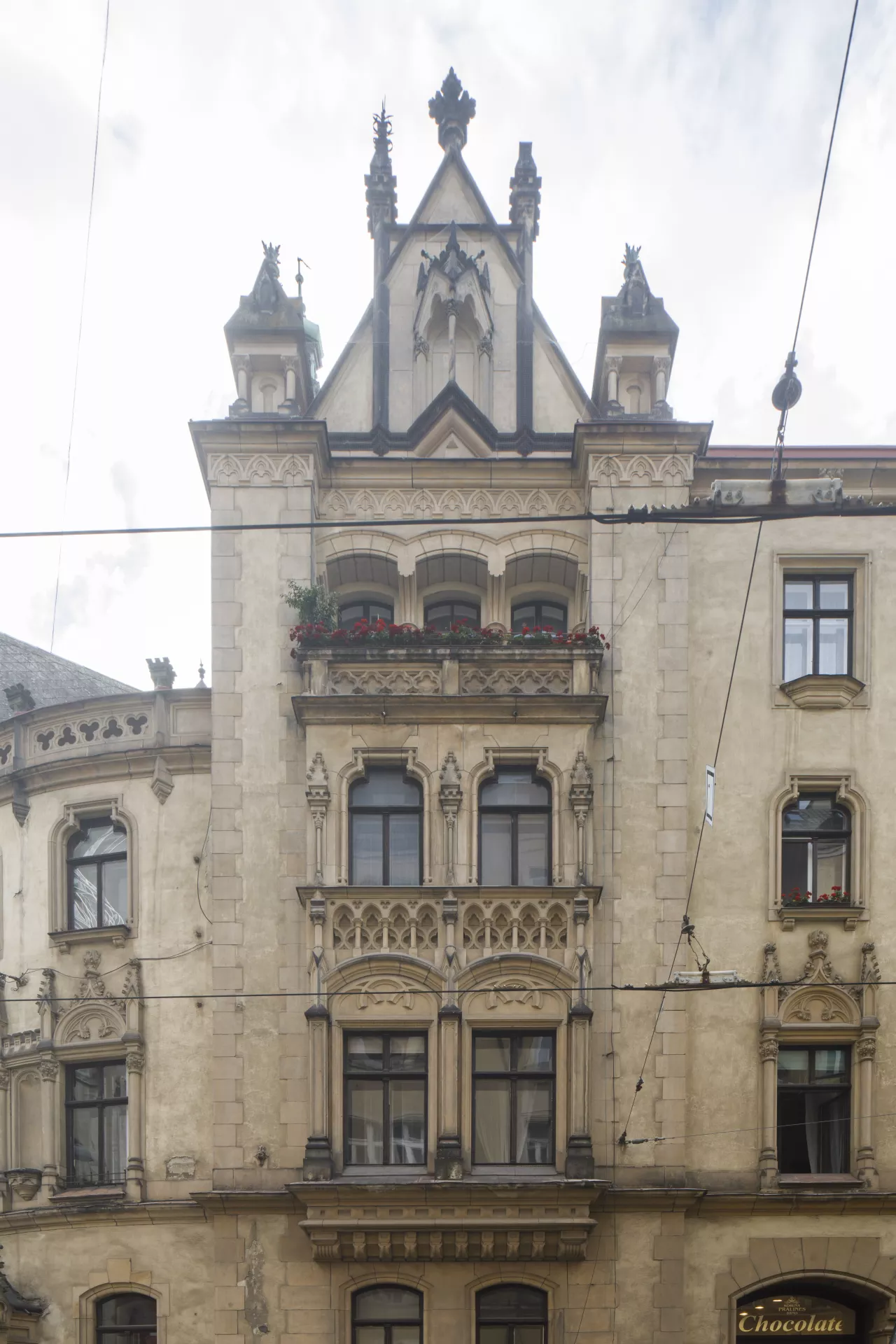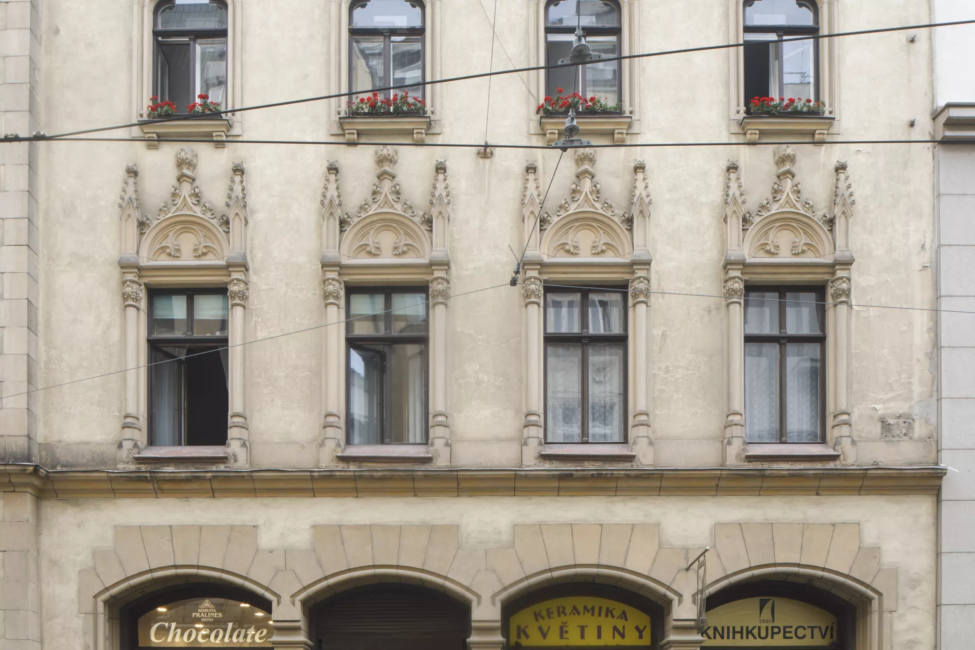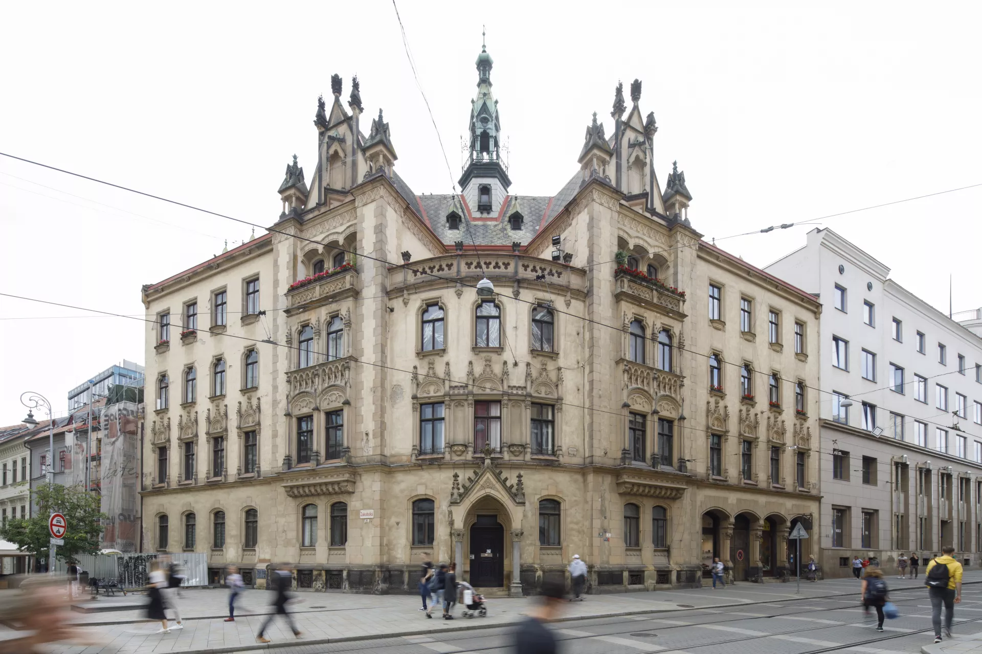 Since 1902, the rectory of the Church of St. James has stood across from the city’s main church. The building’s volume defines a prominent part of the then newly established church square, which was intersected by a new main avenue leading from náměstí Svobody to what was then the German House. The competition for the rectory was won by the architect Germano Wanderley, who in 1899 had contributed to the urban plan for the new street, today known as Rašínova. A considerable number of houses and old alleys, including the old Baroque rectory from 1710, were demolished to make way for this new avenue. Wanderley’s building is essentially a modern three-wing design with a rounded corner and a recessed terrace carved into the upper floor. It was built by the construction company of Josef Nebehosteny. His decision to give the rectory a Neo-Gothic look was most probably influenced by the square’s dominant feature, meaning the monumental Gothic Church of St. James. The windows are decorated with stone pillars topped by stiff-leaf capitals, pinnacles, blind tracery, niches and dentils. The building’s corner is flanked by two gables, between which a polygonal turret rises from the roof. Wanderley applied a similar turn-of-the-century Neo-Gothic design to the mostly well-preserved grand interiors. The central wing housing the staircase connects the halls and landings with a network of vaults directly inspired by the Church of St. James, their ribs rising from cylindrical supports on the walls. The vaults are adorned with munificent vegetal decoration. The stairs are lined by a remarkably intricate cast-iron railing produced by Brno’s Franz Schenk company. The interiors’ stylistic harmony is further underscored by the ornamental floor tiles from the Liechtenstein brickworks in Poštorná. The area around the Church of St. James is one of the few places in Brno where a significant amount of Neo-Gothic architecture was built during the redevelopment of the city centre. Besides the rectory, stylistic references to Gothic architecture can also be found on the buildings with steep gables built by Maxim Monter on the square’s northern side. This architecture, inspired mainly by the German Gothic with Art Nouveau influences, may well have been influenced not just by the church’s venerable age but also by Brno’s ethnic make-up at the time, with its German-speaking majority. Moreover, one of the requirements for the new rectory was that its design respect the church’s original architecture. Matěj Kruntorád