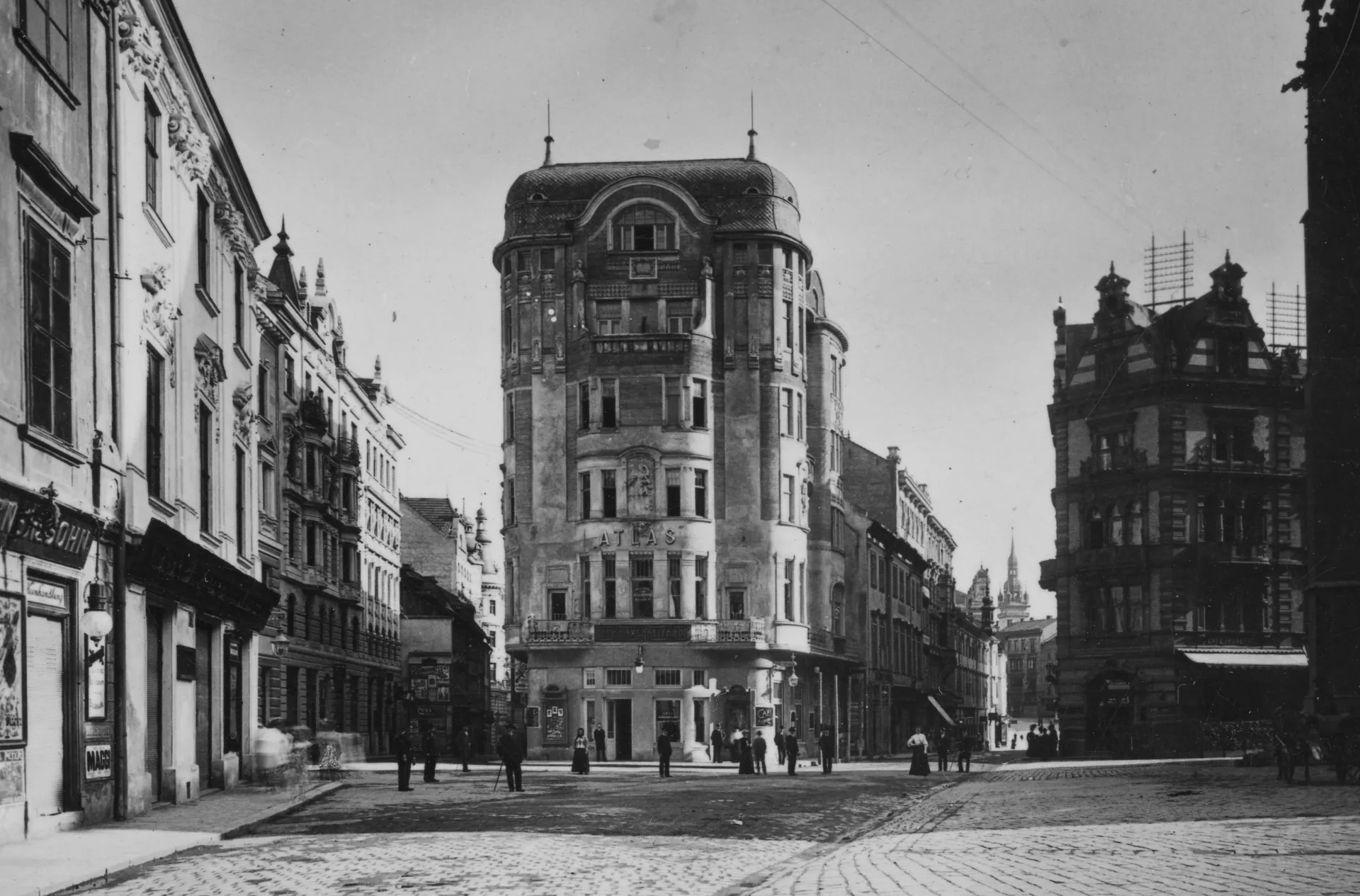 At the corner of Kozí and Běhounská Streets is a parcel facing Jakubské náměstí (St. James Square) that had been developed since the Middle Ages. Before the redevelopment of Brno’s historical centre, it was home to a two-storey Baroque building which at one point housed an inn known as U Zlaté studně (The Golden Well) – the name referred to a fountain in front of the building. In the late 19th century, Anton Spranz established a café in the building that was especially popular among officers of the Austro-Hungarian army, who were housed in the neighbouring barracks on the grounds of the former Jesuit monastery. Spranz, his family and several of his employees, including the cooks, lived in the café building as well. In 1905 the building, which was slated for demolition, was purchased by the lawyer Moritz Schratter and his wife Margarethe, who owned the neighbouring building at number 12. The new face of the area around the Church of St. James was defined by a development plan that envisioned the creation of a more open square, which required that the new buildings be set back from the previous street line. The plot vacated by the corner building thus presented its successor with a completely different set of conditions. The building that Schratter commissioned from Maxim Johann Monter had to make do with a slightly smaller plot but was allowed to stand considerably taller. This situation produced a six-storey building with a ground floor partly divided into two levels by a mezzanine. Schratter wanted to preserve the building’s hospitality and café tradition, as it was located along a popular promenade area frequented by Brno’s German-speaking population. Monter was a graduate of Prague’s technical university, and the Margaretenhof was one of his first projects in Brno – and also one of his finest, thanks mainly to the advantageous urban context. Approaching the building as a Gesamtkunstwerk, he drafted plans that also covered its artisanal furnishings and painting. The architecture works with interlinking ovals on the building’s rounded corners and with shallow, rounded avant-corps topped by a cornice of uneven height. Stylistically, the building is in harmony with the era’s Art Nouveau tendencies and flows in graceful curves, which unfortunately were significantly marred by the later expansion of the ground floor with its bulky rectangular parapet. The facades are visually articulated by the use of various decorative elements inspired by the geometric Secession of Vienna and Munich. The vegetal as well as purely ornamental decorative elements are complemented by female busts with wreaths, winged children’s heads and vases. The central motif on the side of the building facing the square is a large relief of a female figure with a child and a peacock, most probably an allegorical depiction of Venus with Cupid – i.e., the goddess of love with her son. It could be that the owner wanted to express his affection for his wife, after whom he named the building and the café (Margaretenhof, Margaret’s Court). In 1911 the interior of the café was redone in the Art Deco style by the architect Bohumír Čermák, and during the First Republic the entire ground floor was remodelled by an unknown architect in the functionalist style. The café continued to be popular with the upper middle classes and was a meeting place for various organizations, for instance the German chess club (Deutscher Schachverein). In the First Republic, this prestigious establishment frequented by the city’s elites was replaced by the Café Adria, and today the building is home to a patisserie. Matěj Kruntorád