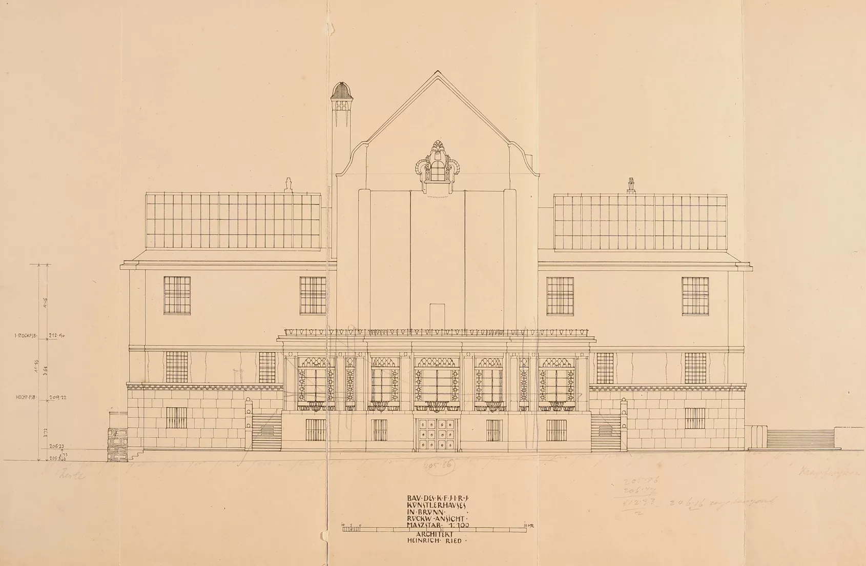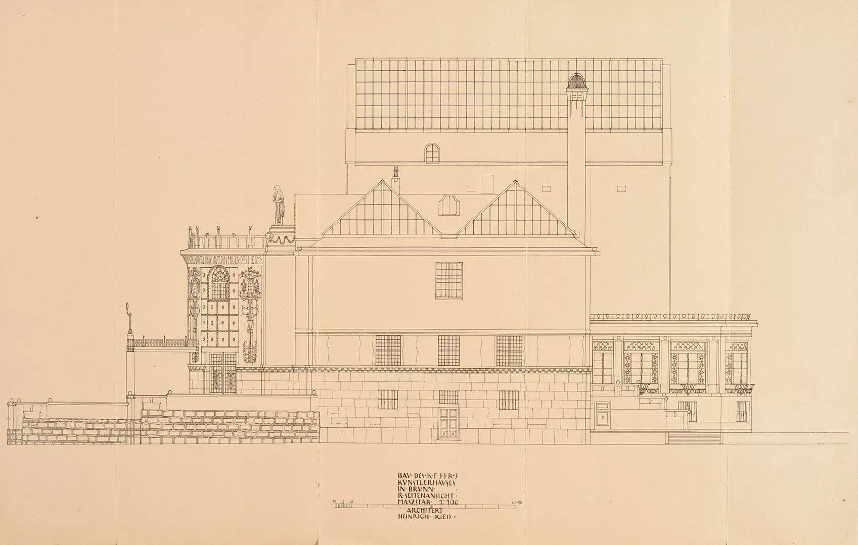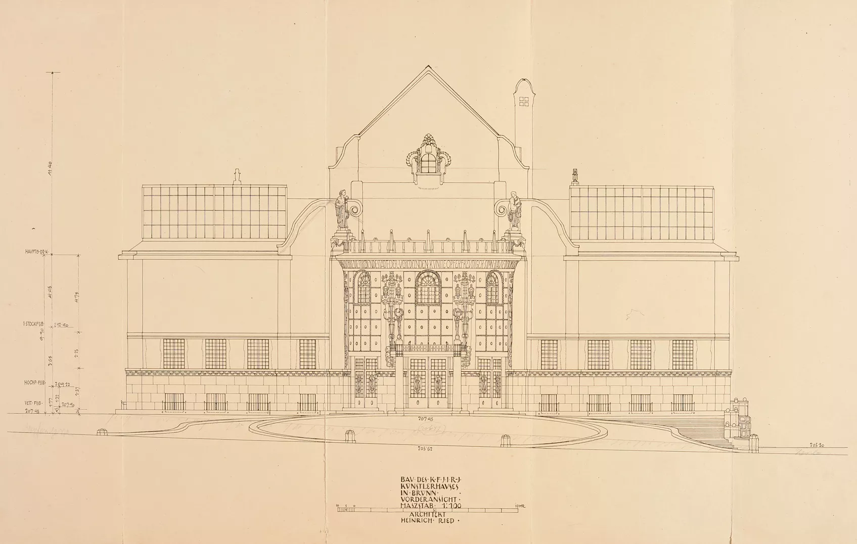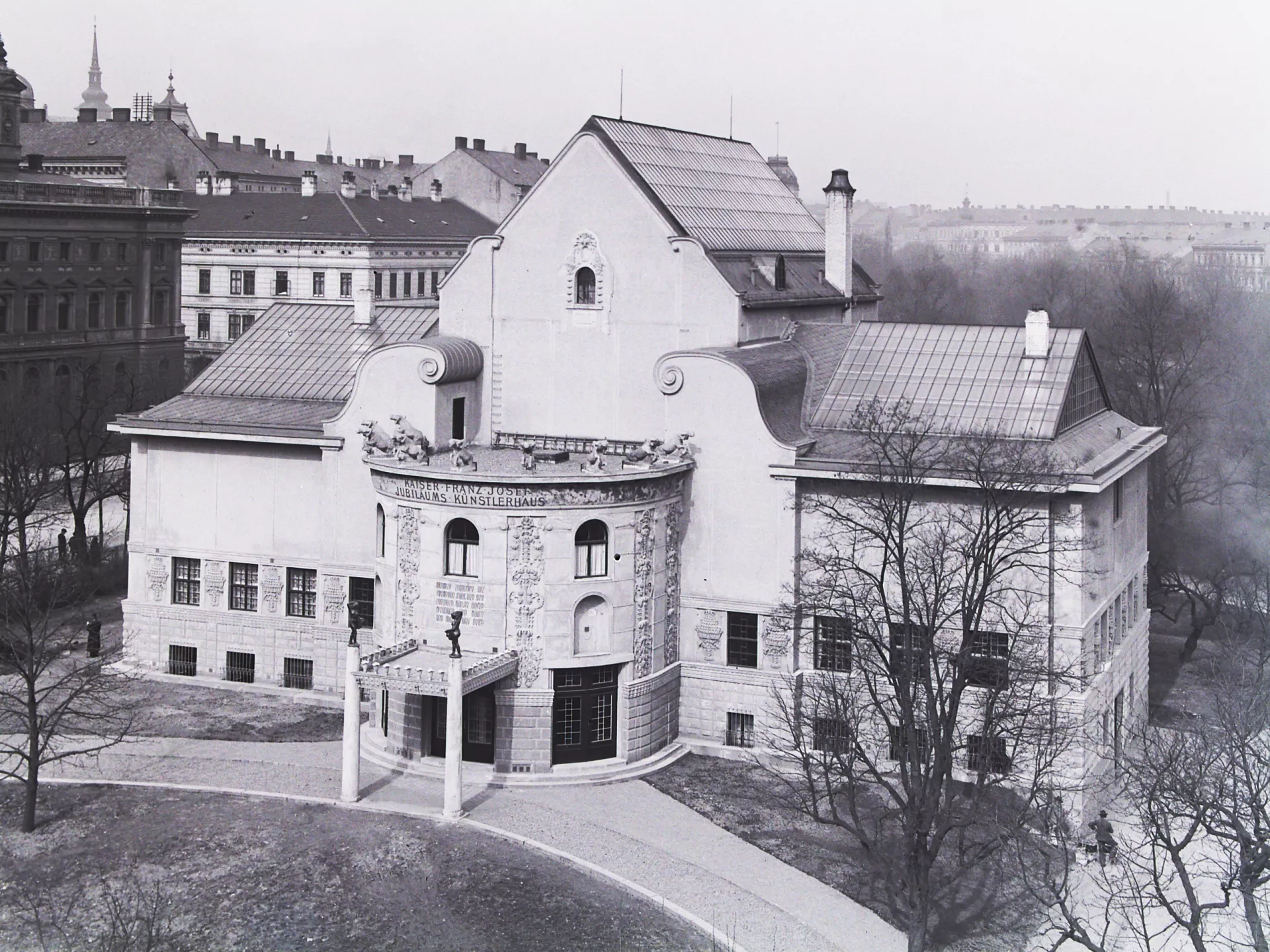 The original House of Artists, the Kaiser Franz Josef-Jubiläums-Künstlerhaus, was built in 1911 according to plans by the Viennese architect Heinrich Karl Ried. Ried’s design was selected by an expert jury whose members included the eminent architects Otto Wagner and Friedrich Ohmann. The facade of the symmetrical building with a rounded avant-corps was richly decorated with stucco floral motifs. The columns by the entrance were a loose reference to the neighbouring theatre building. While the interior exhibition spaces were designed in a distinctly modern manner, with plentiful natural light flowing into the upper halls through the glass roofs, the exterior facade was conservative in nature. Its sculptural decoration was very much influenced by the era’s strong cult of the sanctification of art, which, ‘on the wings of the imagination, detaches itself from all that is earthly and soars into the realm of the ideal.’ A four-metre-high statue of Wieland, the master blacksmith of Germanic mythology, stood on the roof of the avant-corps, guarded by nine centaurs possibly symbolizing the forces of barbarism. This sculptural decoration was the work of Carl Wollek. The House of Arts was severely damaged by bombing during the Second World War, and its post-war renovation was undertaken by Bohuslav Fuchs in 1946. Above all, Fuchs cleared the facade of its decorative ornamentation and replaced the originally rounded avant-corps with a cube-like mass while largely preserving the building’s internal structure. Initially, Fuchs had envisaged the use of relief decoration on the facade, but this idea was never realized. He apparently also considered collaborating with Vincenc Makovský, whose sculptural work eventually adorned the building’s facade (though not as a relief), where it can still be seen today. Originally, a sculpture by Franta Úprka entitled Poutníci (Pilgrims) stood on the steps in front of the House of Arts, later joined by a bust of Tomáš Garrigue Masaryk by Vincenc Makovský. Both works were removed in 1948 (Poutníci is now located in front of the Zeman Café), and Makovský received a new commission for a bust of Soviet military commander Rodion Malinovsky. Reportedly, he fashioned Marshal Malinovsky’s likeness from a newspaper photograph. Shortly before the Velvet Revolution in 1989, another work by Makovsky, Žena se snopem (Woman with a Sheaf), was placed on a newly built cascading fountain that never went into operation. The current appearance of the House of Arts is the result of Bohuslav Fuchs’s post-war renovation, which was respected during the building’s most recent renovation in 2008–2009 (Markéta Hrůšová, Petr Hrůša and Architekti Hrůša). Jana Vránová