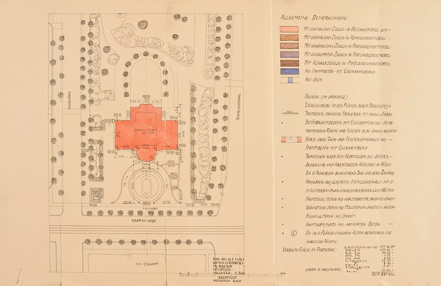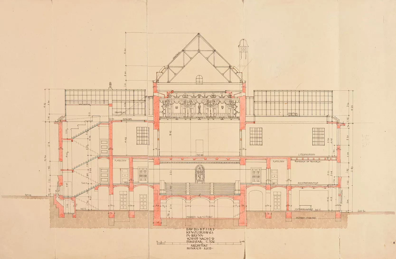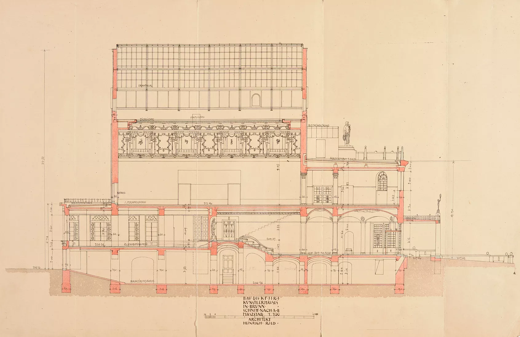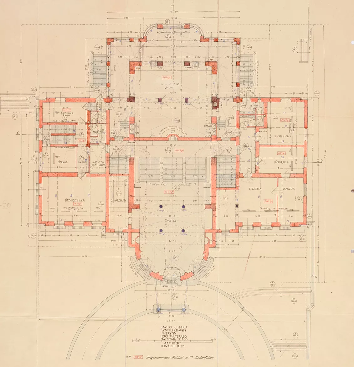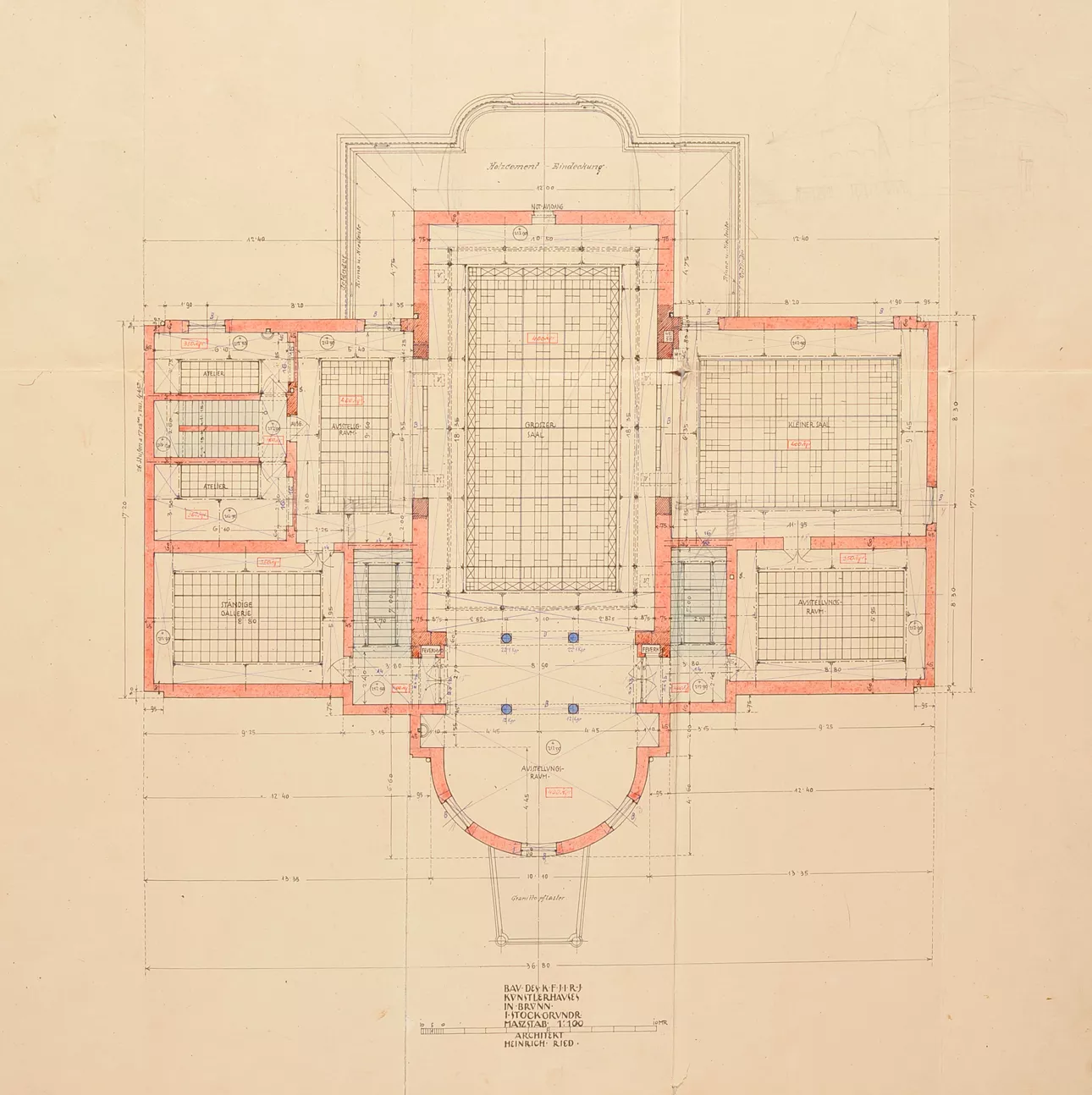 The original House of Artists, the Kaiser Franz Josef-Jubiläums-Künstlerhaus, was built in 1911 according to plans by the Viennese architect Heinrich Karl Ried. Ried’s design was selected by an expert jury whose members included the eminent architects Otto Wagner and Friedrich Ohmann. The facade of the symmetrical building with a rounded avant-corps was richly decorated with stucco floral motifs. The columns by the entrance were a loose reference to the neighbouring theatre building. While the interior exhibition spaces were designed in a distinctly modern manner, with plentiful natural light flowing into the upper halls through the glass roofs, the exterior facade was conservative in nature. Its sculptural decoration was very much influenced by the era’s strong cult of the sanctification of art, which, ‘on the wings of the imagination, detaches itself from all that is earthly and soars into the realm of the ideal.’ A four-metre-high statue of Wieland, the master blacksmith of Germanic mythology, stood on the roof of the avant-corps, guarded by nine centaurs possibly symbolizing the forces of barbarism. This sculptural decoration was the work of Carl Wollek. The House of Arts was severely damaged by bombing during the Second World War, and its post-war renovation was undertaken by Bohuslav Fuchs in 1946. Above all, Fuchs cleared the facade of its decorative ornamentation and replaced the originally rounded avant-corps with a cube-like mass while largely preserving the building’s internal structure. Initially, Fuchs had envisaged the use of relief decoration on the facade, but this idea was never realized. He apparently also considered collaborating with Vincenc Makovský, whose sculptural work eventually adorned the building’s facade (though not as a relief), where it can still be seen today. Originally, a sculpture by Franta Úprka entitled Poutníci (Pilgrims) stood on the steps in front of the House of Arts, later joined by a bust of Tomáš Garrigue Masaryk by Vincenc Makovský. Both works were removed in 1948 (Poutníci is now located in front of the Zeman Café), and Makovský received a new commission for a bust of Soviet military commander Rodion Malinovsky. Reportedly, he fashioned Marshal Malinovsky’s likeness from a newspaper photograph. Shortly before the Velvet Revolution in 1989, another work by Makovsky, Žena se snopem (Woman with a Sheaf), was placed on a newly built cascading fountain that never went into operation. The current appearance of the House of Arts is the result of Bohuslav Fuchs’s post-war renovation, which was respected during the building’s most recent renovation in 2008–2009 (Markéta Hrůšová, Petr Hrůša and Architekti Hrůša). Jana Vránová