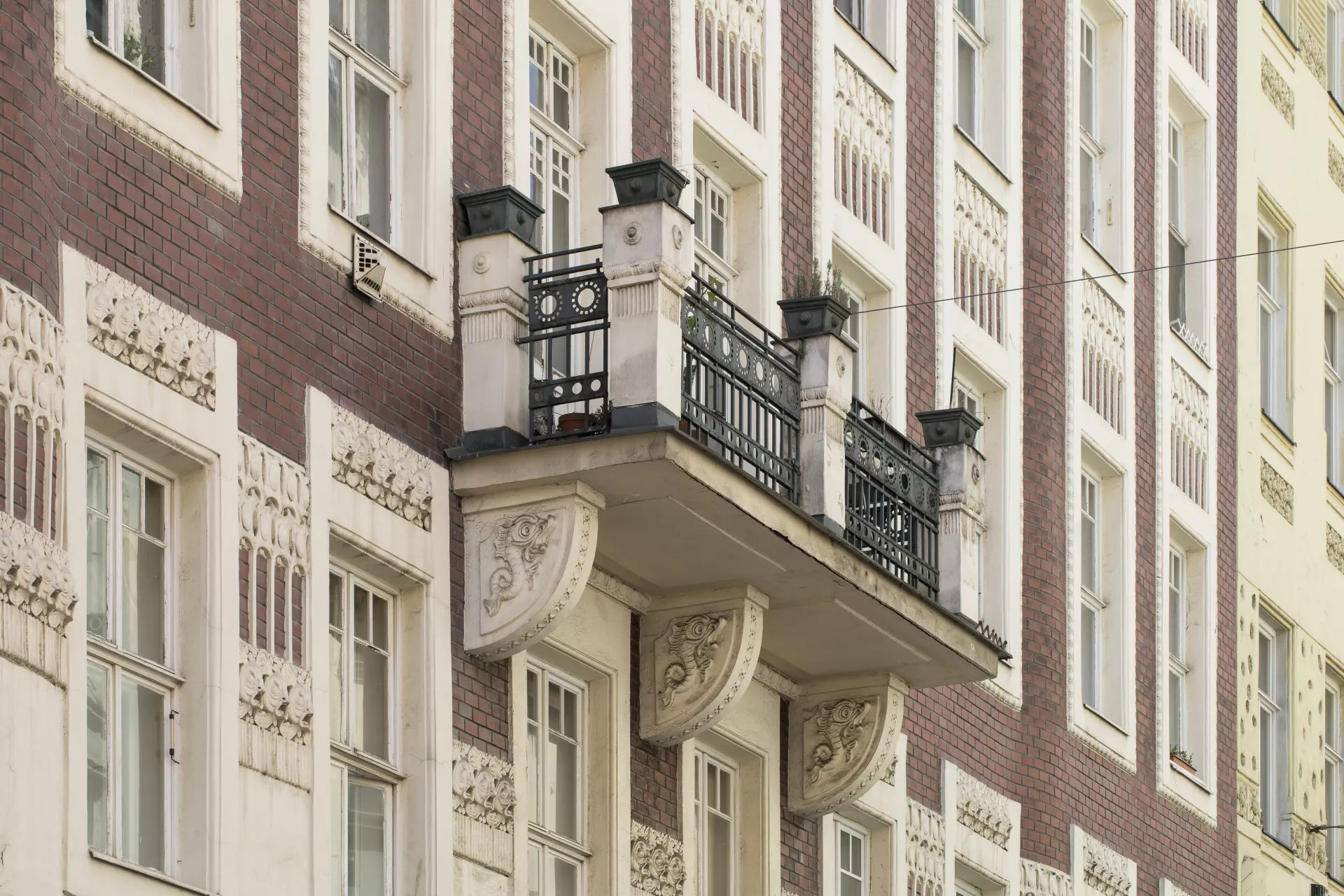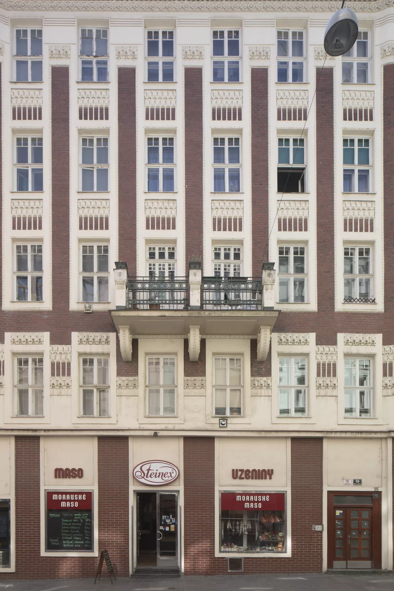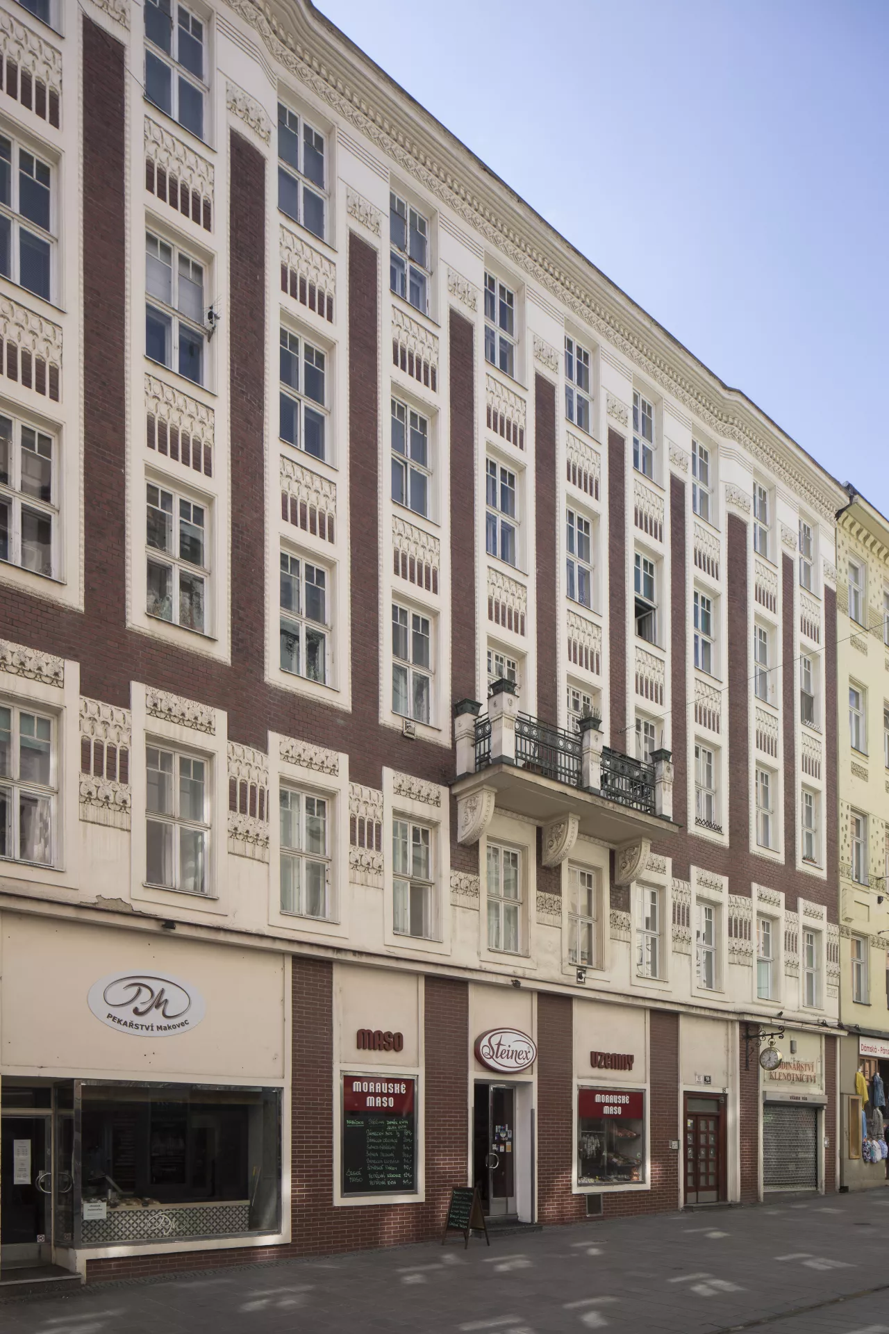 This apartment building designed for Johanna Pelikánová by architect Max Matzenauer is certainly one of the most outstanding buildings erected on Kobližná Street after the widespread clearance of Brno’s city centre. As indicated by its architect on the facade, it was built in 1905. The only compositional elements on the ten-bay facade are a central balcony and extremely shallow avant-corps on the corners that give the building a slightly undulating character. The facade is made of plain fair-faced brickwork with stucco decoration in the form of window chambranles that combine into continuous vertical bands. In order to preserve the facade’s proportions, the architect situated the central balcony on the second floor. The decoration has a water theme: the stuccowork beneath the windows consists of stylized fish heads, and there are dolphins on the corbels underneath the balcony. The original ground-floor facade was renovated several years ago so that its brick cladding would match the rest of the facade. The entrance hall is decorated with a continuous strip of stucco that repeats the fish-head motif from the facade. For the four-flight staircase, Matzenauer used the same type of cast-iron railing as in Charlotte Deutsch’s building on Minoritská Street (B044). The landings on each floor are wooden pawlatsch-style access balconies with windows overlooking the yard. Martin Koplík