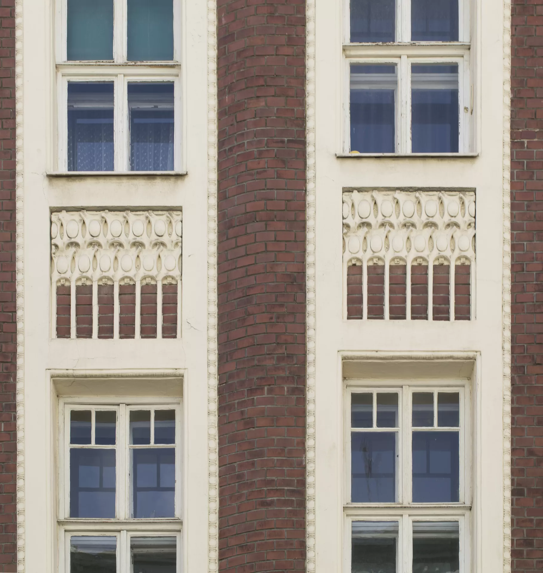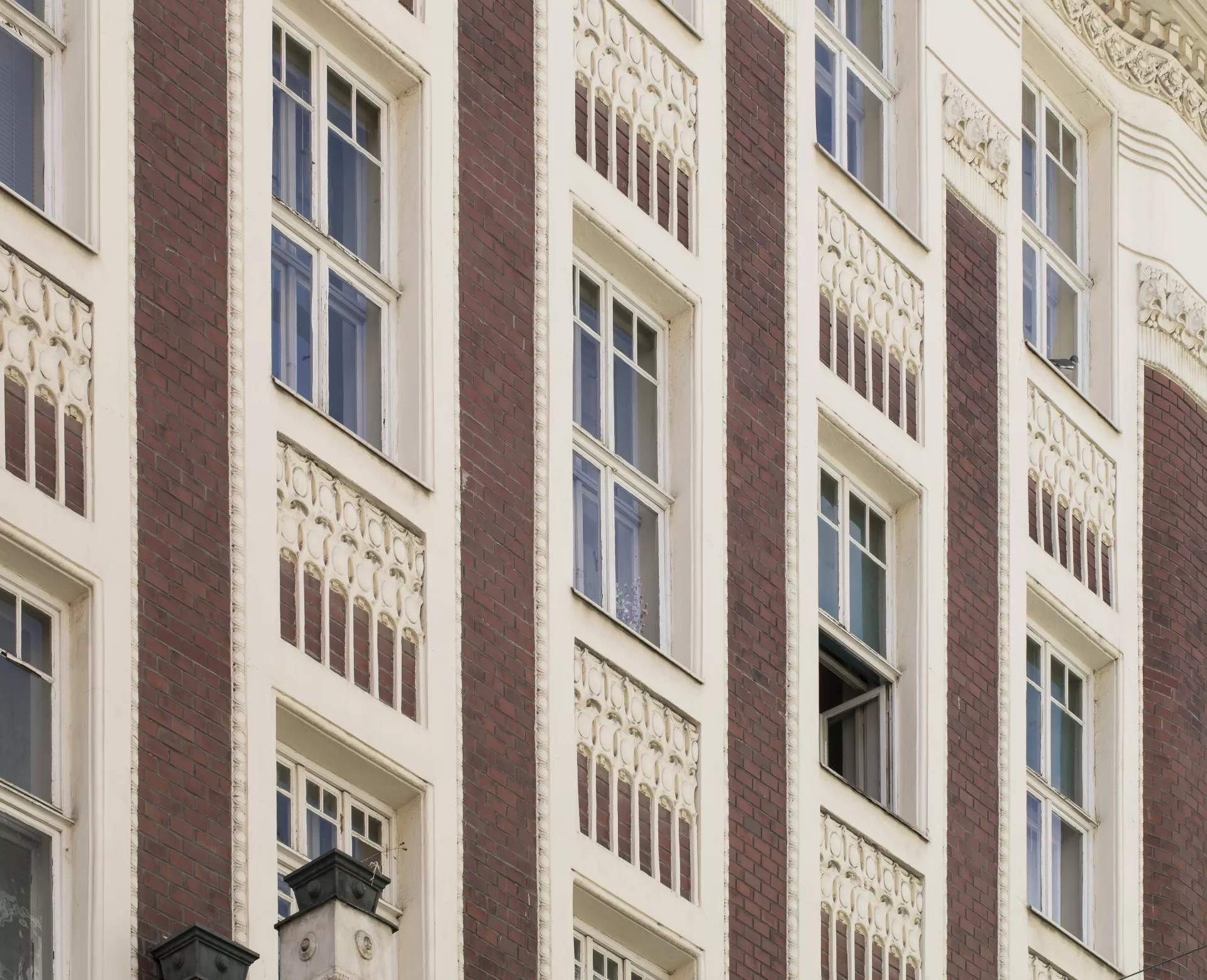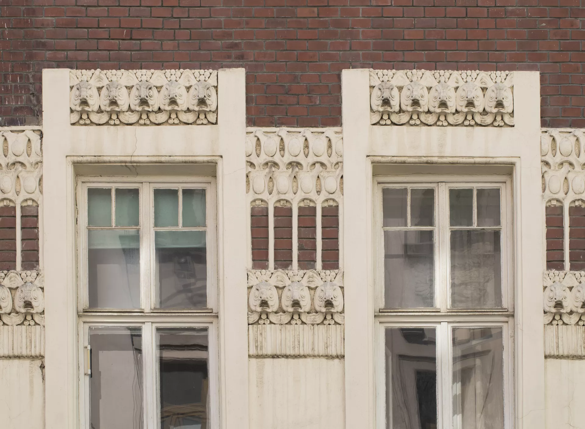 This apartment building designed for Johanna Pelikánová by architect Max Matzenauer is certainly one of the most outstanding buildings erected on Kobližná Street after the widespread clearance of Brno’s city centre. As indicated by its architect on the facade, it was built in 1905. The only compositional elements on the ten-bay facade are a central balcony and extremely shallow avant-corps on the corners that give the building a slightly undulating character. The facade is made of plain fair-faced brickwork with stucco decoration in the form of window chambranles that combine into continuous vertical bands. In order to preserve the facade’s proportions, the architect situated the central balcony on the second floor. The decoration has a water theme: the stuccowork beneath the windows consists of stylized fish heads, and there are dolphins on the corbels underneath the balcony. The original ground-floor facade was renovated several years ago so that its brick cladding would match the rest of the facade. The entrance hall is decorated with a continuous strip of stucco that repeats the fish-head motif from the facade. For the four-flight staircase, Matzenauer used the same type of cast-iron railing as in Charlotte Deutsch’s building on Minoritská Street (B044). The landings on each floor are wooden pawlatsch-style access balconies with windows overlooking the yard. Martin Koplík