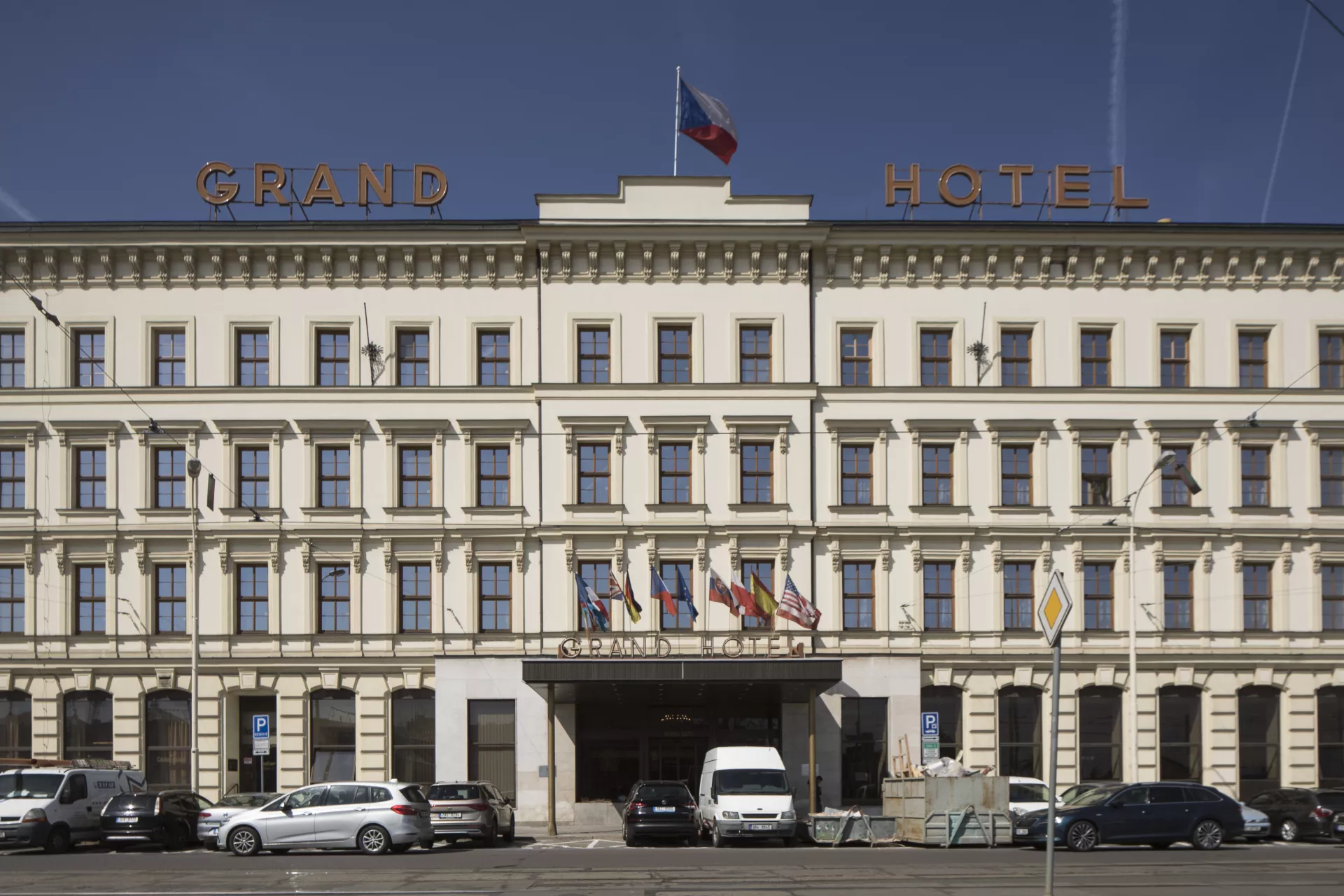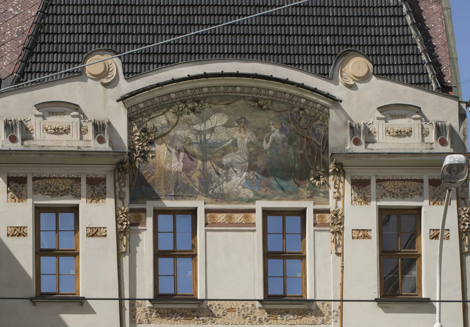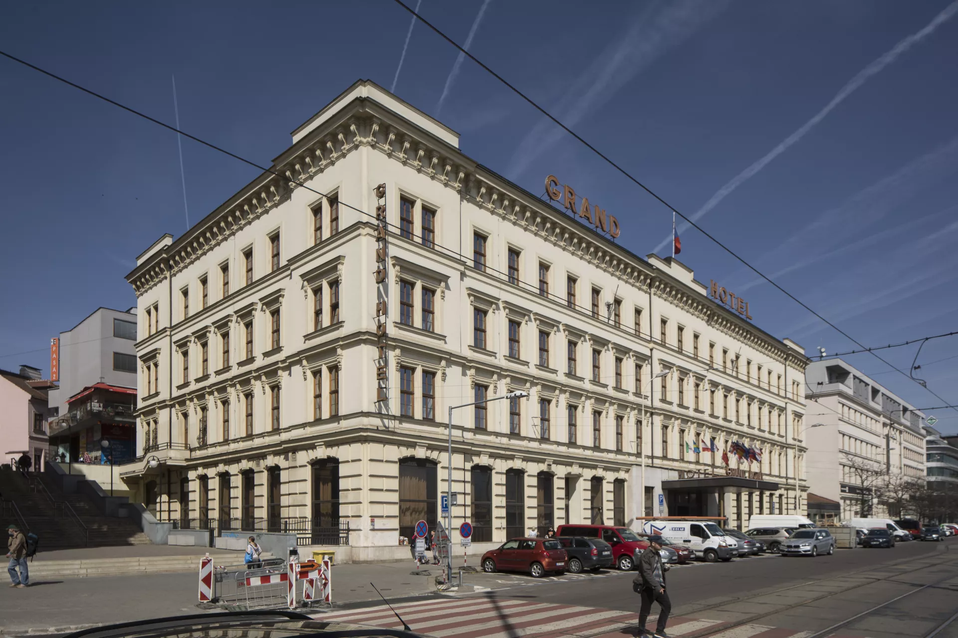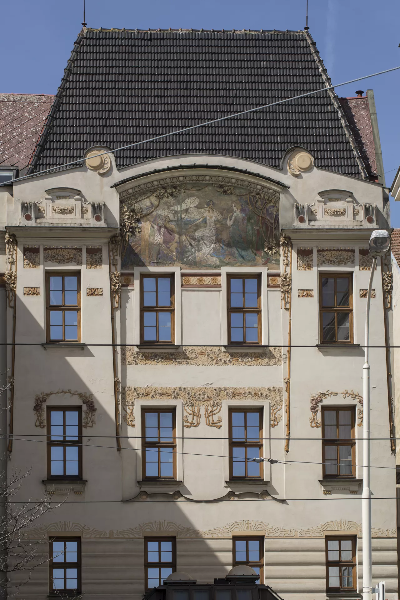 The Neo-Renaissance Grand Hotel was built in 1868–1870, originally as a four-storey apartment building. In 1874 it was converted into a 124-room hotel, conveniently located near the main railway station. The four-wing building surrounds two courtyards separated by a fifth wing. In 1895 the hotel was acquired by the Brno-based Siegl & Company. Its main partners were the Brno factory owners Anton I. Siegl and Arnold Grünfeld, and the other partners were Friedrich Wannieck, also a factory owner, and Arthur Crespin, a civil engineer from Paris. Crespin had initially purchased the hotel in 1877 along with the engineer and successful painter Franz von Felbinger, the son-in-law of the original owner, Josef Werner, and it was these two who gave the hotel the name Grand. In 1901, the Siegl company commissioned a four-storey extension the original building’s rear wing along Novobranská Street (though facing Benešova). The design was drawn up by architects Ernst Lindner and Theodor Schreier, who from 1897 to 1906 ran a joint studio in Vienna and who had both studied under Karel König at Vienna’s Technical University. In Brno, they had previously (in 1898) submitted a design for the Neo-Renaissance Moravian-Silesian Mutual Insurance Company on today’s náměstí Svobody. Although they did not win the contract, their participation in the tender may have given them some local exposure. A large salon on the addition’s ground floor initially housed a French restaurant. The upper floors of the triple-pile building had hotel rooms facing both streets. Since a renovation project in 19861988, there have been eight rooms on each floor, meaning 24 in total. The hotel’s current total capacity is 115 rooms. On the side facing Novobranská Street, the facade respects the Neo-Renaissance facade composition of the main building, while its southern elevation is structured in an organic Art Nouveau style whose five-bay facade is dominated by a four-bay avant-corps framed by conically shaped wall sections and accentuated by a tall hip roof. The stylized organic stuccowork, rendered in polychrome pastel colours, seems to grow from the facade while framing the painting of the Judgement of Paris on the gable, which is sheltered by a glass canopy. The author of the painting has yet to be determined. Although Linder and Schreier were not committed adherents of Art Nouveau, with this building they produced perhaps the most consistent work of organic Art Nouveau in Brno, a building with the vital focus typical of the early phase of the style and one to which the artists who created the paintings and stuccowork made a significant contribution. The authorship of these works was long unknown, with possible candidates being Hubert Gessner and even Josef Maria Olbrich. The issue was only resolved with the discovery of an article from the local Tagesbote newspaper. Period photographs preserved at the hotel show that metal and glass – a combination that further enhanced the building’s radical Art Nouveau character – were used to a greater extent than was previously known. The addition is set back deep from Benešova Street, as the space in front was occupied by a coach house (today, the Le Grand restaurant stands in its place). In order to facilitate passage from the street to the salon on the addition’s ground floor, a covered metal-frame passage – richly decorated with wrought-iron ornamentation and with a glass ceiling and wall similar to the canopy over the proscenium arch on the addition – was built along the side of the main hotel building. Stained glass on the walls was decorated with vegetal designs, which also adorned the borders of the glass ceiling. Older photographs show that the Art Nouveau facade has been altered and simplified over the years, and that it was once adorned with an inscription of the hotel’s name on the third-floor apron wall underneath the painting of the Judgement of Paris. Aleš Filip