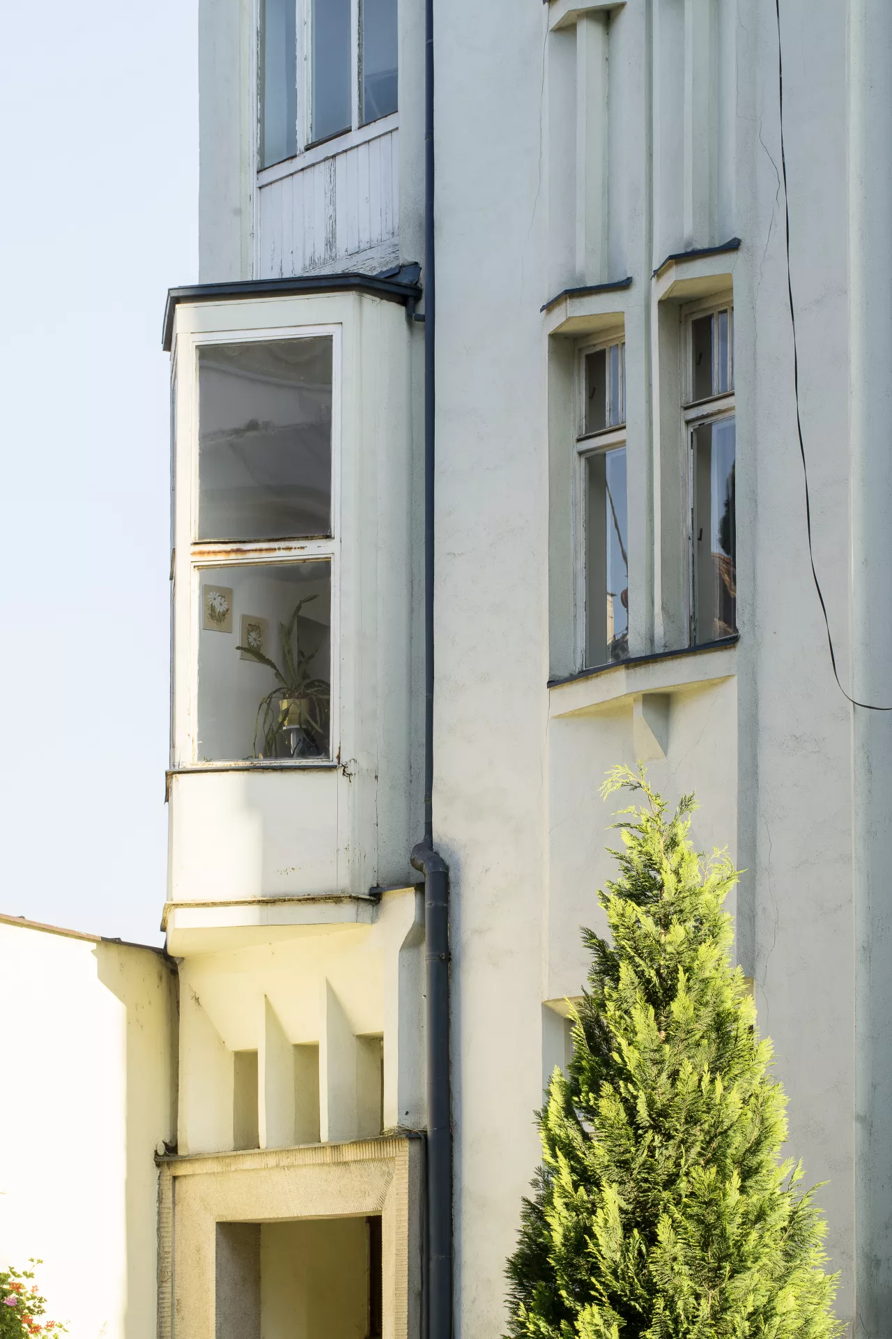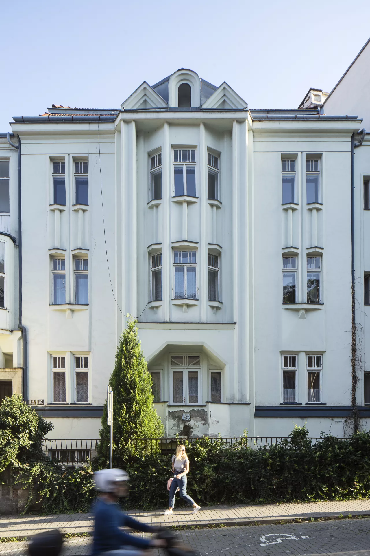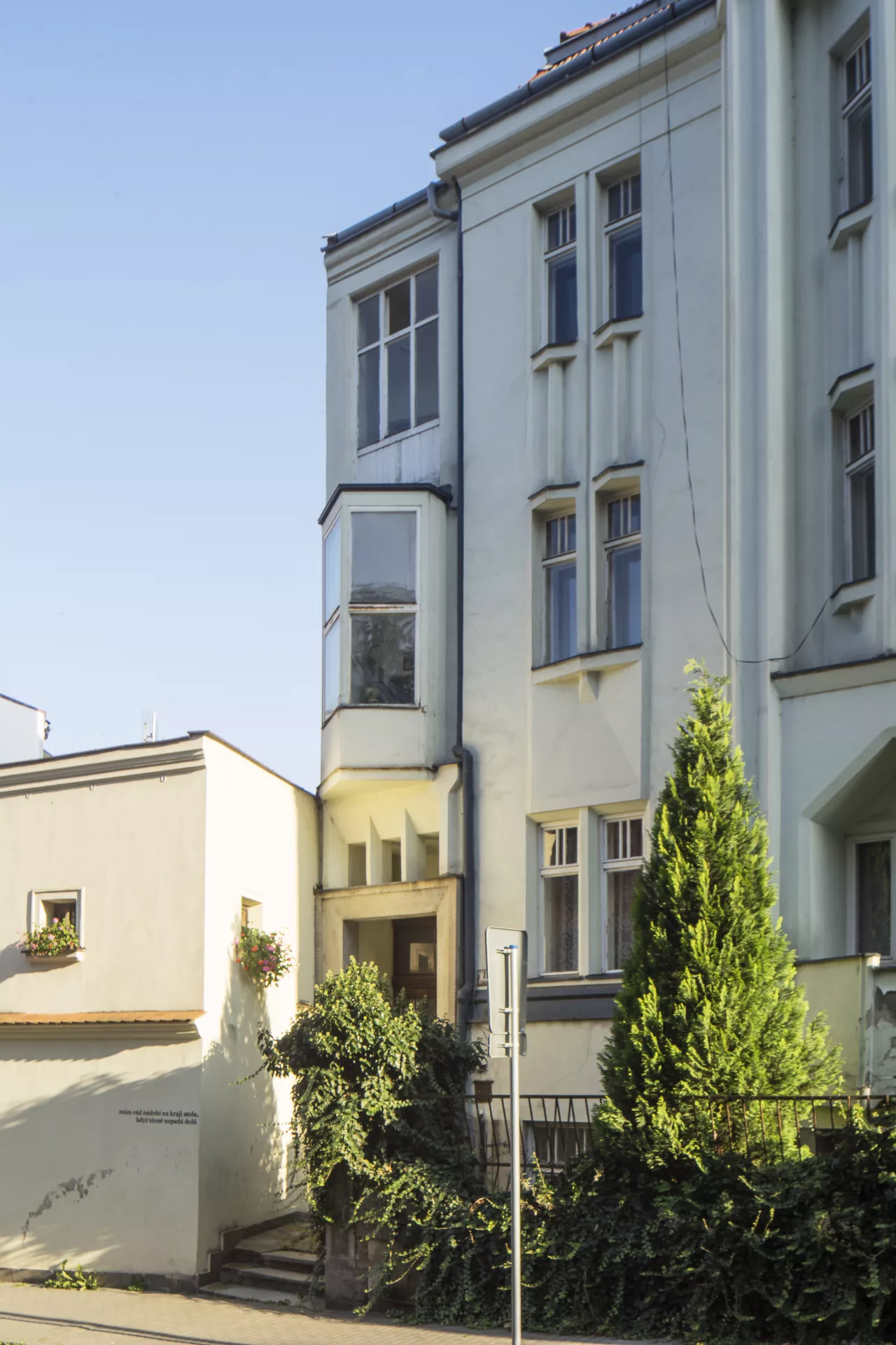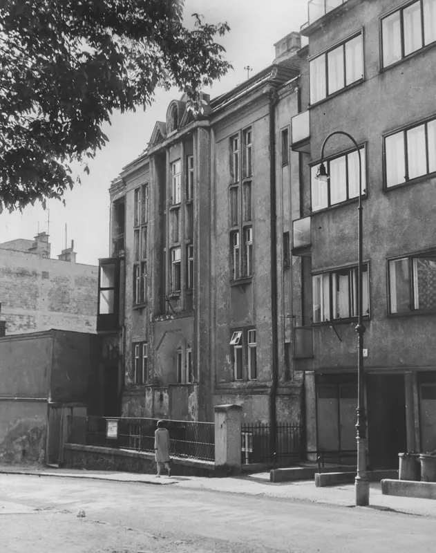 František Uherka (1880–1948) built this Cubist-influenced modernist apartment building in 1913–1914 on what was originally the backyard of Pekařská 28. That property was owned by Anna Jonášová, from whom the builder’s wife Marie Uherková bought the land in February 1912. Permission to build a new apartment building was granted in March 1913, and the building was completed in 1914. According to the 1921 census, the building was owned by Marie Uherková, and she and František occupied one of the units with their four children. In 1926 the house was acquired by Rudolf Ehrlich, and it remained in the possession of Rudolf and Ella Ehrlich until the Second World War. The distinctive design of the vertically composed facade is characterized by richly articulated volumes and the repeated use of sharply angled or crystal-like Cubist elements. The dominant feature of this dynamically composed facade is the central avant-corps flanked by two monumental pillars and topped by an ensemble of small gables of various shapes (arch, triangles, pentagon). Another noteworthy element is the building’s entrance, with its distinctive right-angled artificial stone portal, above which a trio of shard-like openings are framed by deep bevelled jambs. Above the entrance, a crystal-shaped bay window juts out sharply from the facade. Other Cubist architectural details include the sharp-angled windowsills atop crystal-like consoles. The building’s progressively modernist design hints at inspiration from the Cubist architecture of Prague, although the Cubist motifs used here are more like references without any deeper connections – used essentially as one possible type of décor. The result is nevertheless a remarkable Cubistic building, a unique ‘crystalline jewel’ of Brno’s historical architecture. Like its neighbours, the building is set into a slope. As a result, it has two basement floors with apartments, a raised ground floor, two floors above that and an attic. A staircase inside the main entrance vertically connects the various floors. Many of the original interior elements have been preserved, including the terrazzo staircase with its modernist handrail, the black and white wall tiles, the black and white floor tiles with a geometric pattern and the doors to the apartments. Pavla Cenková