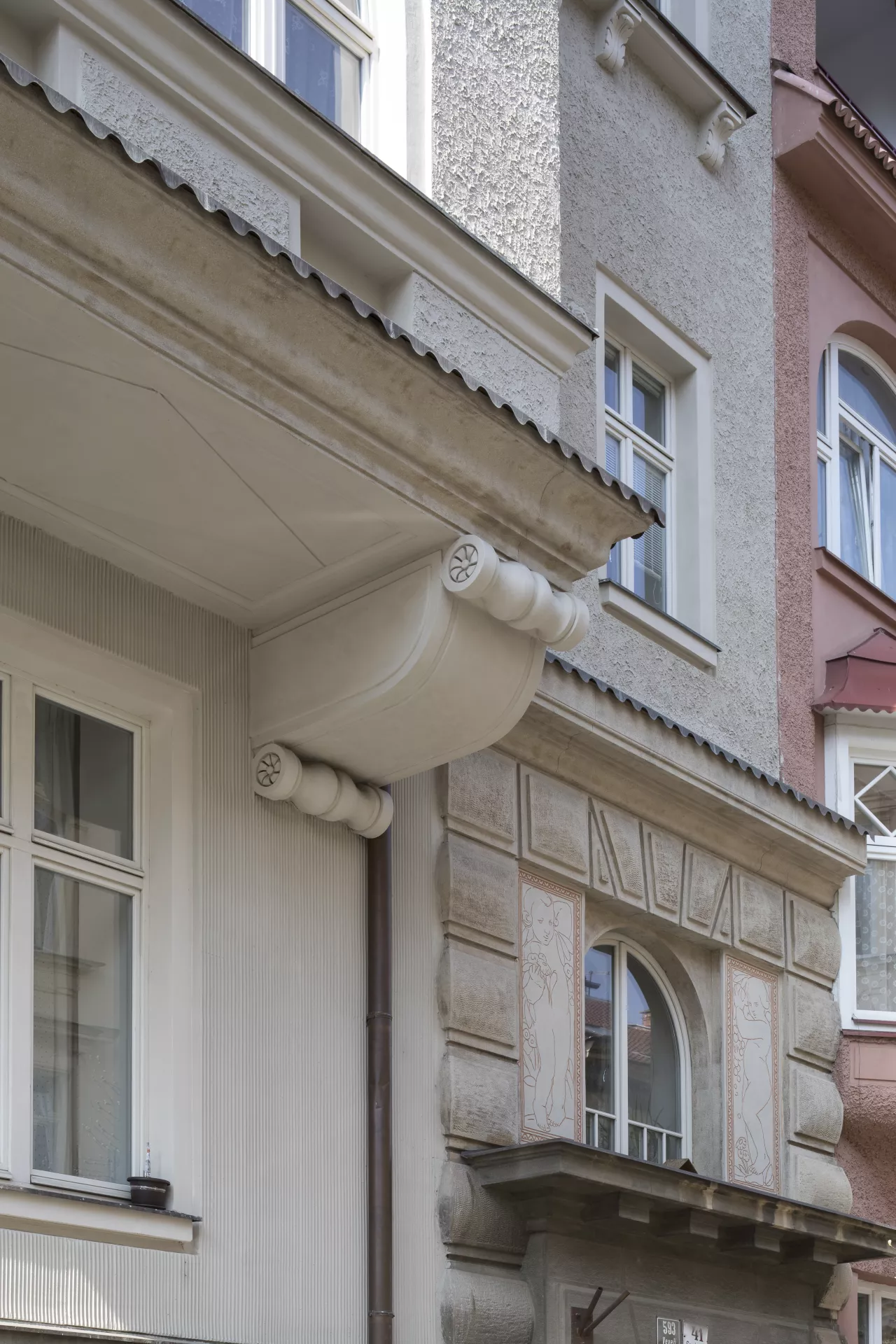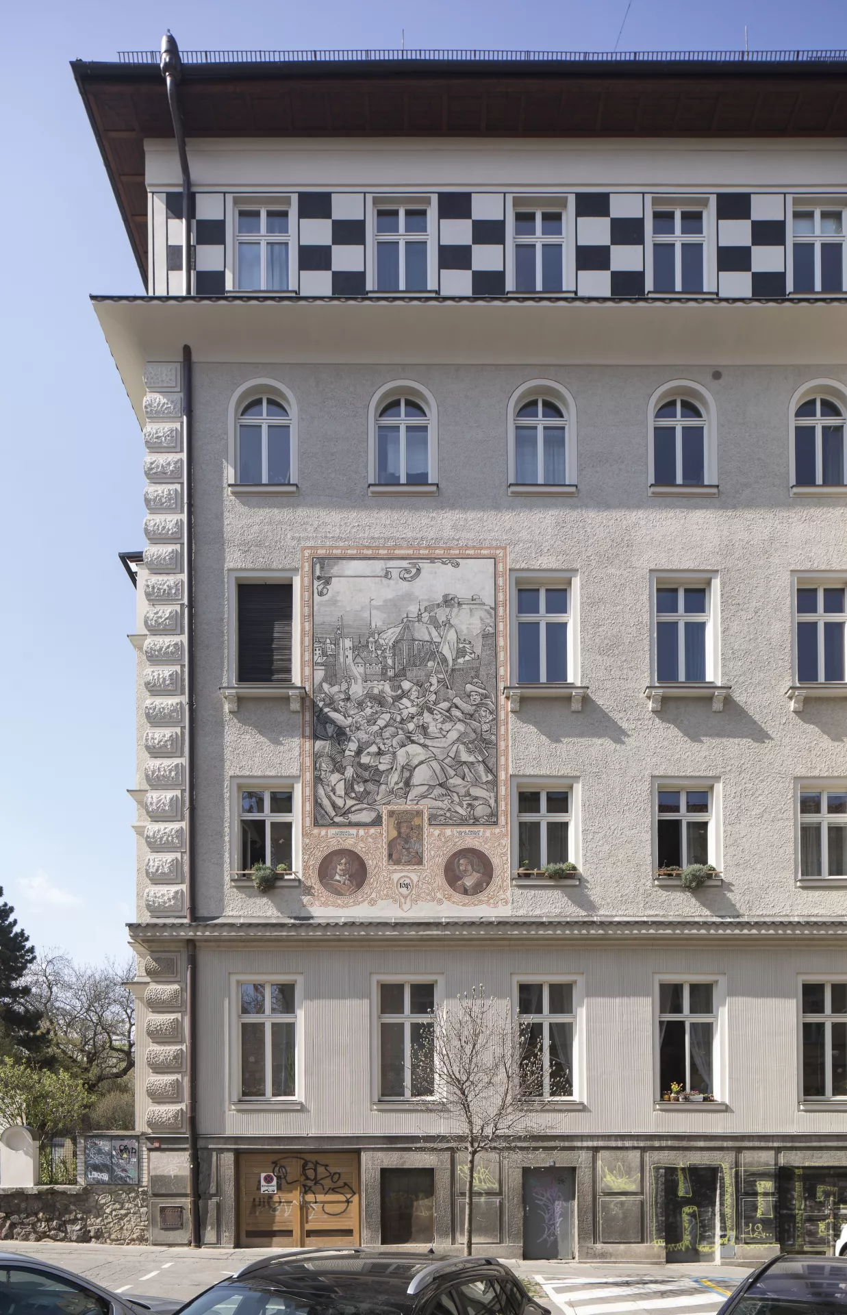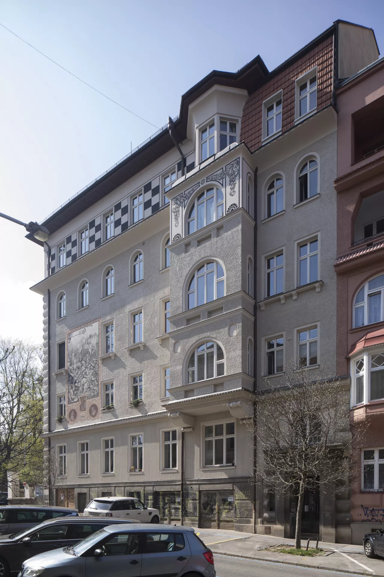 In 1910–1911, the German builder Friedrich Wilhelm (‘Fritz’) Schmeer teamed up with the Czech architect Vladimír Fischer to build up the entire odd-numbered side of Smetanova Street between Botanická and Cihlářská Streets. Schmeer and Fischer jointly built more than three dozen apartment buildings throughout Brno, but this group is the most splendid of them all. Of these five buildings, the Swedish House (Smetanova 41 / Botanická 4) is the most compact because of its corner location. It nevertheless boasts visually interesting elements such as a three-storey oriel and, on the side facing Botanická Street and Tyrš Park, a four-storey four-bay arcade loggia with half-timbered ceilings reminiscent of the courtyards of Renaissance chateaus or the architecture of the great spa towns (the ceiling of the top-most loggia is made of glass). On the building’s corner, a large area spanning two storeys was set aside for sgraffito by the painter Jano Köhler. Done in the style of a print from the Thirty Years’ War, it depicts the last Swedish attempt to storm Brno on 15 August 1645. The city’s successful defence was considered a miracle and is seen as the most important event in its history. The colourful sgraffito decoration that frames this scene includes portrait medallions of both sides’ main commanders and also depicts the Brno Palladium – an image of the Madonna of St. Thomas. Smaller ornamental sgraffito by the same artist decorates other parts of the facade, thus softening the building’s monumentality arising from the massive bossage on the corner and around the main entrance. The Swedish House’s unostentatious and straightforward character corresponding to late geometric Art Nouveau – the so-called ‘1910 style’ – is reflected in the variously textured plaster, the picturesque contours of the chimneys, the use of various playful details and the top floor’s modern visual design, including the black-and-white chequerboard pattern that brings to mind the Vienna Secession buildings of Josef Hoffmann. Schmeer chose the house, which dominates the south-western corner of the block, as his residence and lived there until his death in 1941. He and his family occupied a 14-room apartment on the raised ground floor. Of his original wood-panelled parlour with stained-glass windows, the ceiling panelling has survived. His construction company was headquartered in the building as well, and his two daughters received upstairs apartments as a dowry. The house featured various modern comforts, including one of the first passenger lifts in Brno. The neighbouring building at Botanická 6 (built in 1935 according to plans by Otto Eisler) stands in what was originally the Swedish House’s garden, where one would have encountered two stone sculptures by Ferdinand Winkler of Vienna (who also did the bronze statue of Fortuna in the parlour). The building’s opulent character is still evident in the common areas: the entrance hall is clad in stone and decorated with stuccowork, the staircase has Art Nouveau balustrades, and the landings are decorated with stained-glass windows. In 2016–2018, the building’s exterior was sensitively repaired and Köhler’s sgraffito restored to its original glory. The neighbouring building at Smetanova 43 is decorated with a relief depicting the Madonna with child. Its four-bay facade is topped by a tall gable roof that transitions on either side into horizontal cornices. The outer window bays work with the contrast between protruding oriels on the first floor and recessed balconies hidden behind simple ‘frames’ on the third and fourth floors. Number 45 has a six-bay main elevation topped by a pair of Neo-Baroque gables. It, too, works with the contrast between oriels and balconies, this time on the horizontal level. In placing the rectangular oriels, Fischer deliberately ignored patterns of symmetry, with one oriel spanning the first to the third floor, while the other is present only on the third floor. The centrally placed entryway is flanked by pylons with reliefs of one wise and one foolish virgin from the Parable of the Ten Virgins (Matthew 25:1–13) on the level of the fanlight. Smetanova 47 has a five-bay facade with a centrally placed entryway, an oriel on the second and third floors and a roof gable. Here, too, the main portal features sculptural decoration: a naked, huddled boy and girl above the overhang and an eagle and a basilisk below. Except for the central axis, all the windows were set back on covered balconies, some of which have been enclosed in glass over the years. The corner building at no. 49 has nine window bays and two asymmetrical triple-bay oriels on each side, plus one more column of windows on the bevelled corner. All four oriels are decorated with figural reliefs of women’s heads. In designing all five houses, Fischer and Schmeer applied elements of both historicist and modern architecture while deliberately and convincingly working with the contrast between the two. The facades make use of variously textured plaster, and each building is of a different colour: reddish-grey, ochre, green and greyish-green. With its grooved plaster facade on the ground floor and the use of metal (on the portal) and wood (on the balcony railings), no. 47 comes closest to geometric Art Nouveau, while the upper part of no. 43 possesses a certain modernist austerity. The authorship of the above-described, relatively diverse reliefs remains unresolved. Although it is known that the Vienna sculptor Ferdinand Winkler worked on the Swedish House, there is little evidence to ascribe these works to his hand. Like the street-facing elevations, the facades on the buildings’ courtyard side were articulated into various fields and volumes as well, thus eliminating the need for light shafts. Much attention was also paid to decorating the corridors and stairways. In no. 47, for instance, the entrance hall features decorative stuccowork