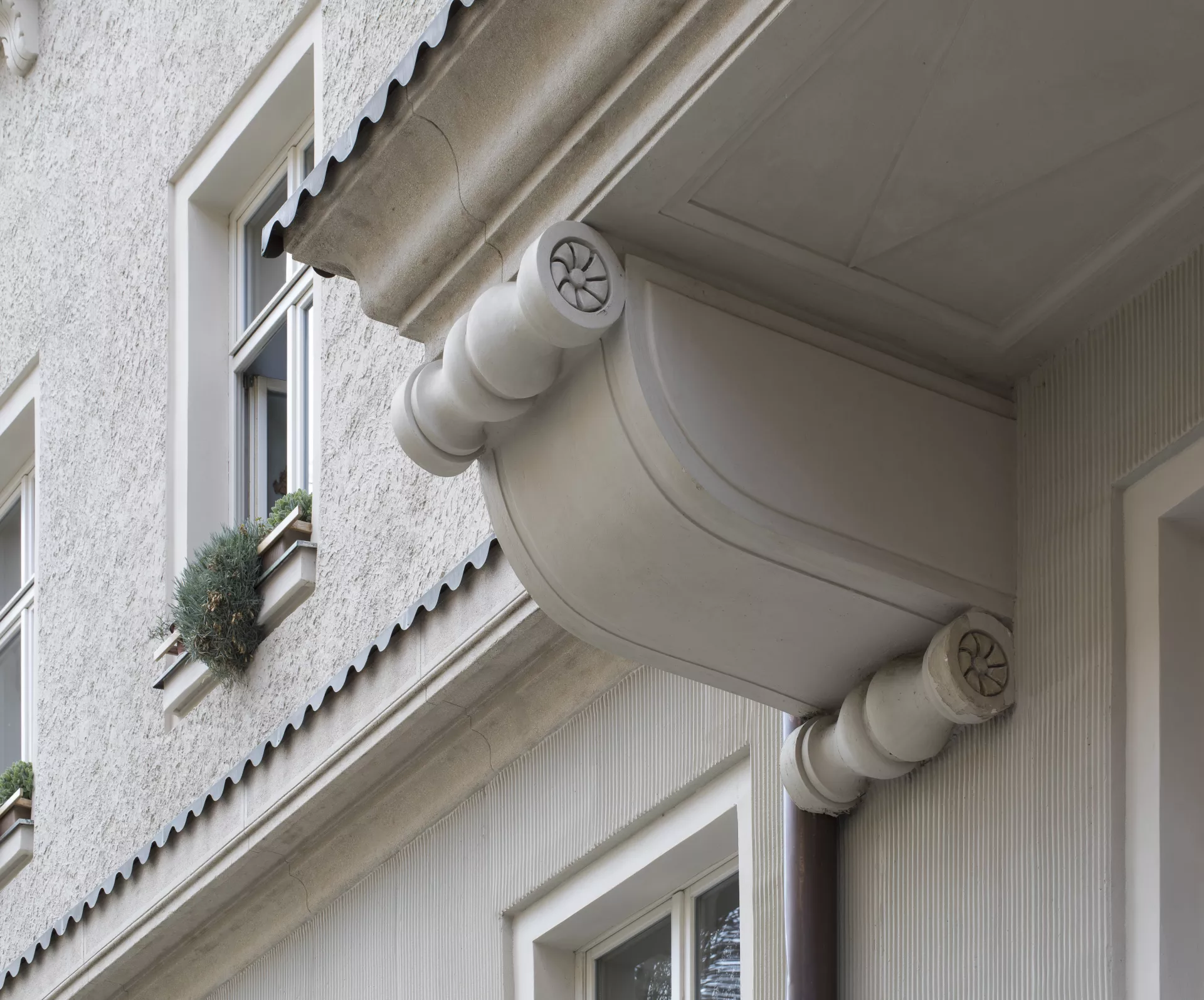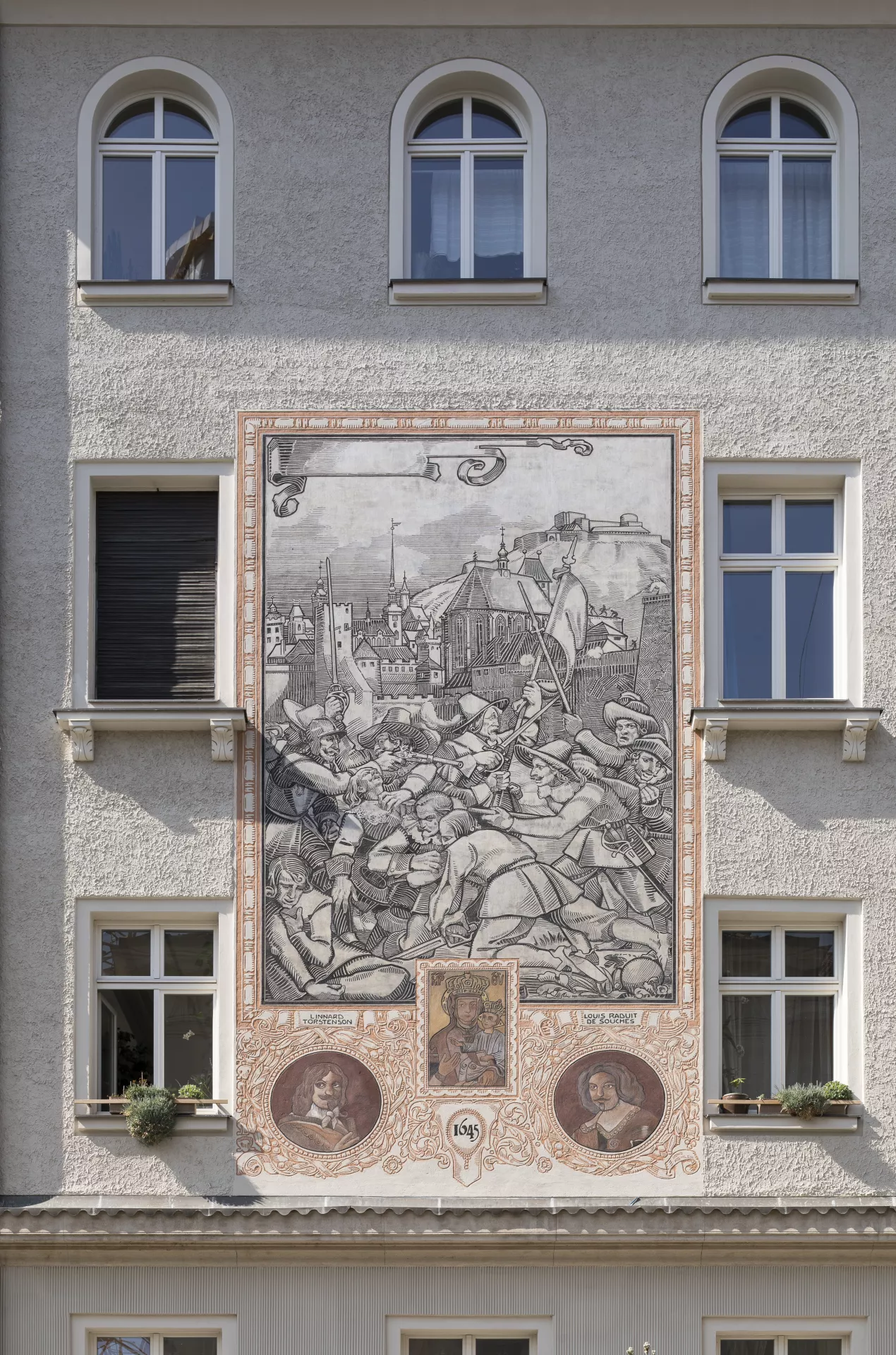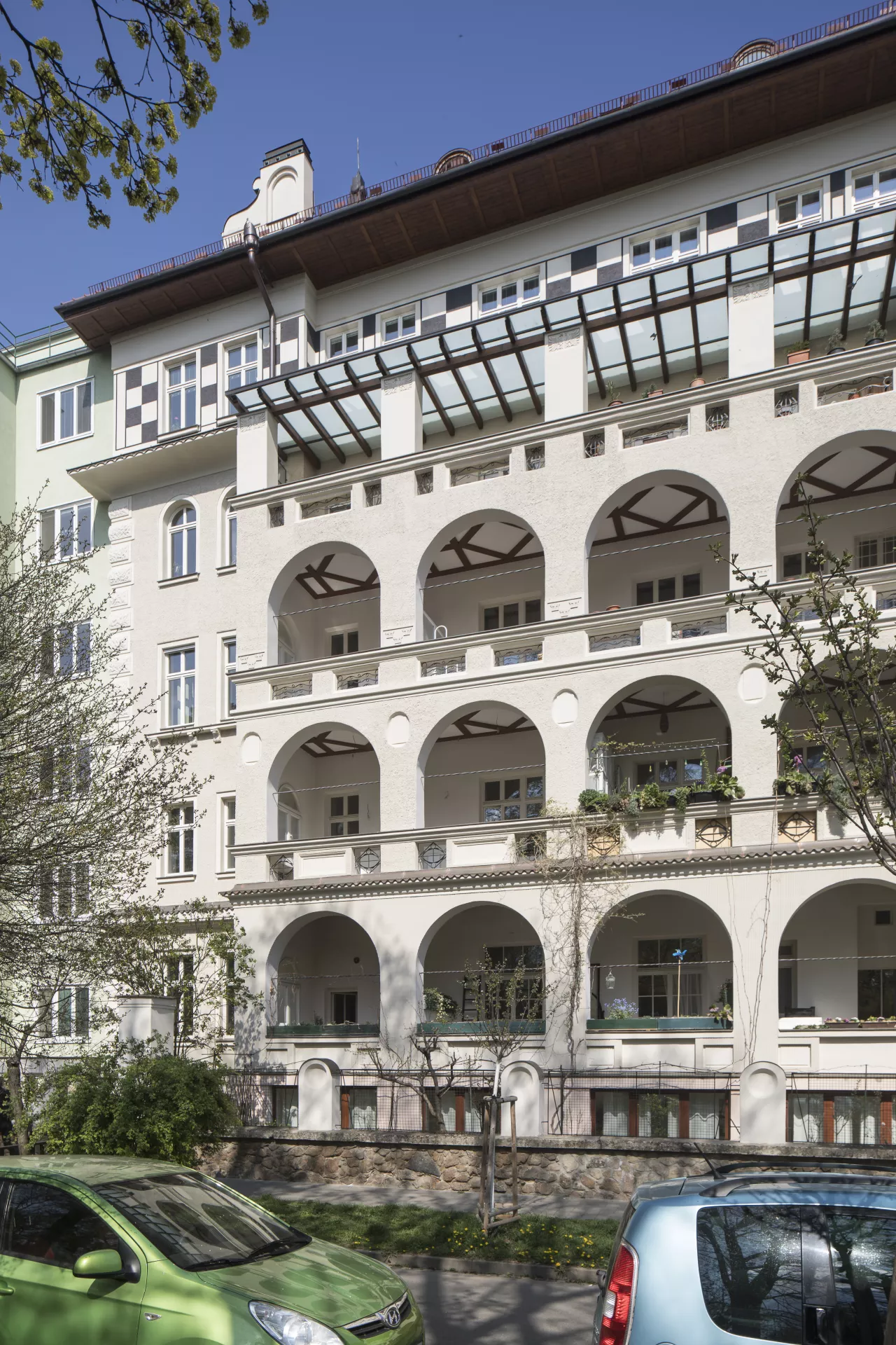 In 1910–1911, the German builder Friedrich Wilhelm (‘Fritz’) Schmeer teamed up with the Czech architect Vladimír Fischer to build up the entire odd-numbered side of Smetanova Street between Botanická and Cihlářská Streets. Schmeer and Fischer jointly built more than three dozen apartment buildings throughout Brno, but this group is the most splendid of them all. Of these five buildings, the Swedish House (Smetanova 41 / Botanická 4) is the most compact because of its corner location. It nevertheless boasts visually interesting elements such as a three-storey oriel and, on the side facing Botanická Street and Tyrš Park, a four-storey four-bay arcade loggia with half-timbered ceilings reminiscent of the courtyards of Renaissance chateaus or the architecture of the great spa towns (the ceiling of the top-most loggia is made of glass). On the building’s corner, a large area spanning two storeys was set aside for sgraffito by the painter Jano Köhler. Done in the style of a print from the Thirty Years’ War, it depicts the last Swedish attempt to storm Brno on 15 August 1645. The city’s successful defence was considered a miracle and is seen as the most important event in its history. The colourful sgraffito decoration that frames this scene includes portrait medallions of both sides’ main commanders and also depicts the Brno Palladium – an image of the Madonna of St. Thomas. Smaller ornamental sgraffito by the same artist decorates other parts of the facade, thus softening the building’s monumentality arising from the massive bossage on the corner and around the main entrance. The Swedish House’s unostentatious and straightforward character corresponding to late geometric Art Nouveau – the so-called ‘1910 style’ – is reflected in the variously textured plaster, the picturesque contours of the chimneys, the use of various playful details and the top floor’s modern visual design, including the black-and-white chequerboard pattern that brings to mind the Vienna Secession buildings of Josef Hoffmann. Schmeer chose the house, which dominates the south-western corner of the block, as his residence and lived there until his death in 1941. He and his family occupied a 14-room apartment on the raised ground floor. Of his original wood-panelled parlour with stained-glass windows, the ceiling panelling has survived. His construction company was headquartered in the building as well, and his two daughters received upstairs apartments as a dowry. The house featured various modern comforts, including one of the first passenger lifts in Brno. The neighbouring building at Botanická 6 (built in 1935 according to plans by Otto Eisler) stands in what was originally the Swedish House’s garden, where one would have encountered two stone sculptures by Ferdinand Winkler of Vienna (who also did the bronze statue of Fortuna in the parlour). The building’s opulent character is still evident in the common areas: the entrance hall is clad in stone and decorated with stuccowork, the staircase has Art Nouveau balustrades, and the landings are decorated with stained-glass windows. In 2016–2018, the building’s exterior was sensitively repaired and Köhler’s sgraffito restored to its original glory. The neighbouring building at Smetanova 43 is decorated with a relief depicting the Madonna with child. Its four-bay facade is topped by a tall gable roof that transitions on either side into horizontal cornices. The outer window bays work with the contrast between protruding oriels on the first floor and recessed balconies hidden behind simple ‘frames’ on the third and fourth floors. Number 45 has a six-bay main elevation topped by a pair of Neo-Baroque gables. It, too, works with the contrast between oriels and balconies, this time on the horizontal level. In placing the rectangular oriels, Fischer deliberately ignored patterns of symmetry, with one oriel spanning the first to the third floor, while the other is present only on the third floor. The centrally placed entryway is flanked by pylons with reliefs of one wise and one foolish virgin from the Parable of the Ten Virgins (Matthew 25:1–13) on the level of the fanlight. Smetanova 47 has a five-bay facade with a centrally placed entryway, an oriel on the second and third floors and a roof gable. Here, too, the main portal features sculptural decoration: a naked, huddled boy and girl above the overhang and an eagle and a basilisk below. Except for the central axis, all the windows were set back on covered balconies, some of which have been enclosed in glass over the years. The corner building at no. 49 has nine window bays and two asymmetrical triple-bay oriels on each side, plus one more column of windows on the bevelled corner. All four oriels are decorated with figural reliefs of women’s heads. In designing all five houses, Fischer and Schmeer applied elements of both historicist and modern architecture while deliberately and convincingly working with the contrast between the two. The facades make use of variously textured plaster, and each building is of a different colour: reddish-grey, ochre, green and greyish-green. With its grooved plaster facade on the ground floor and the use of metal (on the portal) and wood (on the balcony railings), no. 47 comes closest to geometric Art Nouveau, while the upper part of no. 43 possesses a certain modernist austerity. The authorship of the above-described, relatively diverse reliefs remains unresolved. Although it is known that the Vienna sculptor Ferdinand Winkler worked on the Swedish House, there is little evidence to ascribe these works to his hand. Like the street-facing elevations, the facades on the buildings’ courtyard side were articulated into various fields and volumes as well, thus eliminating the need for light shafts. Much attention was also paid to decorating the corridors and stairways. In no. 47, for instance, the entrance hall features decorative stuccowork