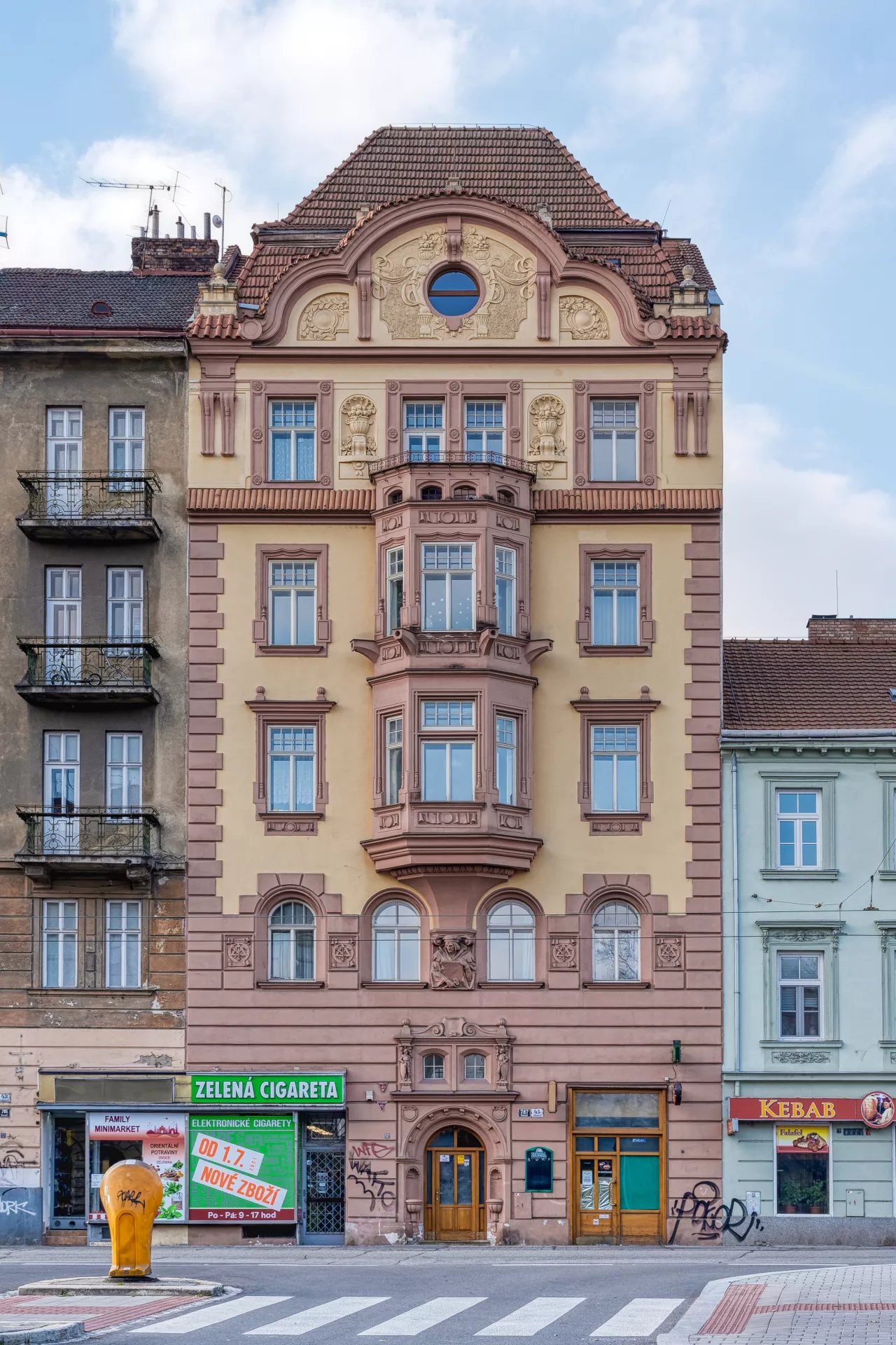 In 1904–1906, the vast area between Lidická, Smetanova and Cihlářská Streets saw extensive redevelopment, with a new block of multi-storey apartment buildings erected on the site of older residential housing. It was the first major project realized by the important Brno builder Friedrich Wilhelm Schmeer, who spent most of his career working closely with the architect Vladimír Fischer. Schmeer’s building company created the technical plans and layouts for the houses, while the facade designs were mainly Fischer’s work, and the final shape of the buildings was the result of cooperation between the two. In 1905, Schmeer significantly remodelled the apartment building at Lidická 45 on the western street front opposite Lužánky Park. He owned the building from 1905 to 1911, and during this time the offices of his construction company were housed in it as well. The facade is even decorated with symbols of the builders’ guild and a bust of Brno’s most famous Late Gothic builder, Anton Pilgram. In 1911, the building was acquired by Anna Popper, who sold it to Maria, Rudolf and Oskar Charvát in 1924. The eclectic architecture of the elaborately composed facade loosely works with various historicist forms, combining them into an original, distinctly romantic whole. The rich figural and ornamental decoration draws its motifs mainly from the Late Gothic and Renaissance eras. The monumental verticality of the four-storey building’s triple-bay facade is further emphasized by the central three-sided oriel and the vertical lines of quoins on the second and third floors. The ‘heavy’ ground floor area is covered in banded rustication, and the facade is topped by a Baroque gable whose surface is covered by fine stucco décor with motifs of flowers and vases in the Louis XVI style, which are also repeated in the niches between the windows of the top floor. The large rectangular windows are framed by variously shaped chambranles (a different shape on each floor) that reference Renaissance and Late Gothic motifs of intersecting rods and drapery arches. The dominant oriel with Late Gothic waterspouts sits atop a massive Gothic corbel decorated with the half-figure of a Gothic builder, perhaps Master Anton Pilgram. The corbel sits between four square fields with relief images of construction-related symbols. The centrally located entrance is framed by an eclectic portal, above which is a fanlight flanked by figures of knights in armour – a historicist reference to the figures from Pilgram’s portal on Brno’s Old Town Hall. We may consider the possibility that Schmeer was consciously referencing the legacy of this famous builder from the Late Middle Ages. One thing that is without a doubt, however, is that despite the demanding task of combining a large number of references to the past, the result is a surprisingly coherent and visually impressive work of architecture. The appearance of the otherwise well-preserved building has been somewhat degraded by insensitive alterations to the commercial premises on the ground floor. Pavla Cenková