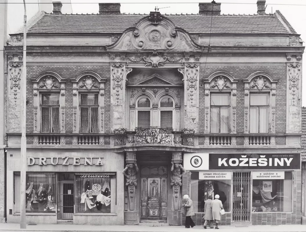 Around 1900, Královo Pole was a rapidly developing independent municipality with lively construction activity. Its general prosperity was reflected in its ceremonial elevation to the status of a city in 1905. In 1885–1907, the so-called ‘new quarter’ was built in Královo Pole, encompassing the parallel streets today called Dobrovského, Jungmannova, Vackova and Svatopluka Čecha, bisected by the perpendicular Slovinská Street. The neighbourhood is characterized by an ensemble of similarly designed residential buildings done in a late historicist style. Their defining feature is the combination of fair-faced bricks with stucco décor, mostly Neo-Baroque in character. Slightly younger, similarly crafted brick-stucco facades that combine a Neo-Baroque or vernacular style with Art Nouveau details can be found on Jungmannova and Riegrova Streets. One local example of this distinctive type of late historicist architecture is Jakub Svoboda’s grand, intricately designed house on Palackého Avenue, dated ‘1904’ above the entrance. The five-bay main elevation is accentuated by a massive centrally placed portal flanked by Atlases holding up a loggia-style terrace. Along with the opulent decorativeness of late historicist (mostly Neo-Baroque) architecture, the intent of this ‘noble form’ was to emphasize the owner’s importance. The facade combines the smooth surfaces of the fair-faced bricks with decorative plaster forms. The rich, almost exaggerated décor is characterized by a Neo-Baroque ornamental apparatus. The central avant-corps with the portal and loggia is crowned by a Baroque volute gable bearing the owner’s initials JS (Jakub Svoboda) in a circular recess. The original formal elements have been preserved on the first-floor facade, while the commercial ground floor has been significantly altered and degraded by the ‘visual pollution’ of modern shop signs. Pavla Cenková