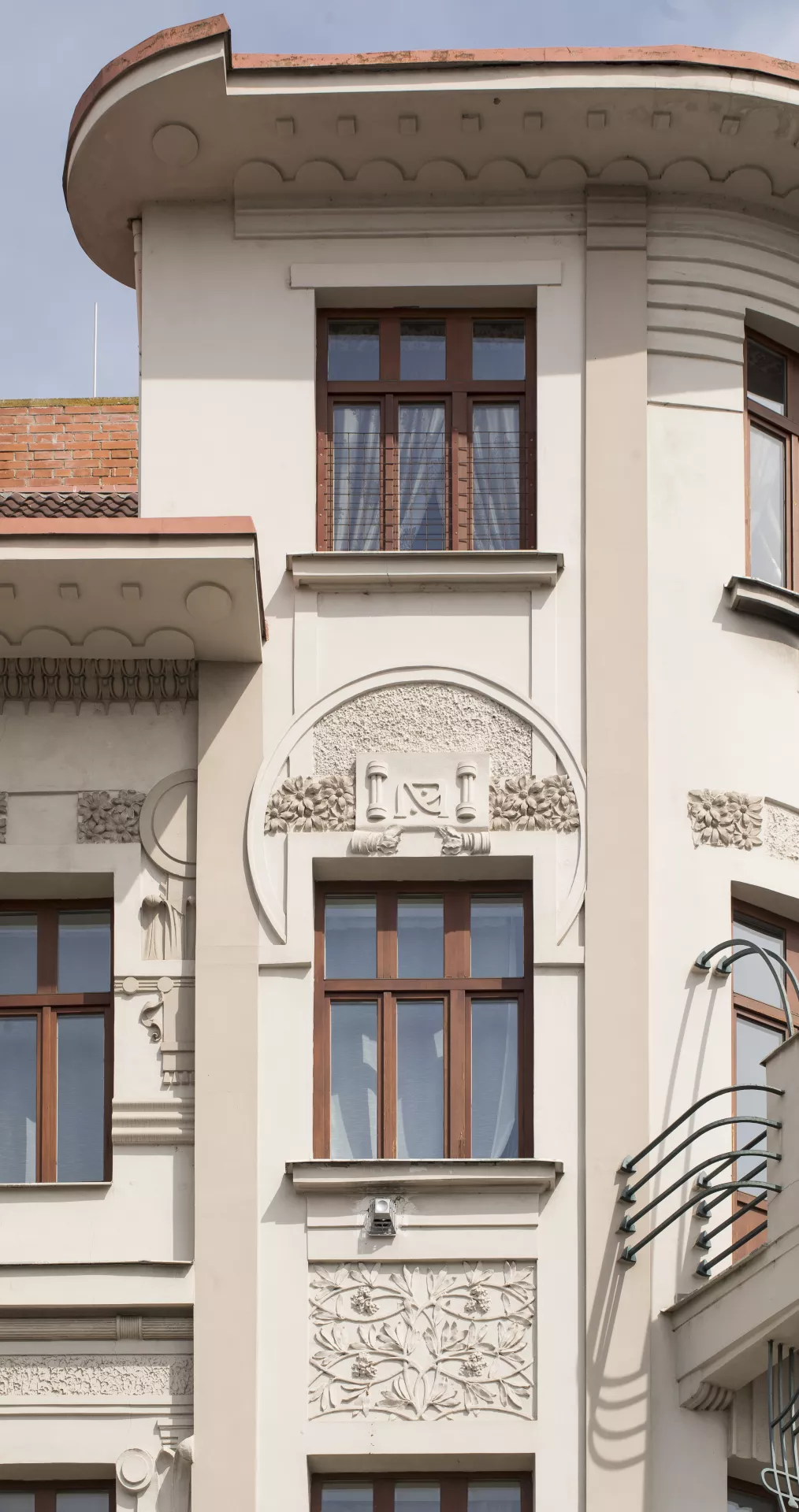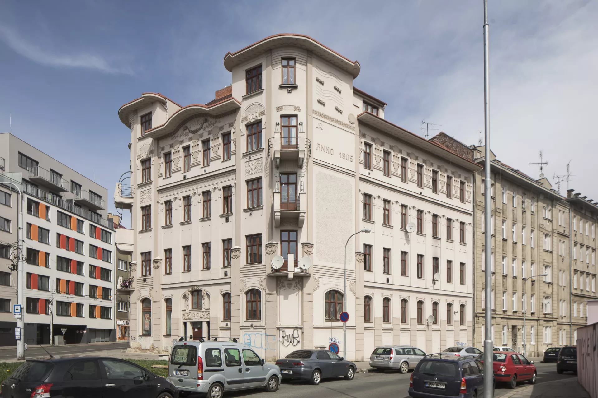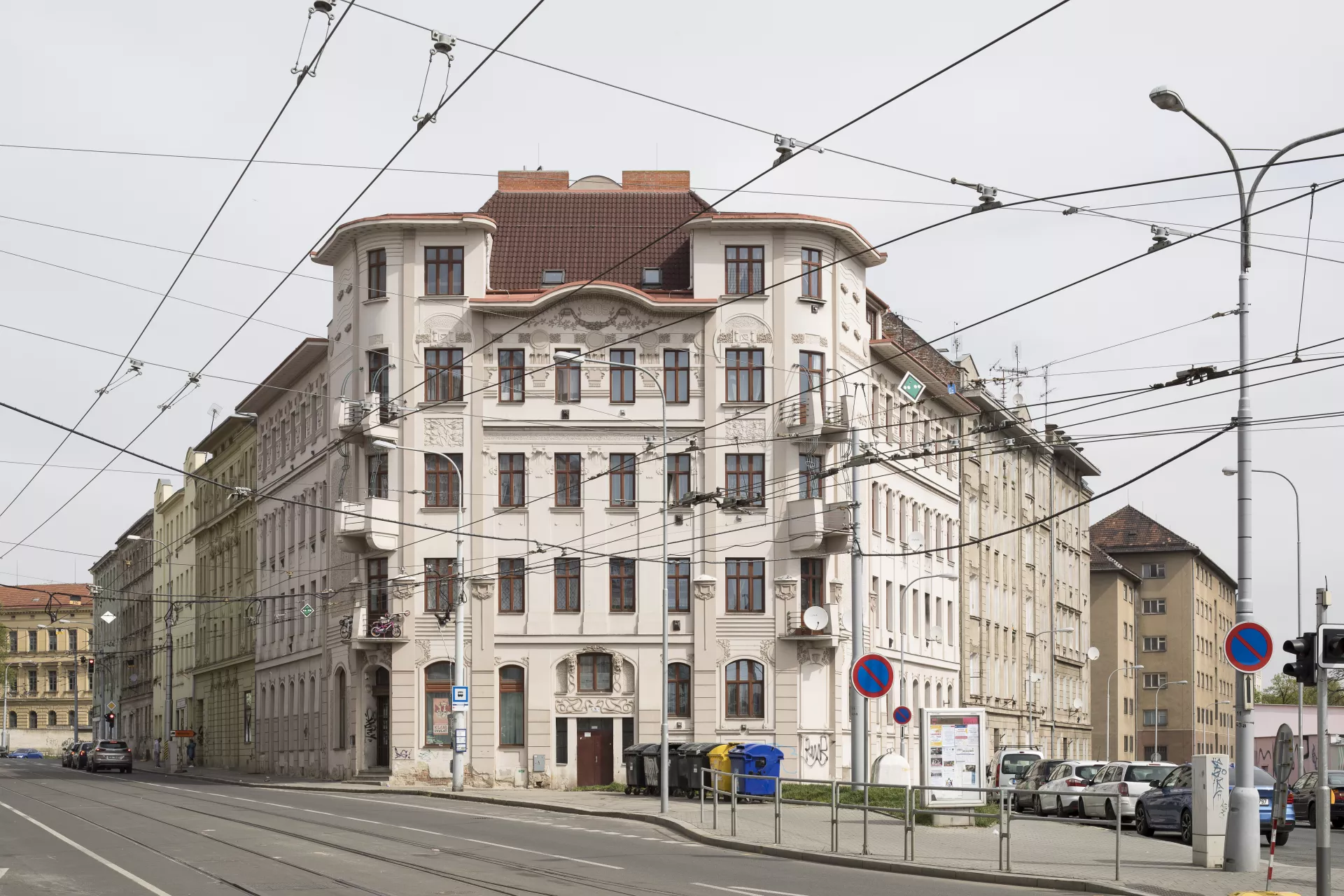 This architecturally and urbanistically distinctive massive corner building is one of Brno’s most valuable Art Nouveau monuments. It was built in 1905 by Franz Gokorsch (1866‒1930), a builder originally from Šternberk who over the following years built several more houses near the intersection of Francouzská, Vranovská and Cejl Streets, such as the neighbouring buildings at Vranovská 6 and Jana Svobody 3‒5 (1909‒1910) and the apartment buildings at Francouzská 105 and Francouzská 107 ‒ Vranovská 1 (1911). The large apartment building sits at the triangular intersection where an important thoroughfare, Cejl, splits into Vranovská and Jana Svobody Streets, and it was designed so that its corner facing Cejl would stand out. The shape of the corner was probably inspired by Antonín Blažek’s famous Slavia Hotel, built by Antonín Müller in 1903. The four- to five-storey building on a trapezoidal ground plan has three eight-bay elevations topped by a cantilevered cornice with a decorated soffit and an arched segment on the main elevation facing Cejl. The rounded corner towers have three window bays each, with a trio of diagonally protruding balconies bounded by Art Nouveau railings. The ground floor is visually accentuated by the use of banded rustication and arched windows. The windows on the upper floors are rectangular. A giant Ionic pilaster order runs along the first and second floors on the central part of all three elevations. The facades are characterized by rich and variegated late Art Nouveau décor that playfully combines the freedom of the style’s floral tendencies with the rigor of the geometric Secession. With the free-spirited opulence of its ornamentation, the house – which can be ranked among numerous other local buildings done in the late Art Nouveau style – manifests a stylistic rejection of restrained approaches that are sparser in their decoration. The number of facade elements and the amount of ornamentation increases with height, culminating on the upper floors in circular reliefs, festoons and ribbons, areas of intertwining foliage, etc. The main entrance in the middle of the main elevation is framed by an Art Nouveau portal decorated with a pair female mascarons – mythical Medusa heads with twisted braids of snakes. The same theme can be found, among other places, on the facade of F. W. Schmeer’s 1905 building at Smetanova 53 (B121), which was designed by Vladimír Fischer. The building’s overall design involves a visually impressive distribution of volumes and a certain tension between static and dynamic elements. The opulent Art Nouveau forms on the flat surfaces of the facade and on the building’s lower parts, which evoke a sense of solidity and sturdiness, are complemented by the dynamic elements of the balconies, the rounded bevelled corner towers and the extravagantly overhanging cornices. A similar approach can be found in the stucco décor, where the strict order of the geometric forms alternates with an ornamental diversity of shapes and motifs, with a particular focus on various intertwining forms. In terms of function, the building provided a large number of small rented apartments, with pawlatsch-style galleries skilfully built onto the rear of the building facing the narrow trapezoidal courtyard. A restaurant on the ground-floor space along Vranovská Street had its entrance on the corner. The building was acquired by Jindřich and Gisela Weinberg in 1928, and in 1945 it housed state administrative offices. In the 1950s, the former restaurant premises were used for after-school programmes; after undergoing renovations, it re-opened in 1967 as the Na Vranovské restaurant. Today, the space houses the Pavlač drop-in centre. Thanks to a recent renovation, the Art Nouveau décor stands out once again. Pavla Cenková