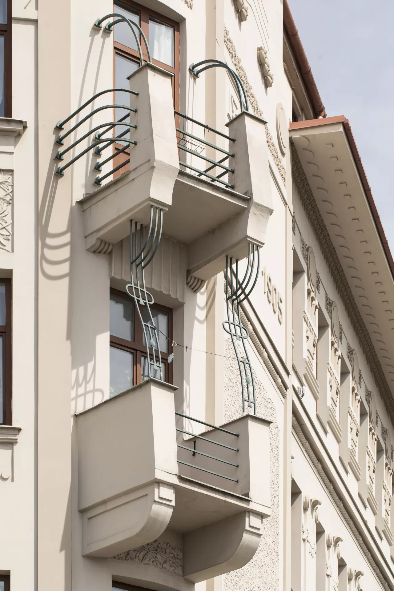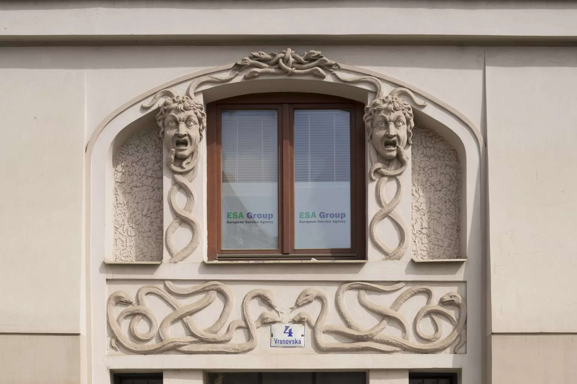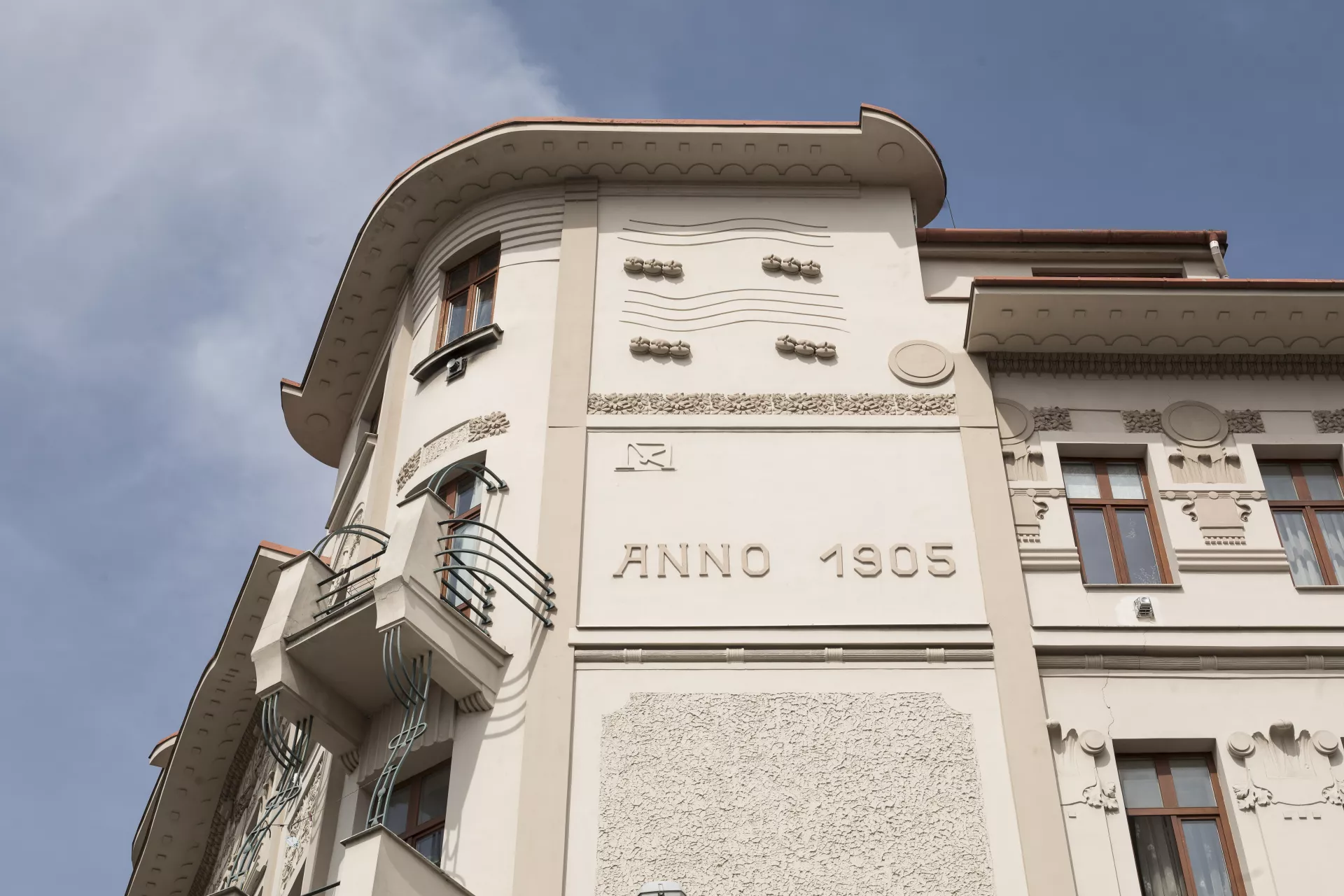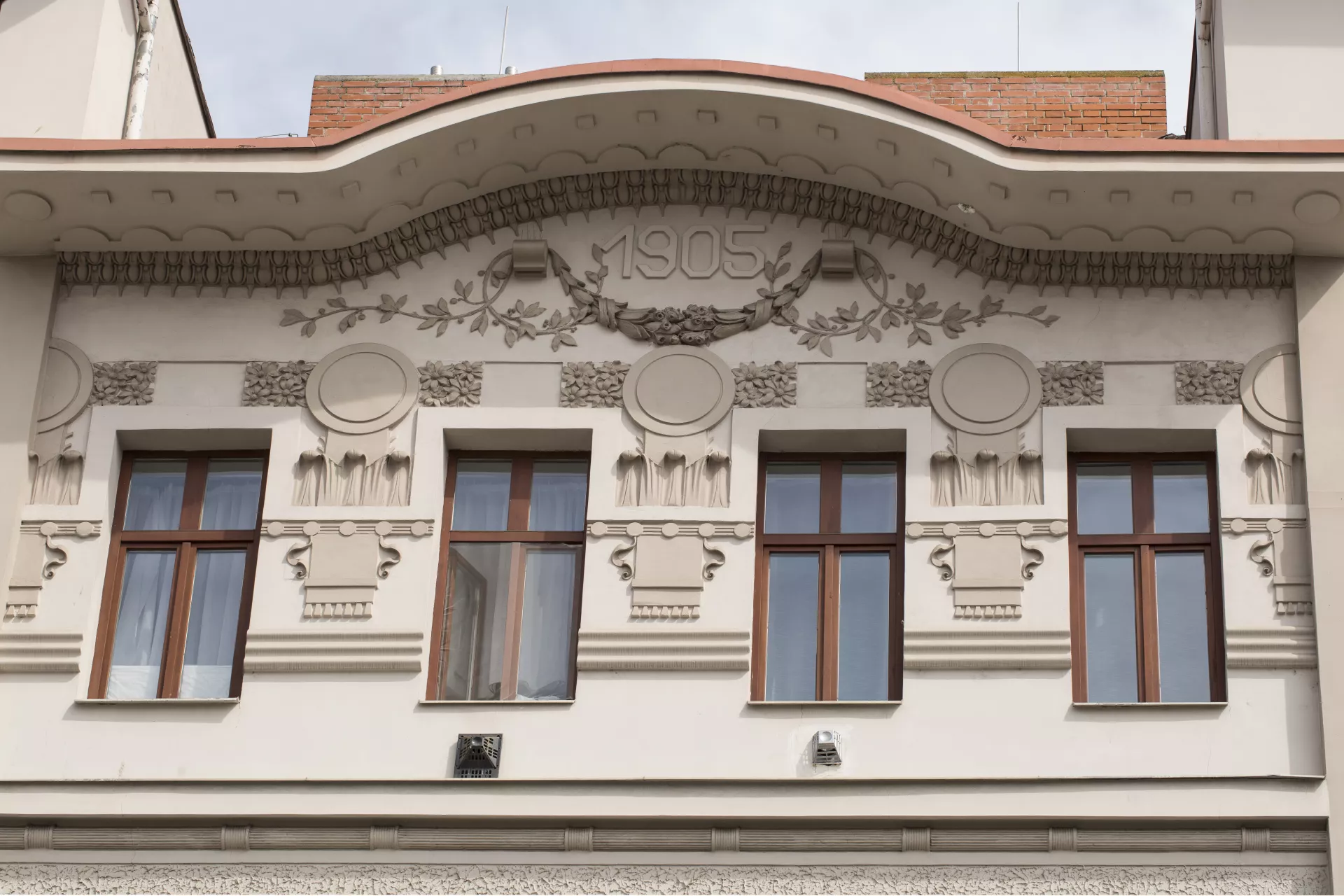 This architecturally and urbanistically distinctive massive corner building is one of Brno’s most valuable Art Nouveau monuments. It was built in 1905 by Franz Gokorsch (1866‒1930), a builder originally from Šternberk who over the following years built several more houses near the intersection of Francouzská, Vranovská and Cejl Streets, such as the neighbouring buildings at Vranovská 6 and Jana Svobody 3‒5 (1909‒1910) and the apartment buildings at Francouzská 105 and Francouzská 107 ‒ Vranovská 1 (1911). The large apartment building sits at the triangular intersection where an important thoroughfare, Cejl, splits into Vranovská and Jana Svobody Streets, and it was designed so that its corner facing Cejl would stand out. The shape of the corner was probably inspired by Antonín Blažek’s famous Slavia Hotel, built by Antonín Müller in 1903. The four- to five-storey building on a trapezoidal ground plan has three eight-bay elevations topped by a cantilevered cornice with a decorated soffit and an arched segment on the main elevation facing Cejl. The rounded corner towers have three window bays each, with a trio of diagonally protruding balconies bounded by Art Nouveau railings. The ground floor is visually accentuated by the use of banded rustication and arched windows. The windows on the upper floors are rectangular. A giant Ionic pilaster order runs along the first and second floors on the central part of all three elevations. The facades are characterized by rich and variegated late Art Nouveau décor that playfully combines the freedom of the style’s floral tendencies with the rigor of the geometric Secession. With the free-spirited opulence of its ornamentation, the house – which can be ranked among numerous other local buildings done in the late Art Nouveau style – manifests a stylistic rejection of restrained approaches that are sparser in their decoration. The number of facade elements and the amount of ornamentation increases with height, culminating on the upper floors in circular reliefs, festoons and ribbons, areas of intertwining foliage, etc. The main entrance in the middle of the main elevation is framed by an Art Nouveau portal decorated with a pair female mascarons – mythical Medusa heads with twisted braids of snakes. The same theme can be found, among other places, on the facade of F. W. Schmeer’s 1905 building at Smetanova 53 (B121), which was designed by Vladimír Fischer. The building’s overall design involves a visually impressive distribution of volumes and a certain tension between static and dynamic elements. The opulent Art Nouveau forms on the flat surfaces of the facade and on the building’s lower parts, which evoke a sense of solidity and sturdiness, are complemented by the dynamic elements of the balconies, the rounded bevelled corner towers and the extravagantly overhanging cornices. A similar approach can be found in the stucco décor, where the strict order of the geometric forms alternates with an ornamental diversity of shapes and motifs, with a particular focus on various intertwining forms. In terms of function, the building provided a large number of small rented apartments, with pawlatsch-style galleries skilfully built onto the rear of the building facing the narrow trapezoidal courtyard. A restaurant on the ground-floor space along Vranovská Street had its entrance on the corner. The building was acquired by Jindřich and Gisela Weinberg in 1928, and in 1945 it housed state administrative offices. In the 1950s, the former restaurant premises were used for after-school programmes; after undergoing renovations, it re-opened in 1967 as the Na Vranovské restaurant. Today, the space houses the Pavlač drop-in centre. Thanks to a recent renovation, the Art Nouveau décor stands out once again. Pavla Cenková