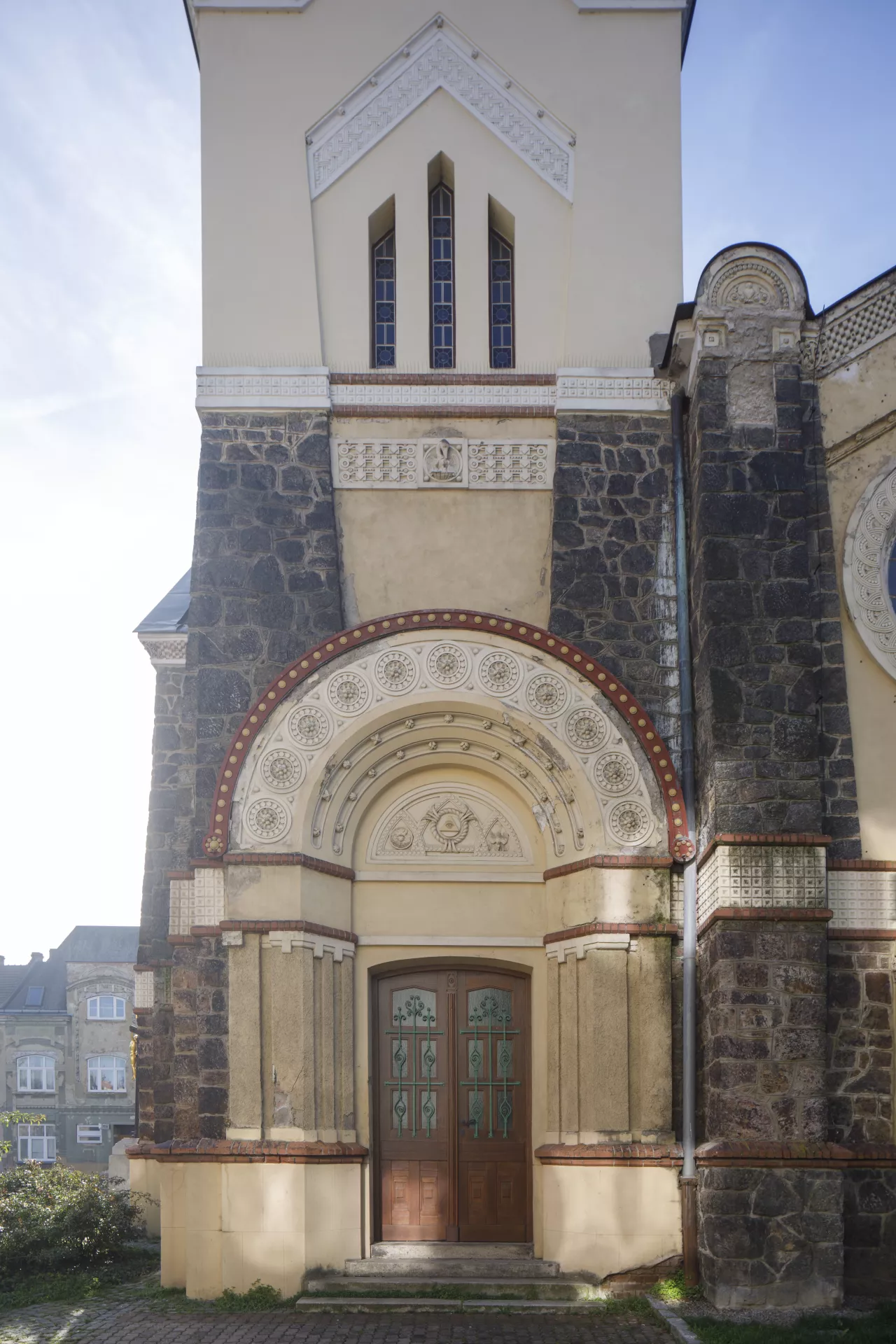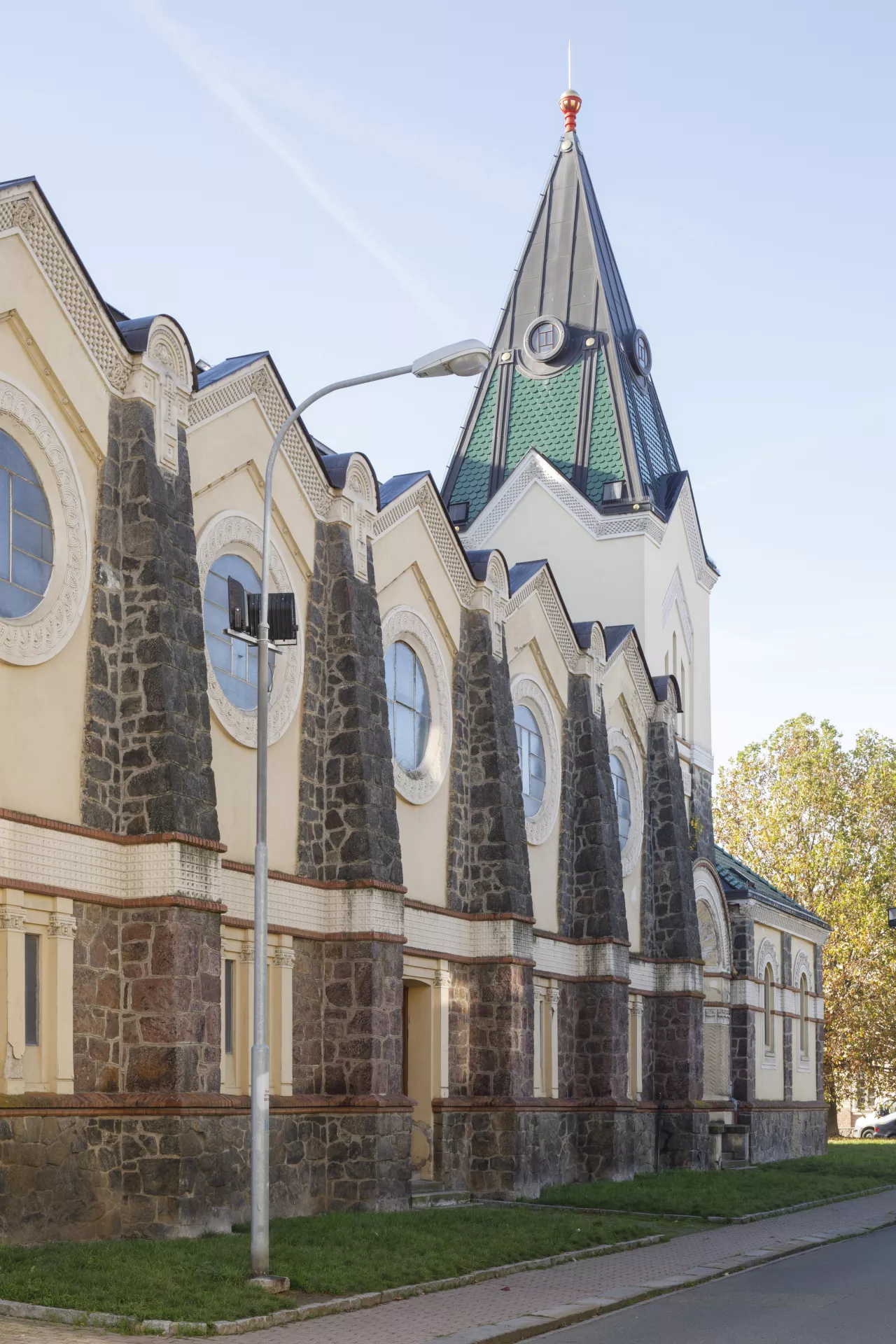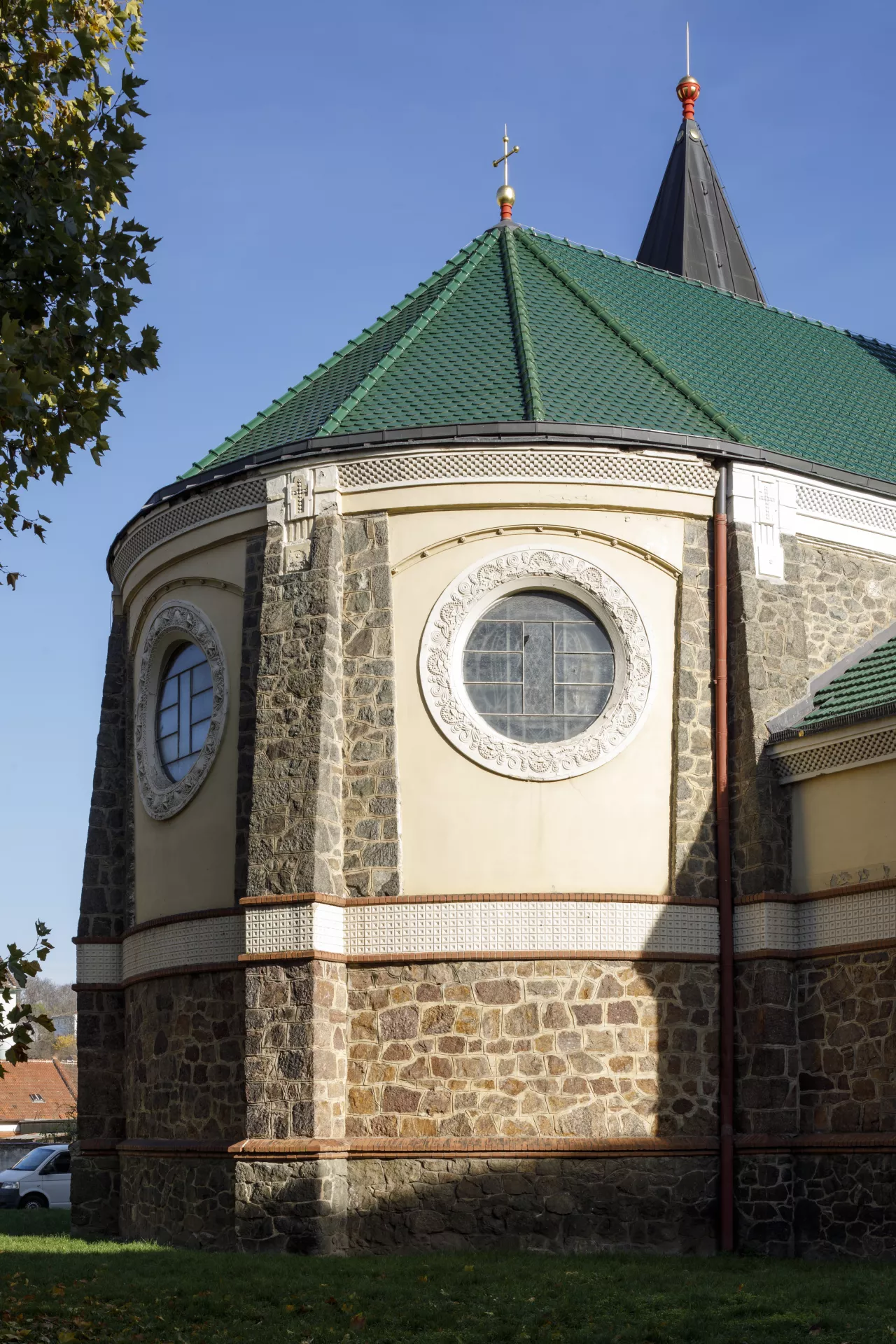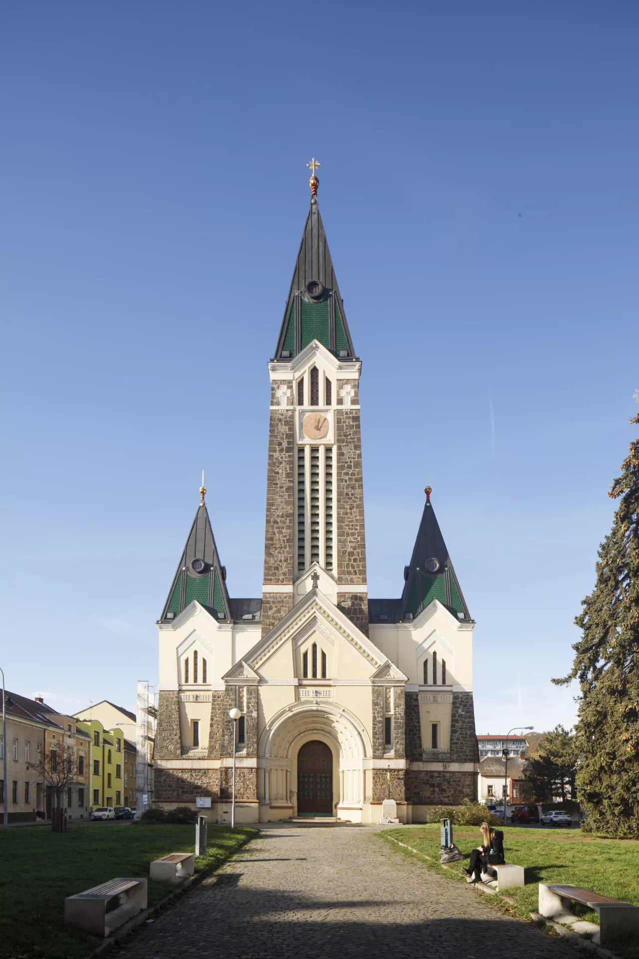 In the late 19th century, the village of Husovice, located on the right bank of the Svitava River adjacent to Zábrdovice, took on the character of a predominantly working-class suburb whose residents began to drift away from the Catholic Church. For this reason, in 1896 an association was founded with the goal building a new church in the area. Led by the priest and catechist František Venhuda, this association, known as Kostelní jednota (‘Church Union’) collected the necessary funds (mostly in the form of donations), chose a design by the architect Karel Hugo Kepka and organized the church’s construction by the Brno builders Karel Kučera and František Němeček in 1906–1910. The church was consecrated on 5 June 1910, and a local parish was established on 1 January 1911. In 1912, Husovice was elevated to city status, something which would not have been possible without its own church. As part of the village’s urbanization, around 1900, an orthogonal street grid was laid out north-west of Dukelská Avenue, with náměstí Republiky forming the stage on which the church would be built. Kepka initially designed a Neo-Romanesque triple-aisle basilica on a Latin cross floor plan with a cupola above the intersection of the nave and transept and two towers on the main elevation. This design was most probably inspired by the Romanesque basilica of the Sacred Heart in Paray-le-Monial, since the local monastery had been the home of the nun and mystic Marguerite-Marie Alacoque, a promoter of devotion to the Sacred Heart of Jesus – to which the Husovice church is consecrated. Kepka nevertheless was forced to significantly rework his first design from 1900, and it was only his second, more modest design from 1906–1907 that was eventually realized. Inside, this pseudo-basilica (no windows in the central nave) with triforia above the lateral aisles terminates in a semi-cylindrical north-west facing presbytery flanked by a chapel dedicated to St. Anne on one side and a sacristy on the other. The church has five rectangular towers. The main tower, situated at the centre of the main elevation, rises to a height of 60 metres and is complemented by four 30-metre-high corner towers in a castle-like arrangement. The main entrance is via a recessed portal in the protruding aedicula. The facades make alternating use of stone masonry and variously textured plaster, along with geometric and zoomorphic stucco elements (based on the medieval bestiary Physiologus). The building is of an eclectic style that includes stylistic references to medieval and Byzantine architecture and to Art Nouveau, Art Deco and even Cubist elements (the pyramidic-shaped towers). Historicist references prevail on the exterior, while the interior design is founded on the use of square grids in the manner of geometric Art Nouveau, with frame-like fields on the walls, here and there featuring ornamental elements. The triple-aisle interior and presbytery are vaulted, and the spaces below the triforia and by the presbytery have coffered ceilings; these are made of reinforced concrete held up by brick and stone masonry. Problems with underground water during the laying of the foundations significantly increased construction costs. Consequently, the main altar designed by Valentin Hrdlička and the side altars and pews were not made until 1929–1933. They nevertheless conform to the original architecture. The only interior completed at the time of construction is the Chapel of St. Anne, in which the altar’s flat retable contains Theodor Hilšer’s 1910 painting St. Anne Teaching the Virgin Mary. The presbytery’s three circular windows with glass paintings fashioned after the work of Ferdinand Herčík were replaced in the late 1930s because they let in insufficient light. The church has been undergoing general repairs since 2002. The local rectory at Vranovská 103 (B172), with a main elevation graced by two Neo-Baroque gables, was also built according to plans by Karel Hugo Kepka.
