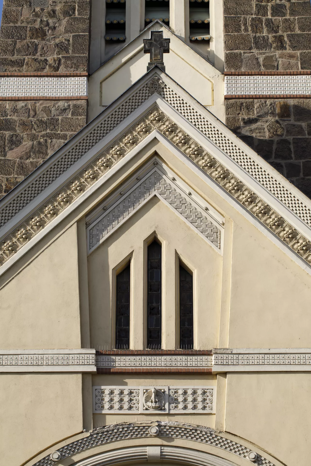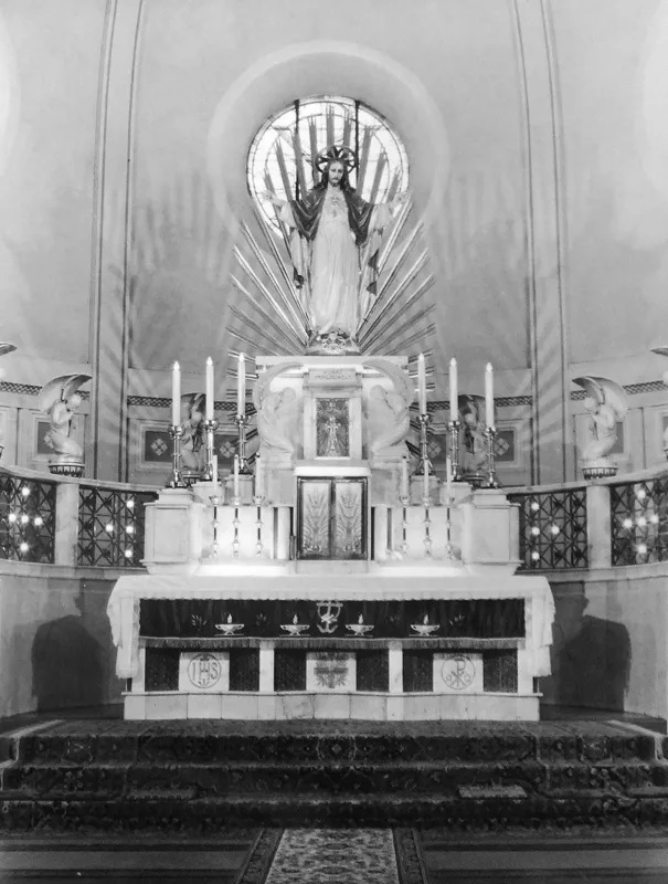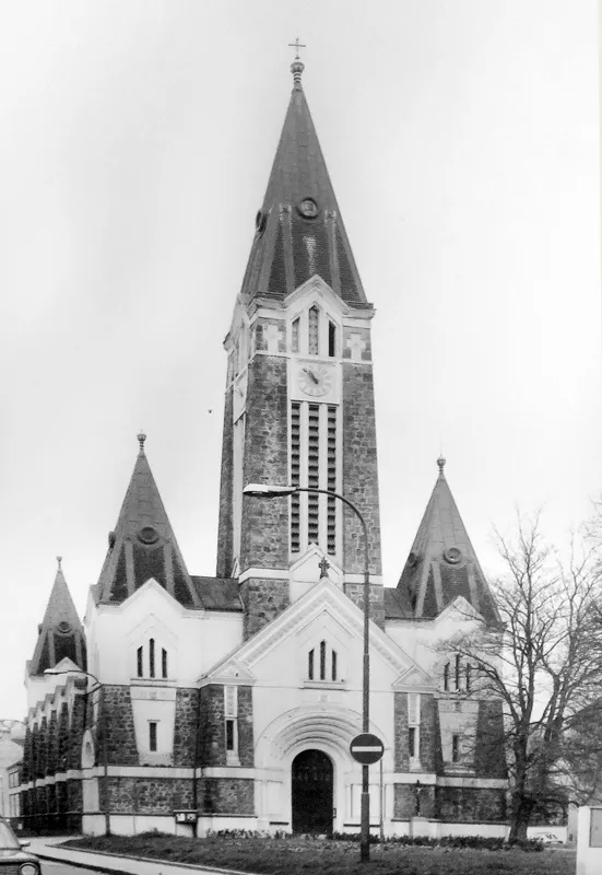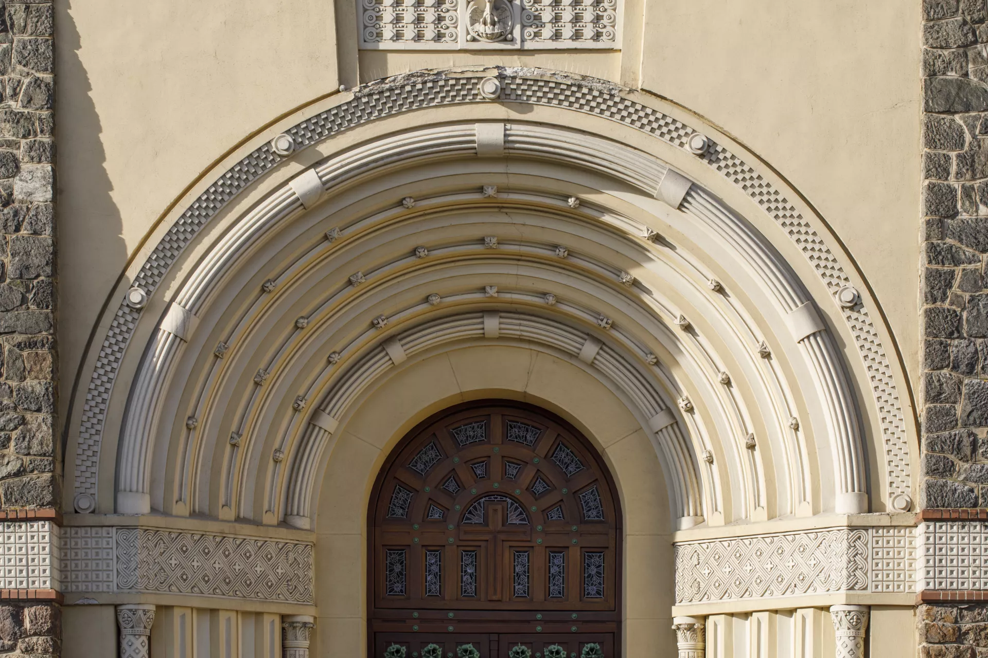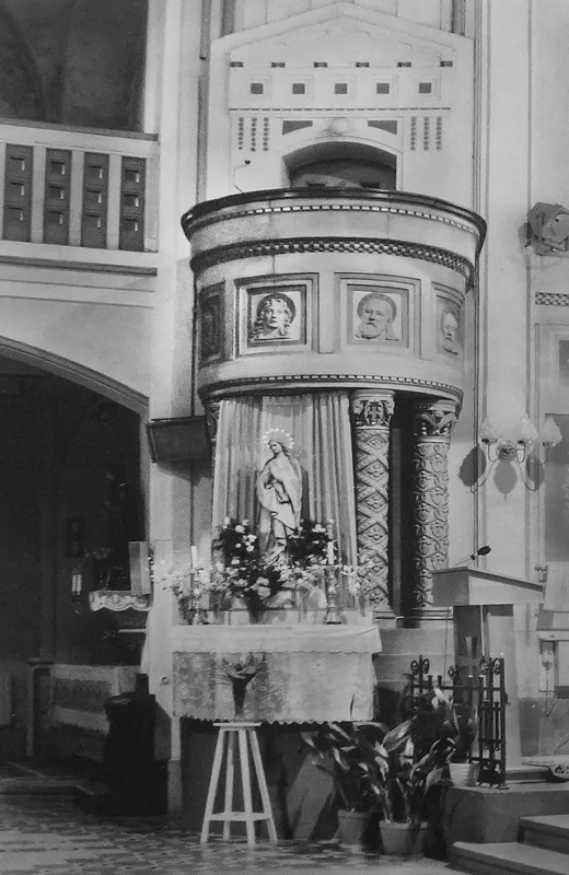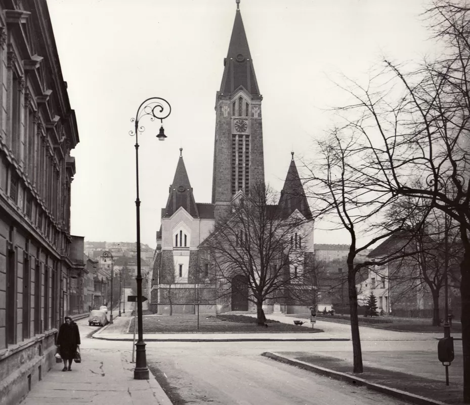 In the late 19th century, the village of Husovice, located on the right bank of the Svitava River adjacent to Zábrdovice, took on the character of a predominantly working-class suburb whose residents began to drift away from the Catholic Church. For this reason, in 1896 an association was founded with the goal building a new church in the area. Led by the priest and catechist František Venhuda, this association, known as Kostelní jednota (‘Church Union’) collected the necessary funds (mostly in the form of donations), chose a design by the architect Karel Hugo Kepka and organized the church’s construction by the Brno builders Karel Kučera and František Němeček in 1906–1910. The church was consecrated on 5 June 1910, and a local parish was established on 1 January 1911. In 1912, Husovice was elevated to city status, something which would not have been possible without its own church. As part of the village’s urbanization, around 1900, an orthogonal street grid was laid out north-west of Dukelská Avenue, with náměstí Republiky forming the stage on which the church would be built. Kepka initially designed a Neo-Romanesque triple-aisle basilica on a Latin cross floor plan with a cupola above the intersection of the nave and transept and two towers on the main elevation. This design was most probably inspired by the Romanesque basilica of the Sacred Heart in Paray-le-Monial, since the local monastery had been the home of the nun and mystic Marguerite-Marie Alacoque, a promoter of devotion to the Sacred Heart of Jesus – to which the Husovice church is consecrated. Kepka nevertheless was forced to significantly rework his first design from 1900, and it was only his second, more modest design from 1906–1907 that was eventually realized. Inside, this pseudo-basilica (no windows in the central nave) with triforia above the lateral aisles terminates in a semi-cylindrical north-west facing presbytery flanked by a chapel dedicated to St. Anne on one side and a sacristy on the other. The church has five rectangular towers. The main tower, situated at the centre of the main elevation, rises to a height of 60 metres and is complemented by four 30-metre-high corner towers in a castle-like arrangement. The main entrance is via a recessed portal in the protruding aedicula. The facades make alternating use of stone masonry and variously textured plaster, along with geometric and zoomorphic stucco elements (based on the medieval bestiary Physiologus). The building is of an eclectic style that includes stylistic references to medieval and Byzantine architecture and to Art Nouveau, Art Deco and even Cubist elements (the pyramidic-shaped towers). Historicist references prevail on the exterior, while the interior design is founded on the use of square grids in the manner of geometric Art Nouveau, with frame-like fields on the walls, here and there featuring ornamental elements. The triple-aisle interior and presbytery are vaulted, and the spaces below the triforia and by the presbytery have coffered ceilings; these are made of reinforced concrete held up by brick and stone masonry. Problems with underground water during the laying of the foundations significantly increased construction costs. Consequently, the main altar designed by Valentin Hrdlička and the side altars and pews were not made until 1929–1933. They nevertheless conform to the original architecture. The only interior completed at the time of construction is the Chapel of St. Anne, in which the altar’s flat retable contains Theodor Hilšer’s 1910 painting St. Anne Teaching the Virgin Mary. The presbytery’s three circular windows with glass paintings fashioned after the work of Ferdinand Herčík were replaced in the late 1930s because they let in insufficient light. The church has been undergoing general repairs since 2002. The local rectory at Vranovská 103 (B172), with a main elevation graced by two Neo-Baroque gables, was also built according to plans by Karel Hugo Kepka.