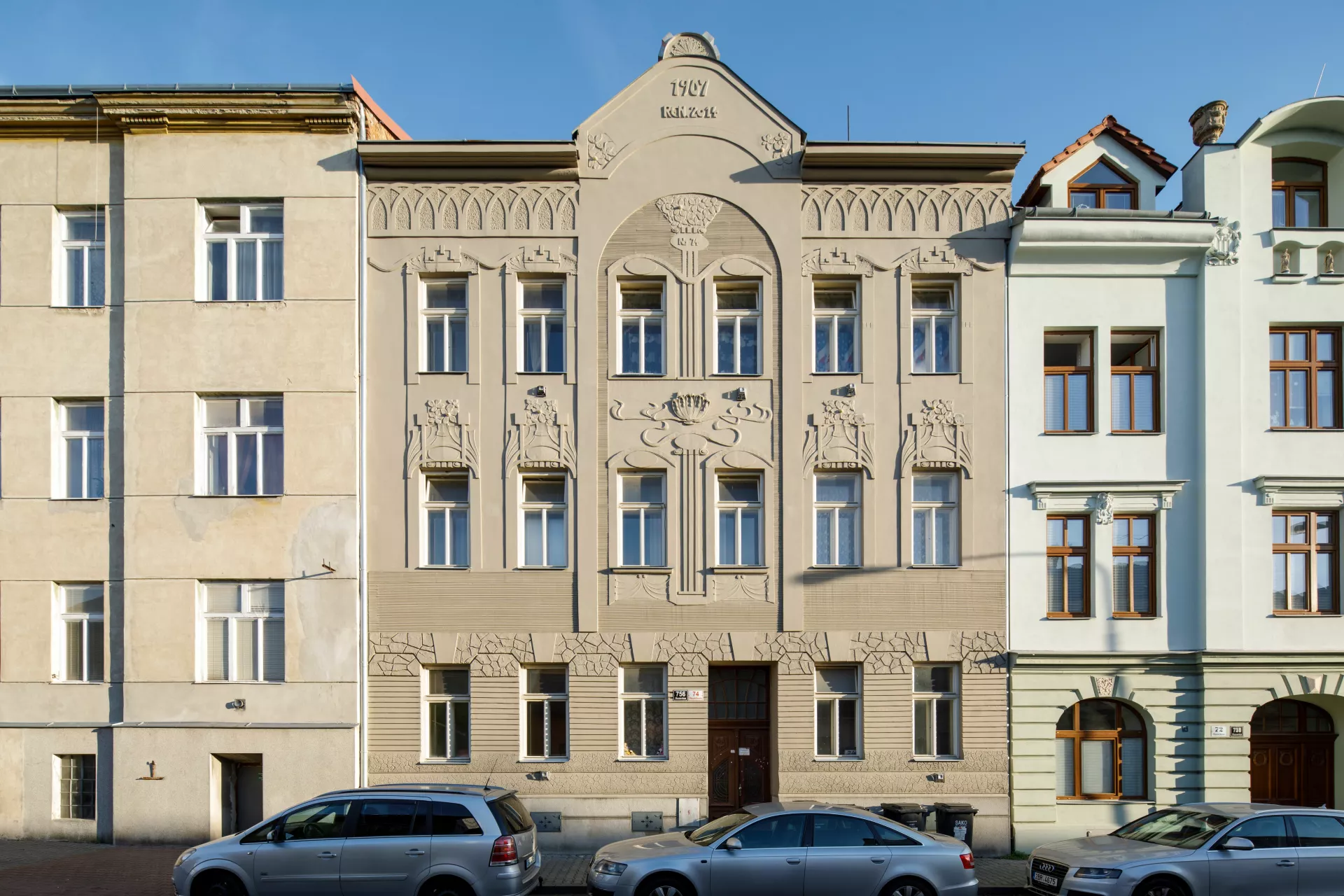 This apartment building with a radical Art Nouveau facade characterized by remarkably dynamic decoration is an example of a more modern adaptation of the traditional pawlatsch-style building. The three-storey town house’s six-bay street elevation is divided into a horizontally structured ground floor and vertically composed upper floors, where vertical elements produce the illusion of a central avant-corps and of a giant order separating the window bays. The ground floor is covered in banded rustication of varying widths. The facade’s basic geometric articulation is defined by a regular grid of rectangular windows. The central part of the facade is accentuated by a distinctly raised arch around the upper-floor windows that transitions into a rounded triangular gable with an arched gablet on top. The street frontage is topped by a strongly protruding cornice above a prominent band of relief stucco ornamentation consisting of intersecting pointed arches. The rich high-relief Art Nouveau stuccowork is concentrated primarily in the areas above the windows: waving ribbons and vases with flowers above the first-floor windows, and vegetal and geometric motifs above the second-floor windows. In the middle of the facade, the area between the first-floor and second-floor windows contains a floral motif surrounded by ribbons in the shape of a so-called ‘smoke curve’, a motif reminiscent of a wisp of smoke from a cigarette. These elements are complemented by the use of alternating smooth and horizontally scored coarse plaster. The uniform interior layout was that of a traditional pawlatsch building, meaning that the residential units were accessed via a courtyard-facing gallery. Two small units were located on either side of the entrance on the ground floor. The interiors on both upper floors were identical, with three small one-room apartments. From the pawlatsch gallery, one first entered into the kitchen, which then led to the living space with two windows overlooking the street. The shared toilet was located on the gallery. A narrow courtyard wing attached to the main building at a right angle had a similar access gallery. The building received a water connection in 1927, before which water had to be brought from a well in the courtyard. The building long suffered from a lack of maintenance, and by the year 2000 it found itself in a very neglected state. Although the main elevation lost some of its original stylistic character during a comprehensive renovation project in 2014, many other stylistic elements were nevertheless restored, and the building was reimbued with its original Art Nouveau decorativeness. Pavla Cenková