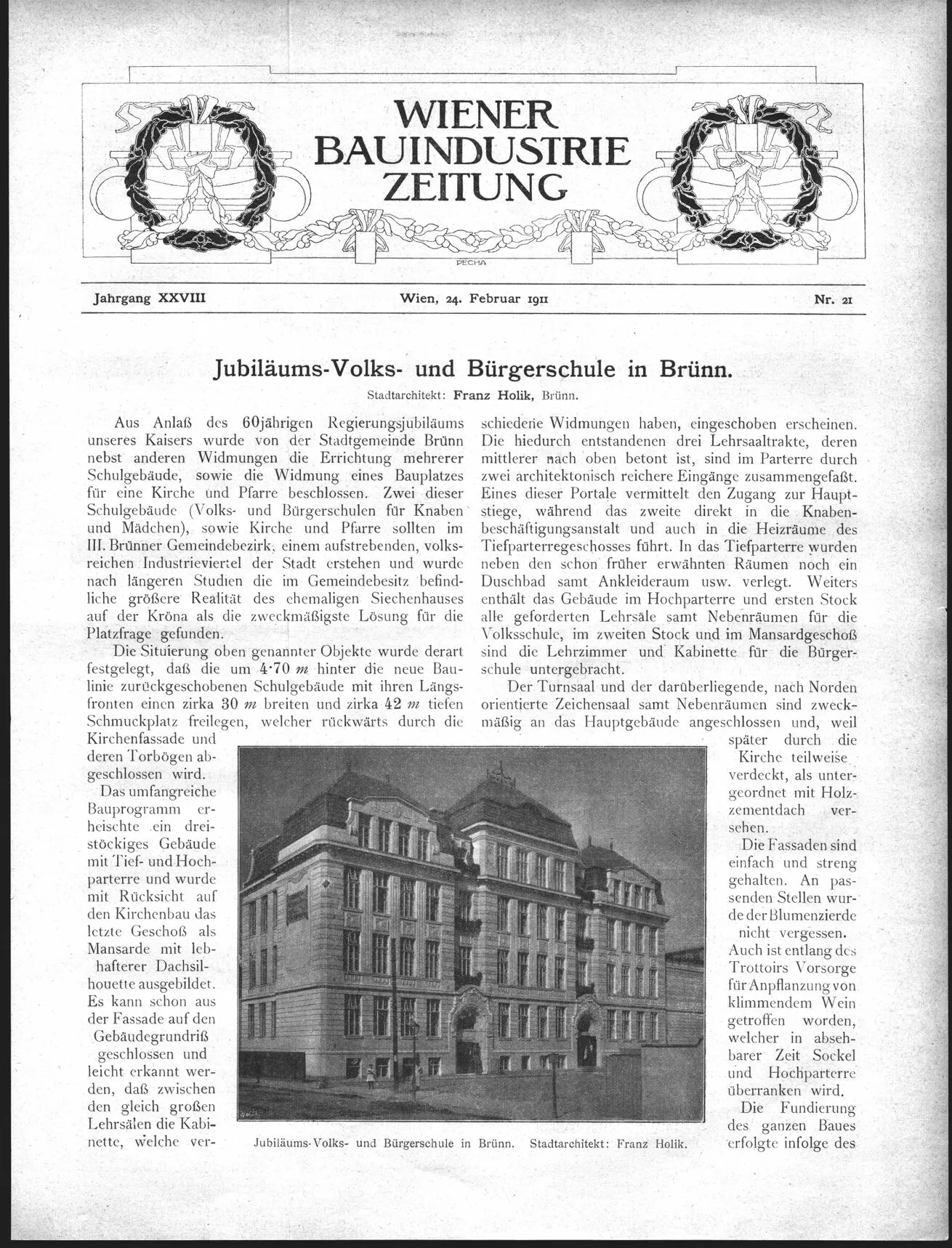 Jubiläums-Volks- und Bürgerschule in Brünn, Wiener Bauindustrie-Zeitung č. 21, roč. 28, Vídeň 1911, s. 167–168.