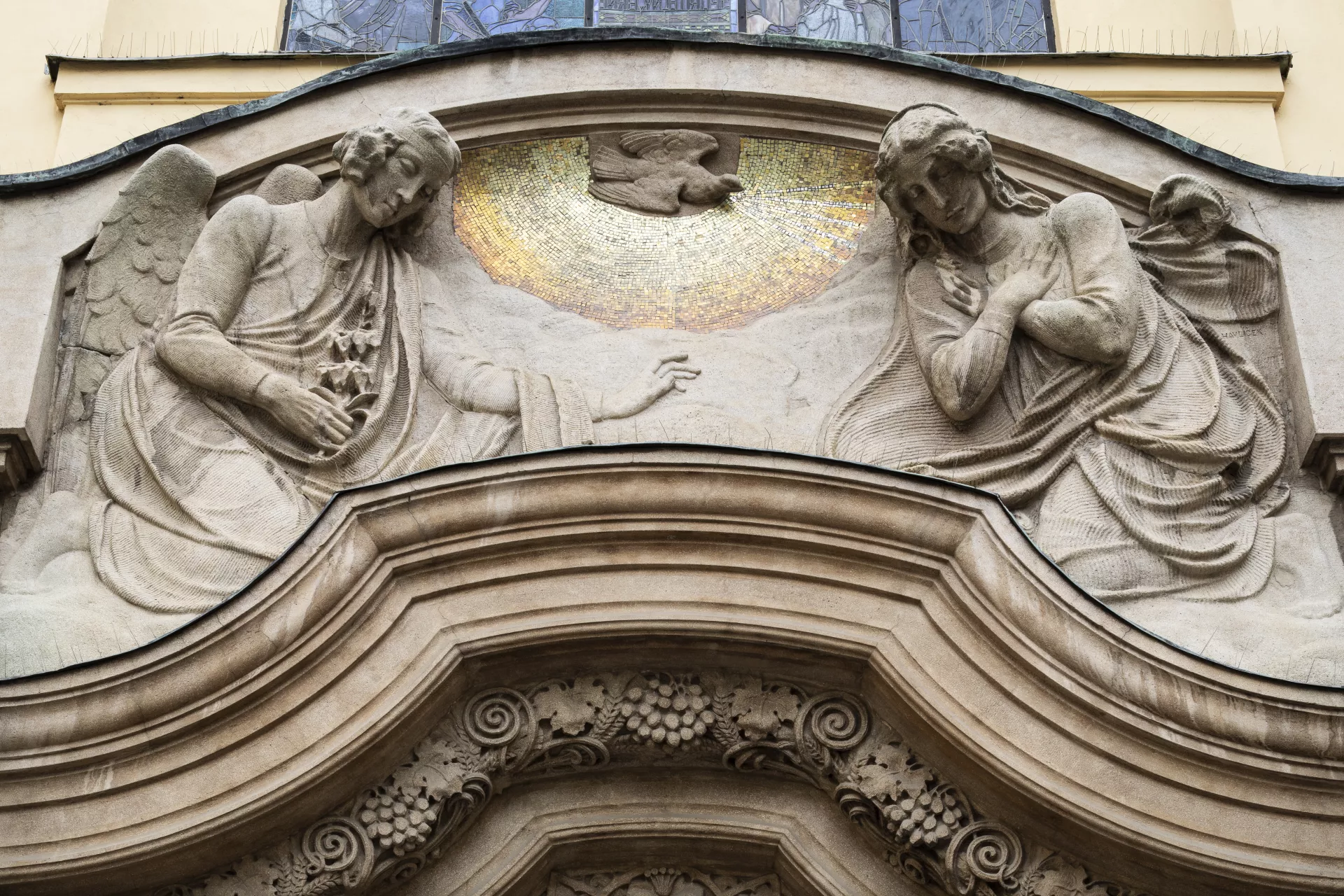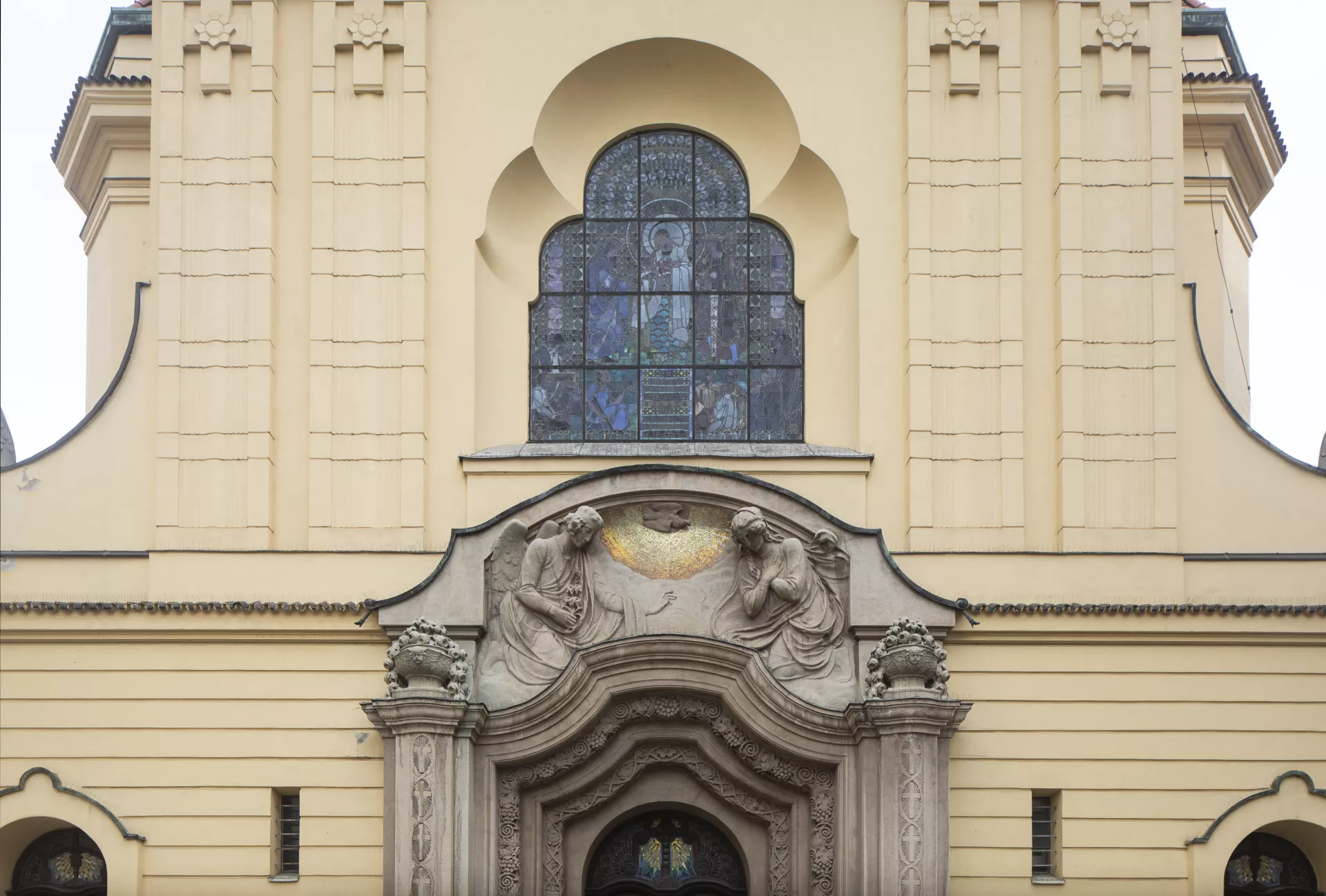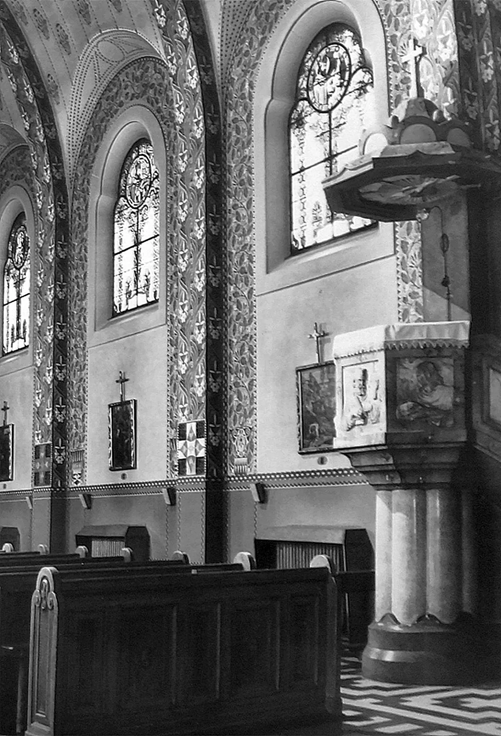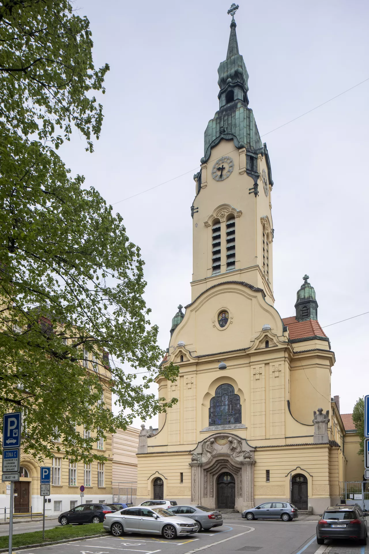 Construction of the Church of the Immaculate Conception was overseen by the building committee of the Society for the Construction of Catholic Churches in the Diocese of Brno, which was founded in January 1907. Both the society and the committed were chaired by the Bishop of Brno, Count Paul von Huyn. Donations for the church’s construction and furnishings were collected from all over the diocese. Huyn’s important contribution to the project’s realization is commemorated by an image of his episcopal coat of arms done in inlay work on the floor of the presbytery. The church has a capacity of around 2,000 worshippers and was built for what was then the third district of Brno encompassing the southern suburbs, whose distinctly industrial character is among other things visible in the area immediately north of the church – the site of the former Mosilana textile works. The land for the church building, located on the site of a former river island, was donated free of charge by the city. Sometime before the late 13th century, a leper hospital had been built here with a chapel dedicated to St. Stephen. The building later served as a shelter, dormitory, nursery school and guardhouse. In June 1909, Brno’s first city architect, Franz Holik, began drafting plans for a small square with a church, a rectory and two symmetrically placed school buildings. Holik subsequently presented a series of sketches of various stylistic designs and volumetric arrangements for the new church. The chosen alternative was the most progressive of the designs, combining Neo-Baroque elements with Wagnerian modernism, which the architect was very familiar with, as he had studied under Otto Wagner for two years at the Vienna Academy. Construction work was carried out by the Brno building firm of Josef Müller under the supervision of the engineer Emanuel Straka. The Jubilee Church of Emperor Franz Joseph I, as it was originally named, was built to commemorate the 60th anniversary of the emperor’s reign in 1908, and the foundation stone was laid on his 80th birthday on 18 August 1910. The church’s consecration on 18 January 1914 was attended by a member of the royal family, Archduke Friedrich, Duke of Teschen, who donated the main altar and was accompanied by his wife Isabella. The church has a Latin cross floor plan with a nave and transept and a shallow, polygonal north-facing presbytery. A 60-metre-high tower rises above the main entrance, which is accentuated by a recessed artificial stone portal. The presbytery is flanked by the church’s sacristy and a chapel dedicated to the Betrothal of the Virgin Mary. The marshy ground beneath the building had to be strengthened with reinforced concrete. The church’s vaults are made of a concrete shell and the roof is metal. Inside, rich vegetal and zoomorphic wall paintings with symbolic references to the Virgin Mary produce an impressive display of Art Nouveau décor. These ornamental elements, painted by František Kolbábek according to a design by Hans Kalmsteiner, were restored during renovation work in 1967–1982. The stained-glass windows with medallions of saints and other motifs, including the final Swedish assault on Brno on 15 August 1645, were produced by Benedikt Škarda’s company according to designs by the painter Jaroslav Malý. Unfortunately, the stained glass on the church’s eastern side was destroyed by a blast wave from an exploding bomb towards the end of the Second World War. The window above the main entrance depicting The Miracle of St. Elizabeth of Hungary dates from 1912 and was produced by the Tiroler Glasmalerei workshop in Innsbruck (after a design by Bernhard Rice). The altars, pulpit, pews, cabinets in the sacristy, the Holy Sepulchre and many other interior items and decoration were designed by Franz Holik and mostly manufactured by Brno companies. The painting and sculptural decoration of the altars was also entrusted to artists associated with Brno: the painters Friedrich Hans Wacha and Eduard Csánek and the sculptor Carl Wollek. The relief on the tympanum on the portal and the angel statues on the main elevation, however, were the work of Milán Havlíček from Prague. Wacha devoted great care to the painting on the main altar, which he worked on in 1910–1913 with support from Johann II, Prince of Liechtenstein. The triangular composition depicts the praying Virgin Mary with the kneeling patrons of the diocese, Saints Peter and Paul, above Brno at dawn. In 1910, a four-storey school for boys was built to the west of the church, but the planned school for girls never materialized. Instead, the third side of the ‘church square’ – an analogous example of which can be seen in front of the Piarist Church of Maria Treu in Vienna – is home to the constructivist building of the Labour Office. Holik also designed the three-storey rectory built in 1912 to the north-west behind the church. Aleš Filip