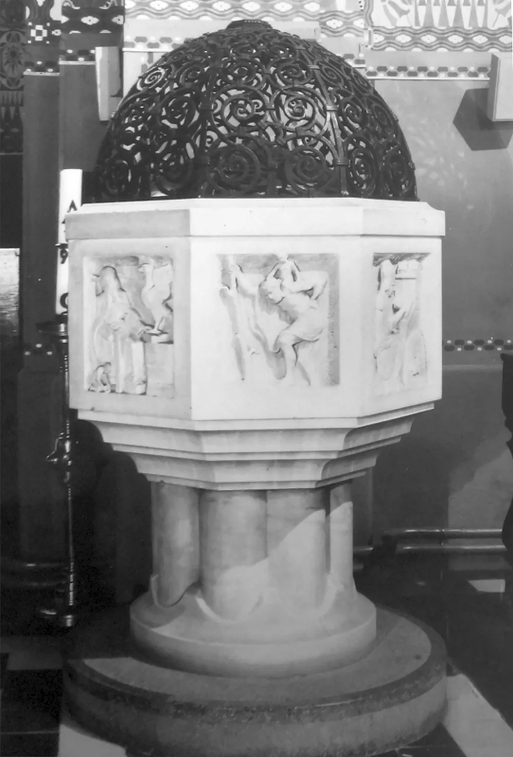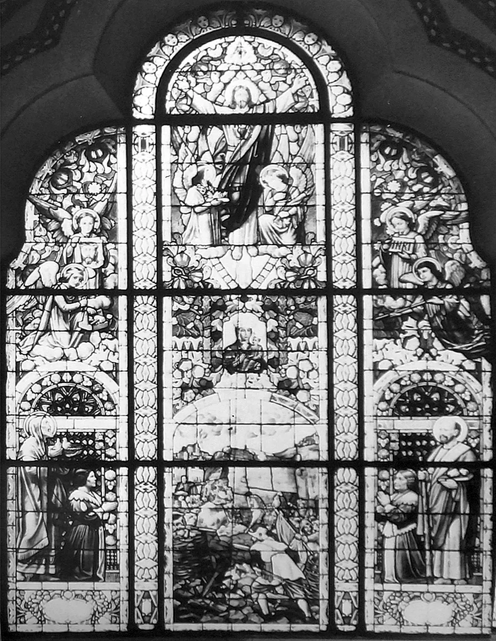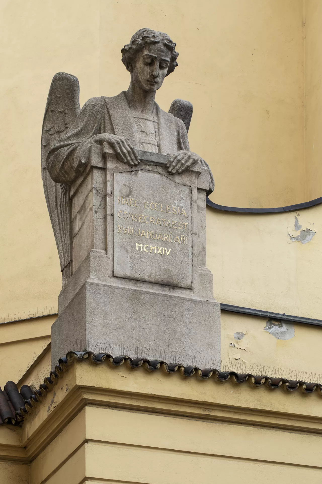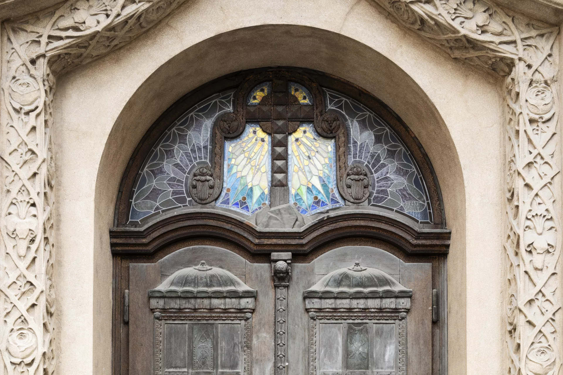 Construction of the Church of the Immaculate Conception was overseen by the building committee of the Society for the Construction of Catholic Churches in the Diocese of Brno, which was founded in January 1907. Both the society and the committed were chaired by the Bishop of Brno, Count Paul von Huyn. Donations for the church’s construction and furnishings were collected from all over the diocese. Huyn’s important contribution to the project’s realization is commemorated by an image of his episcopal coat of arms done in inlay work on the floor of the presbytery. The church has a capacity of around 2,000 worshippers and was built for what was then the third district of Brno encompassing the southern suburbs, whose distinctly industrial character is among other things visible in the area immediately north of the church – the site of the former Mosilana textile works. The land for the church building, located on the site of a former river island, was donated free of charge by the city. Sometime before the late 13th century, a leper hospital had been built here with a chapel dedicated to St. Stephen. The building later served as a shelter, dormitory, nursery school and guardhouse. In June 1909, Brno’s first city architect, Franz Holik, began drafting plans for a small square with a church, a rectory and two symmetrically placed school buildings. Holik subsequently presented a series of sketches of various stylistic designs and volumetric arrangements for the new church. The chosen alternative was the most progressive of the designs, combining Neo-Baroque elements with Wagnerian modernism, which the architect was very familiar with, as he had studied under Otto Wagner for two years at the Vienna Academy. Construction work was carried out by the Brno building firm of Josef Müller under the supervision of the engineer Emanuel Straka. The Jubilee Church of Emperor Franz Joseph I, as it was originally named, was built to commemorate the 60th anniversary of the emperor’s reign in 1908, and the foundation stone was laid on his 80th birthday on 18 August 1910. The church’s consecration on 18 January 1914 was attended by a member of the royal family, Archduke Friedrich, Duke of Teschen, who donated the main altar and was accompanied by his wife Isabella. The church has a Latin cross floor plan with a nave and transept and a shallow, polygonal north-facing presbytery. A 60-metre-high tower rises above the main entrance, which is accentuated by a recessed artificial stone portal. The presbytery is flanked by the church’s sacristy and a chapel dedicated to the Betrothal of the Virgin Mary. The marshy ground beneath the building had to be strengthened with reinforced concrete. The church’s vaults are made of a concrete shell and the roof is metal. Inside, rich vegetal and zoomorphic wall paintings with symbolic references to the Virgin Mary produce an impressive display of Art Nouveau décor. These ornamental elements, painted by František Kolbábek according to a design by Hans Kalmsteiner, were restored during renovation work in 1967–1982. The stained-glass windows with medallions of saints and other motifs, including the final Swedish assault on Brno on 15 August 1645, were produced by Benedikt Škarda’s company according to designs by the painter Jaroslav Malý. Unfortunately, the stained glass on the church’s eastern side was destroyed by a blast wave from an exploding bomb towards the end of the Second World War. The window above the main entrance depicting The Miracle of St. Elizabeth of Hungary dates from 1912 and was produced by the Tiroler Glasmalerei workshop in Innsbruck (after a design by Bernhard Rice). The altars, pulpit, pews, cabinets in the sacristy, the Holy Sepulchre and many other interior items and decoration were designed by Franz Holik and mostly manufactured by Brno companies. The painting and sculptural decoration of the altars was also entrusted to artists associated with Brno: the painters Friedrich Hans Wacha and Eduard Csánek and the sculptor Carl Wollek. The relief on the tympanum on the portal and the angel statues on the main elevation, however, were the work of Milán Havlíček from Prague. Wacha devoted great care to the painting on the main altar, which he worked on in 1910–1913 with support from Johann II, Prince of Liechtenstein. The triangular composition depicts the praying Virgin Mary with the kneeling patrons of the diocese, Saints Peter and Paul, above Brno at dawn. In 1910, a four-storey school for boys was built to the west of the church, but the planned school for girls never materialized. Instead, the third side of the ‘church square’ – an analogous example of which can be seen in front of the Piarist Church of Maria Treu in Vienna – is home to the constructivist building of the Labour Office. Holik also designed the three-storey rectory built in 1912 to the north-west behind the church. Aleš Filip
