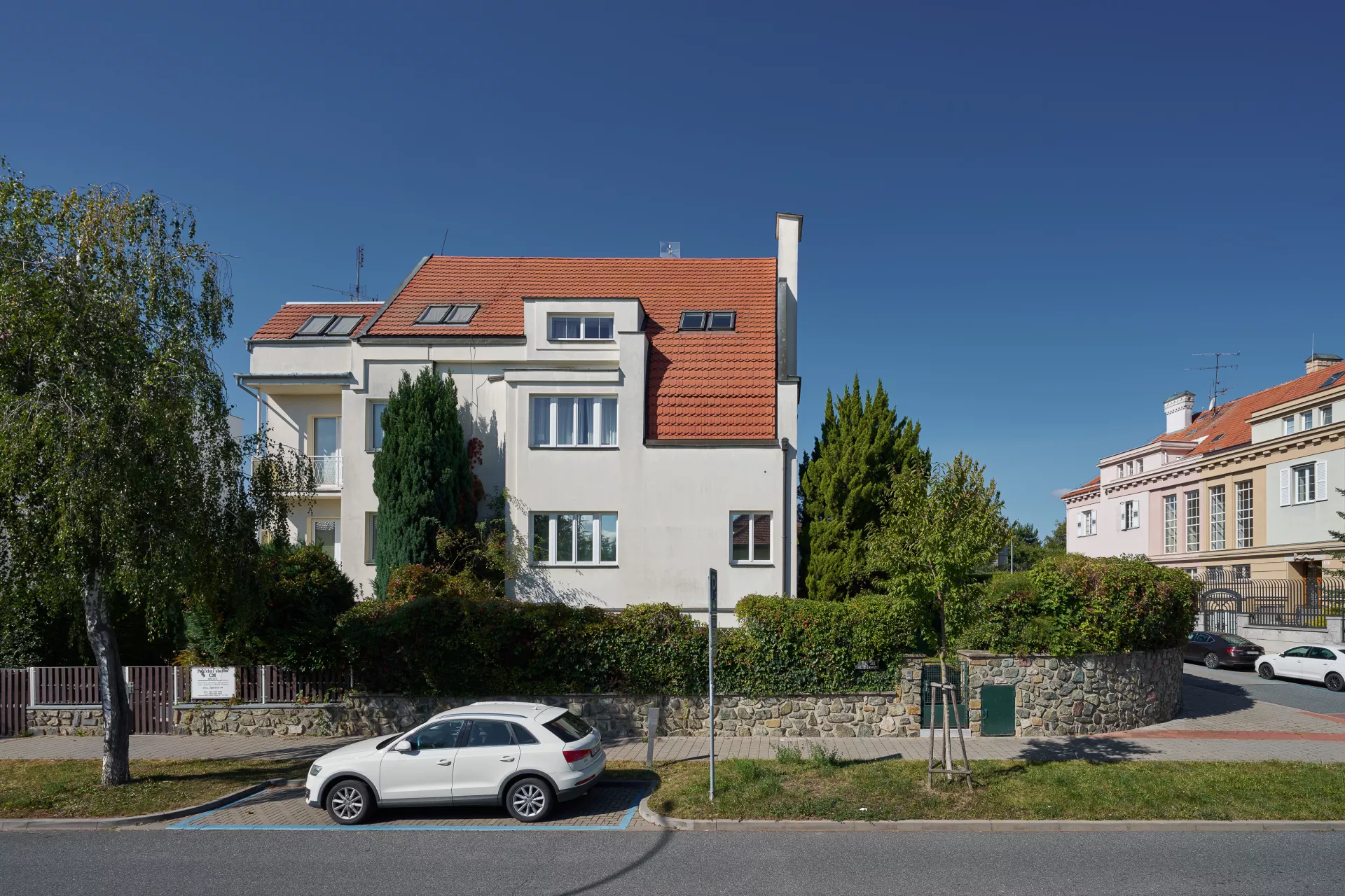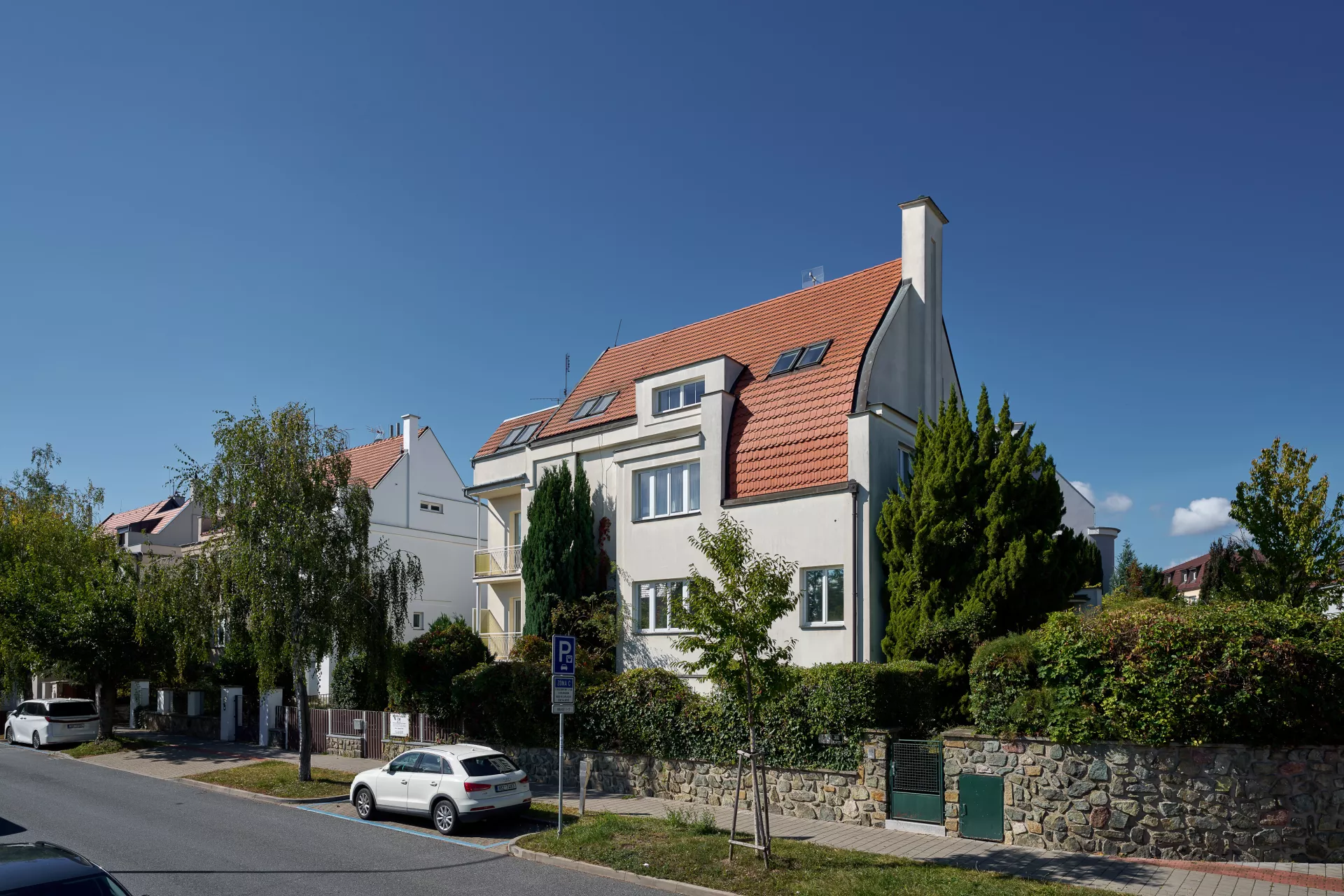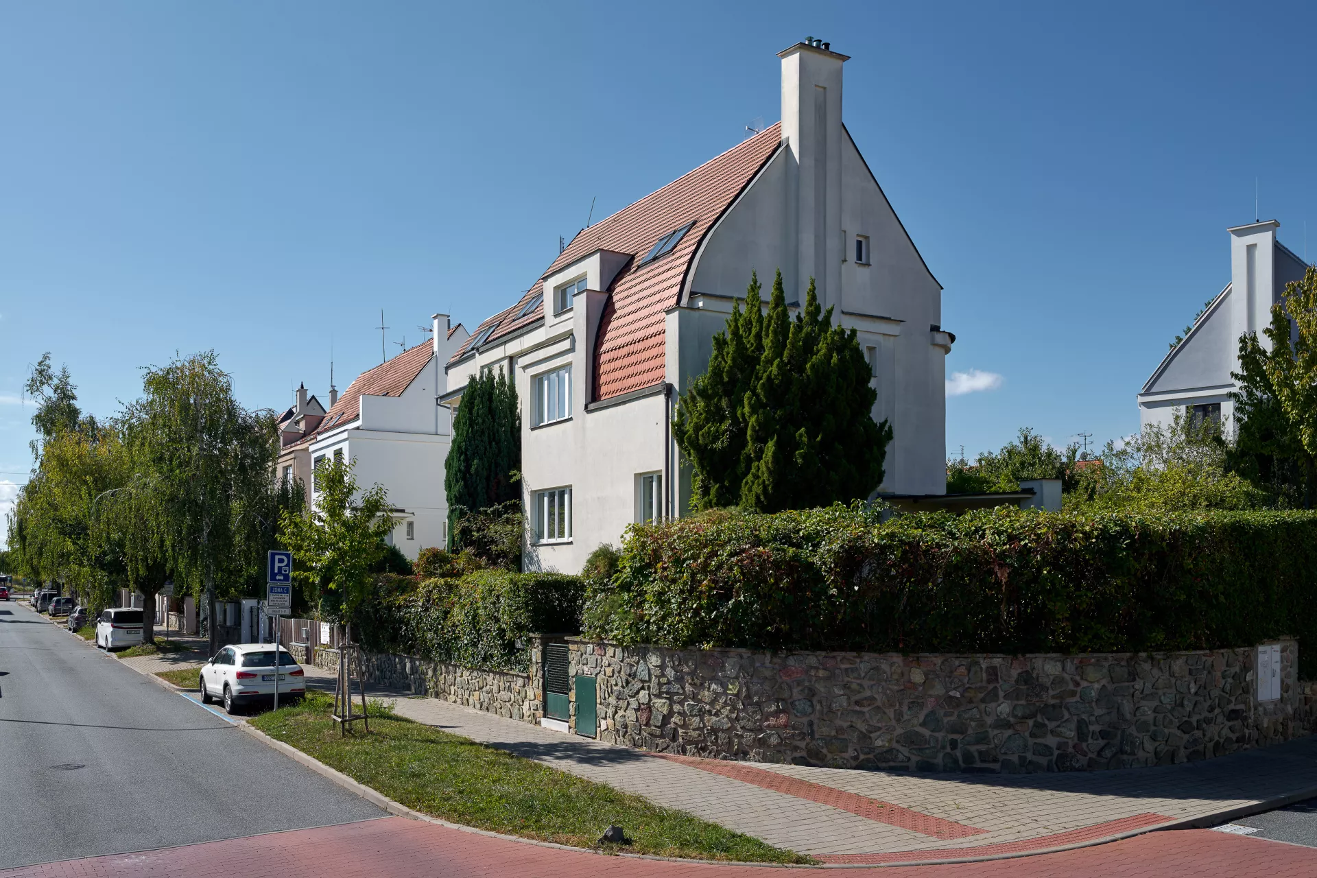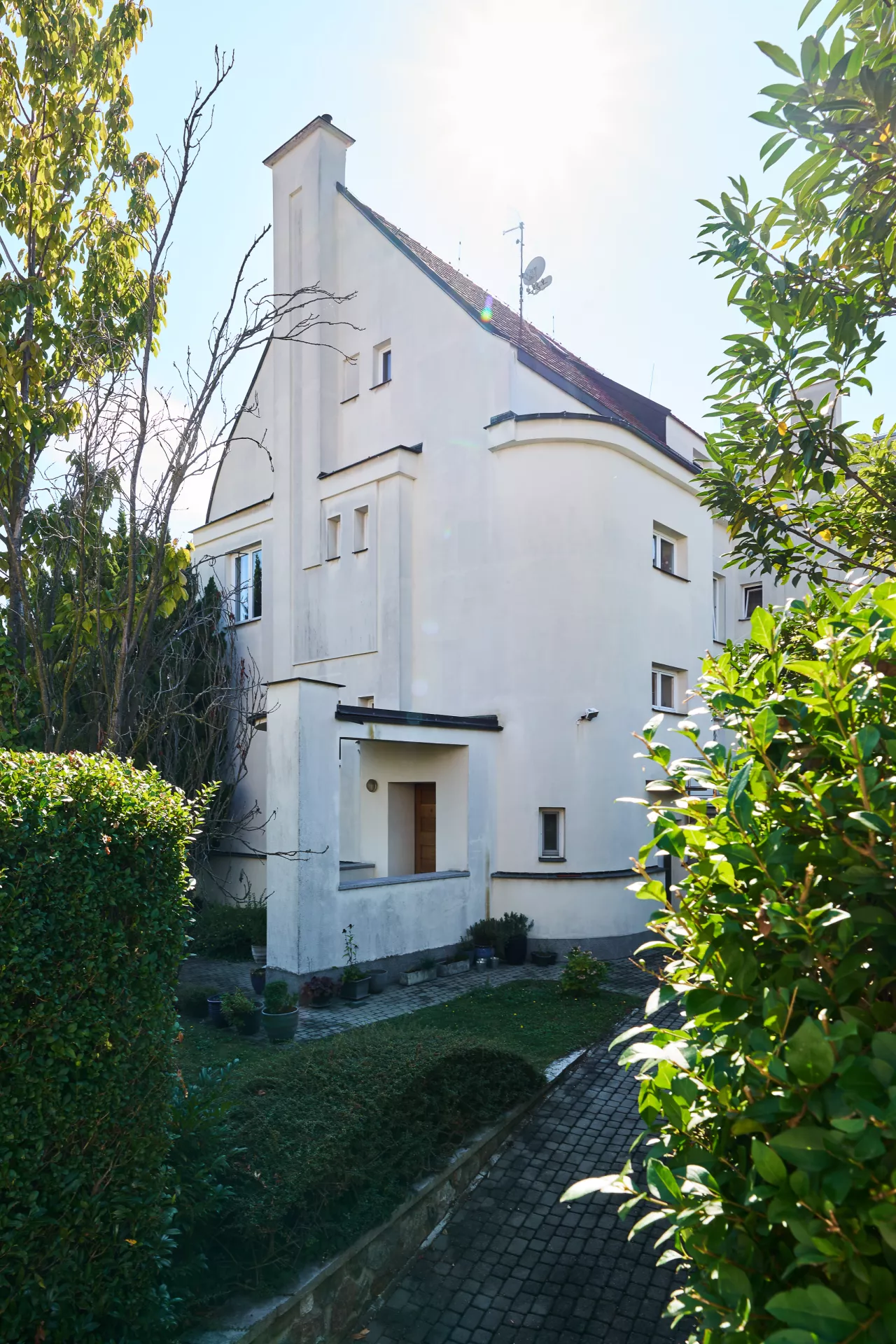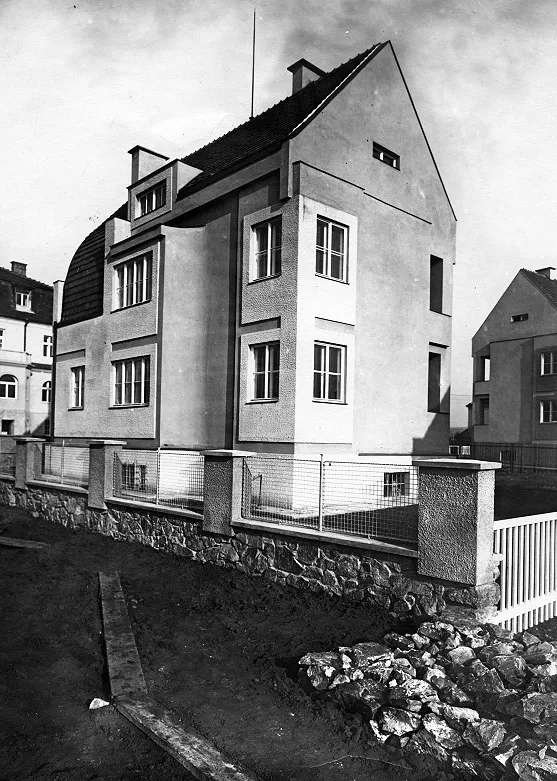 In the early 1920s the Rodina (Family) housing cooperative purchased plots on Žlutý kopec in Brno with the intention of building a small-scale villa colony. The designs of houses in Barvičova, Mahenova and Lerchova streets were assigned to Bohuslav Fuchs. The architect presented several designs of different types of houses, one of which was selected and in various modifications employed in 1923–24. The house at Lerchova 9 intended for Domin Pavlíček, a Brno based editor and writer, is by far the best preserved. Fuch's design of this villa (as well as its modifications in the neighborhood) reveal the influence of late Prague Cubism in architecture, apparent in the geometric composition of the relief facade elements and its segmentation. At the same time, the design uses the traditional keel-shaped roof, which may refer to the influence of Adolf Loos, who used this element as well as the reverse T motive in his design of Steiner Villa in Vienna as early as 1910