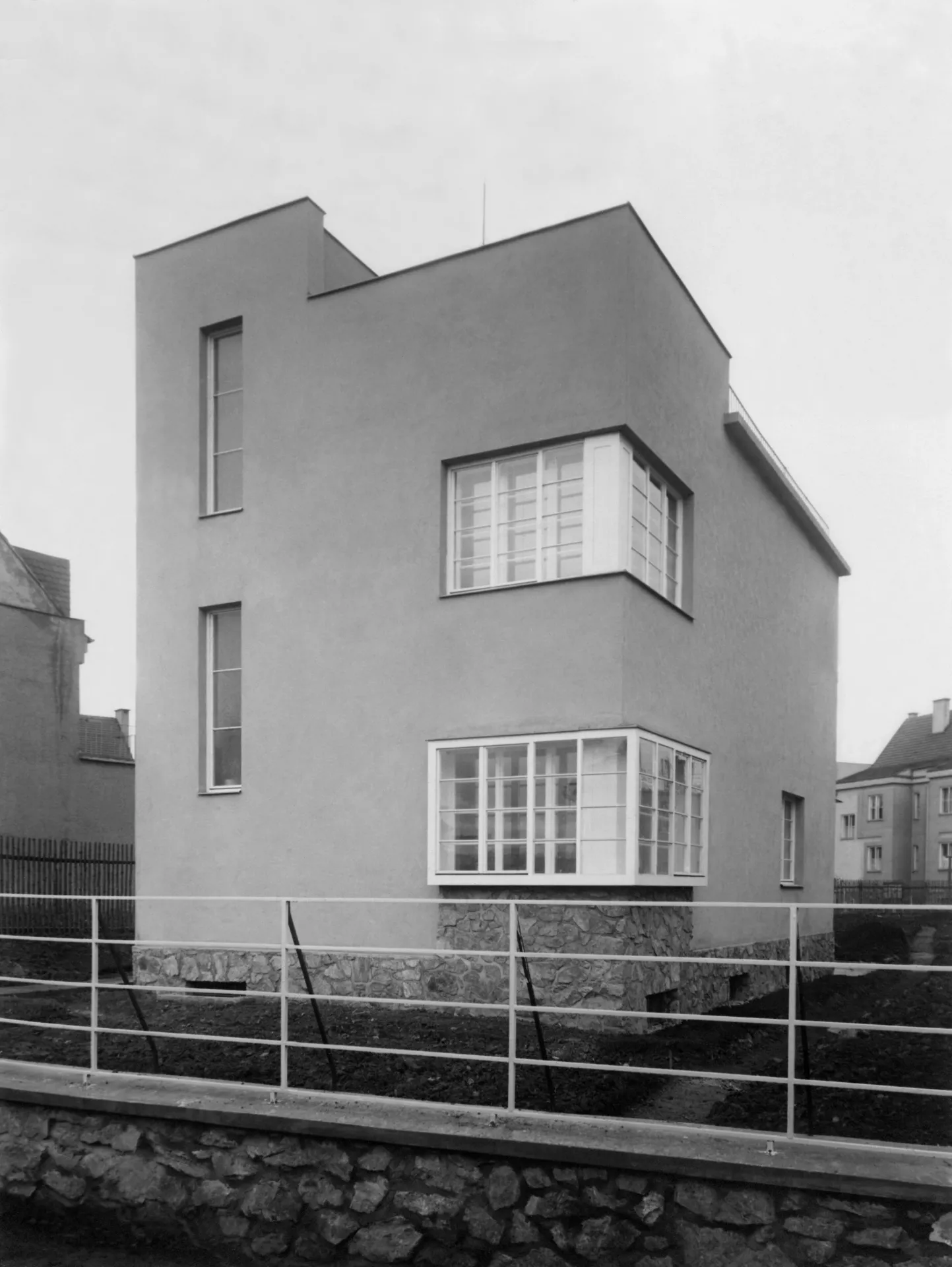 This two-level building at the beginning of Barvičova Street built for the Na Vyhlídce (On the Lookout) housing cooperative represents a detached house with maximally reduced mass consisting of a nearly monolithic block whose neat facade was originally not interrupted at all, not even by the main entrance. The entrance was situated on the left side in a low risalit forming a sheltered space. The street-side facade featured the extended corner windows of the residential rooms counterpointed by the oblong windows lighting the staircase. The layout is nearly identical to that of the terraced houses in nearby Lerchova Street: the ground floor houses the living room and kitchen with larder; the first floor has two bedrooms and bathroom. The roof railing signals a spacious roof terrace accessible by the interior staircase. This simple design adhering to the functional and esthetic requirements of avant-garde architecture is marred by the later addition of the hall with an entrance from the street-side facade.