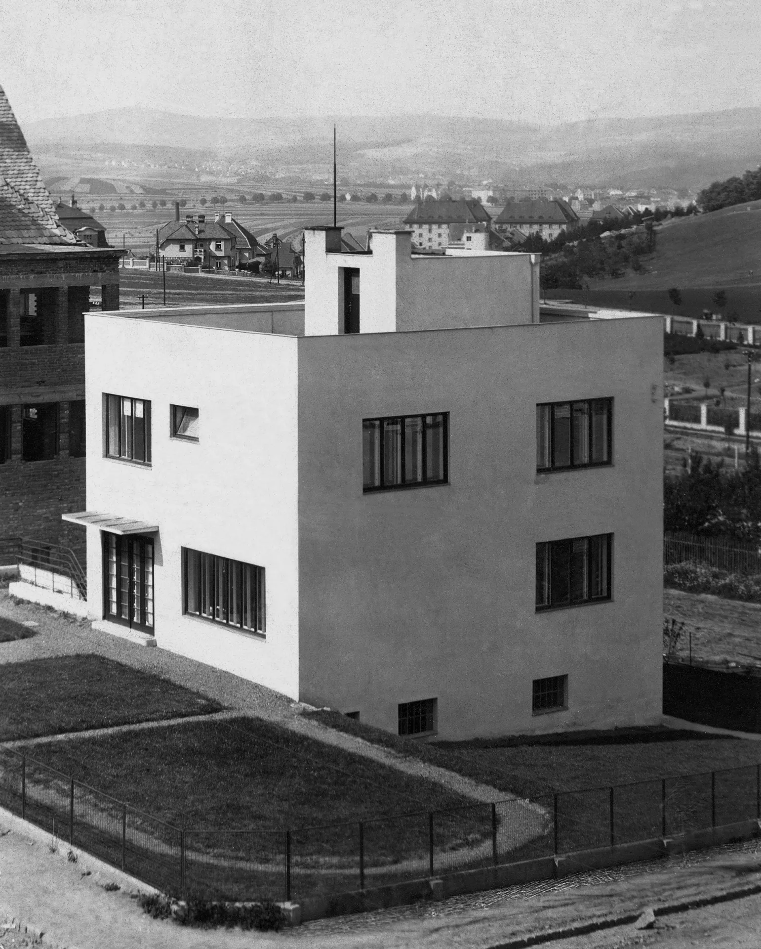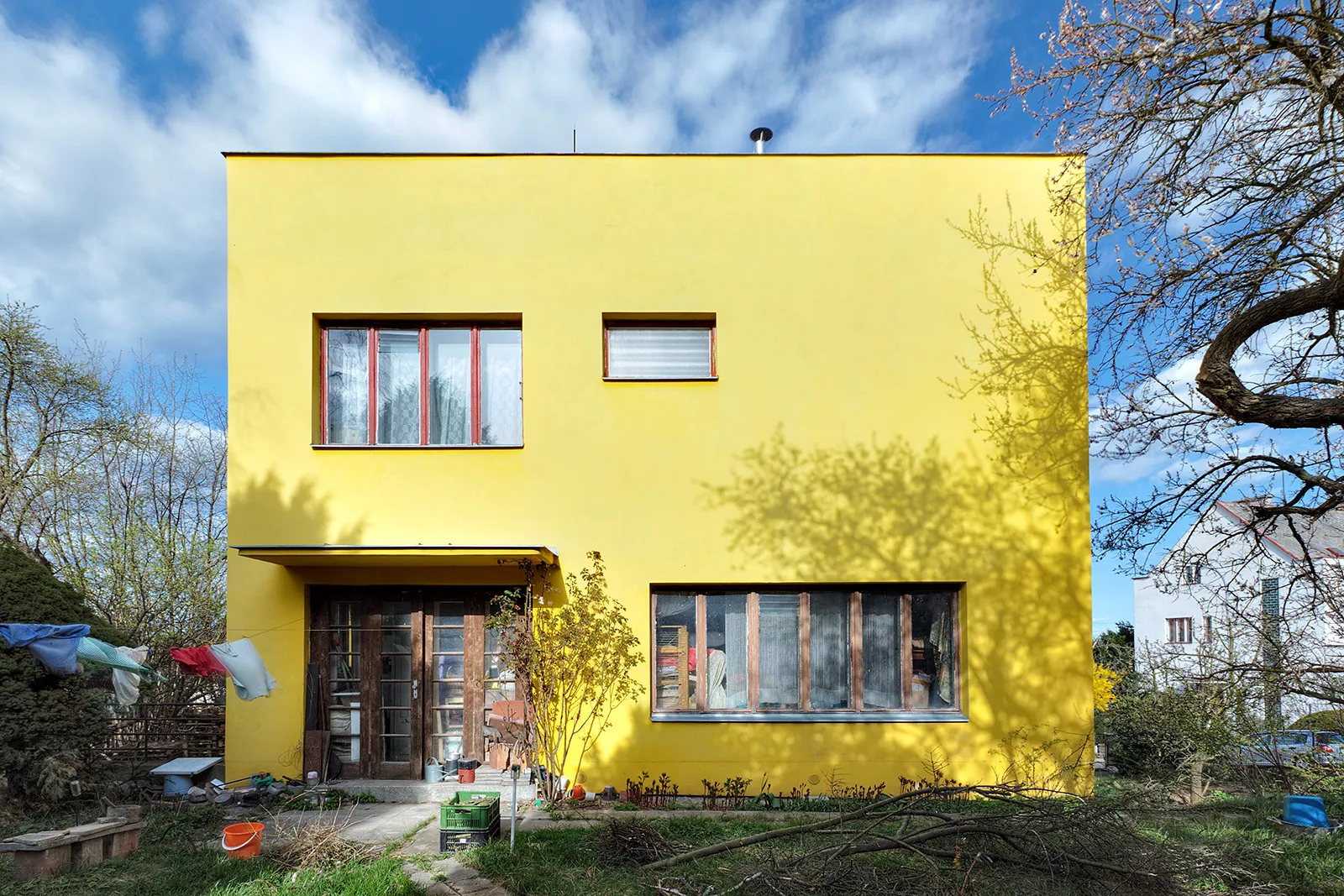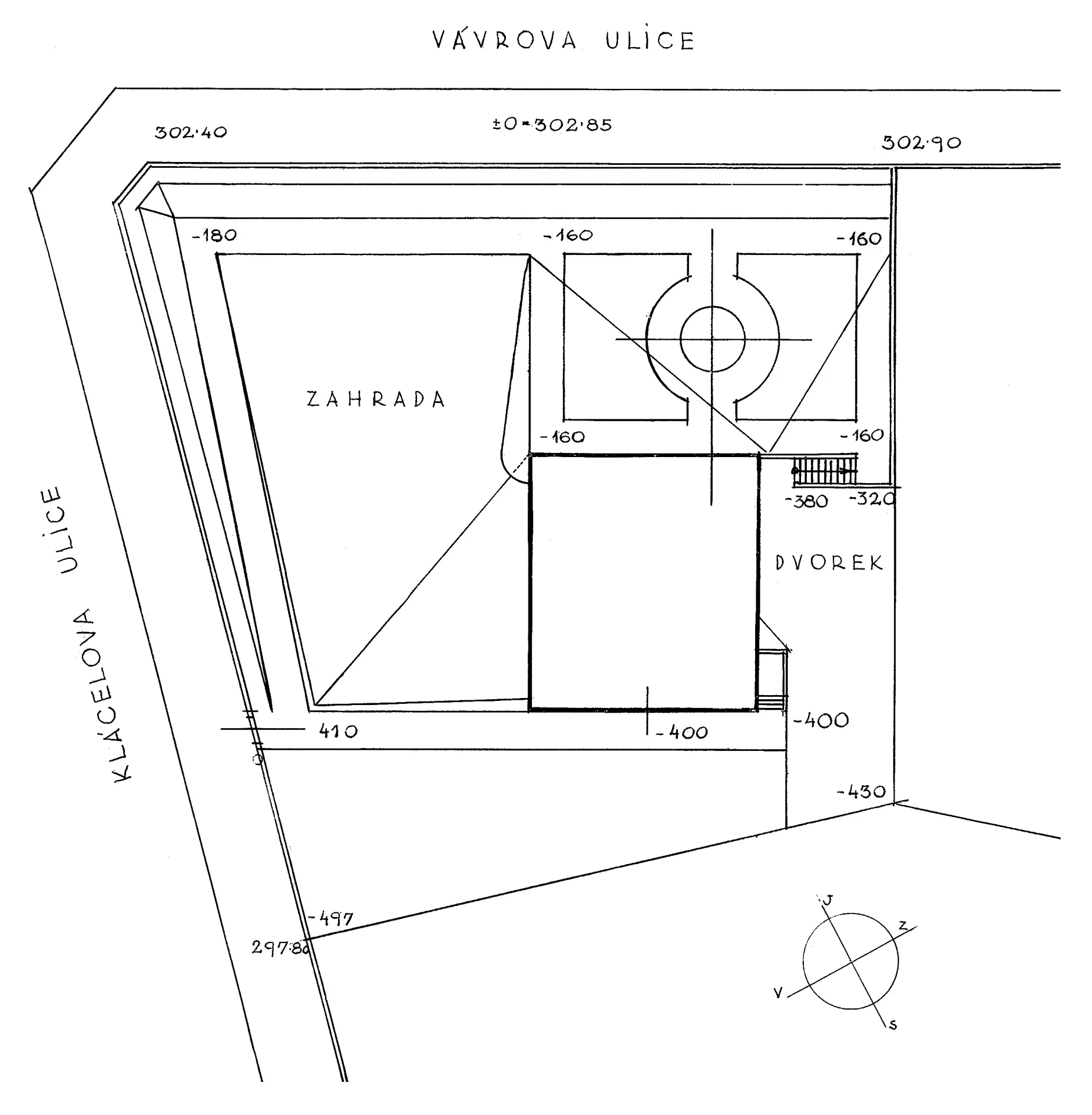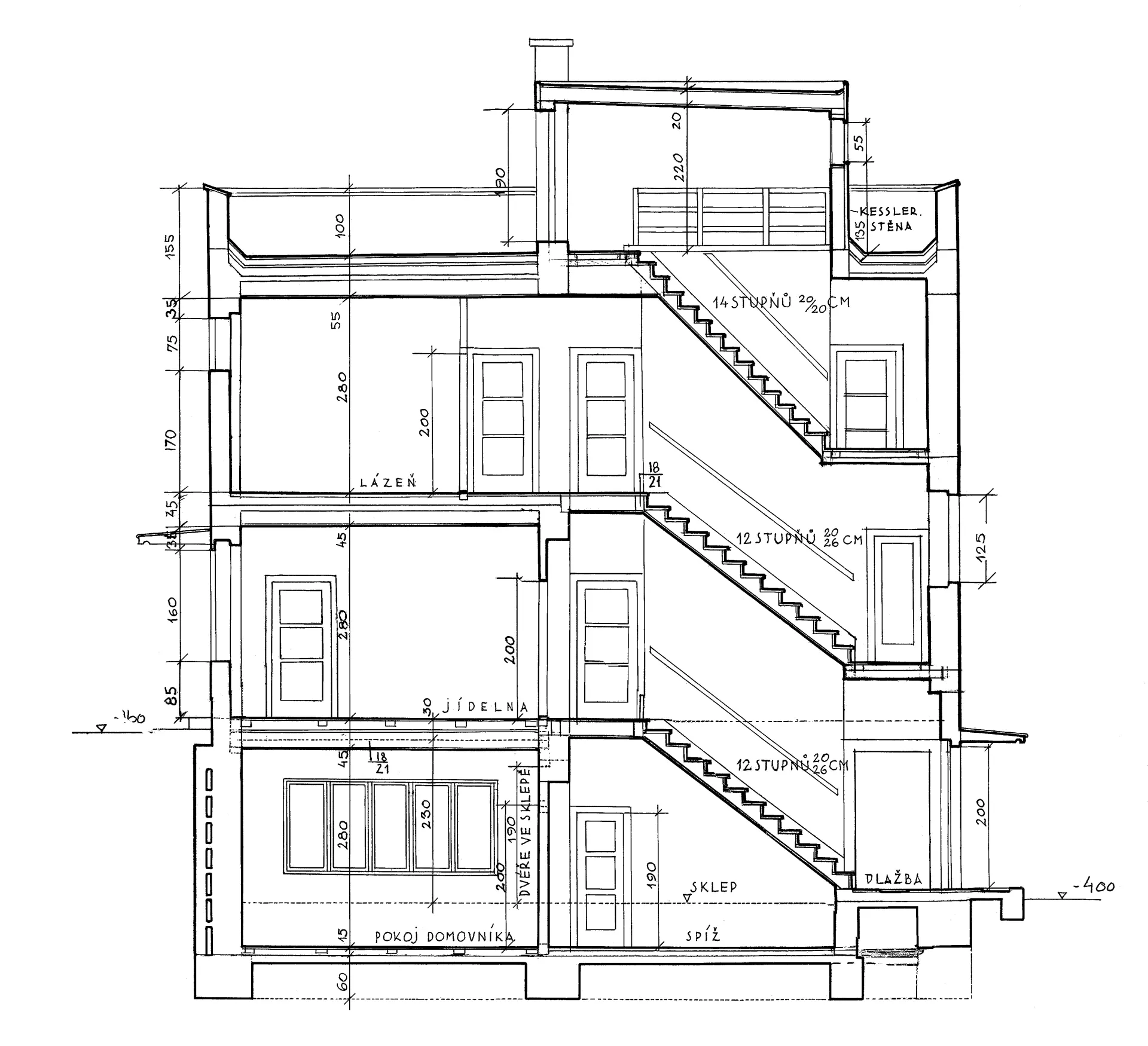The plain cube of Kudela villa is situated on the corner of Klácelova and Havlíčkova streets and was built according to a design by Jan Víšek in 1927. The villa was ordered by secondary school teacher and later principal of the First Slavonic Grammar School Josef Kudela, who, as a Russian legionary, participated in the battles of World War I and died in a concentration camp where he was sent by the Nazis as punishment for his engagement with the resistance movement. Jan Víšek is one of the representatives of the strictly rational branch of Brno functionalism seen in the austere facades and the compact mass of this three-level villa. The inconspicuous main entrance is situated on the north-east garden facade, which is only segmented by the small windows of service rooms in the basement and the ground floor. A staircase connects the small entrance hall with the main residential area with the kitchen, spacious hall and dining room, facing south-west and looking out on Havlíčkova Street. The landscaping of this part of the sloping garden has the nature of a raised terrace joined by a glass door to the veranda adjacent to the dining room and kitchen. The symmetrically situated staircase divides the area of the first floor housing four bedrooms and the bathroom. The extensive roof terrace accessible from a cubic roof extension was originally conceived as a residential area, too. The minimalism of the facades on the Kudela Villa is close to the thinking of Adolf Loos, who shifted his attention completely to the interiors of his buildings. This is clearly seen in the Müller Villa in Prague, the facade of which received minimal attention and the individual irregularly arranged openings merely reveal the layout of the rooms in the interior. Víšek's purism is also rooted in the functionalist effort to attain the radical purity and functionality of the forms used. PH