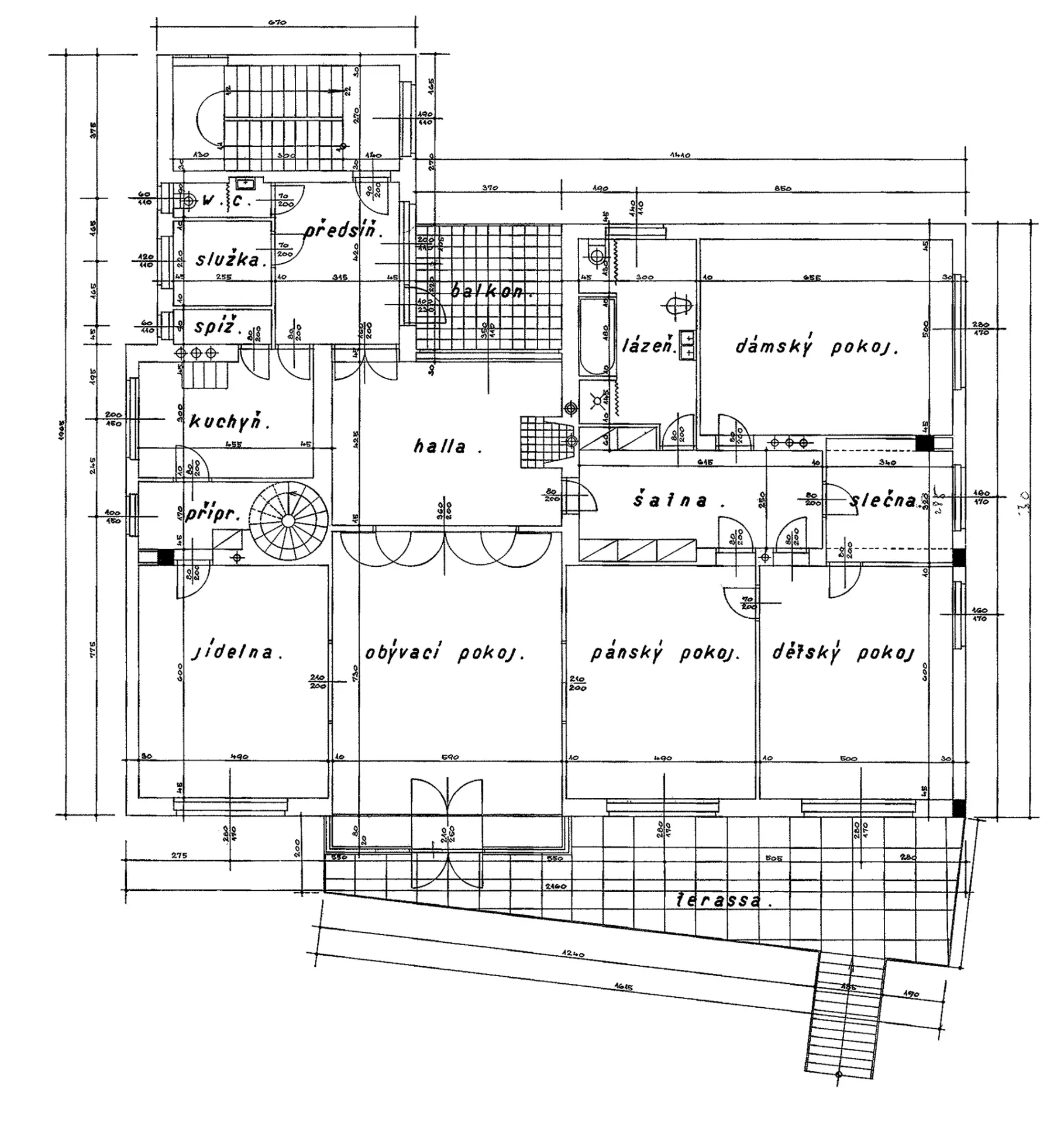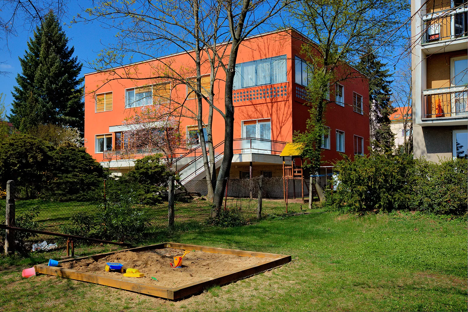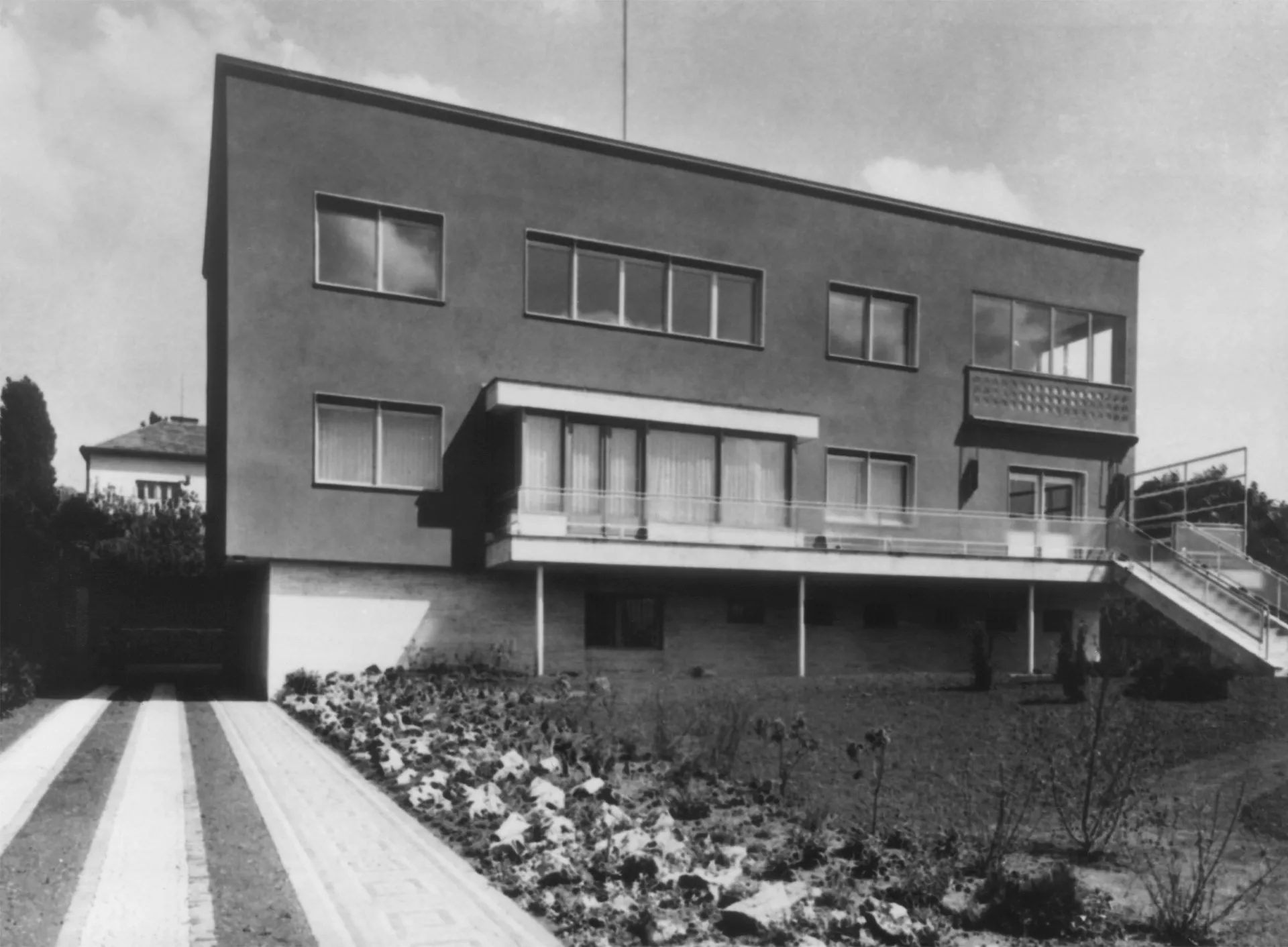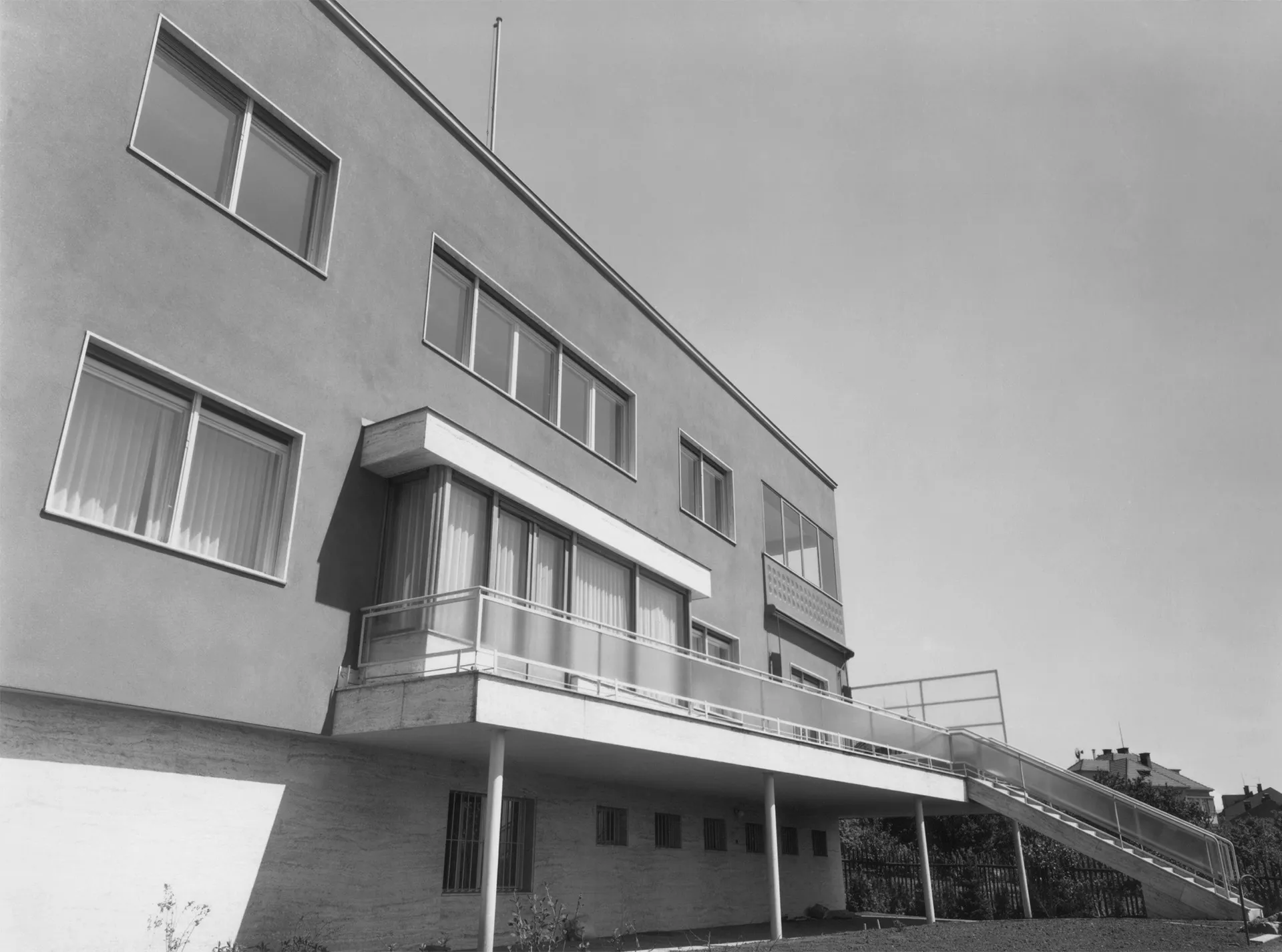 The Láska Villa was built at the end of the 1930s near the Neumark Villa designed by Ernest Wiesner. Working for an attorney and the Dutch consul's daughter, the architect Evžen Škarda designed an impressive and spacious residence whose red facade was probably inspired by the neighboring house built a decade earlier. The architectural expression of the house with a wealth of subtle detail is, however, much closer to the minimalist esthetics of functionalism. The three-level building resting upon the travertine base of the service basement is situated deep in the garden; its main residential areas face south towards the street. The main motif of the street facade is the conical protruding terrace borne by slim pillars that contrast with the otherwise strictly rectangular layout. The terrace is also accessible through the glazed risalit of the living room; the motif of a glassed terrace is repeated in the south-east corner of the second floor. Its railings are perforated by rows of circular glass blocks which also bring light to the staircase risalit on the rear facade. The interior is divided into two nearly identical apartments, each of which occupies one floor. One of these flats was offered for rent. The core of the disposition is a square hall dividing the apartment into the residential south-east part and the service north-west part. Many rooms are separated only by curtains or sliding walls, which creates the impression of open and flowing space. The present condition of the villa serves as an exemplary case of landmark building restoration. The villa was reconstructed by the PAW studio (architects Ludvík Grym and Jindřich Škrabal), which, in addition to original designs, focuses on the restoration of interwar landmark buildings. PH